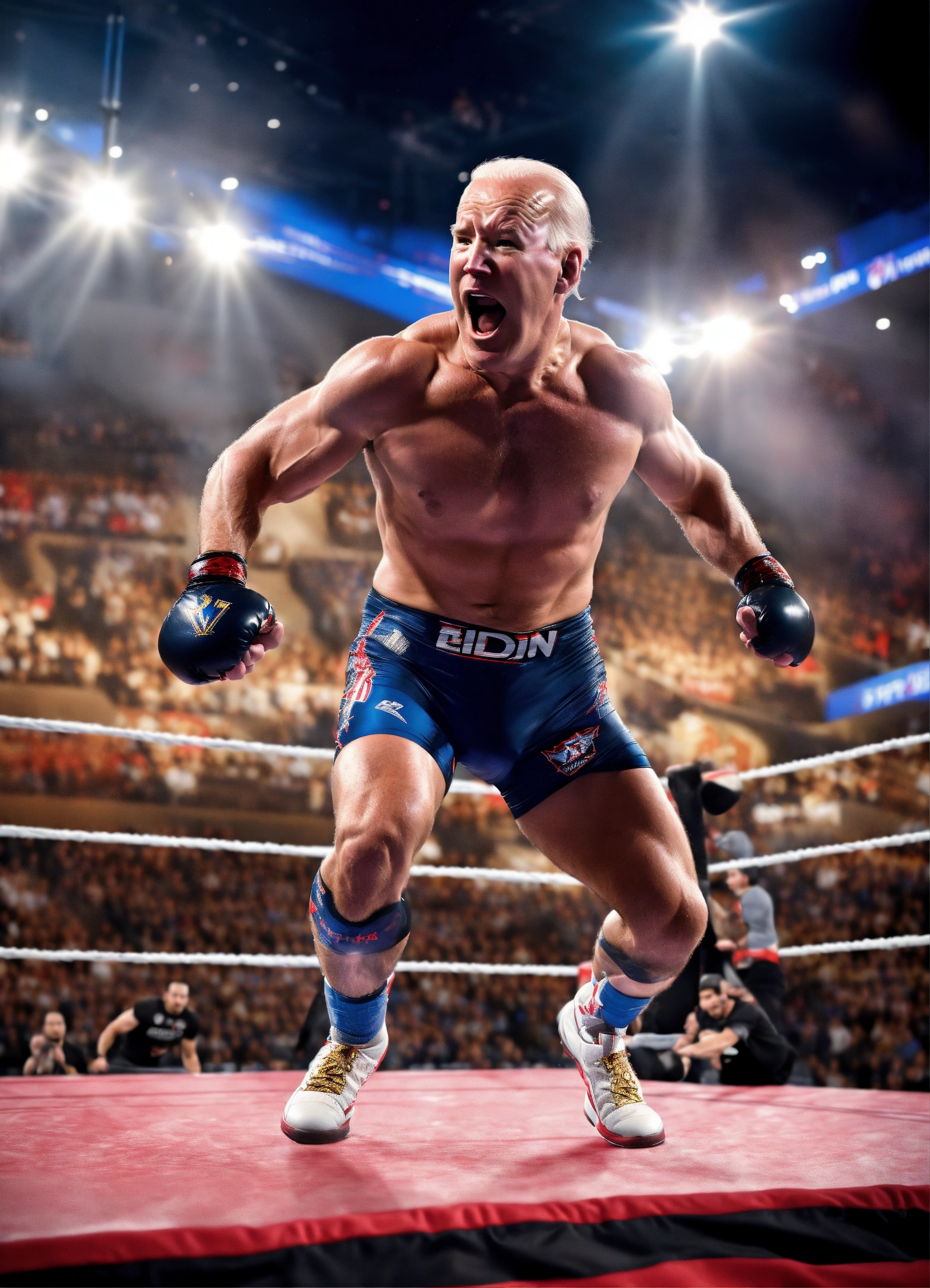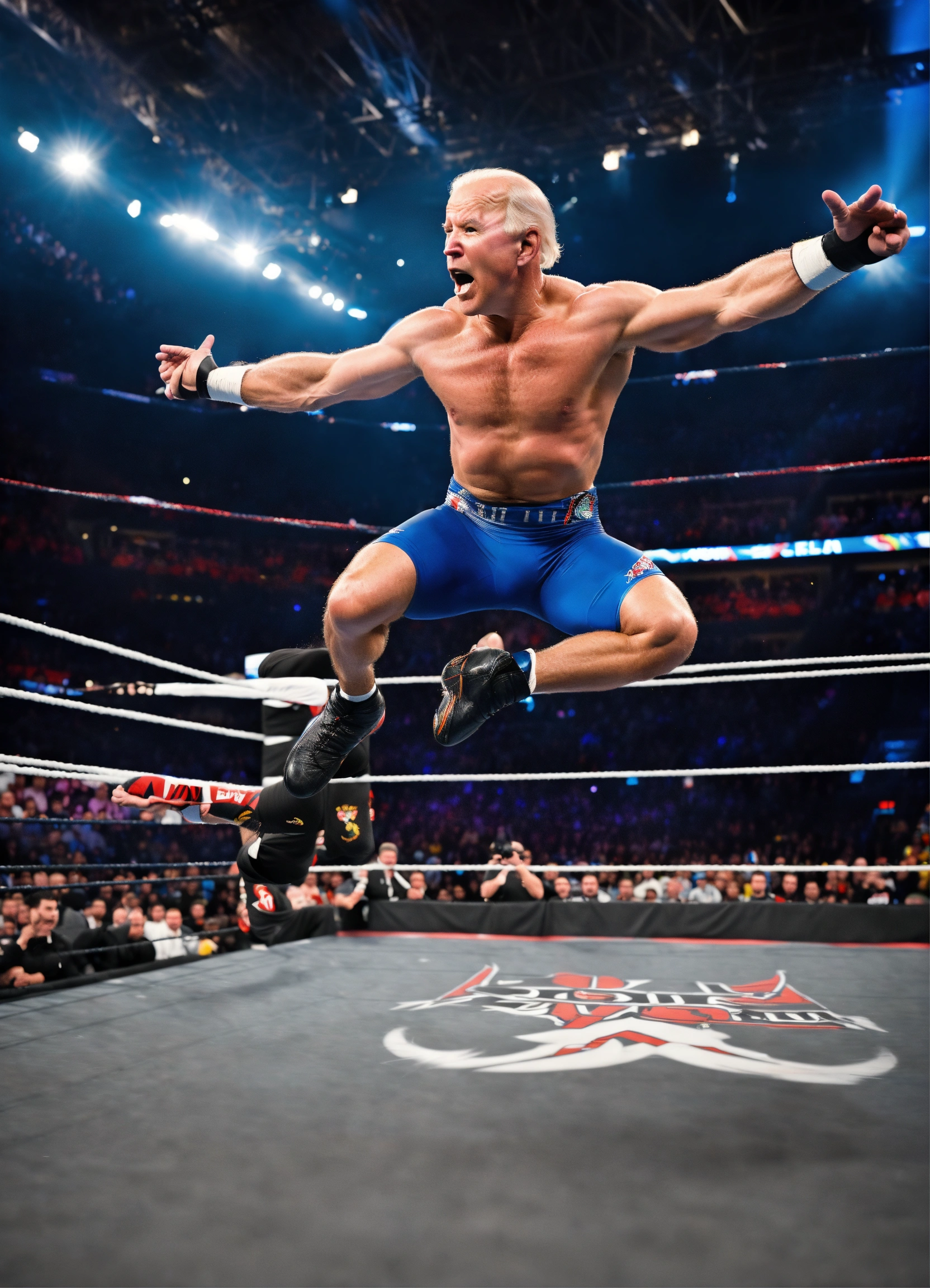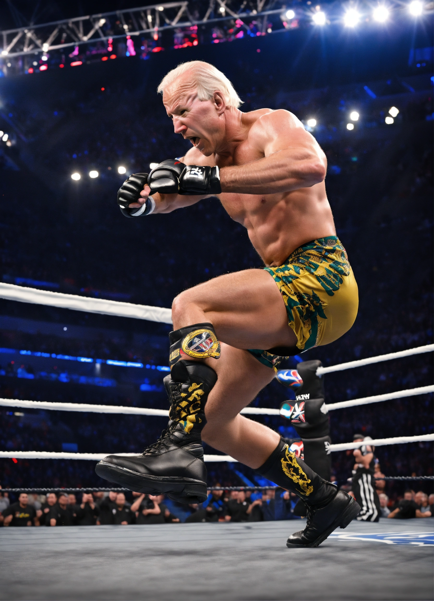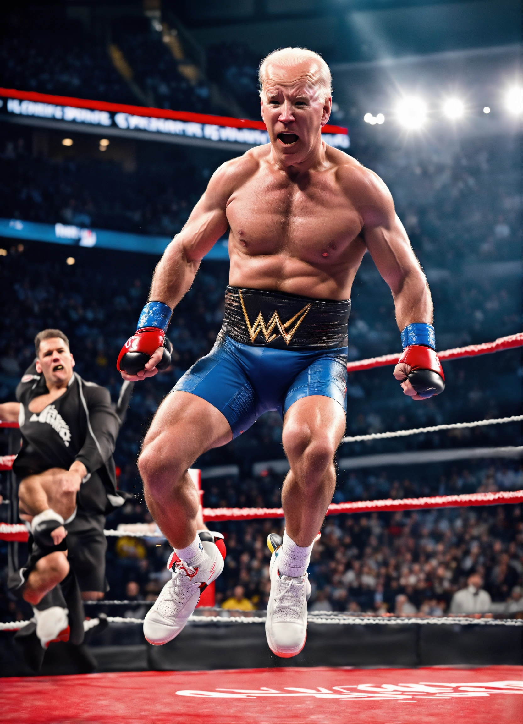Wwe fighter joe biden in the arena, sports ((action shot)), shot on sony alpha, jumping, hyper realistic