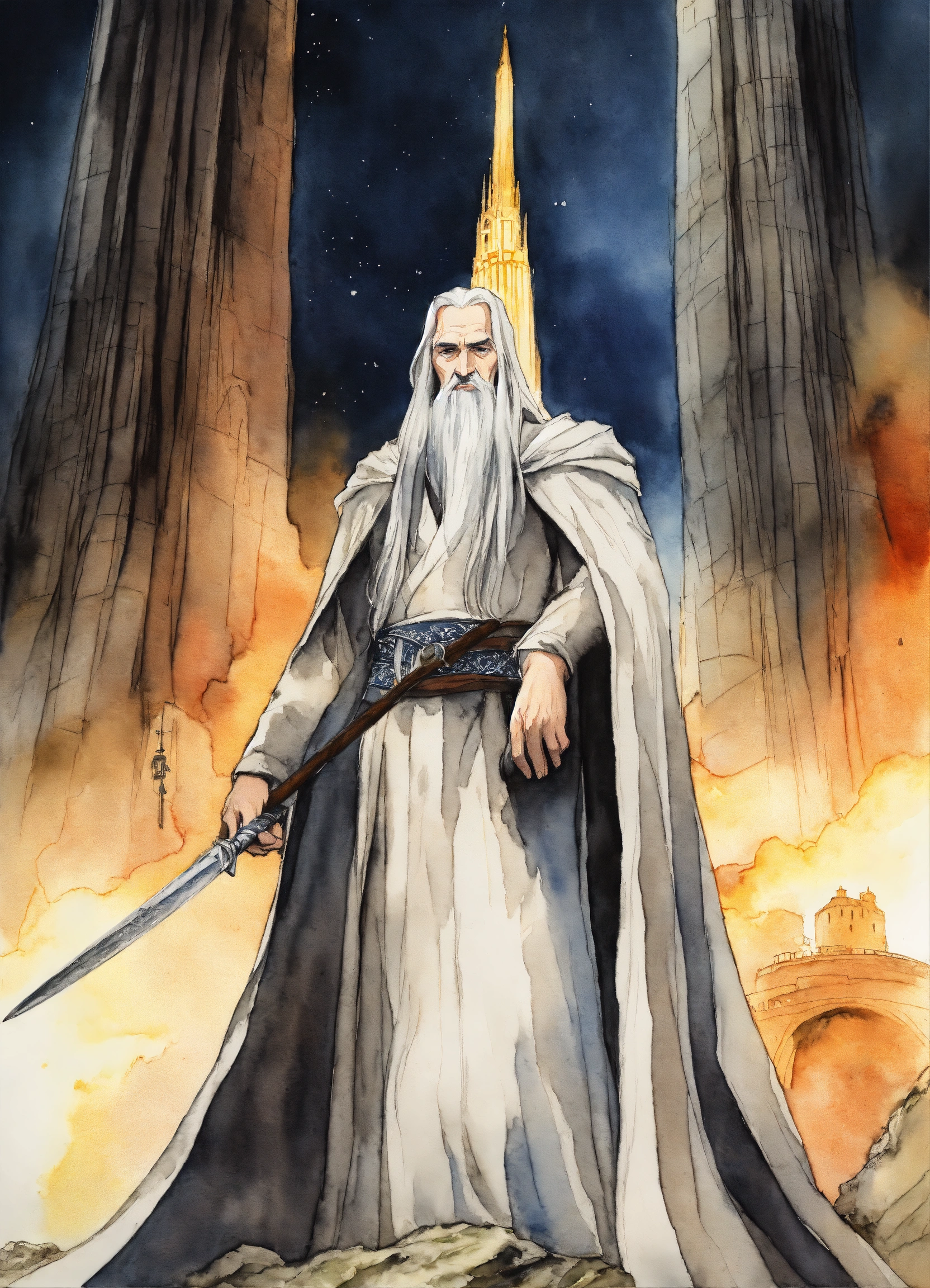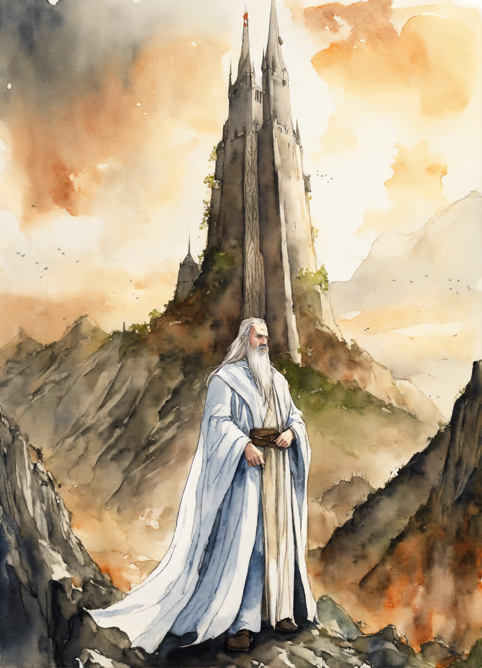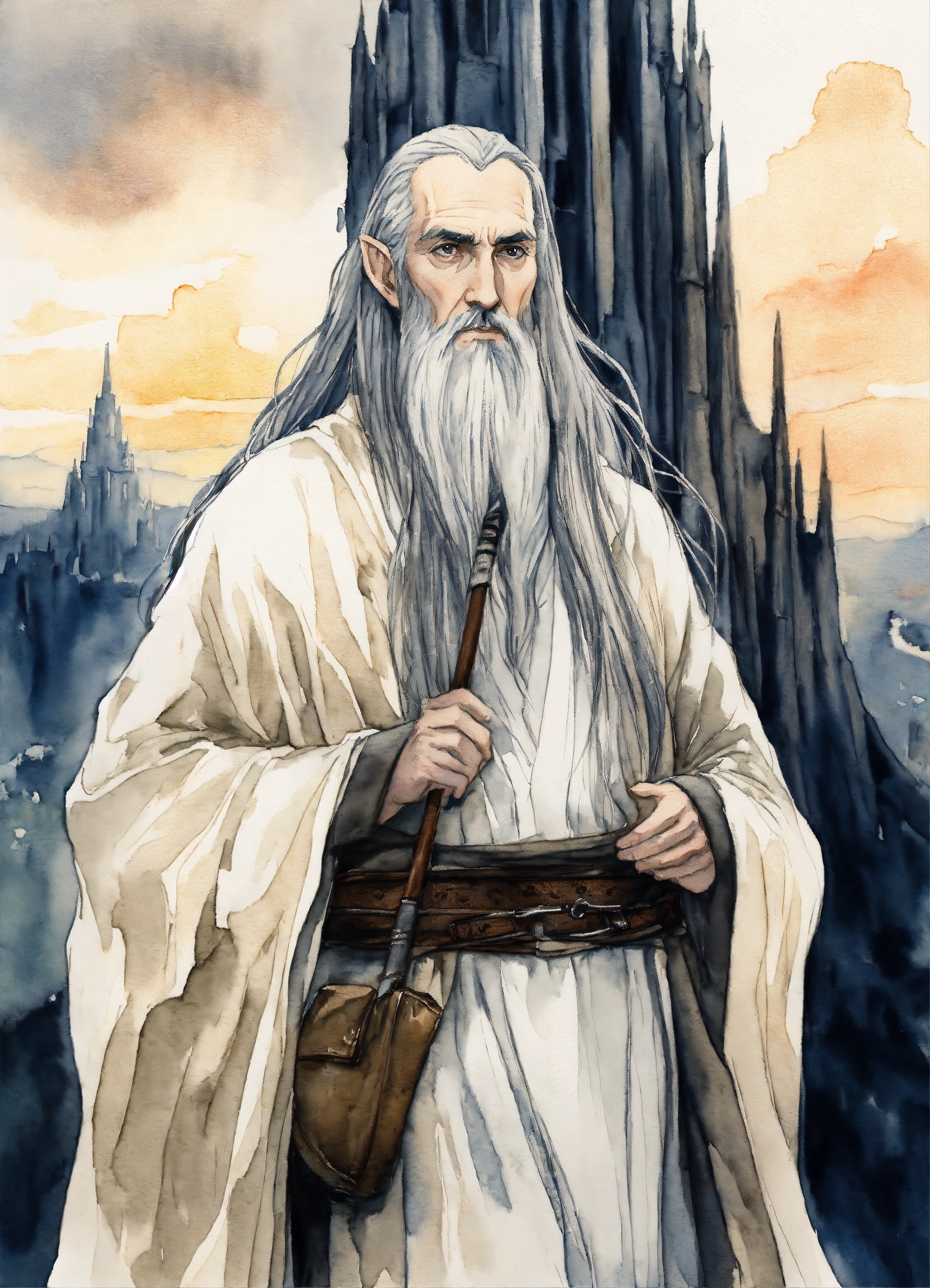 Saruman from lotr with white robes in vagabond manga drawing art style, watercolor, with isengard tower at the background