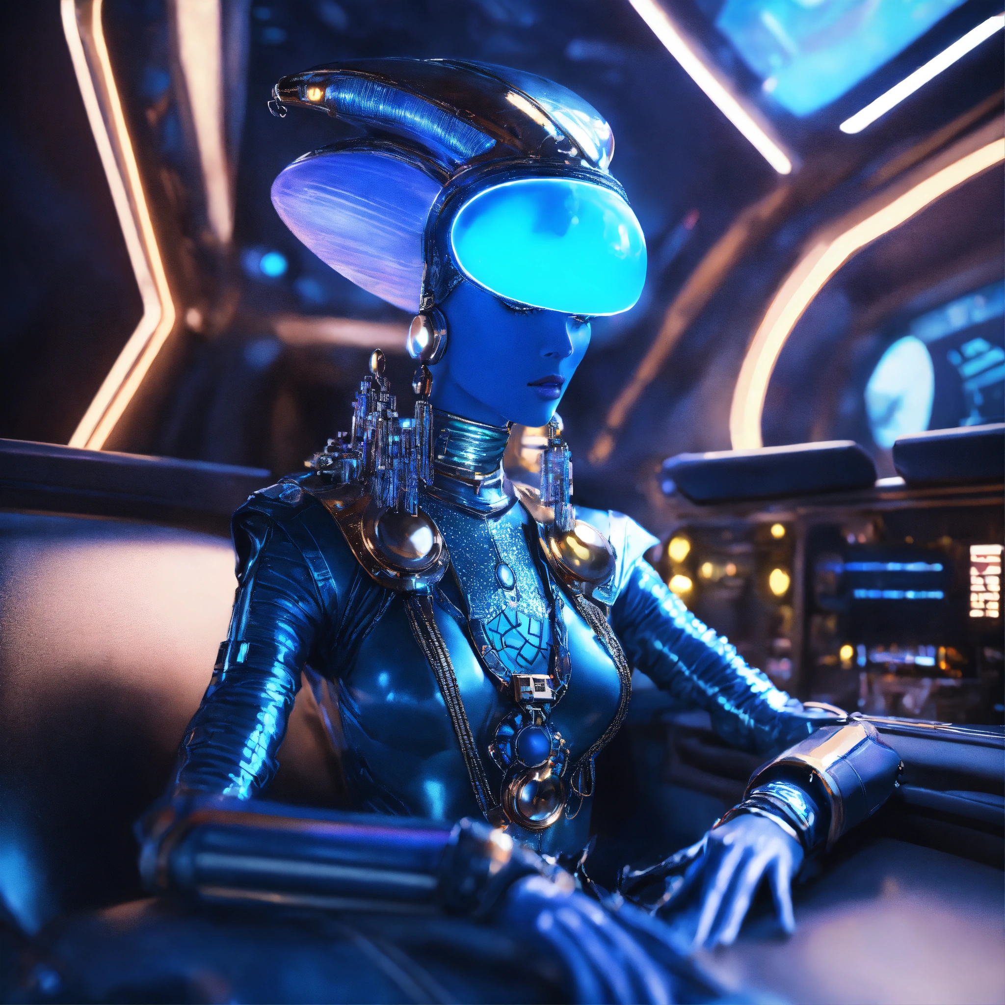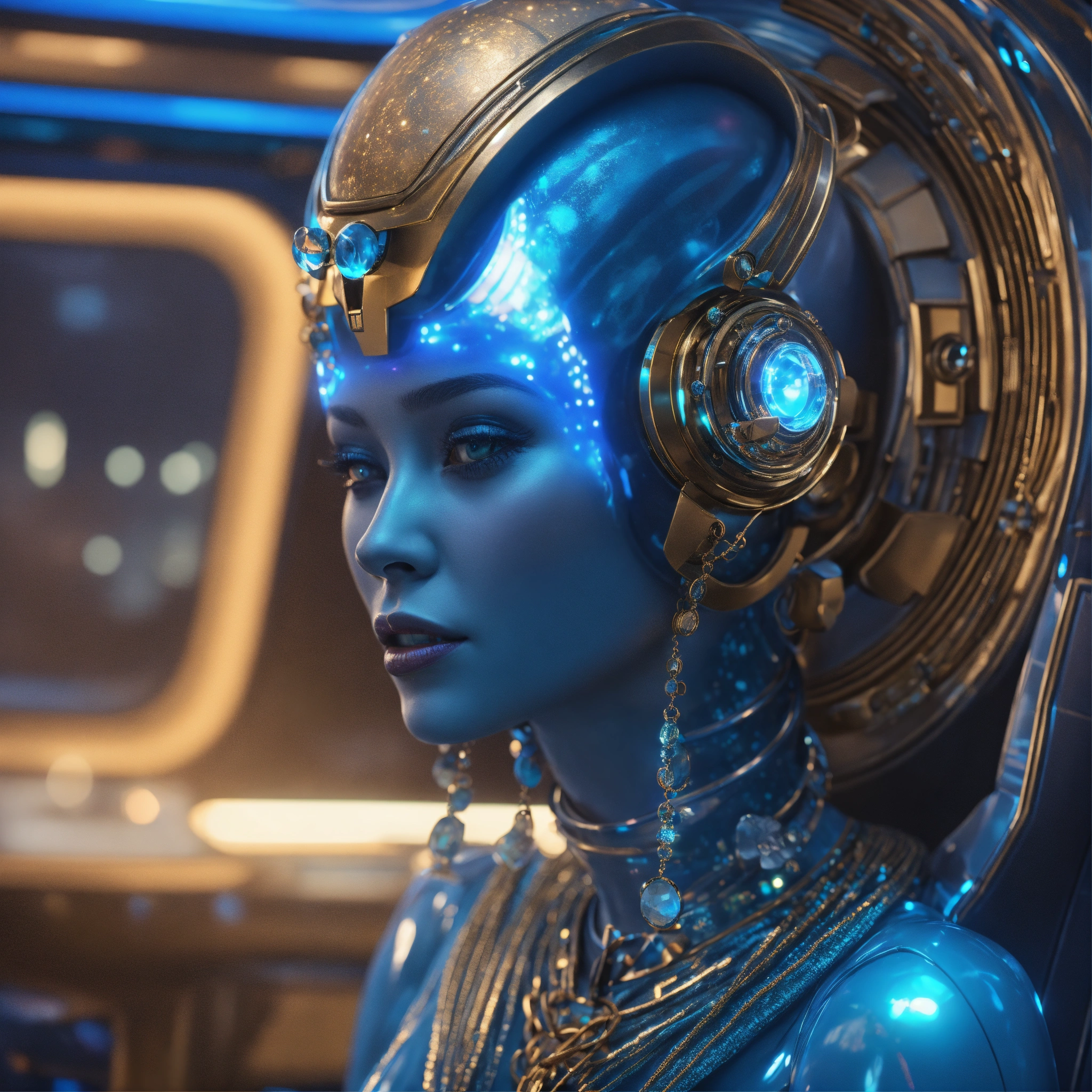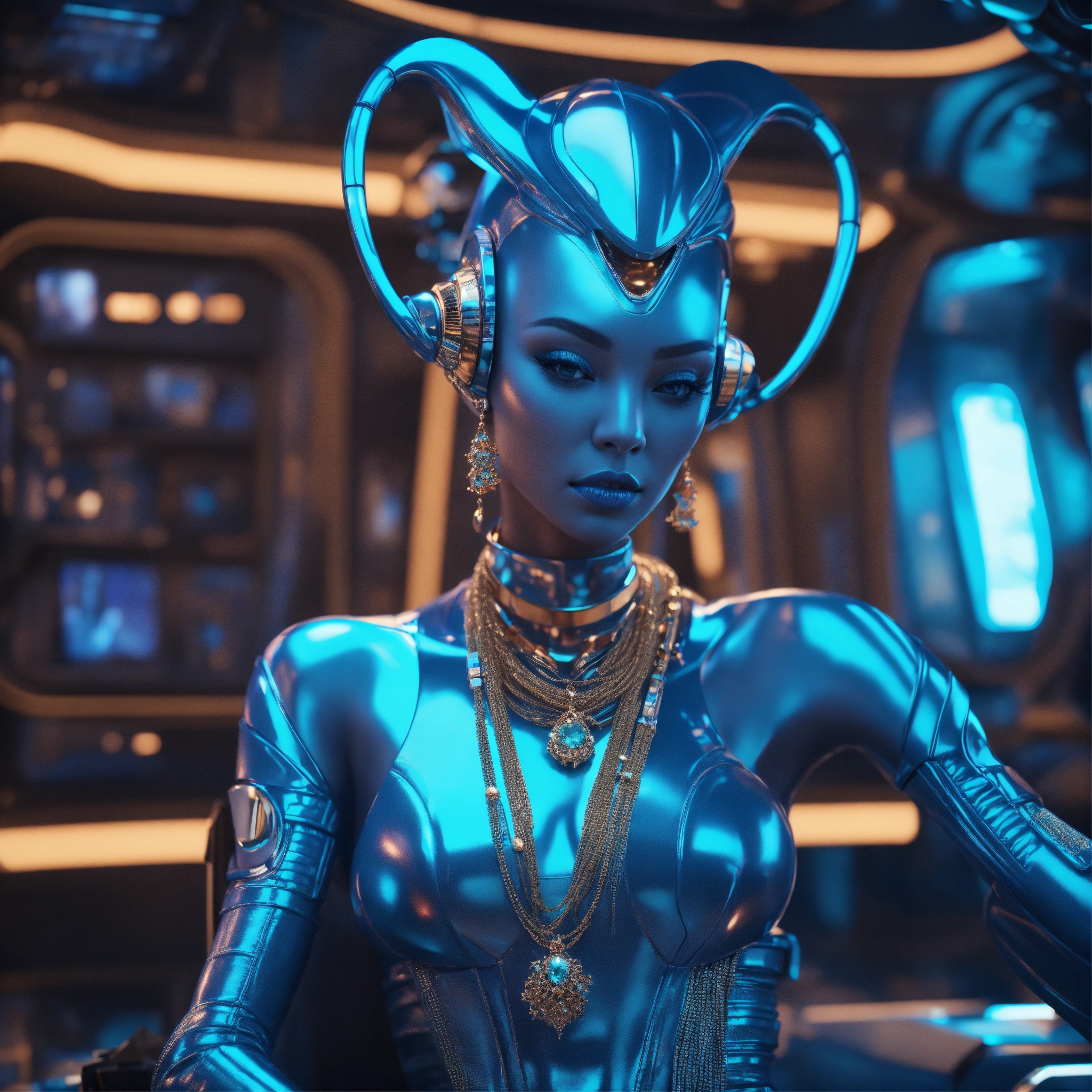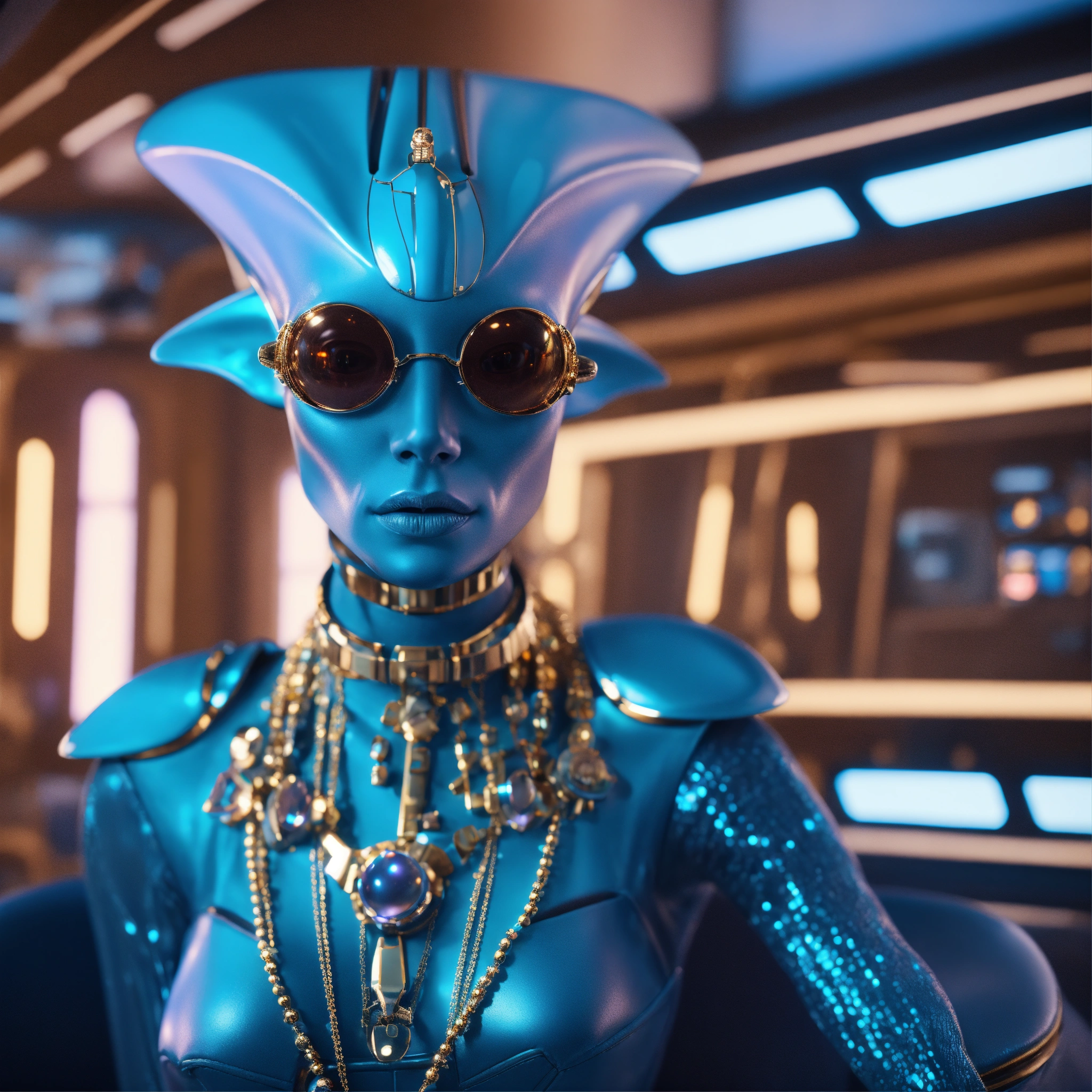 Zoom out from a cool blue alien wearing space fashion with alot of jewelry lounging in a futuristic space yacht, realistic, futuristic, sci-fi, 8k, unreal engine