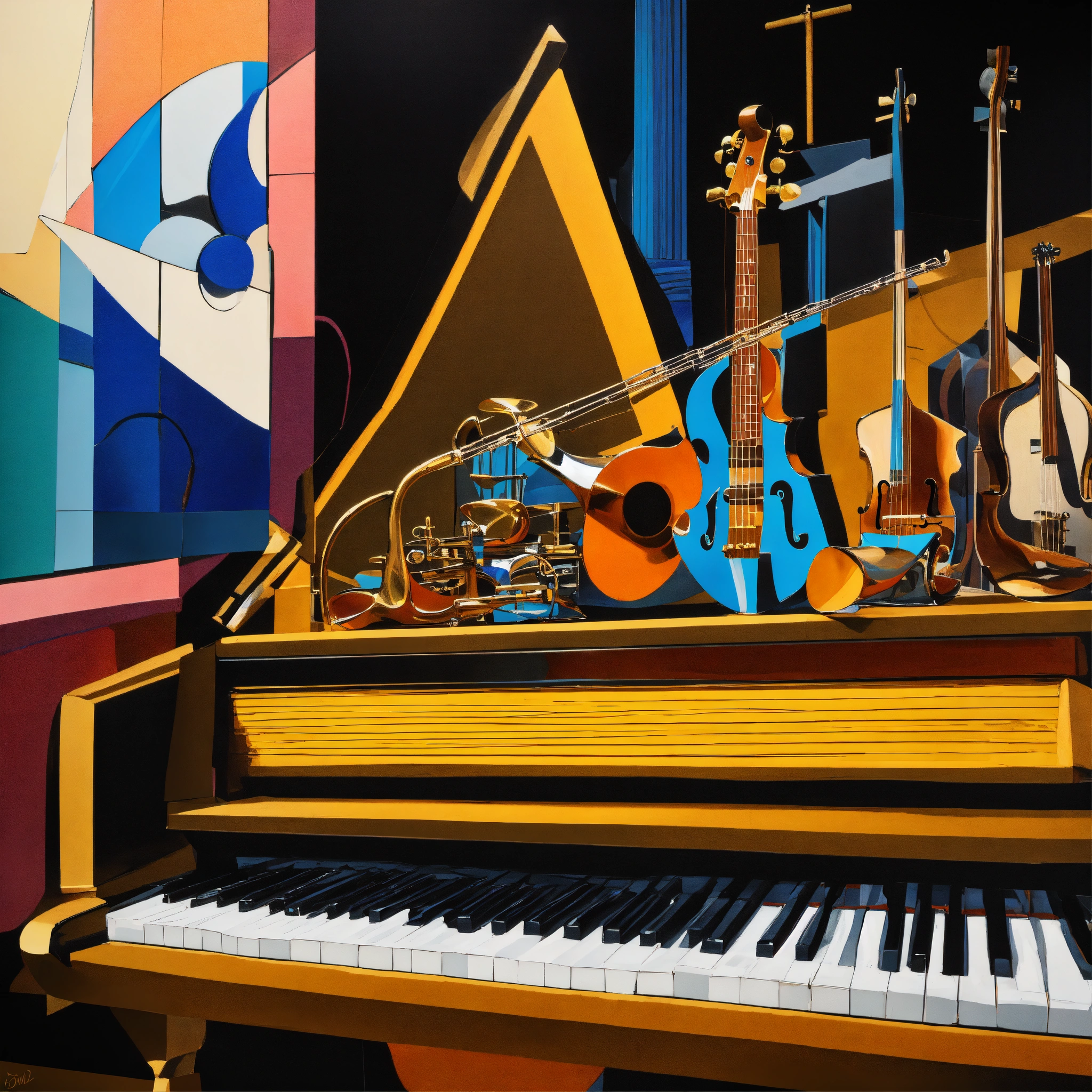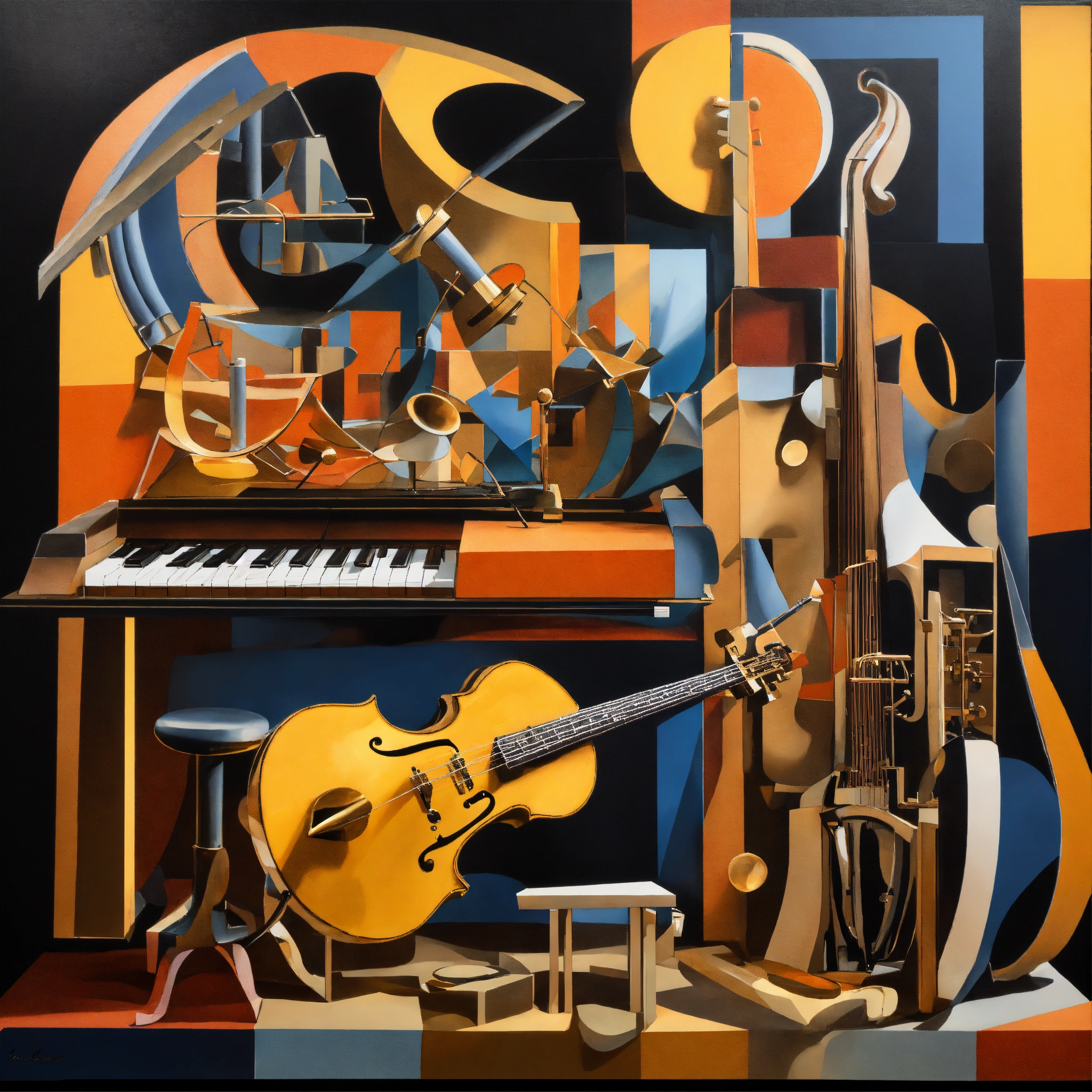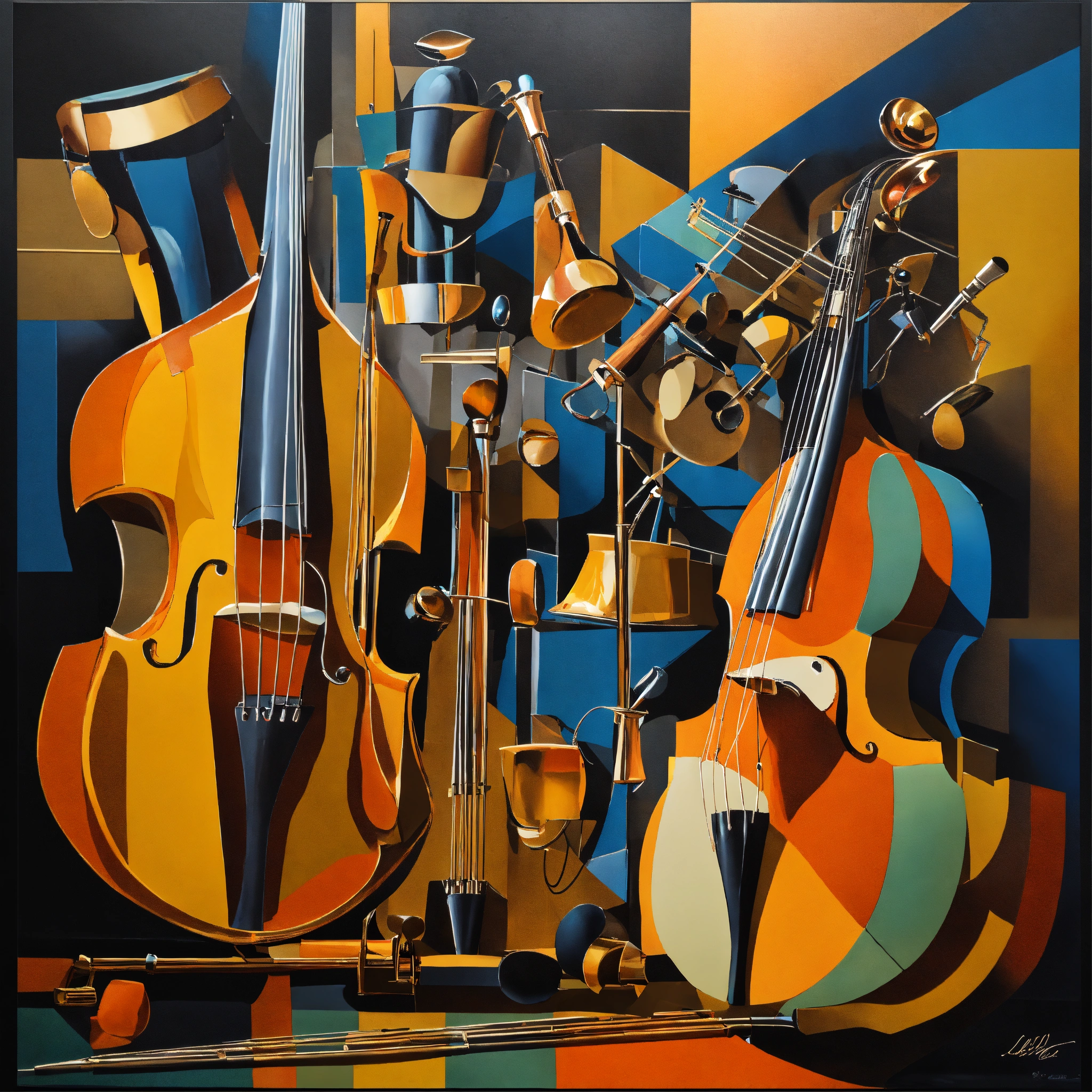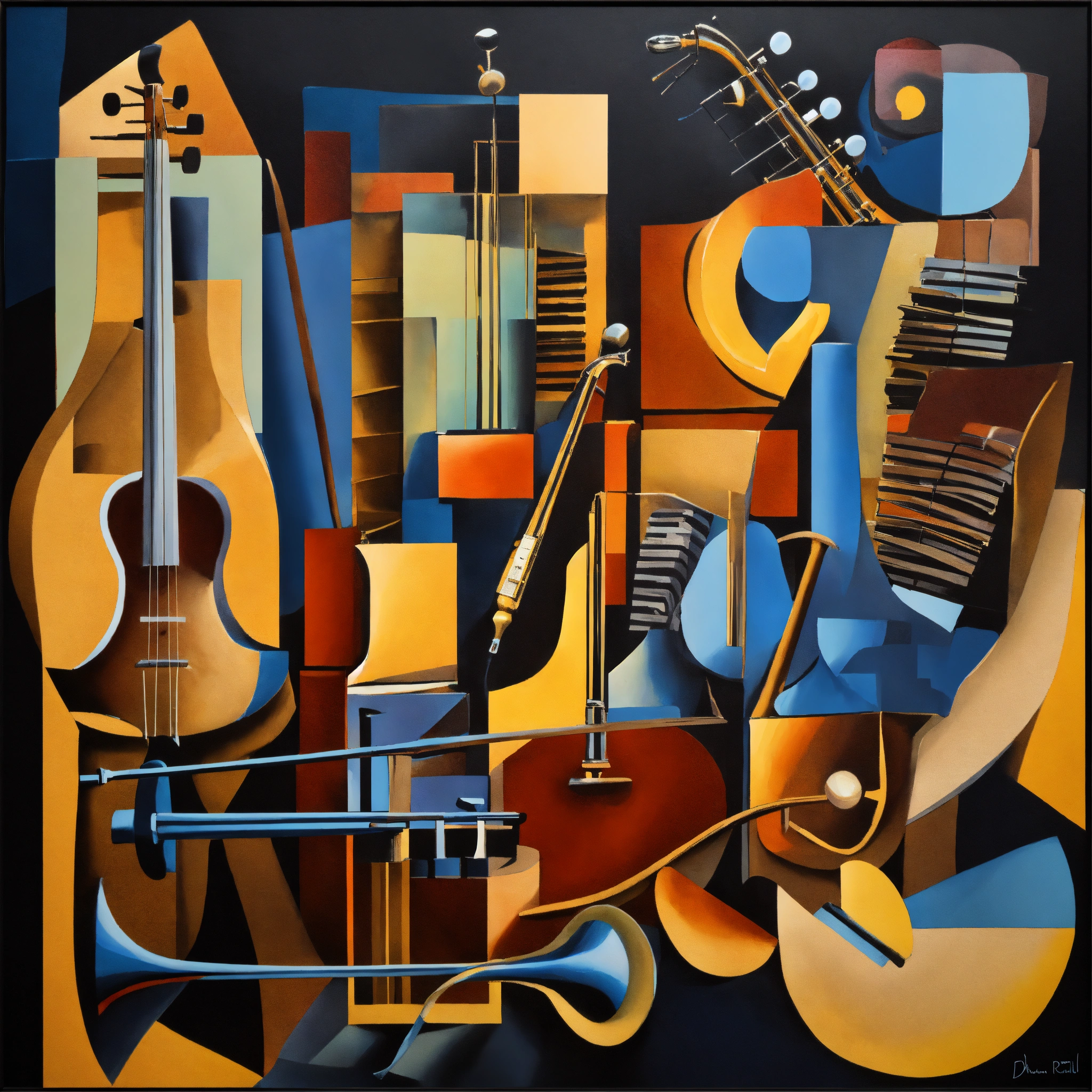 Produce a electrifying 3d cubist-inspired painting of jazz musicians' instruments set against a black backdrop. fusion traditional acrylic paint with digital techniques to achieve meticulous attention to detail. incorporate salvador dali's style, employing maximalist approach for a dramatic and intricate composition. the digital piece should be a stunning photorealistic representation of musical instruments 3d shade