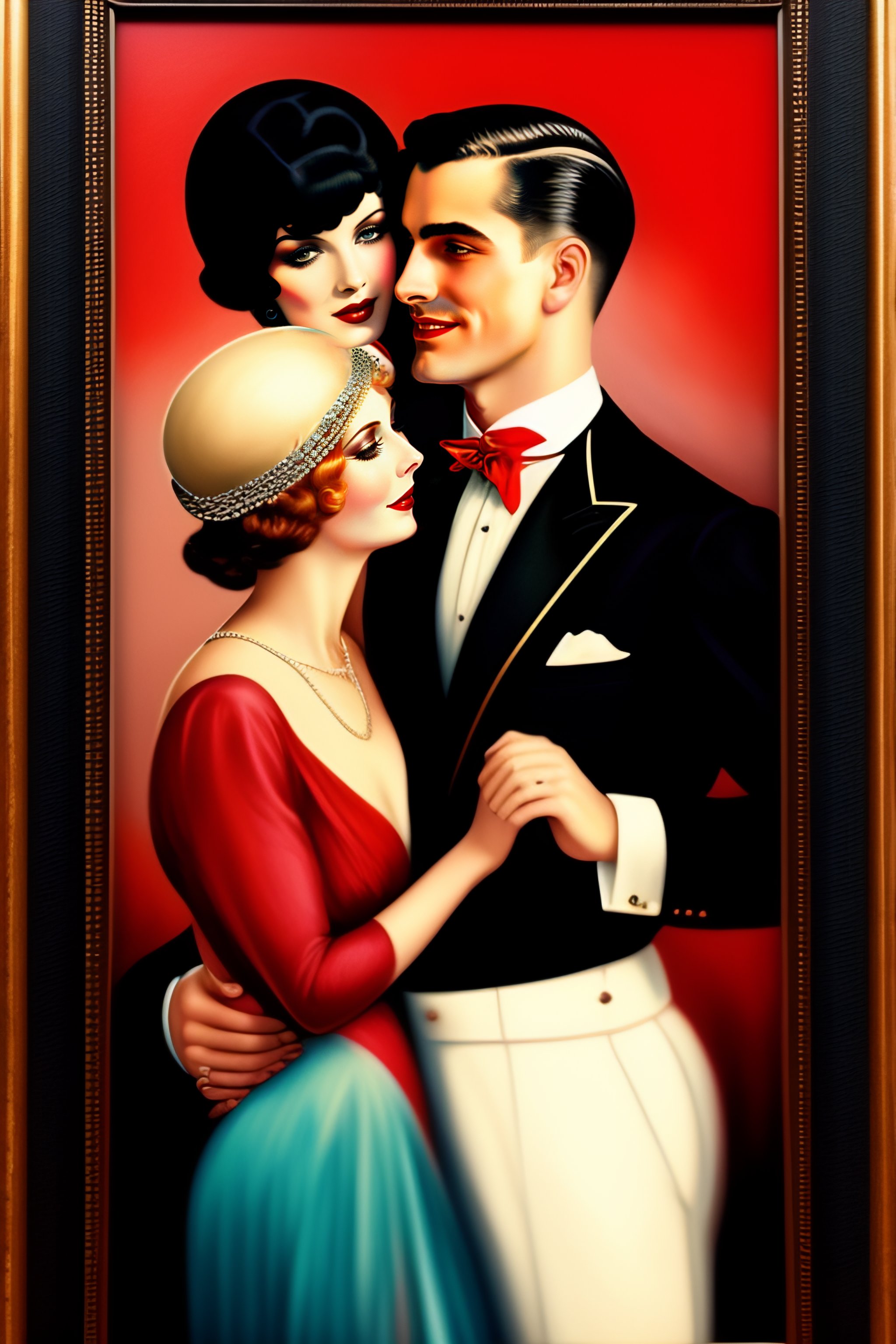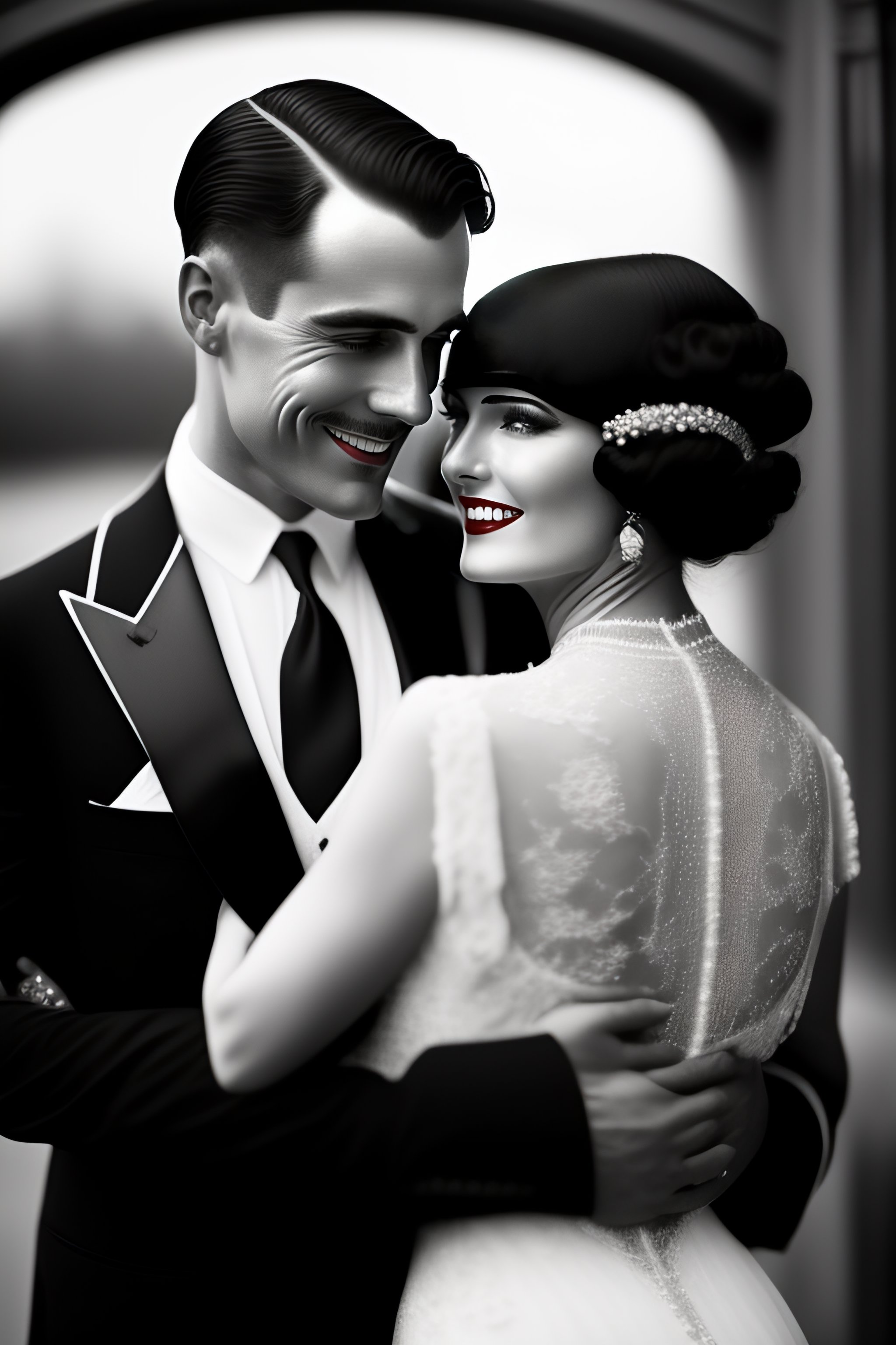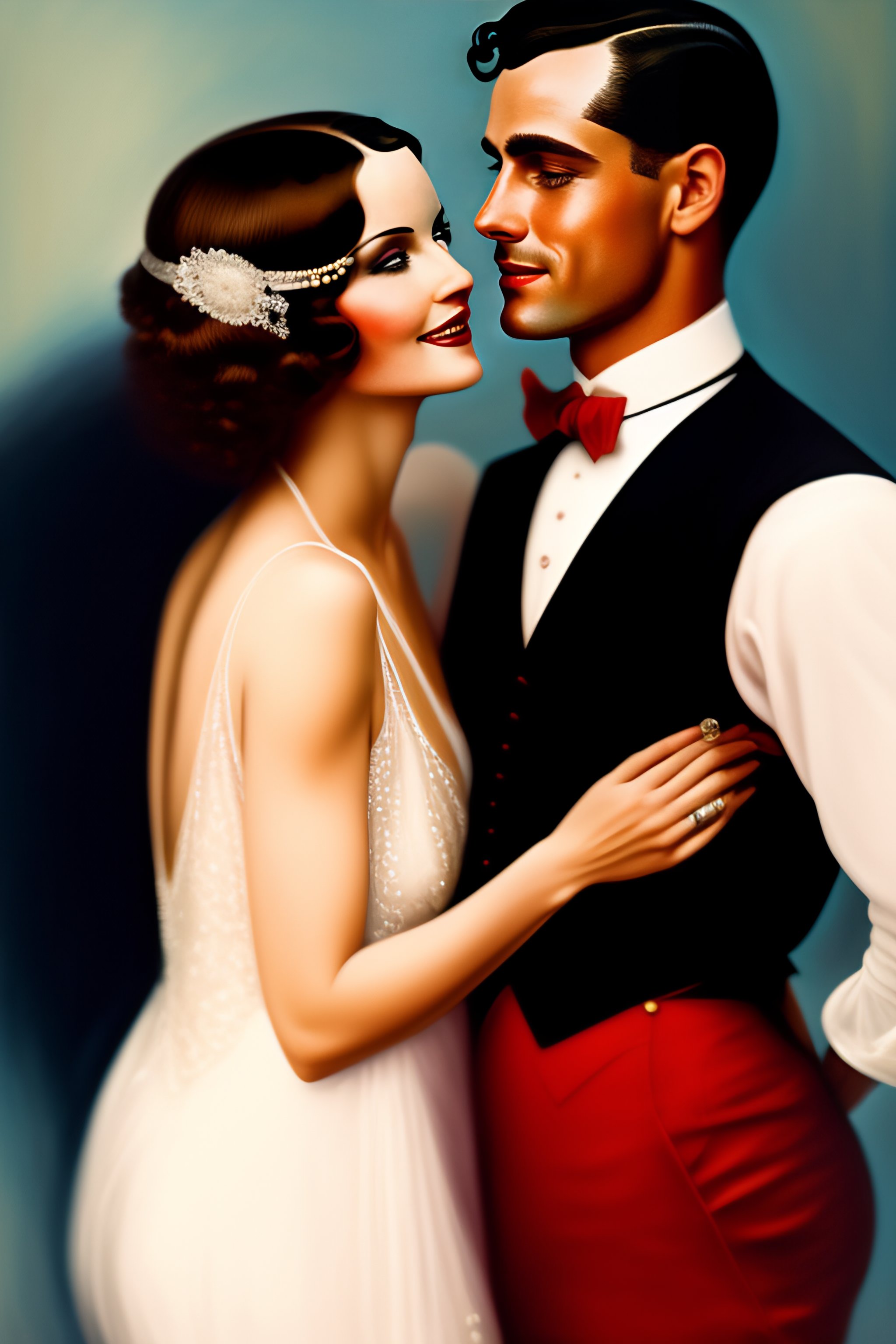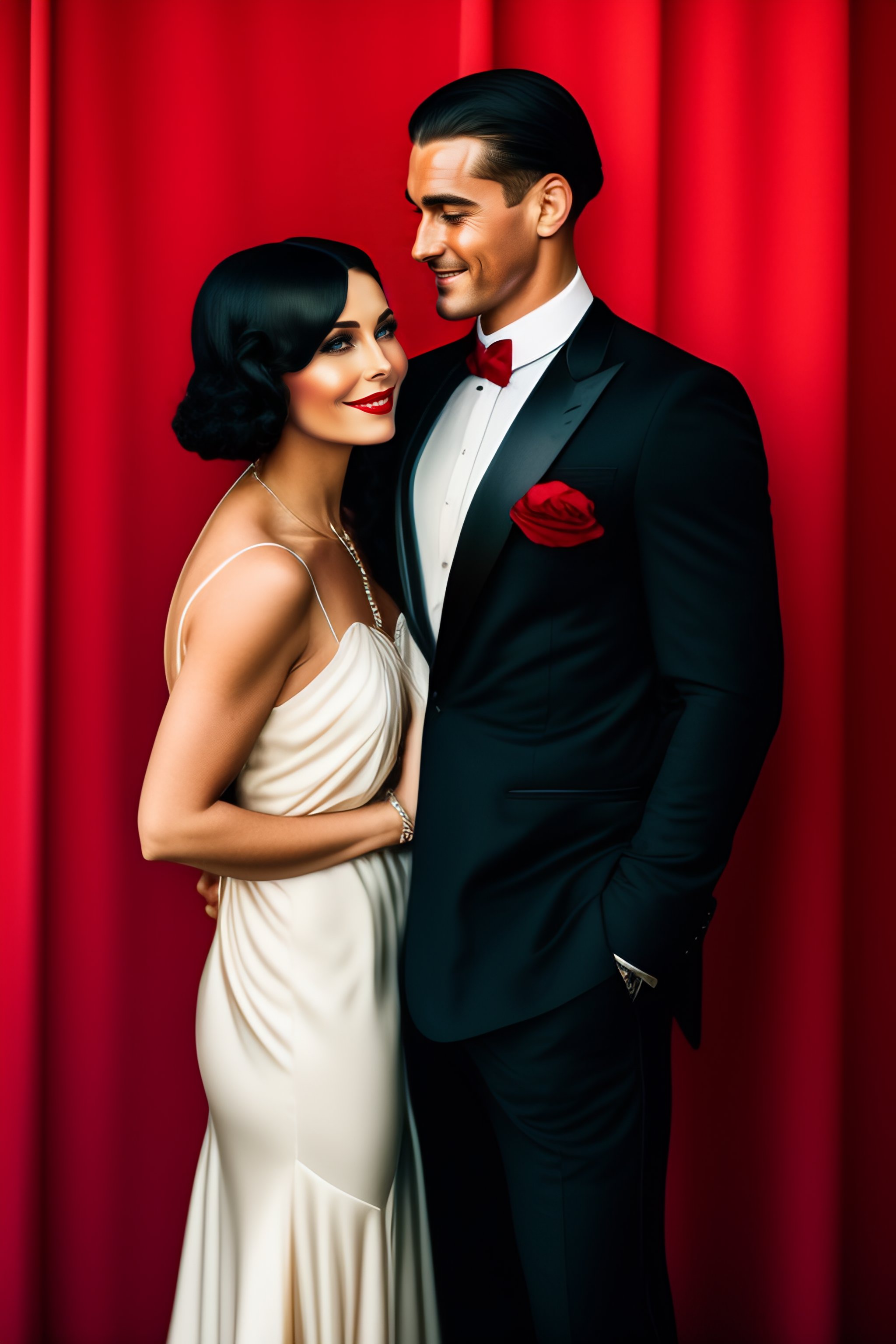 1920s couple holding each other tightly, the husband is wearing a black tuxedo with his black hair in gel and the woman in a red 1920s dining dress