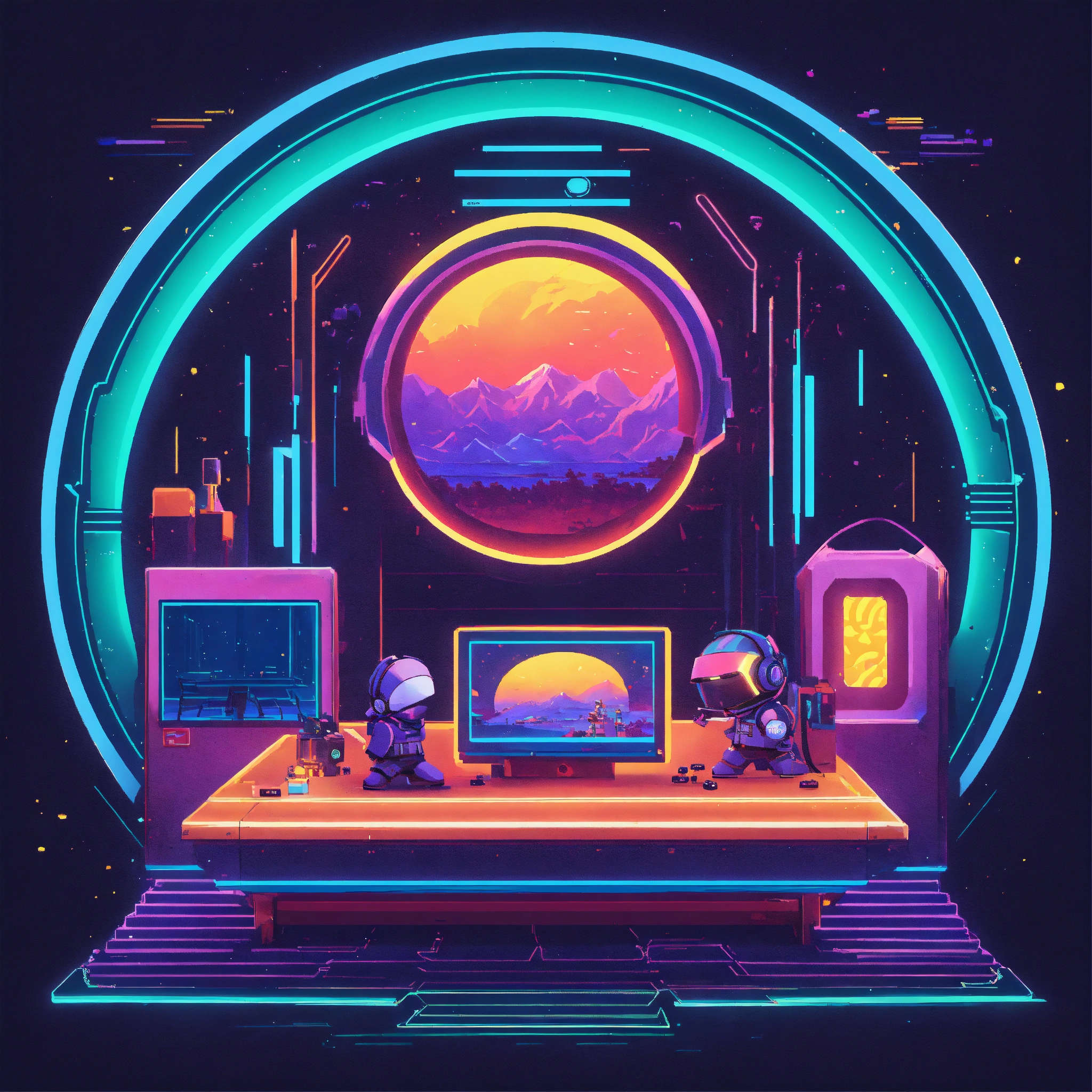 As a forward-focused gaming company, envision a design prompt that encapsulates our future-oriented ethos. develop a minimalist chibi 16-bit arcade artwork, showcasing a gamer seamlessly intertwining the worlds of gaming and education. cultivate a sleek, minimalist logo, symbolizing the fusion of these two realms and embodying an avant-garde approach to content. incorporate subtle neon accents for a touch of futurism and maintain a sleek, textured, splotchy style. this design will serve as the cornerstone of our brand, projecting a modern, future-oriented image for our company, which pioneers the future of gaming and learning without resorting to text-heavy elements.
