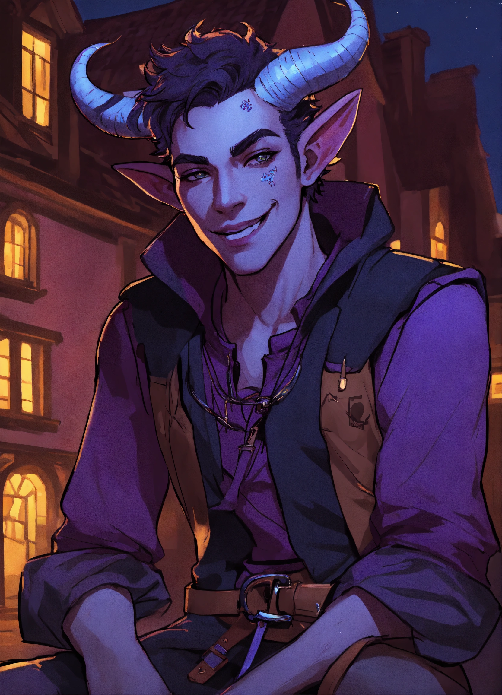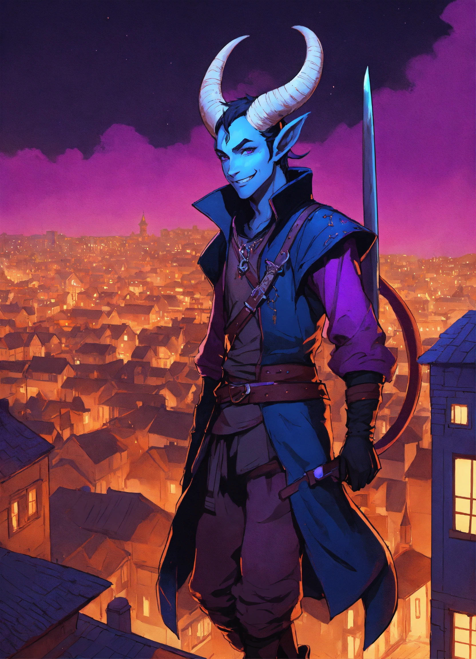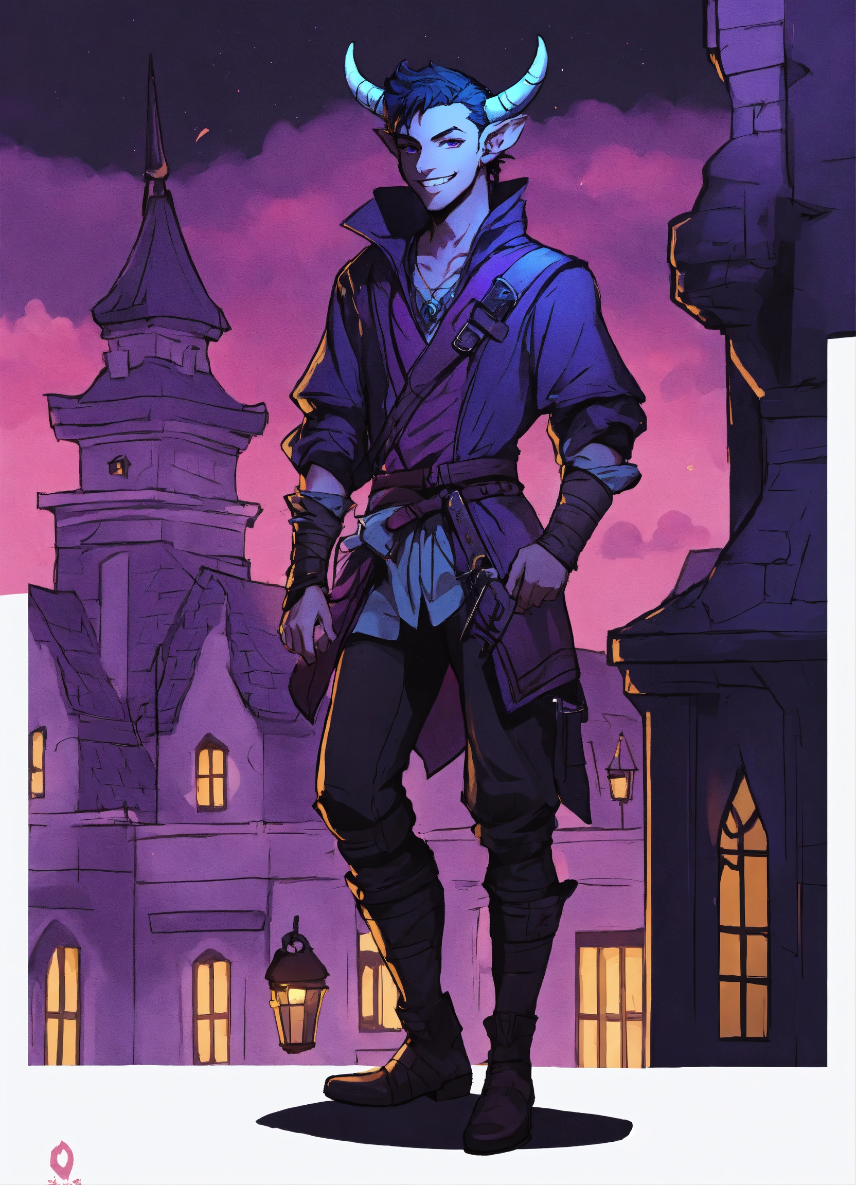 Male young blue tiefling, pathfinder art style full body! (head to feet) short hair, small horns smirk smile, holding acid knife main colors black, and purple background rooftop house in a medival city at night