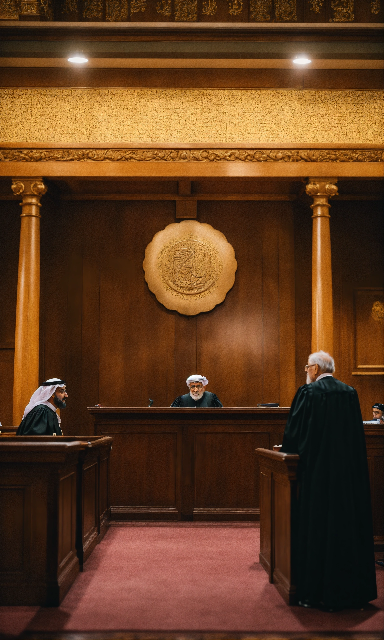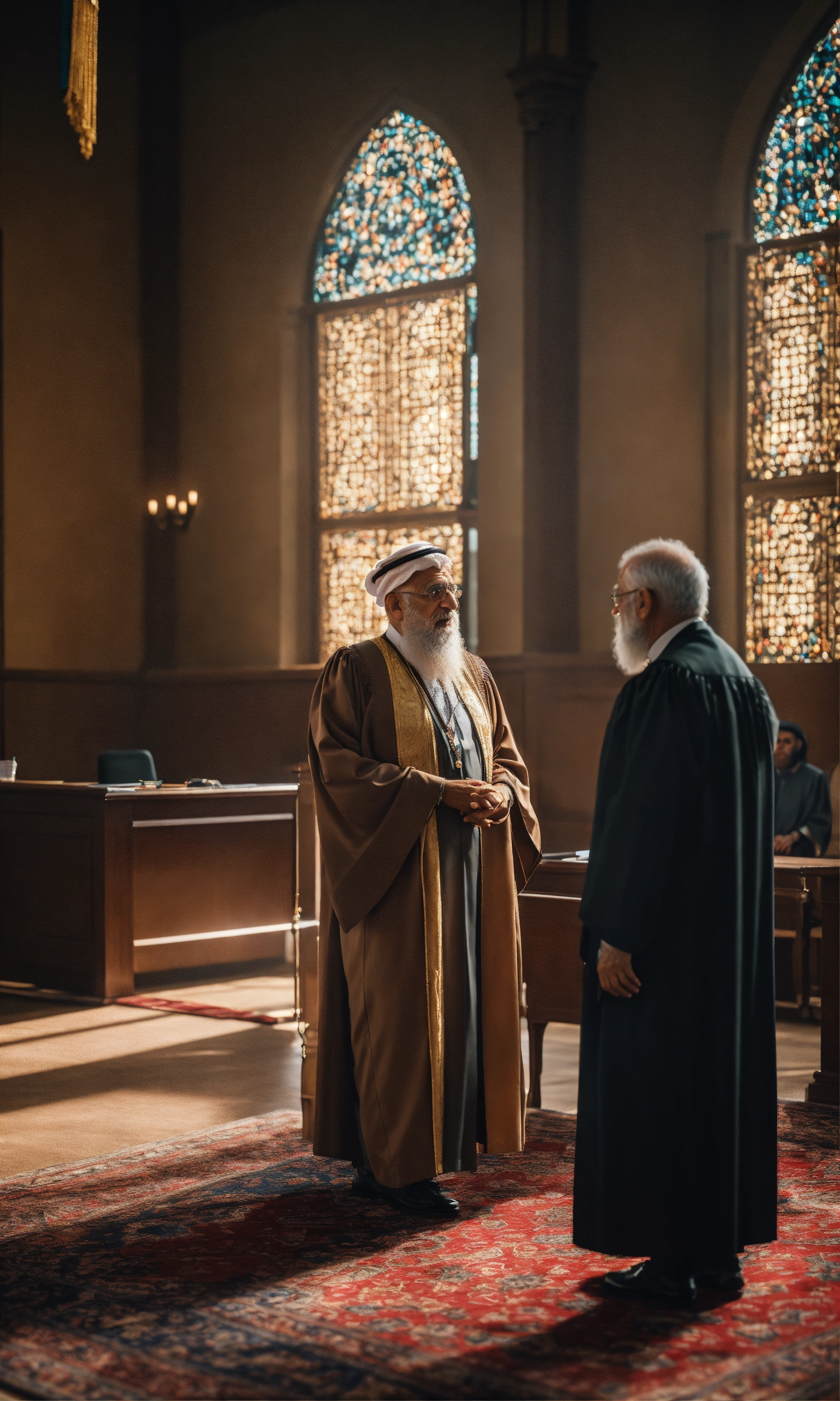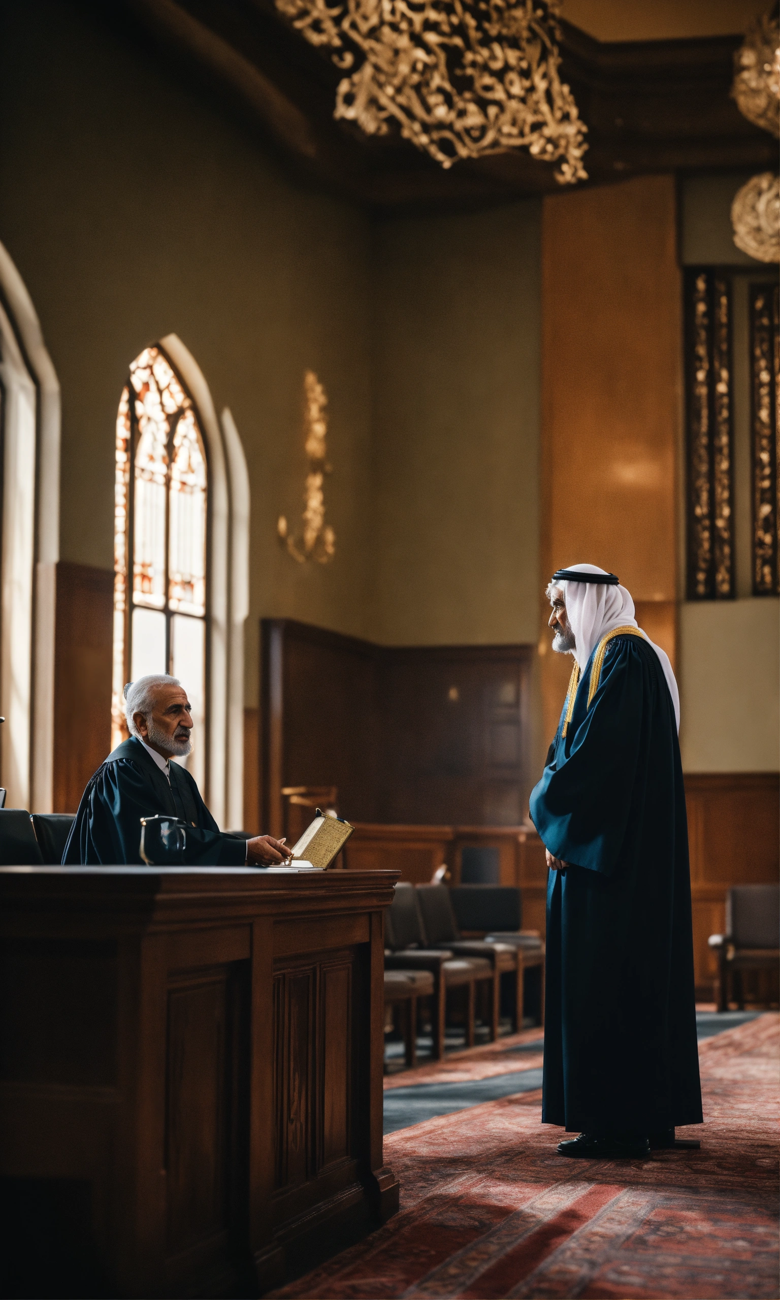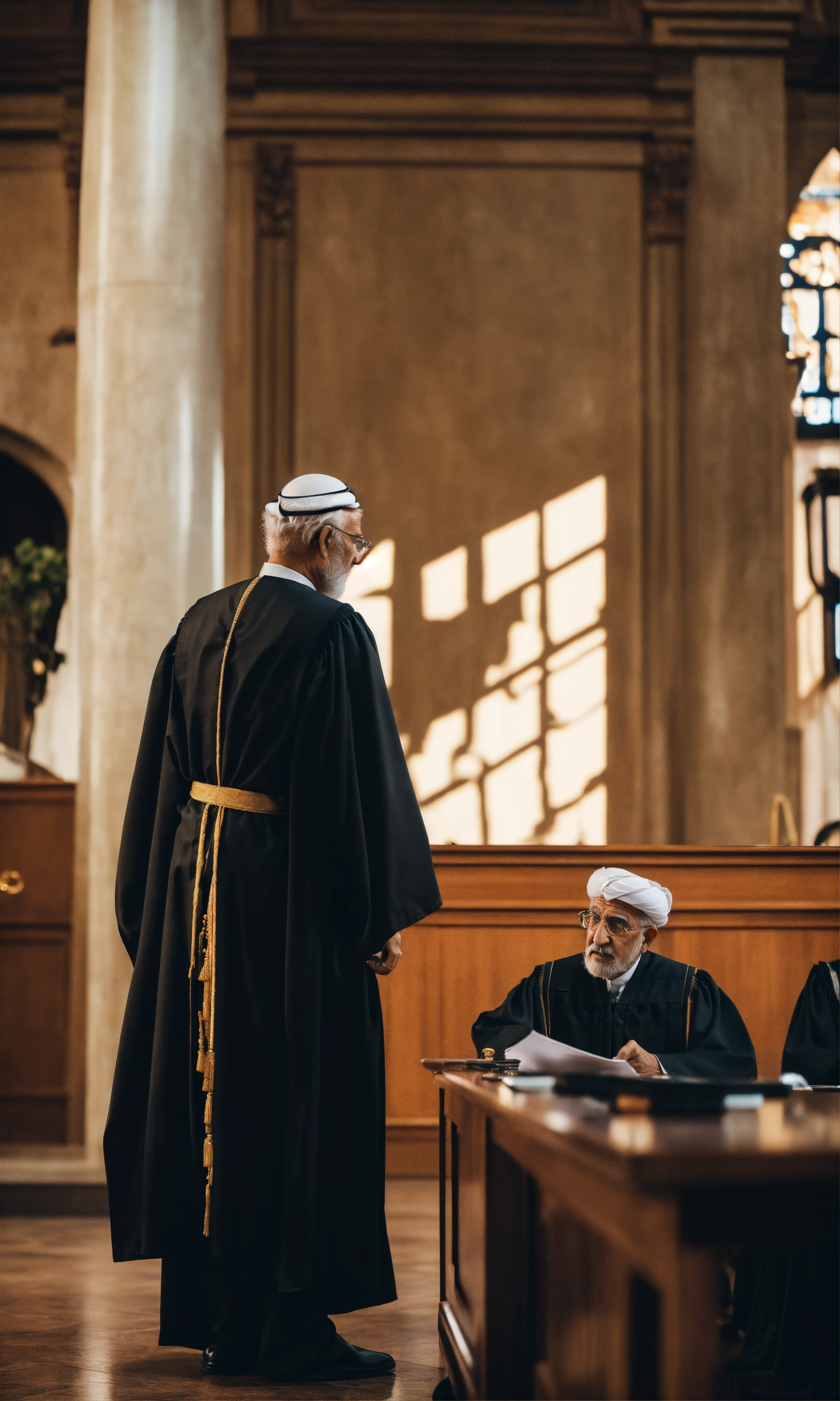 A middle eastern judge talking in a court, an old man standing before him, surreal photo, fujifilm xt3, indoor, good lighting, raw photo, 8k uhd, film grain, unreal engine 5, ray trace