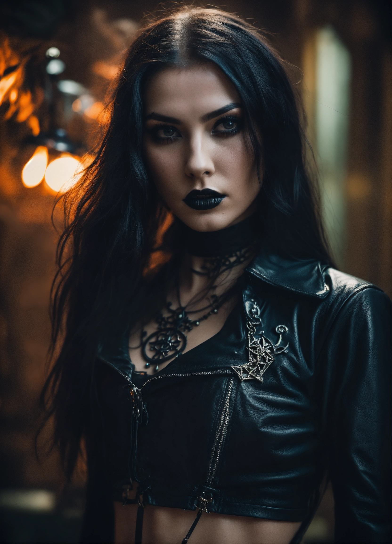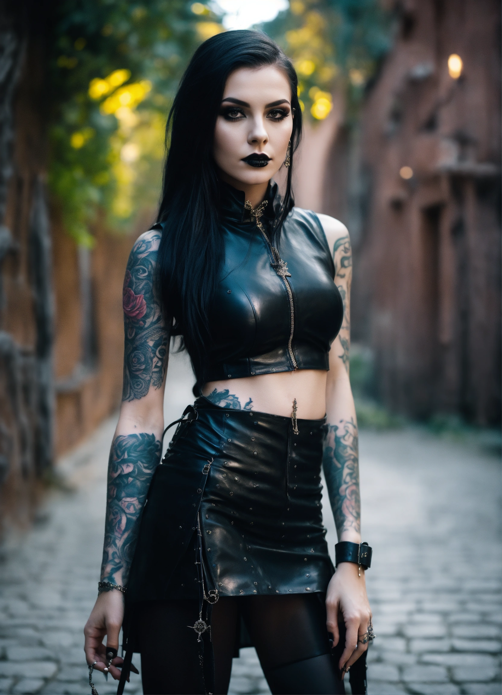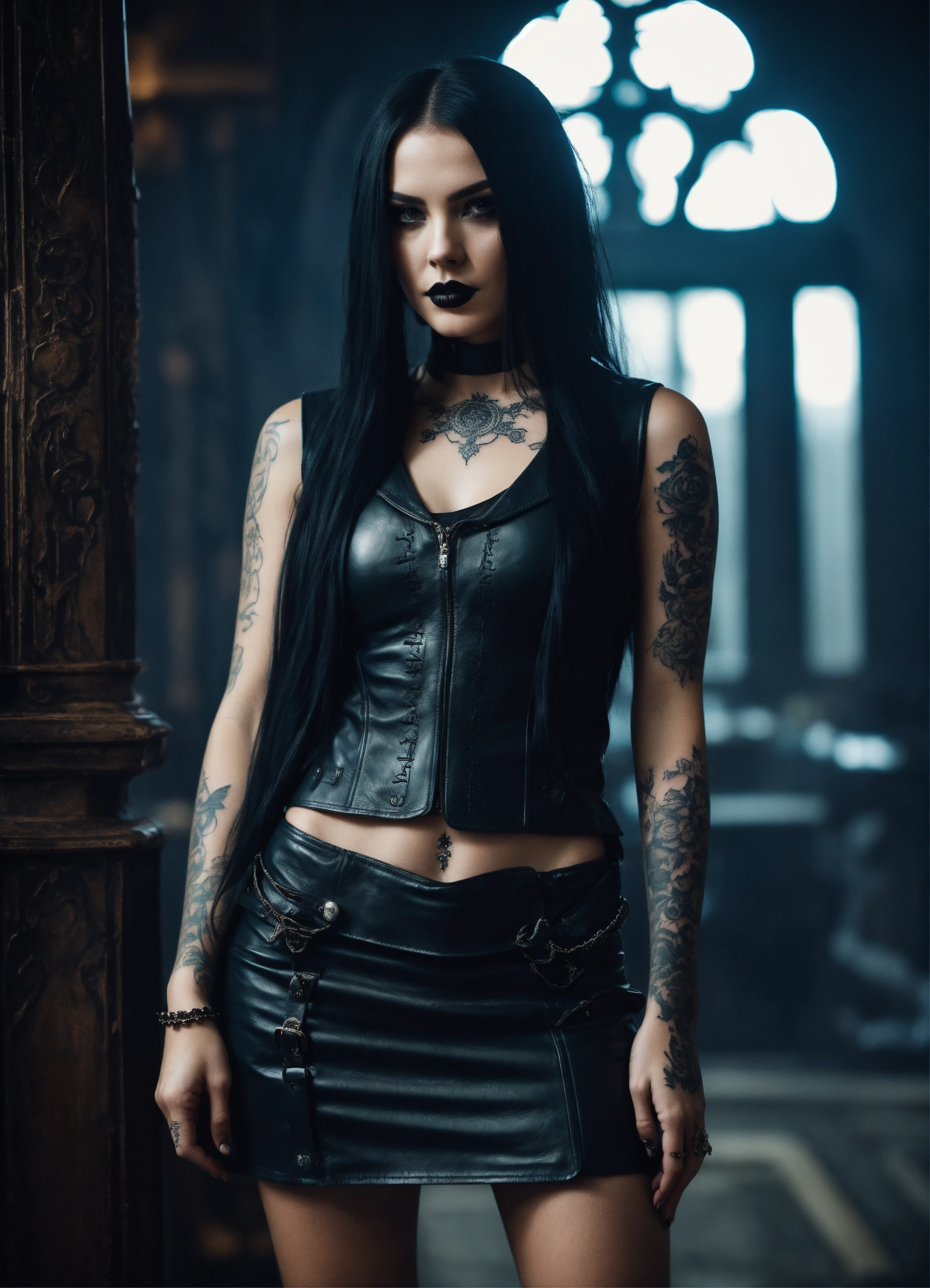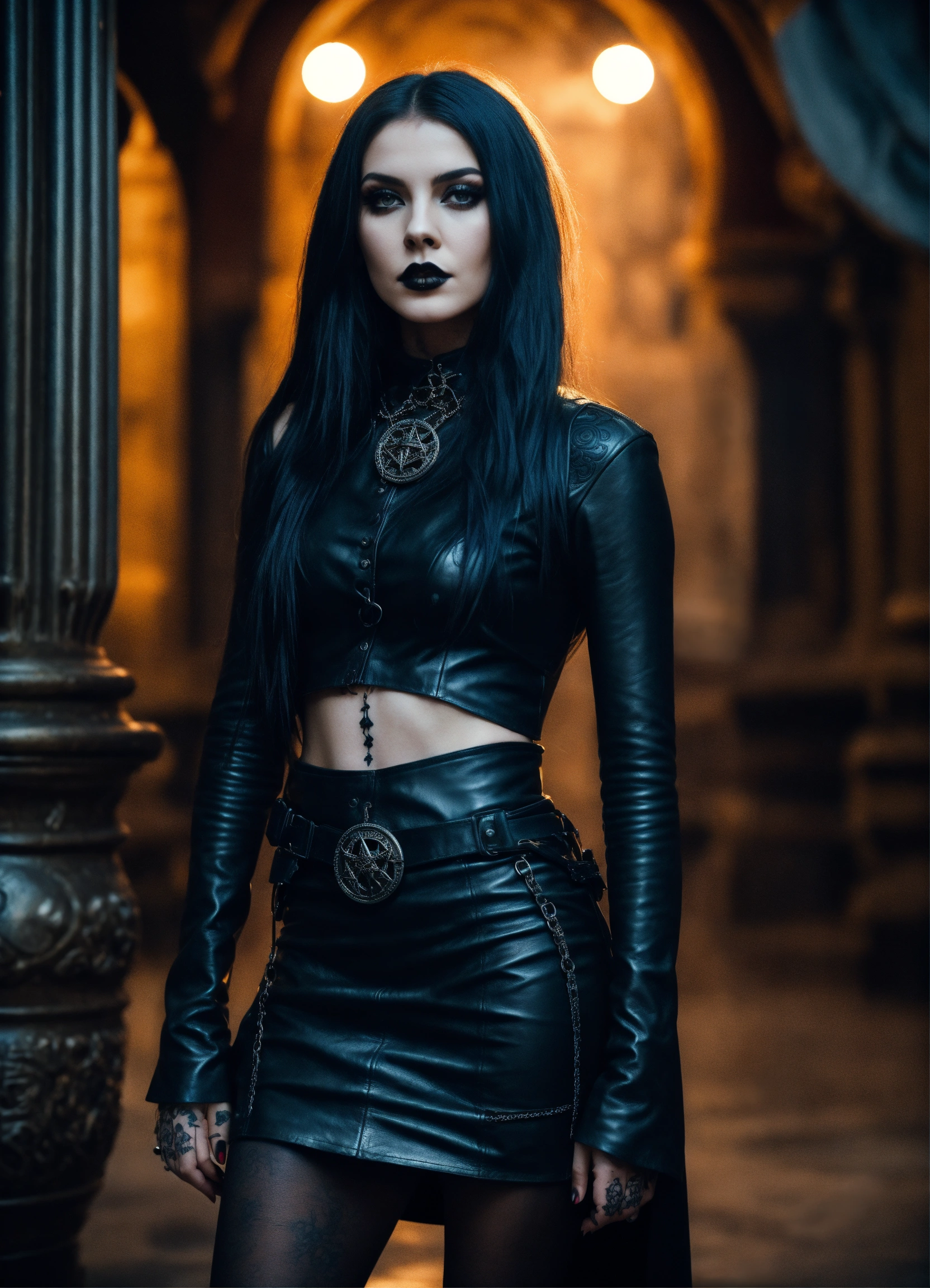 Beautiful extremely goth model young girl wearing black leather topic, short leather skirt, tatoo hypnotizing, long hair. dark sorceress who rules the universe all realms & all dimensions, full body, 8k, dramatic light, super sharp