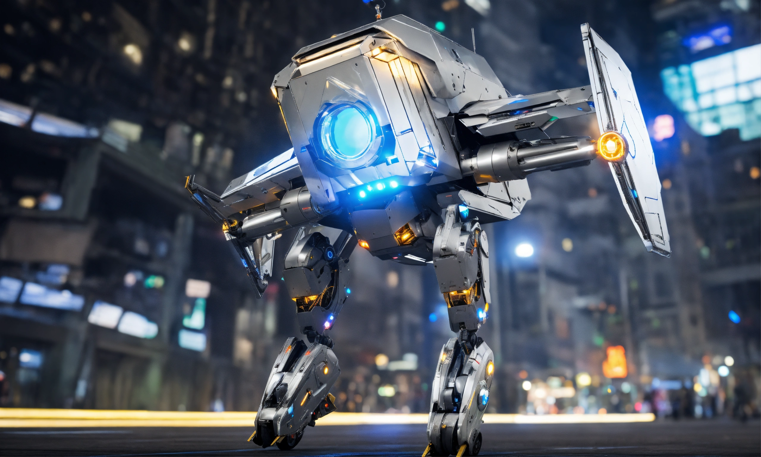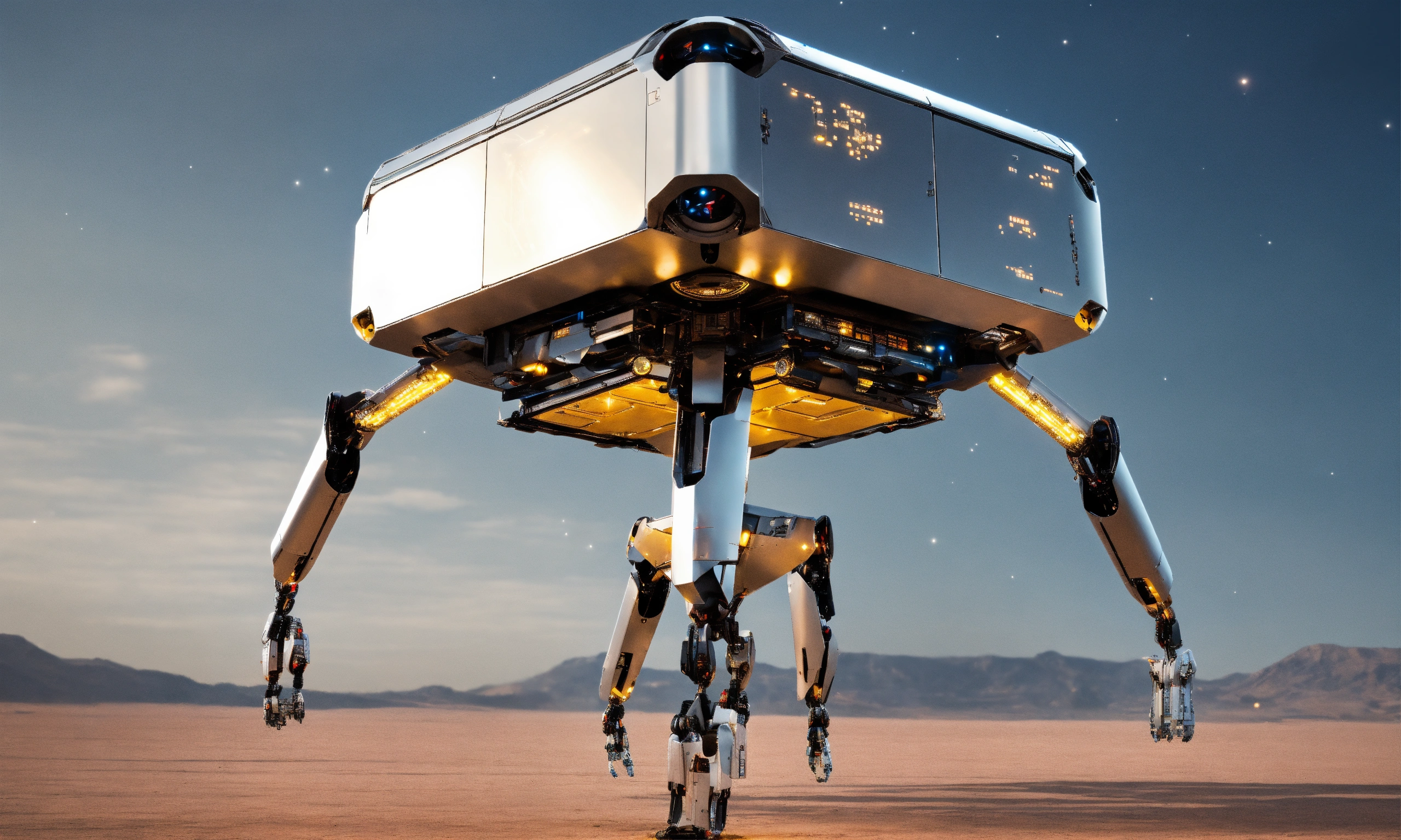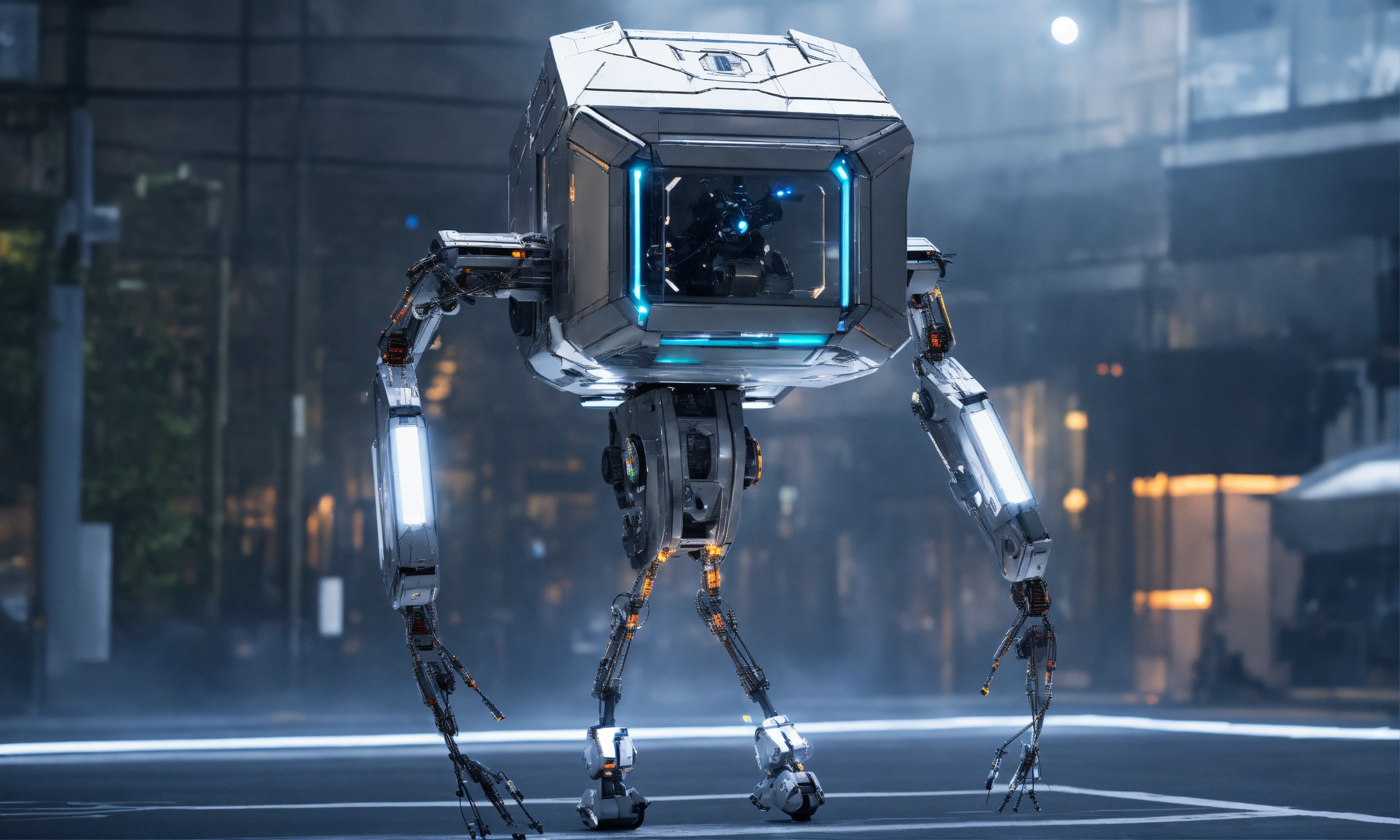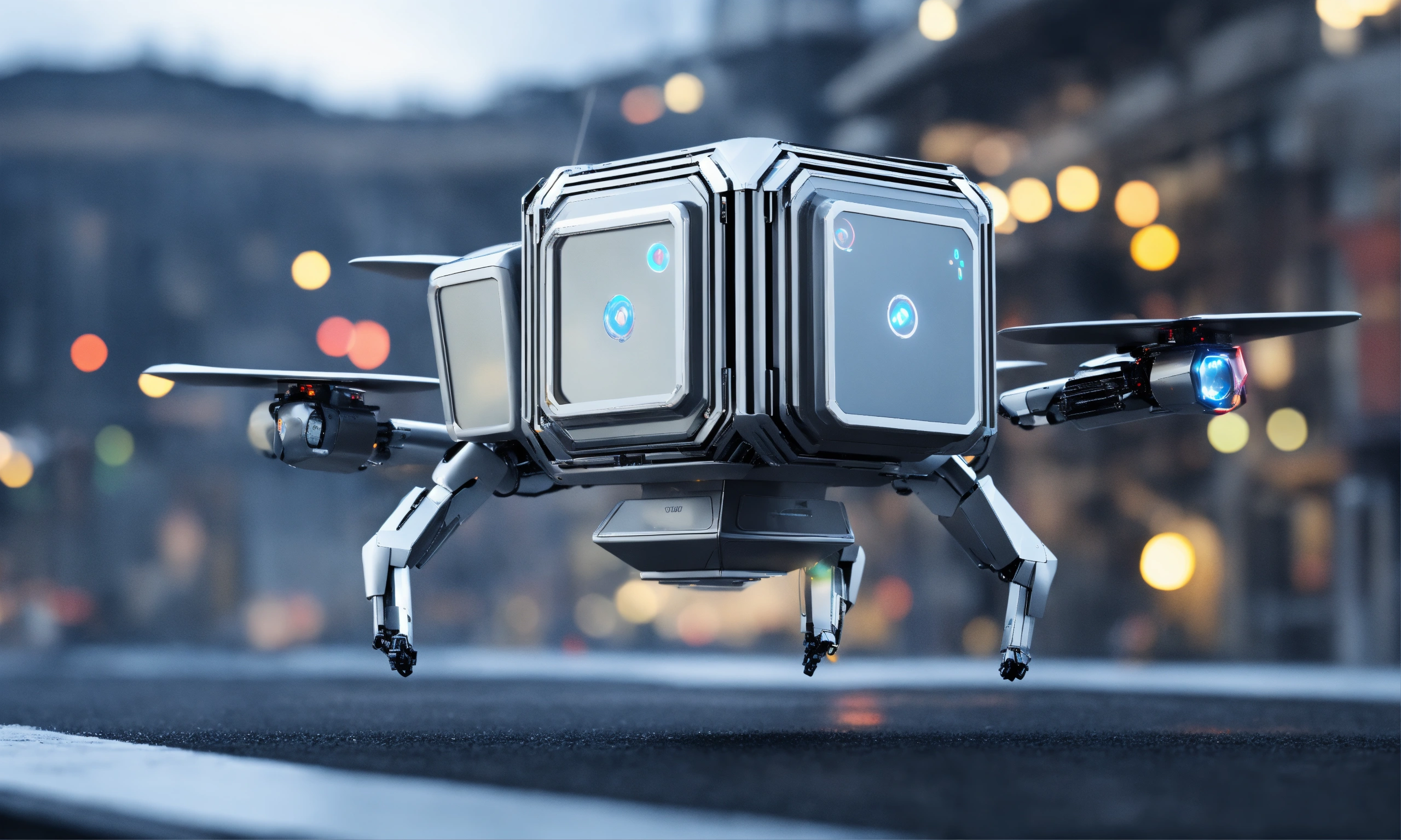 Flying floating robot that looks like a sleek silver cube with arms and lights on front for face