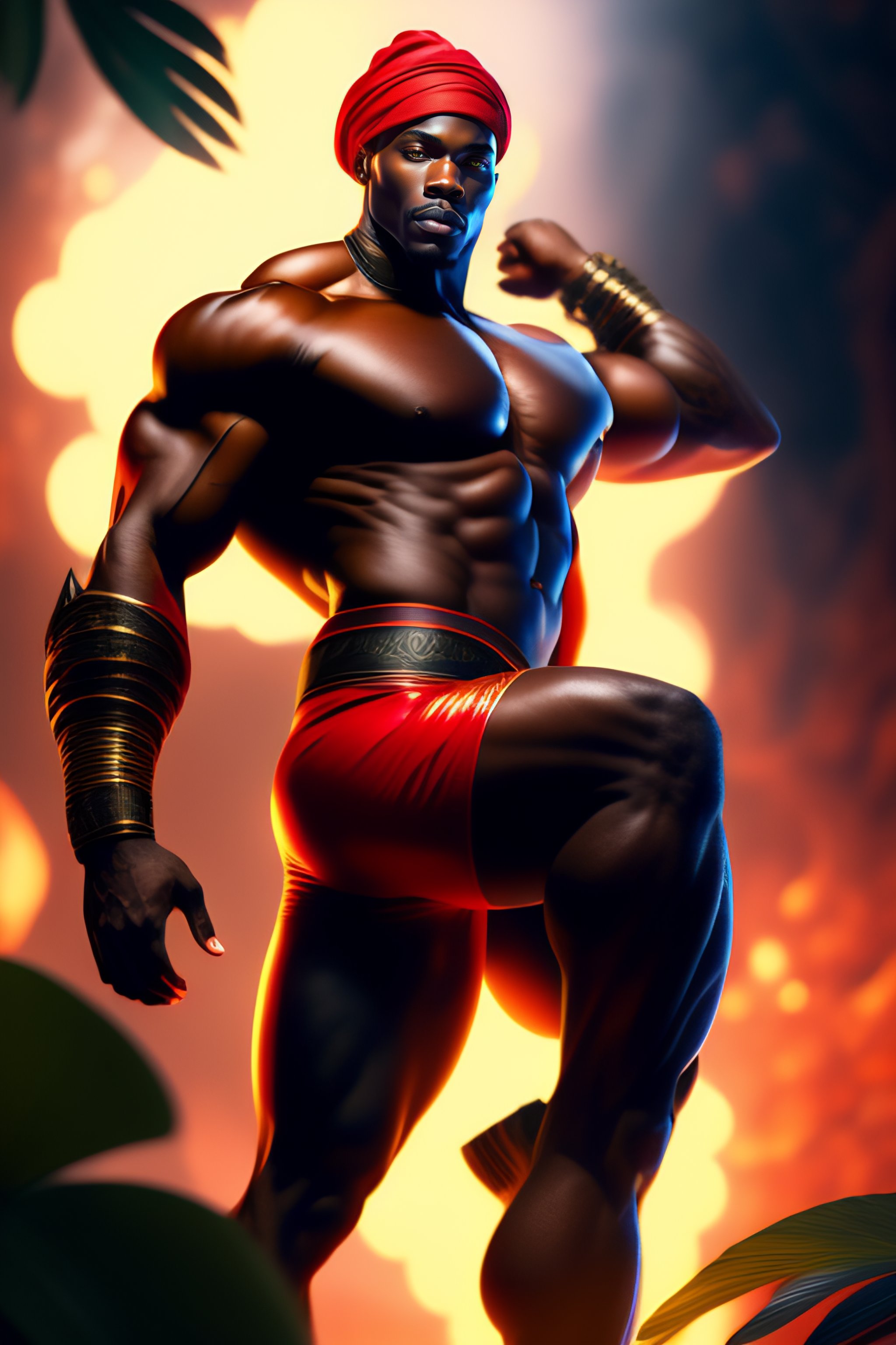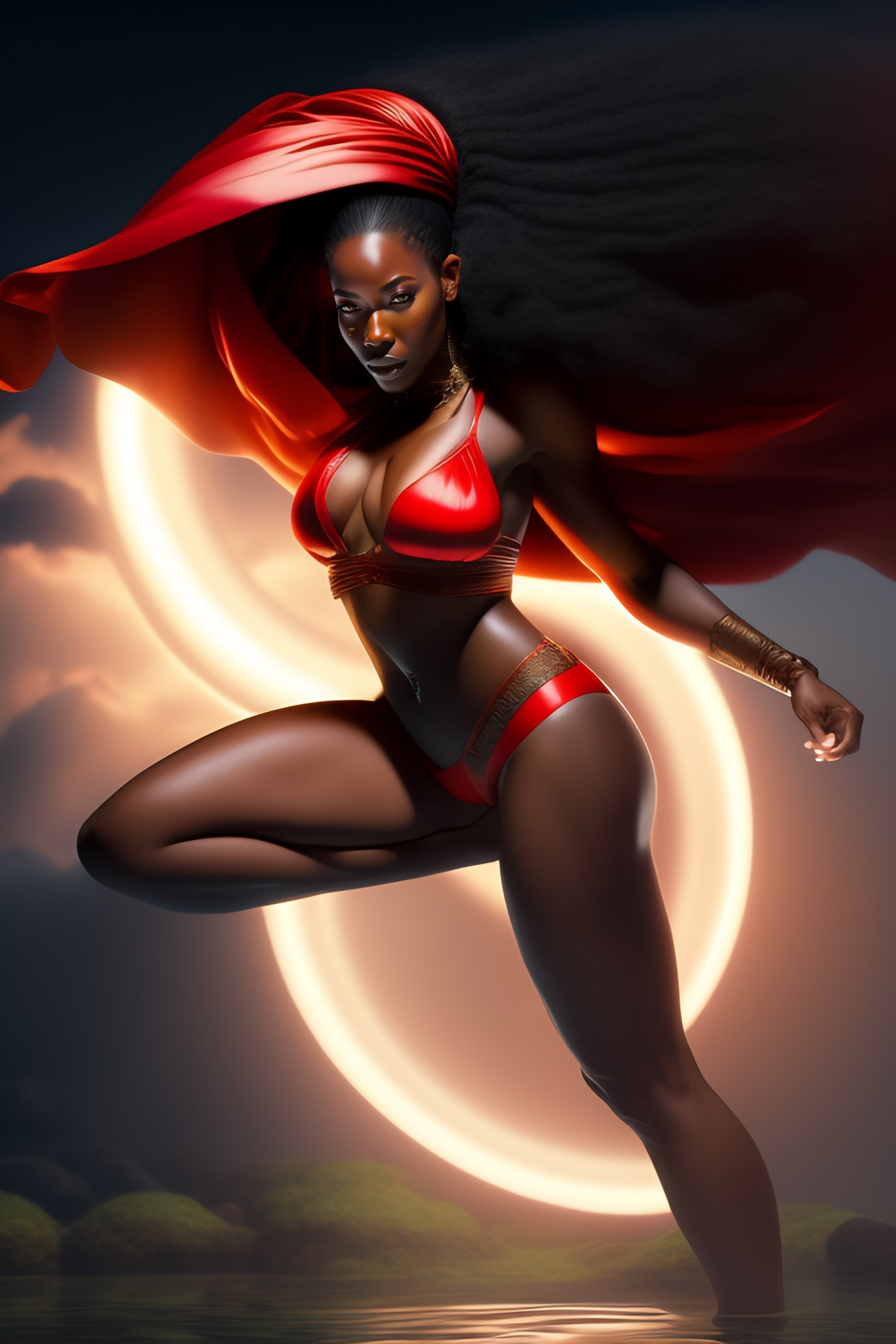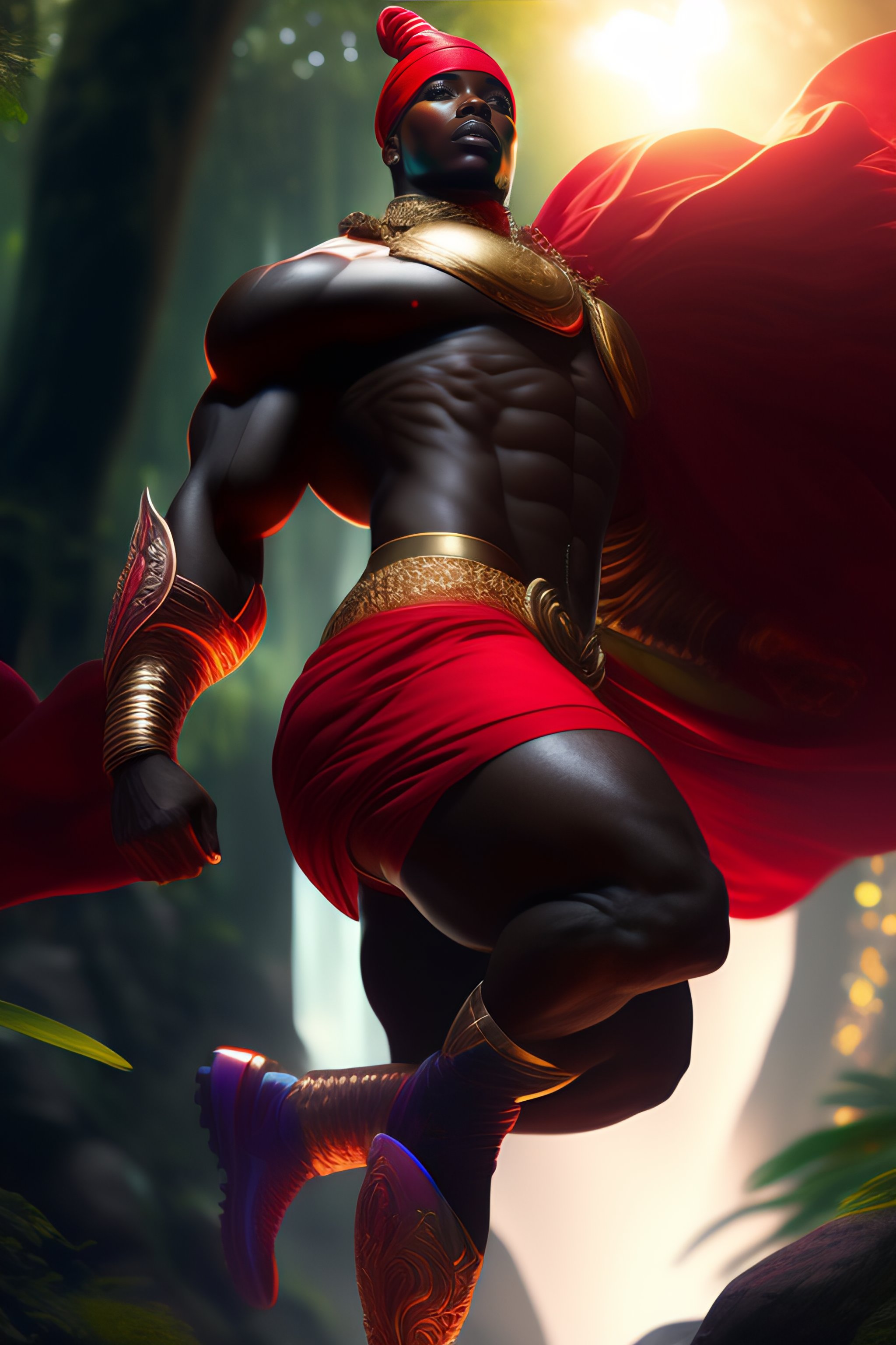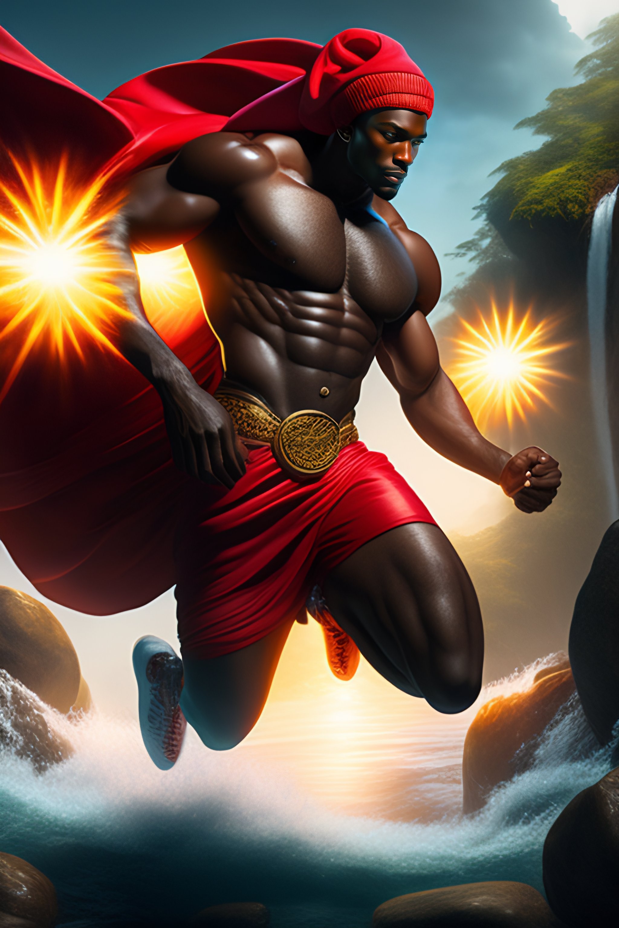Black man red bonnet with only one leg jumping with a whirlpool for a leg in a rainforest full body, sunburst arround head, deadly face with power armor, ultra realistic, concept art, intricate details, eerie, highly detailed, photorealistic, octane render, 8 k, unreal engine. art by artgerm and greg rutkowski and alphonse mucha