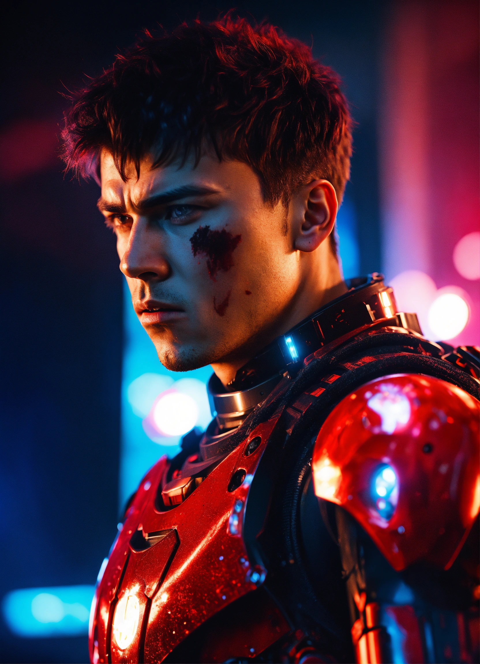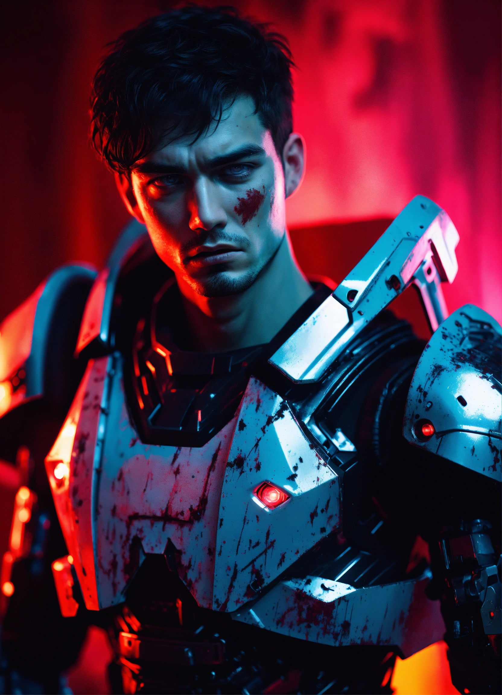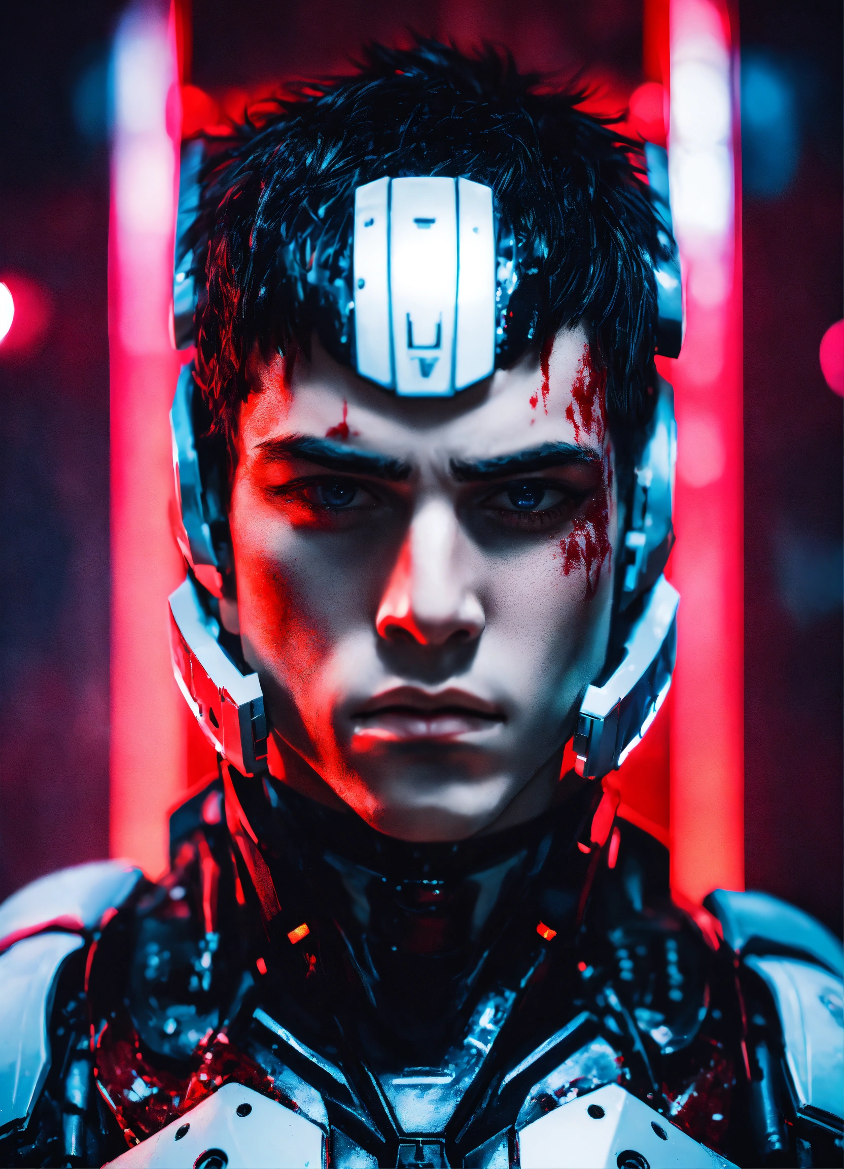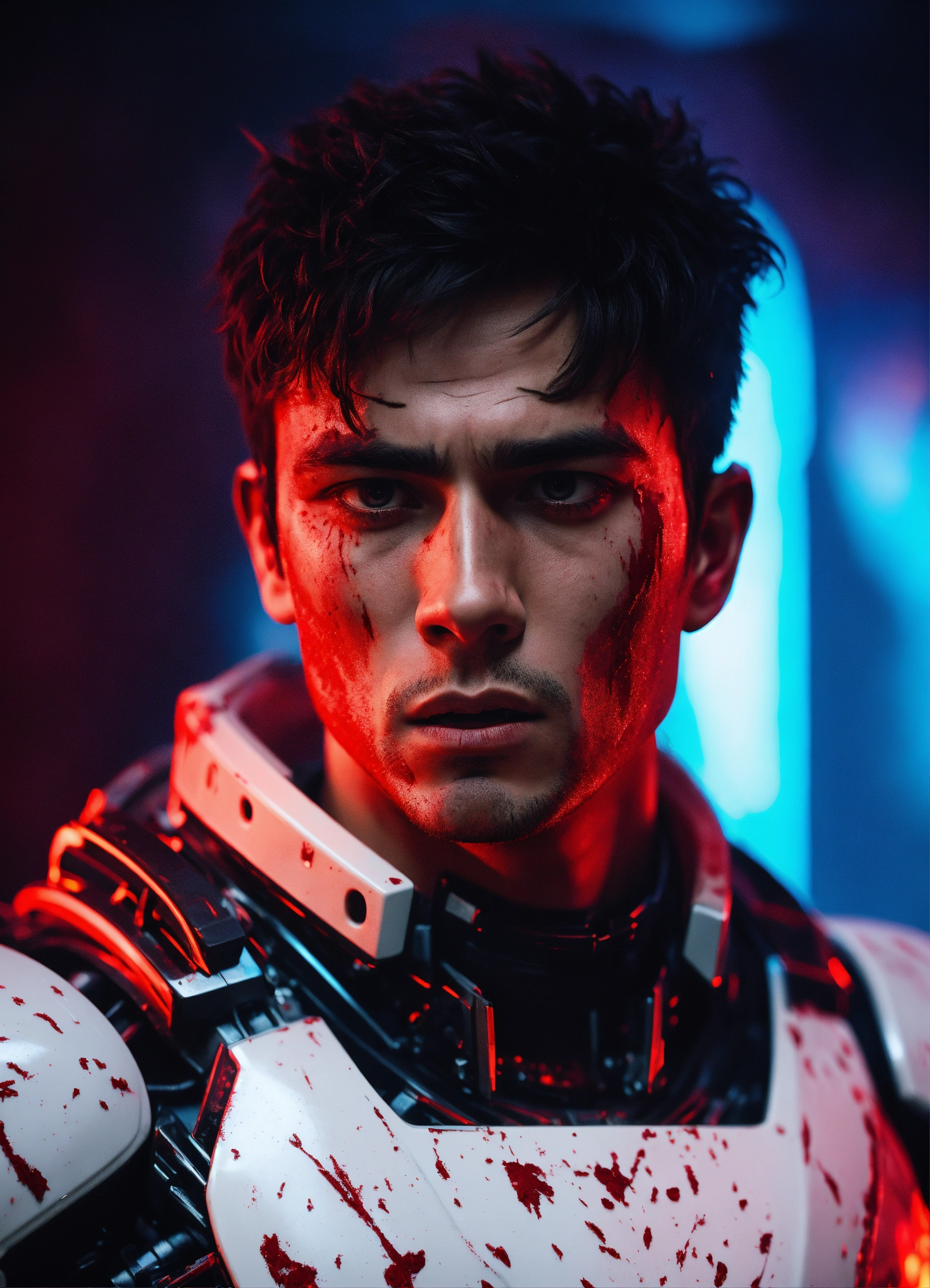 A realistic photograph of a 22-year-old man, with a scary angry expression, black messy short hair, dark black eyes, with a cut scar in the eye, with no beard, strong body, wearing a white robotic armor, covered with red dye, with a bright background with white leds, dramatic illumination, hyperdetailed, hyperrealistic, 8 k