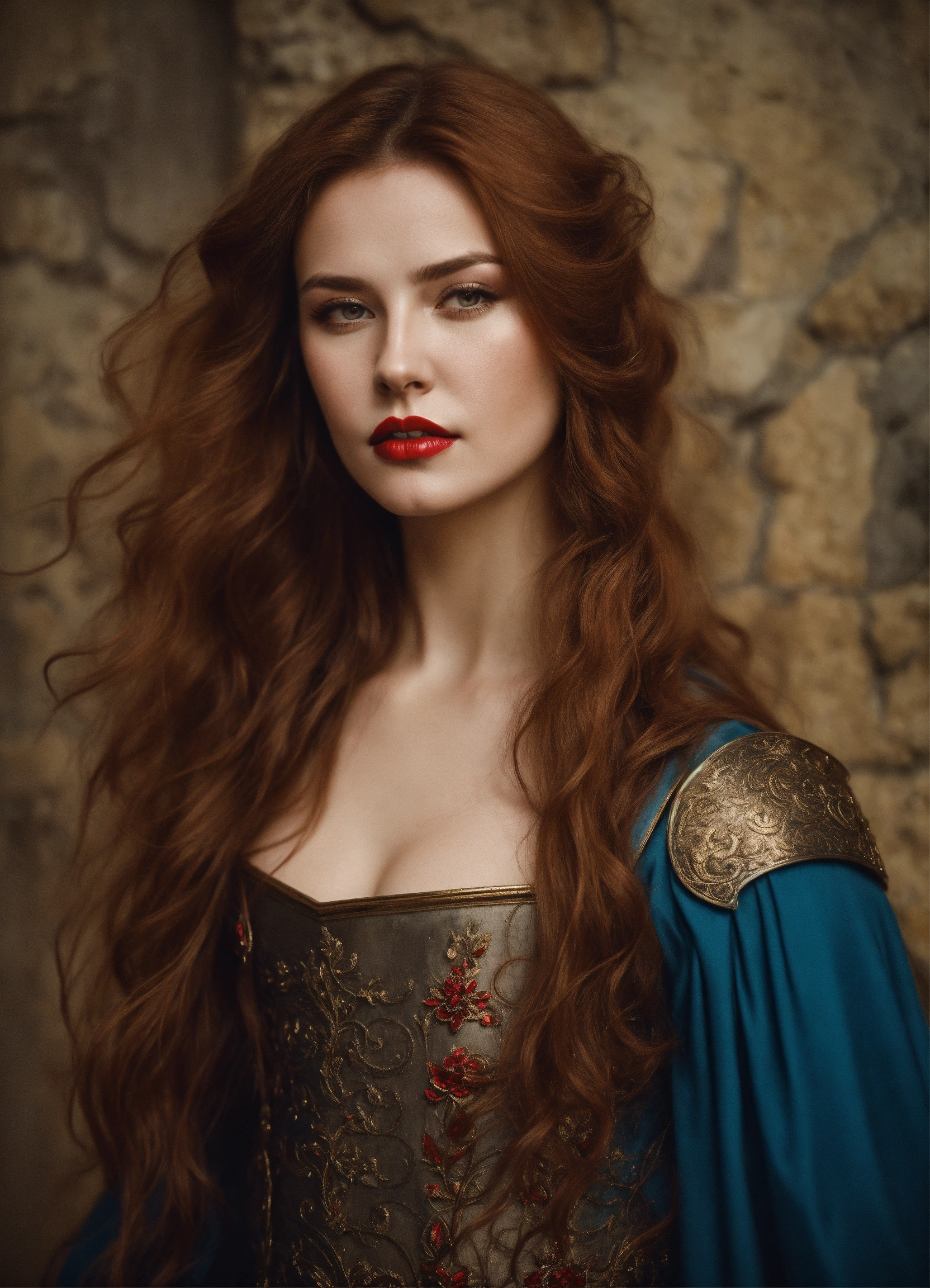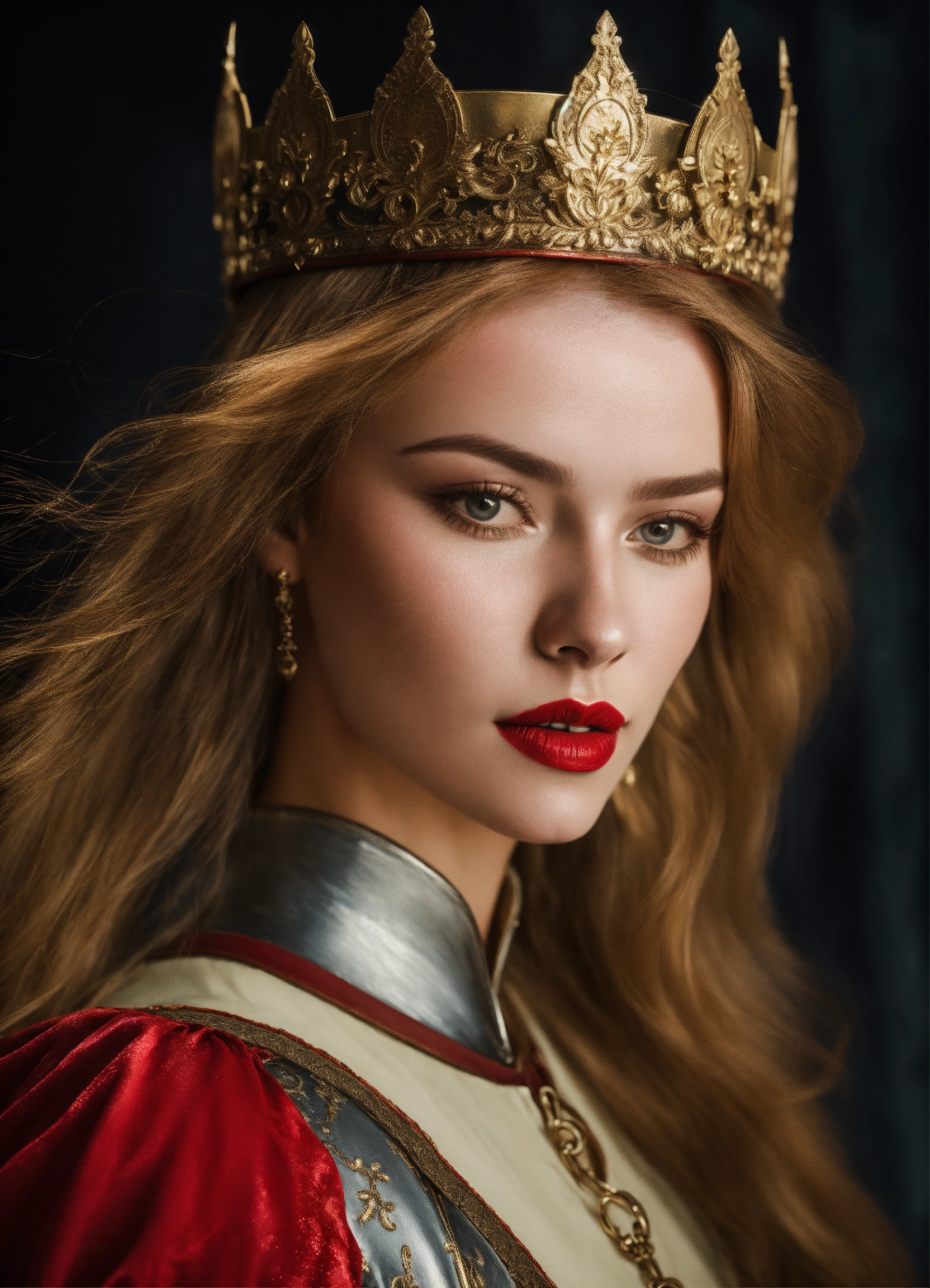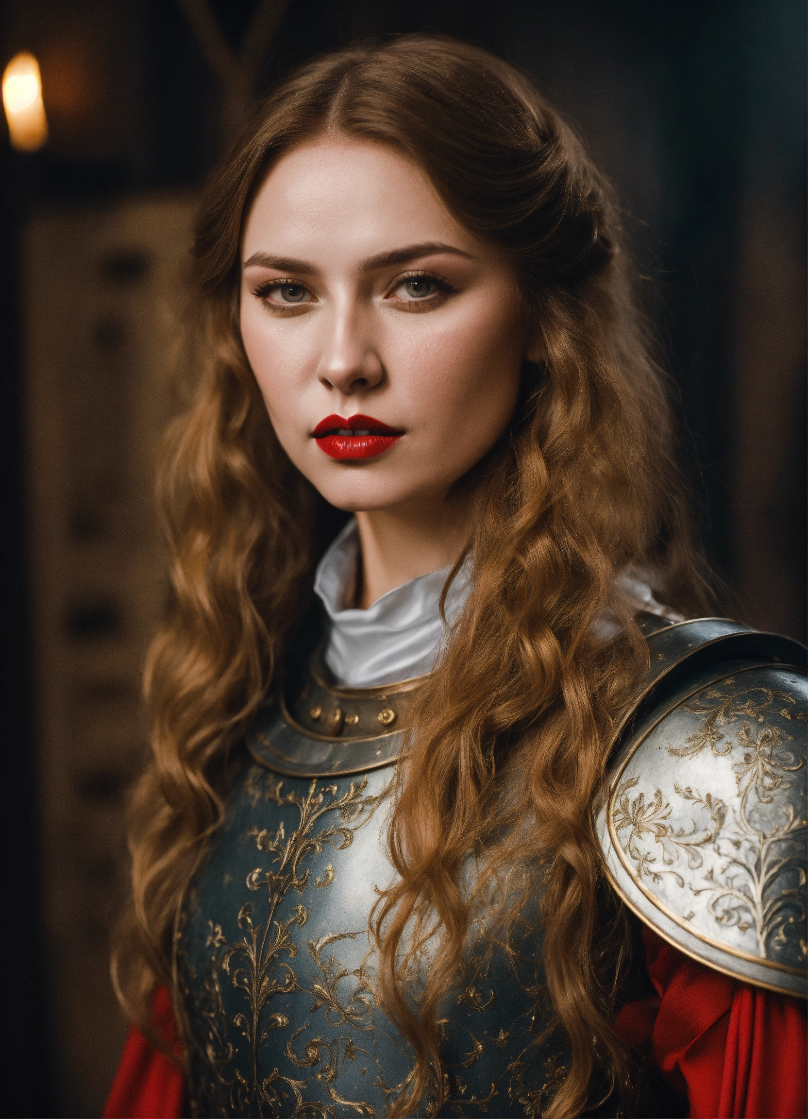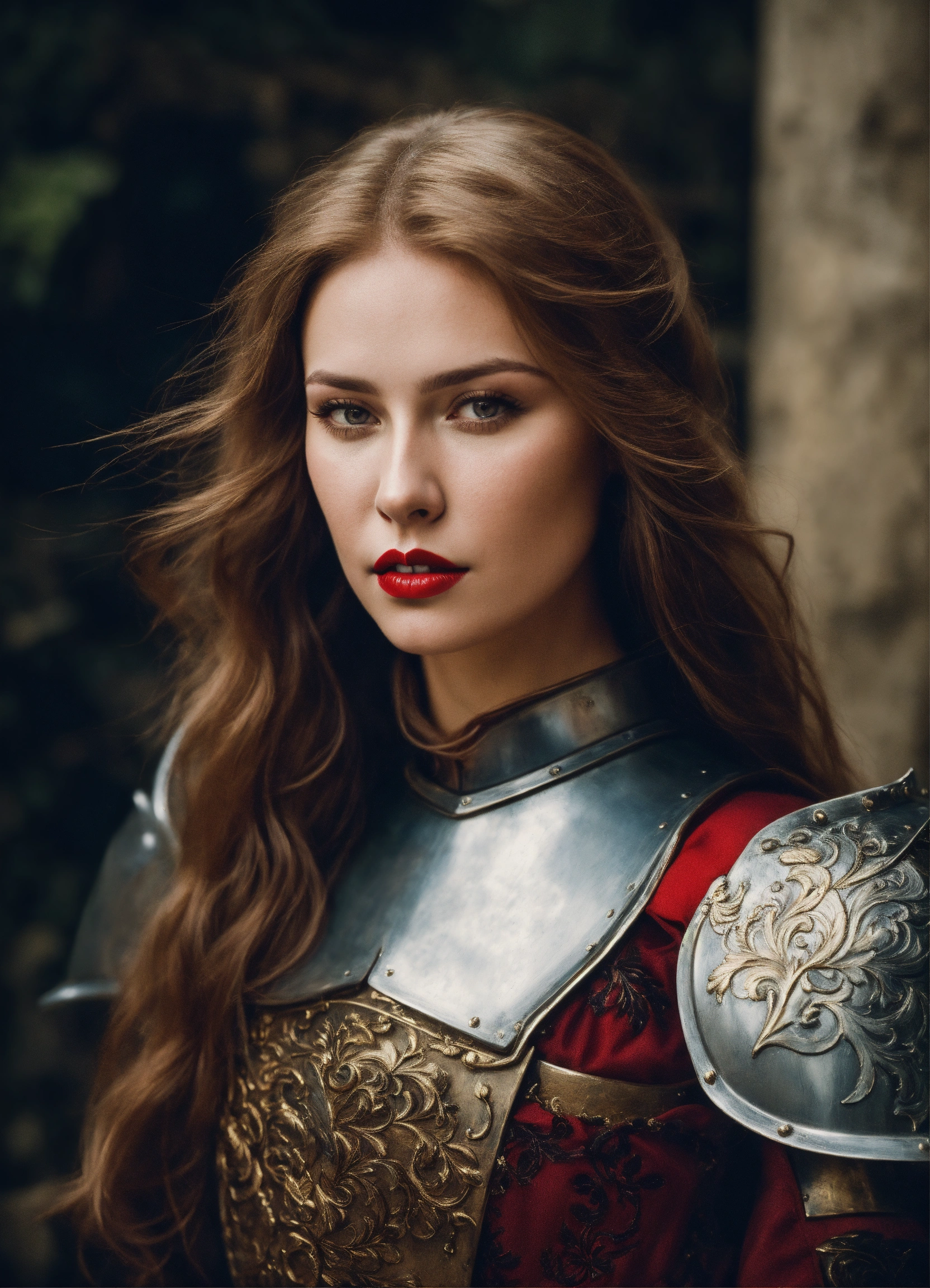 Photo quality portrait of natalia pereverzeva as a beautiful mediaeval knight with flowing hair, red lips and a stern expression