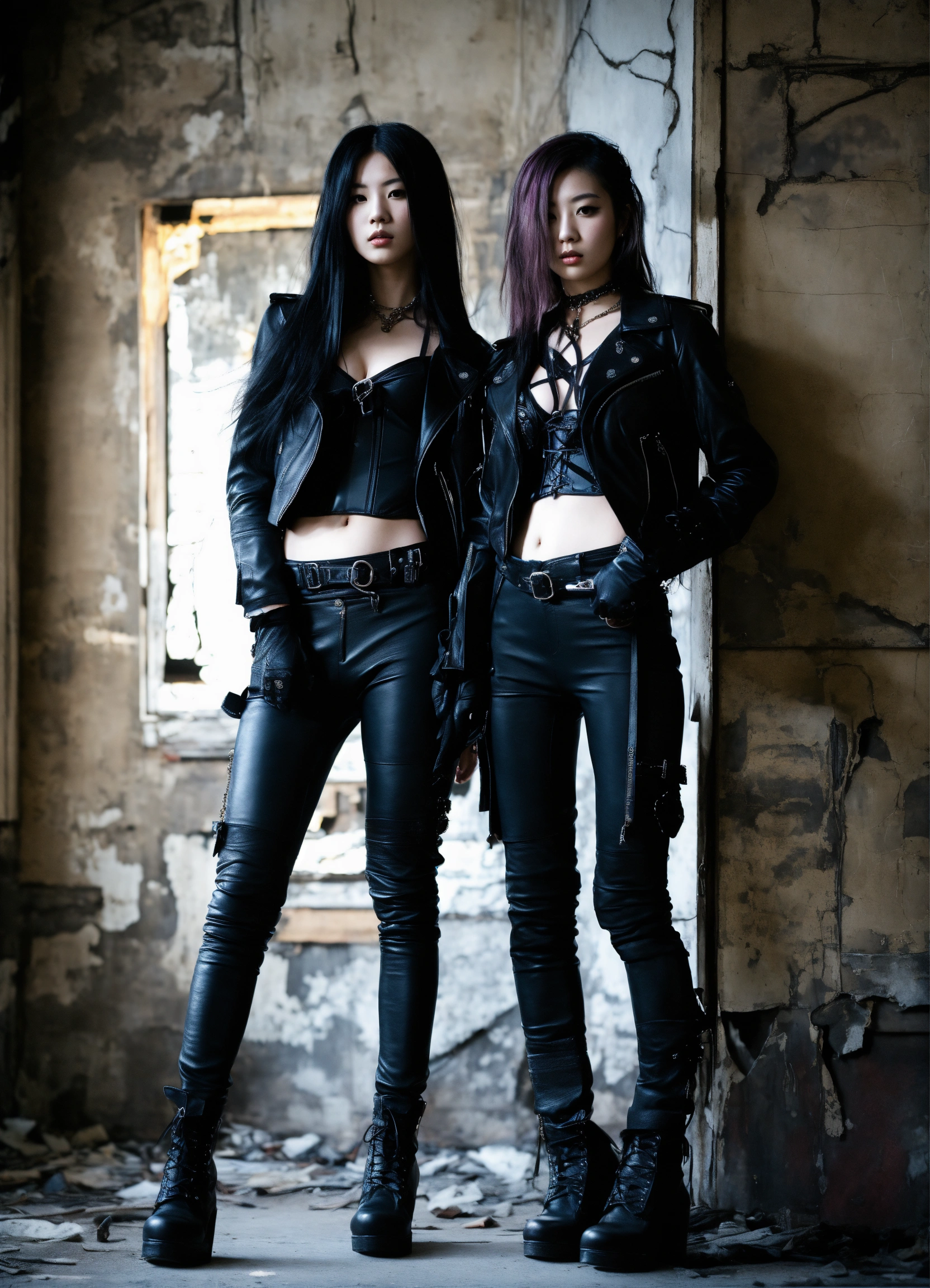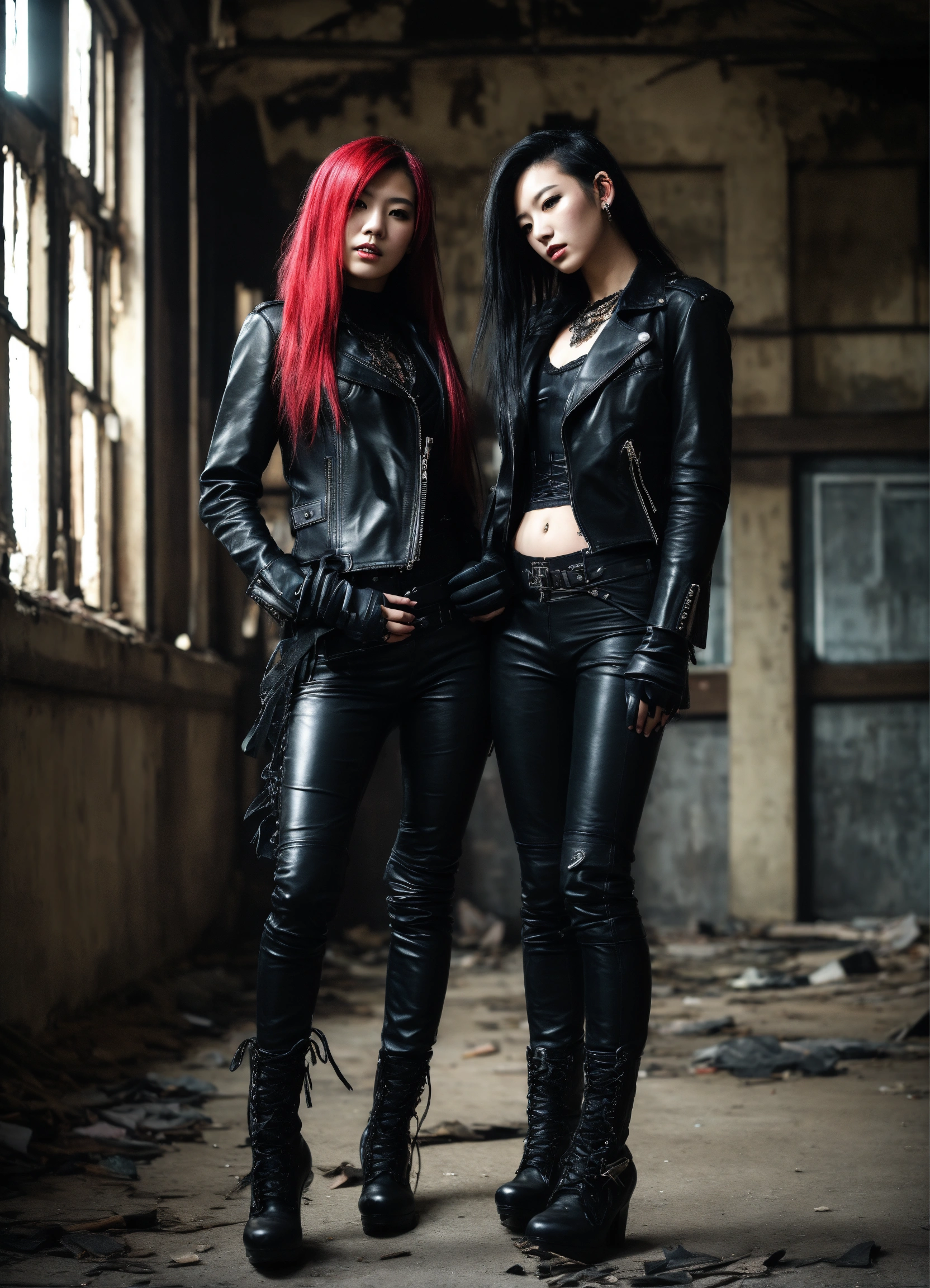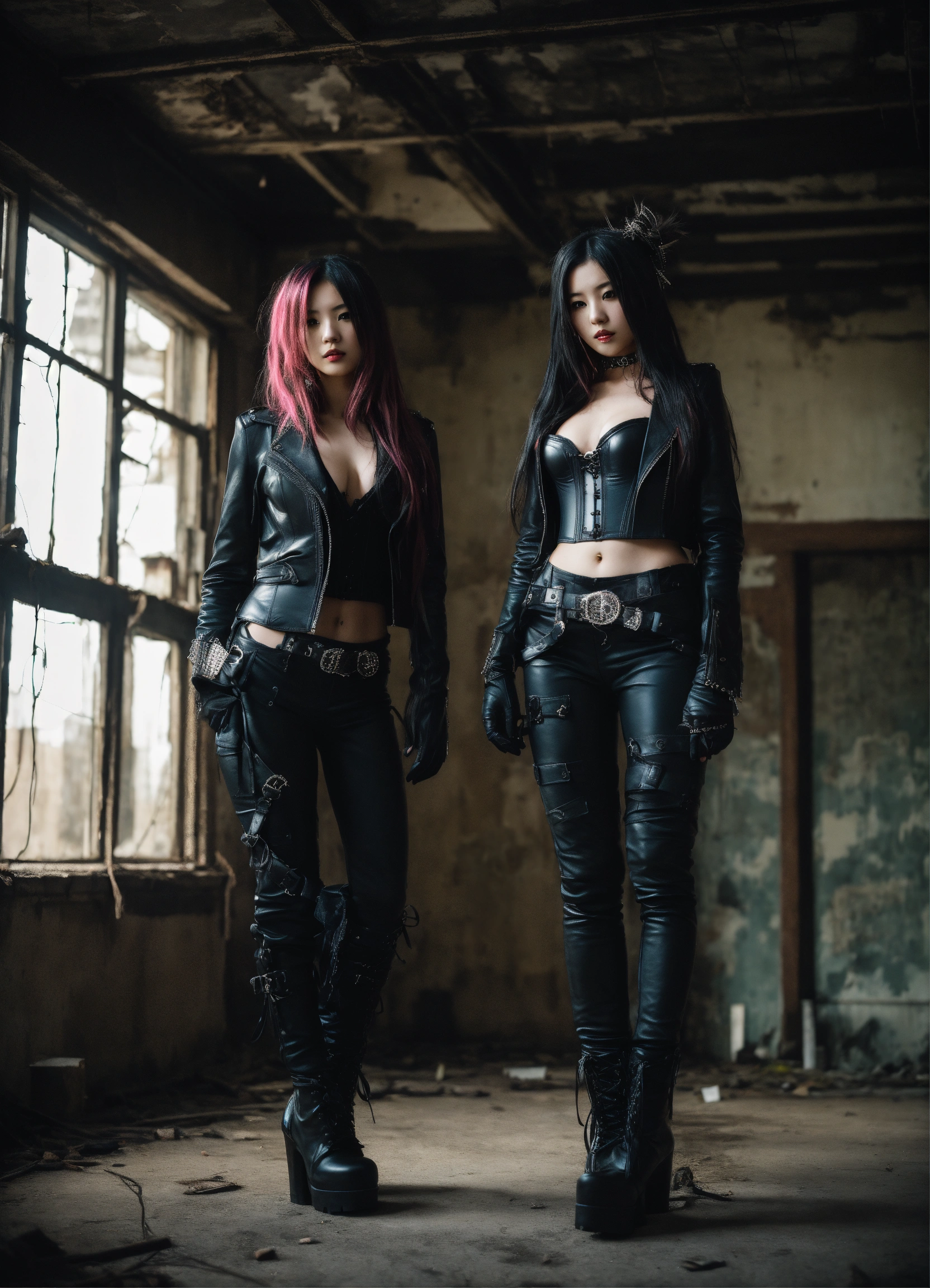 Two young japanize punk women with very long hair posing in a dark abandoned building wearing a black leather corset and black leather gloves, leather jackets and pants, hyper-realistic, photographic portrait