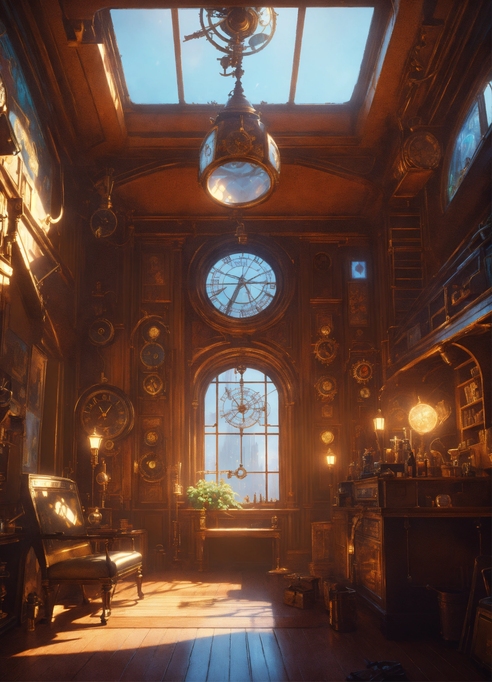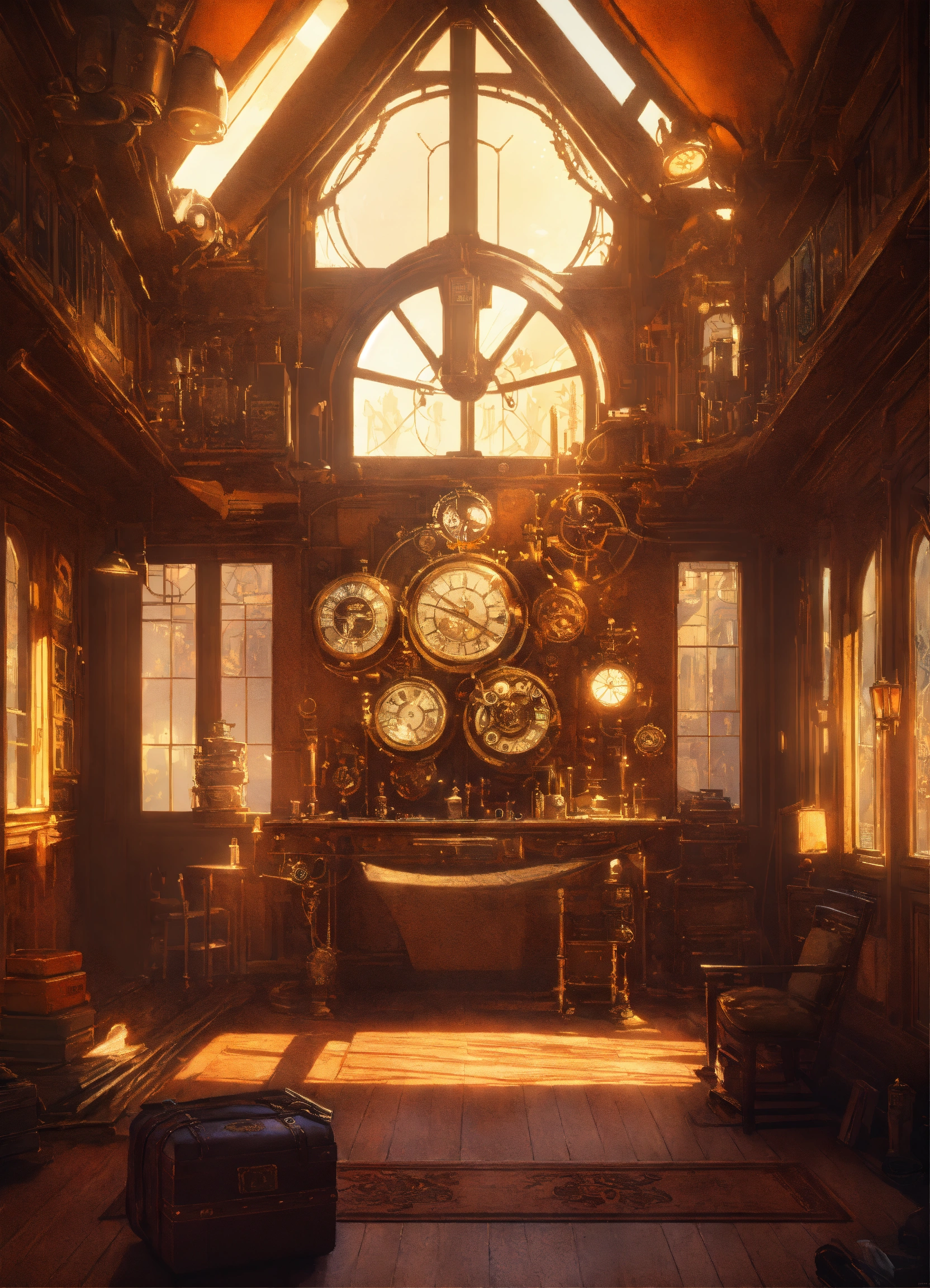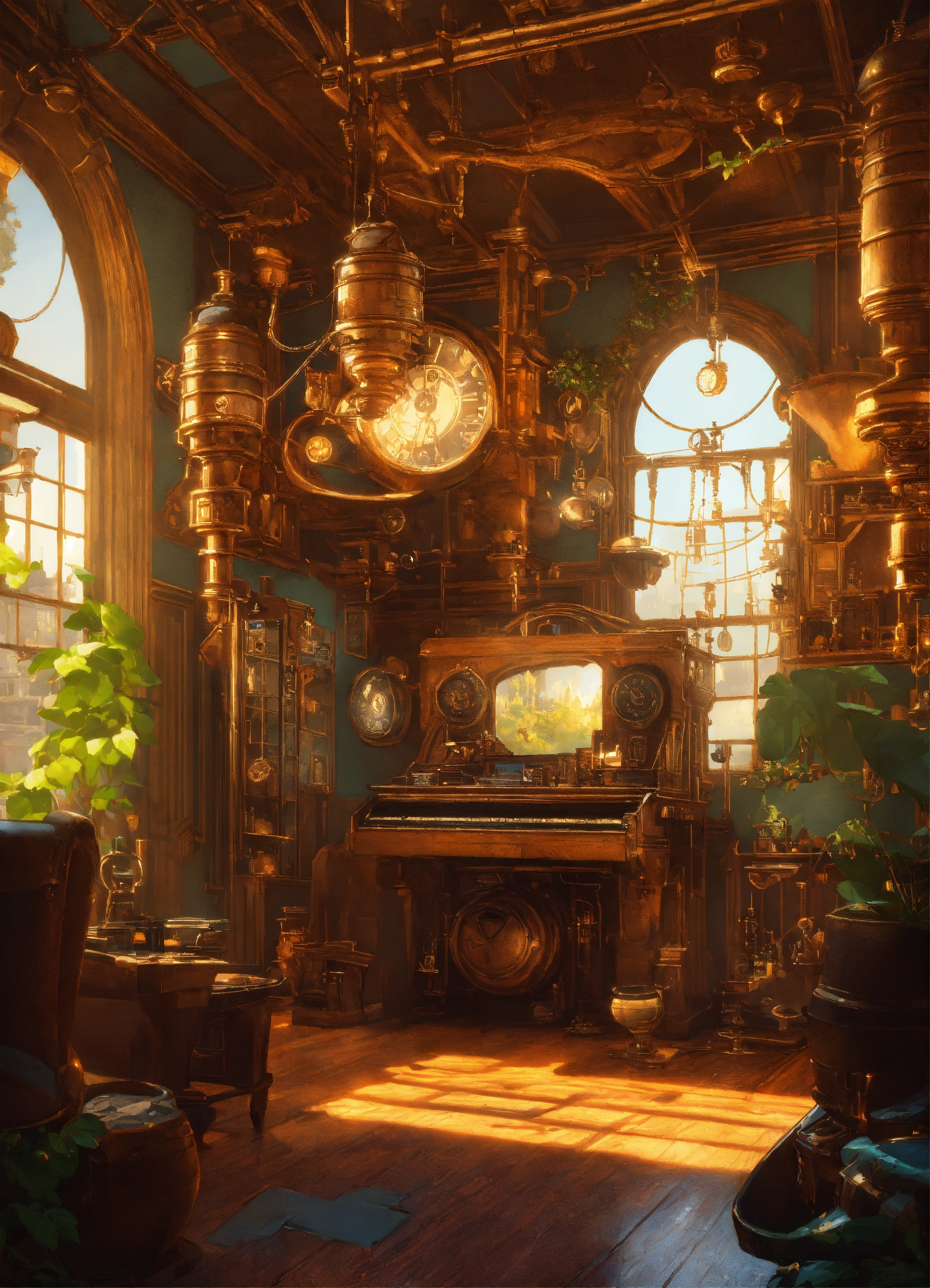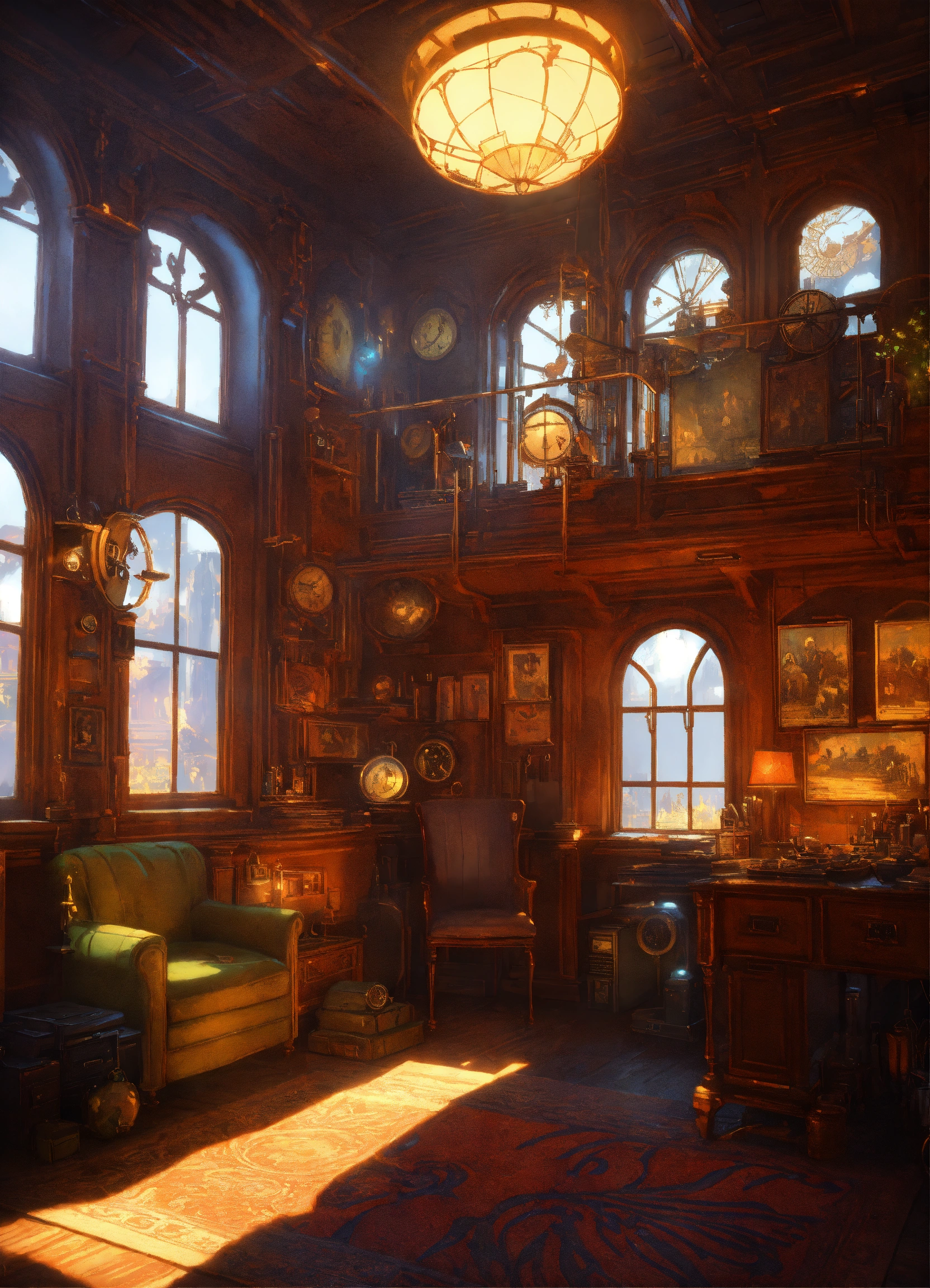 Steampunk room, stephen bliss, unreal engine, fantasy art by greg rutkowski, loish, rhads and lois van baarle, ilya kuvshinov, rossdraws, tom bagshaw, alphonse mucha, global illumination, detailed and intricate environment