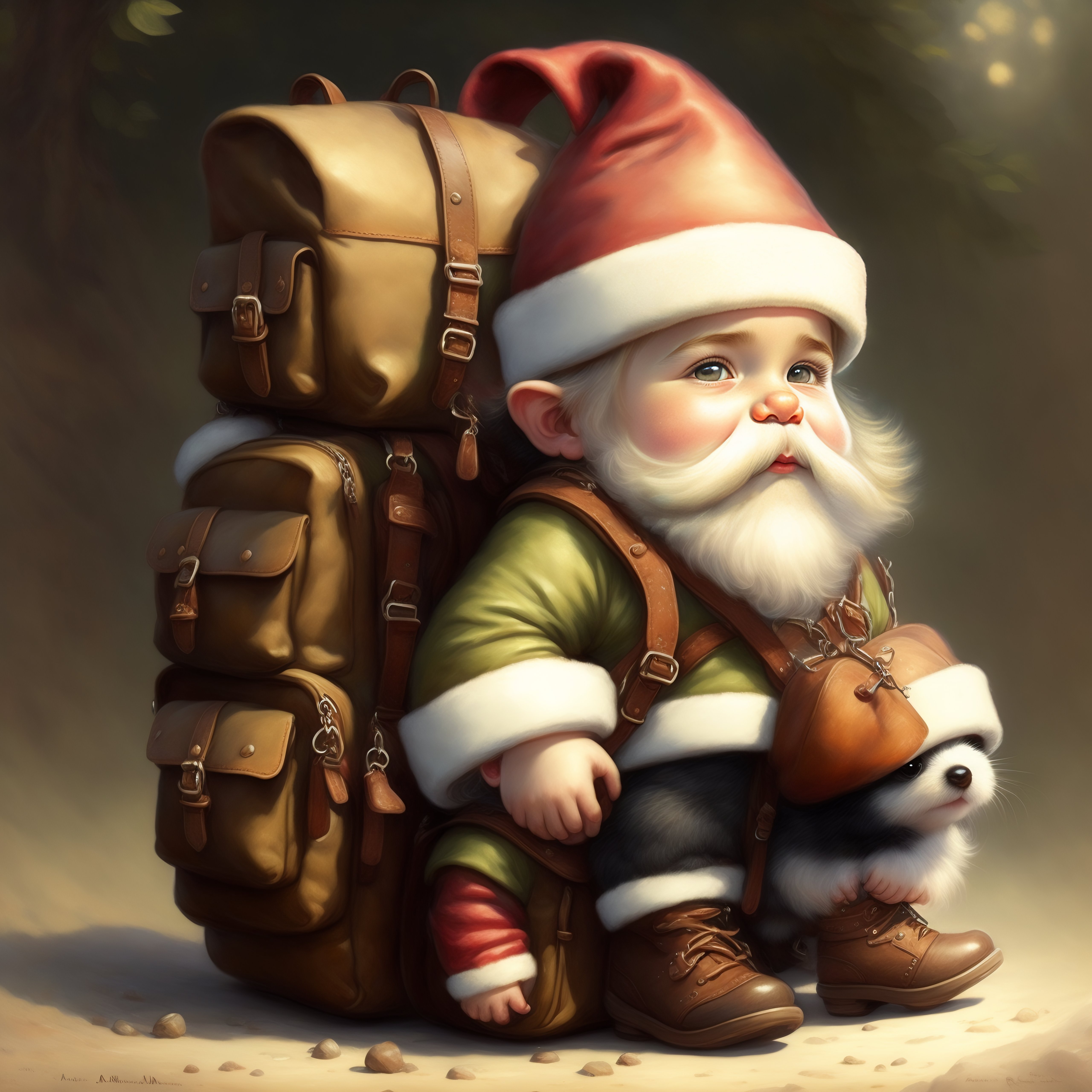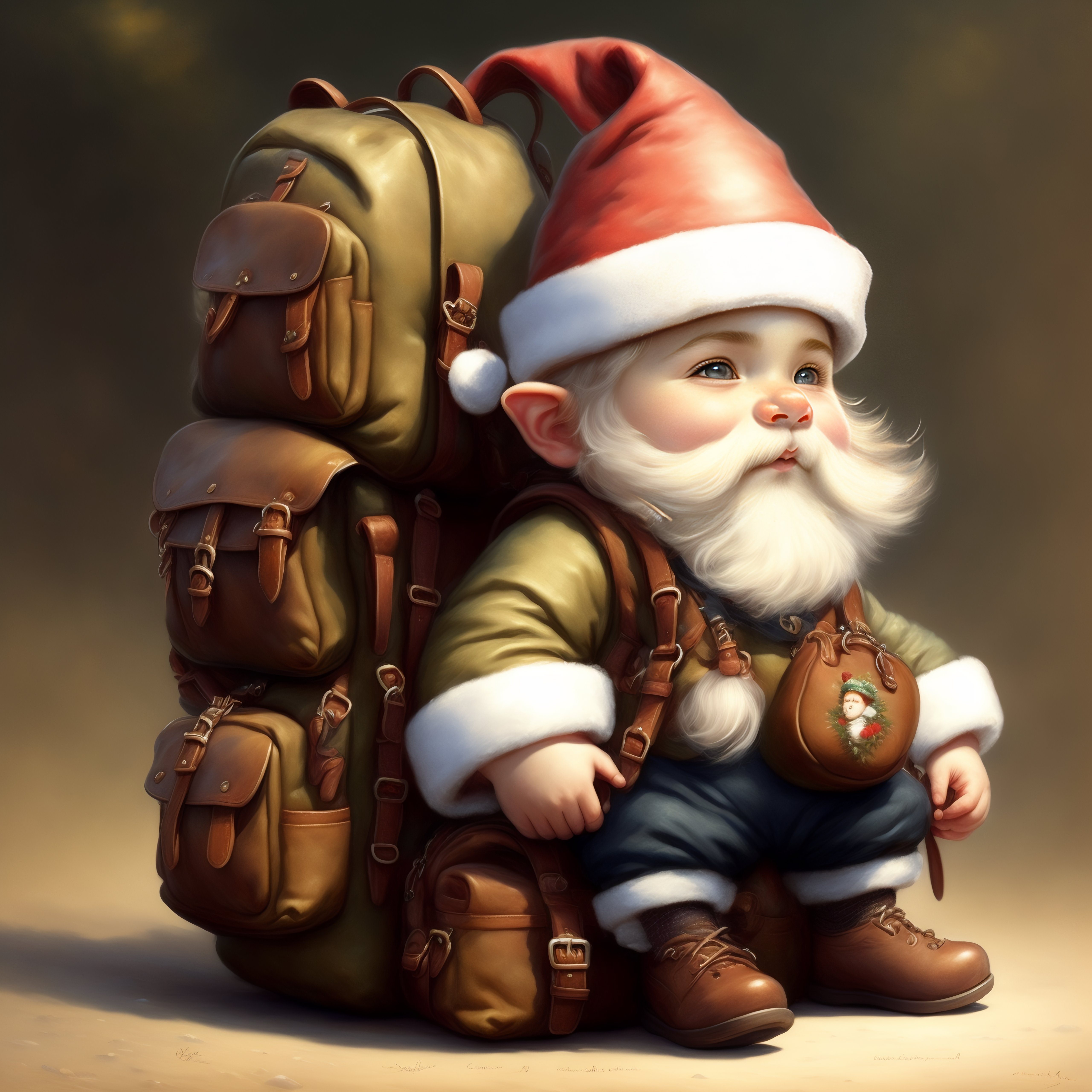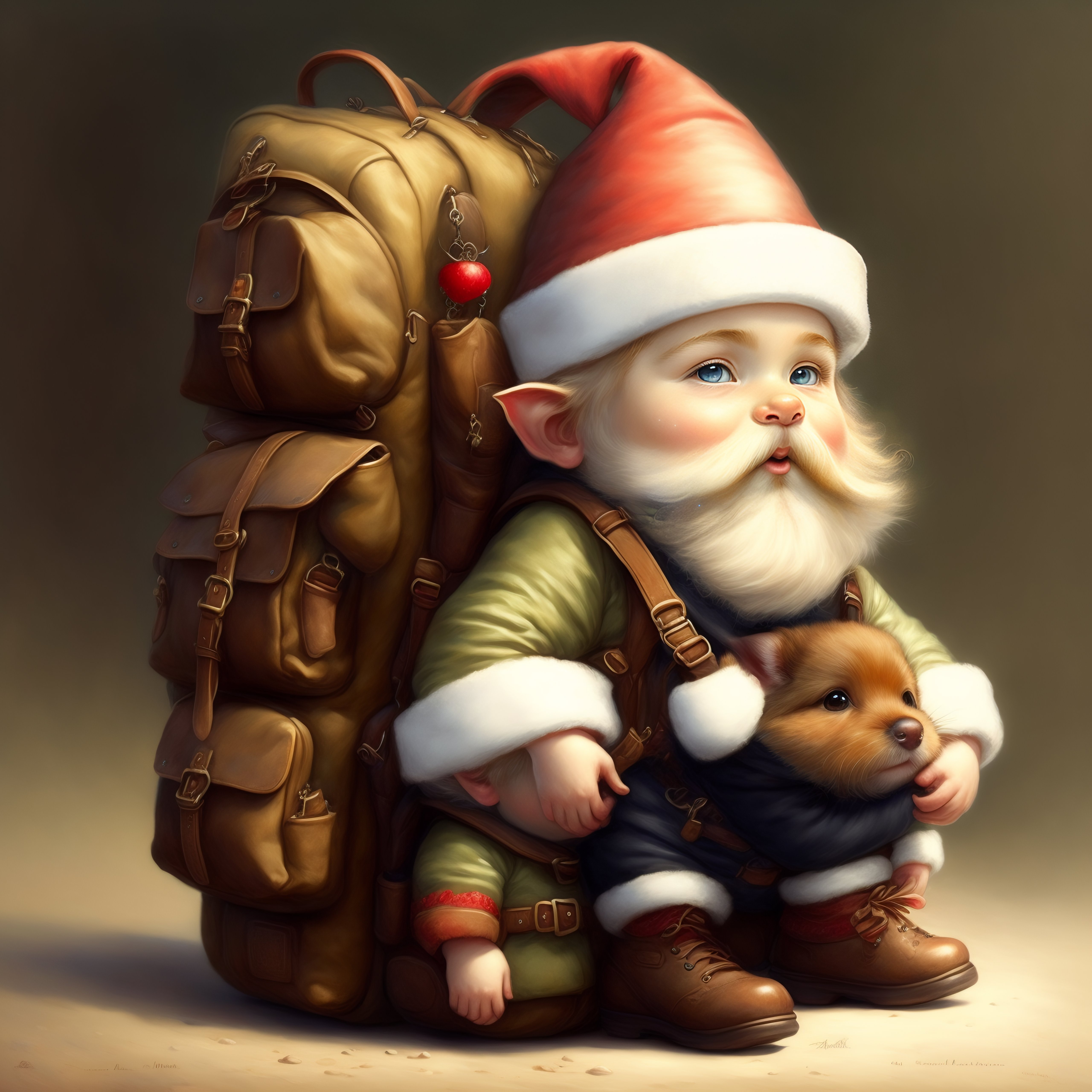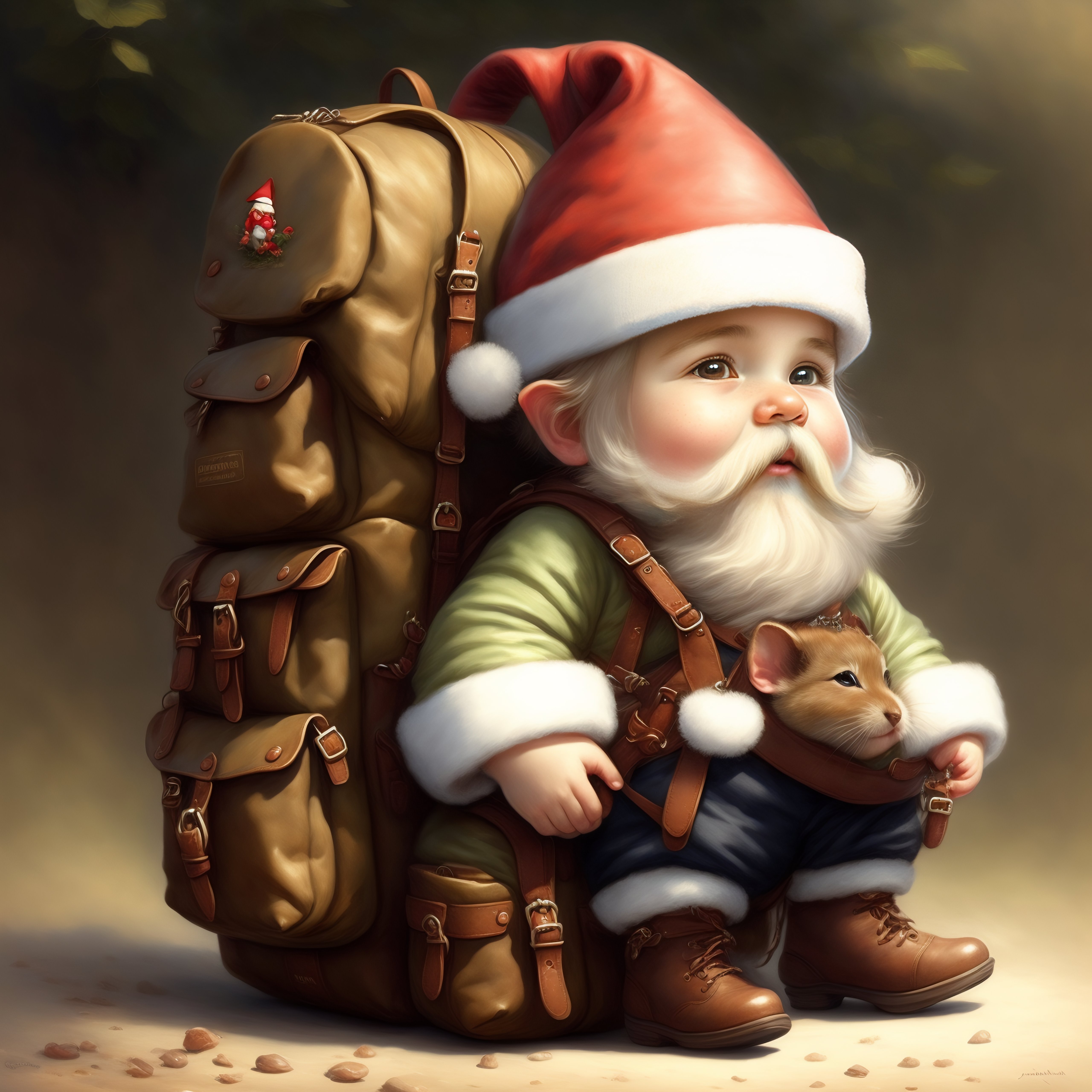 A cute gnome wearing a santa outfit and backpack filled with coal + a mouse sits on the backpack + by jean baptiste monge