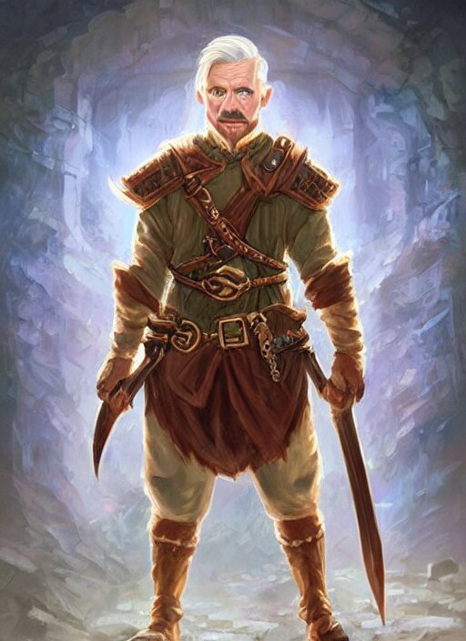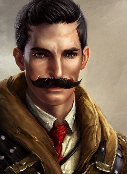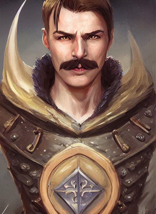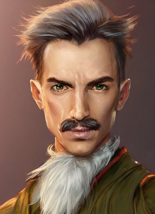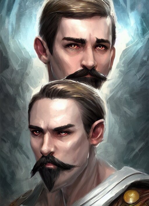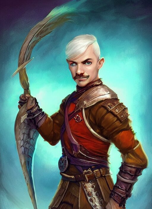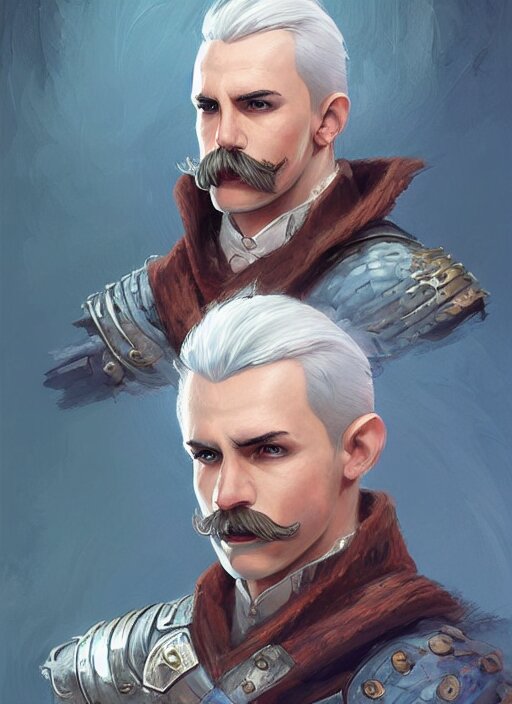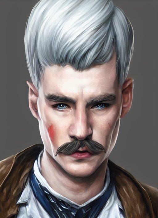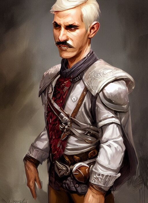 Young man with short white combover hair and moustache, dndbeyond, bright, colourful, realistic, dnd character portrait, full body, pathfinder, pinterest, art by ralph horsley, dnd, rpg, lotr game design fanart by concept art, behance hd, artstation, deviantart, hdr render in unreal engine 5