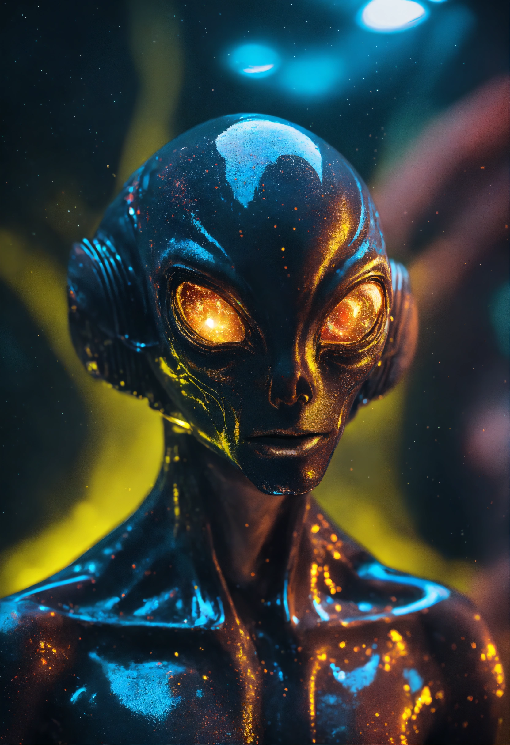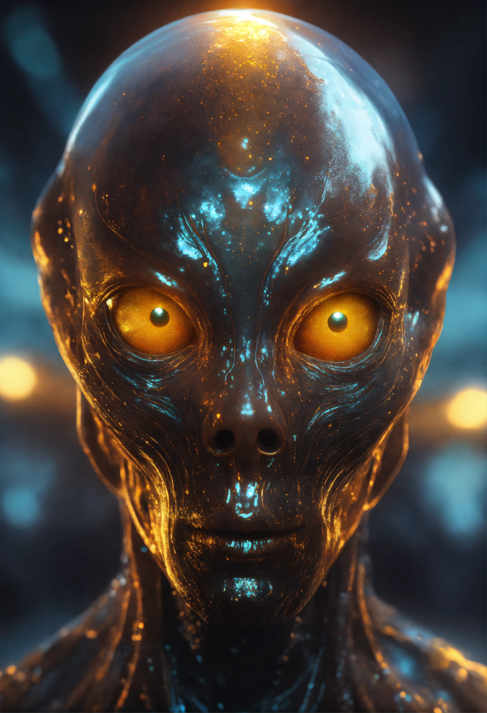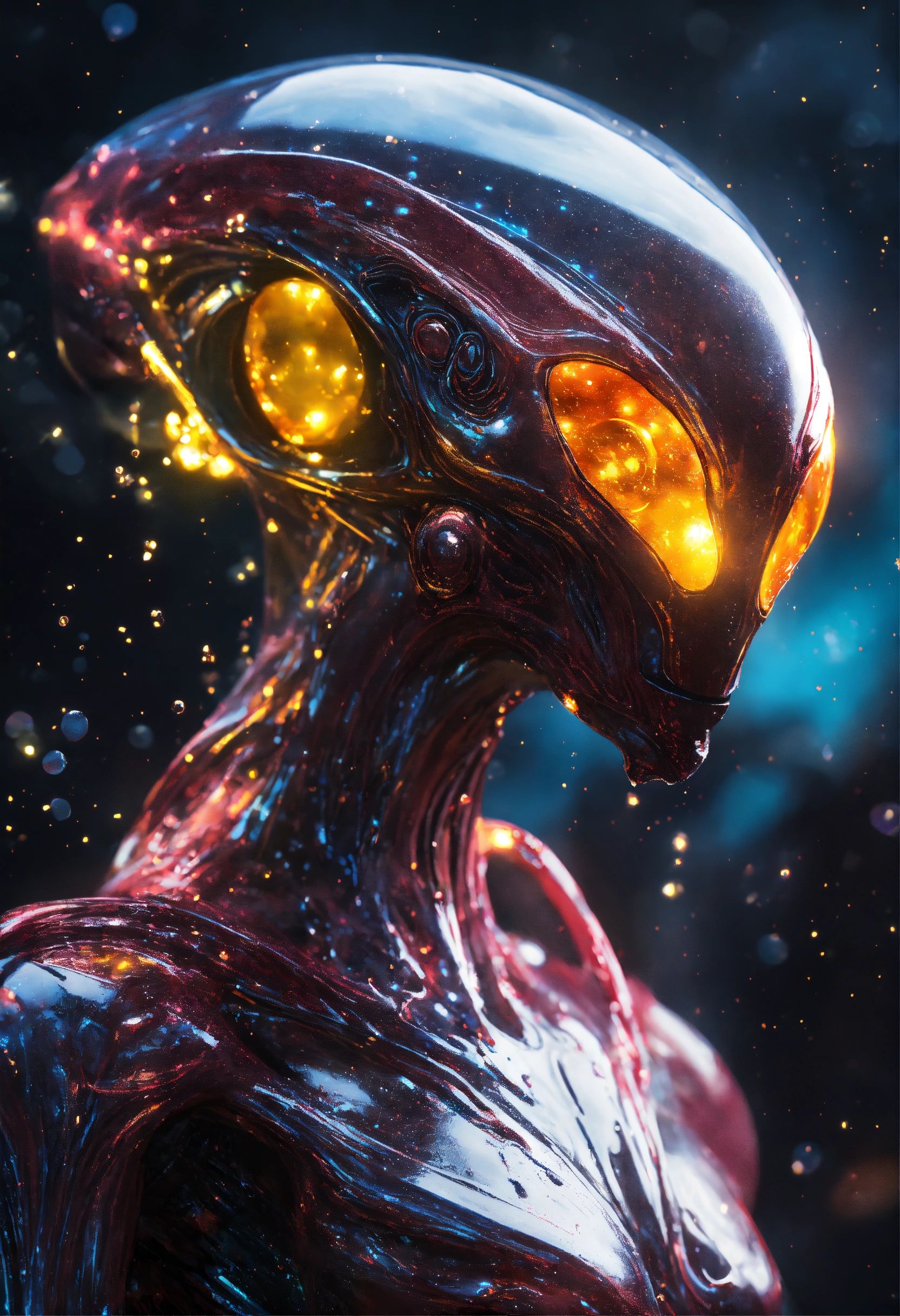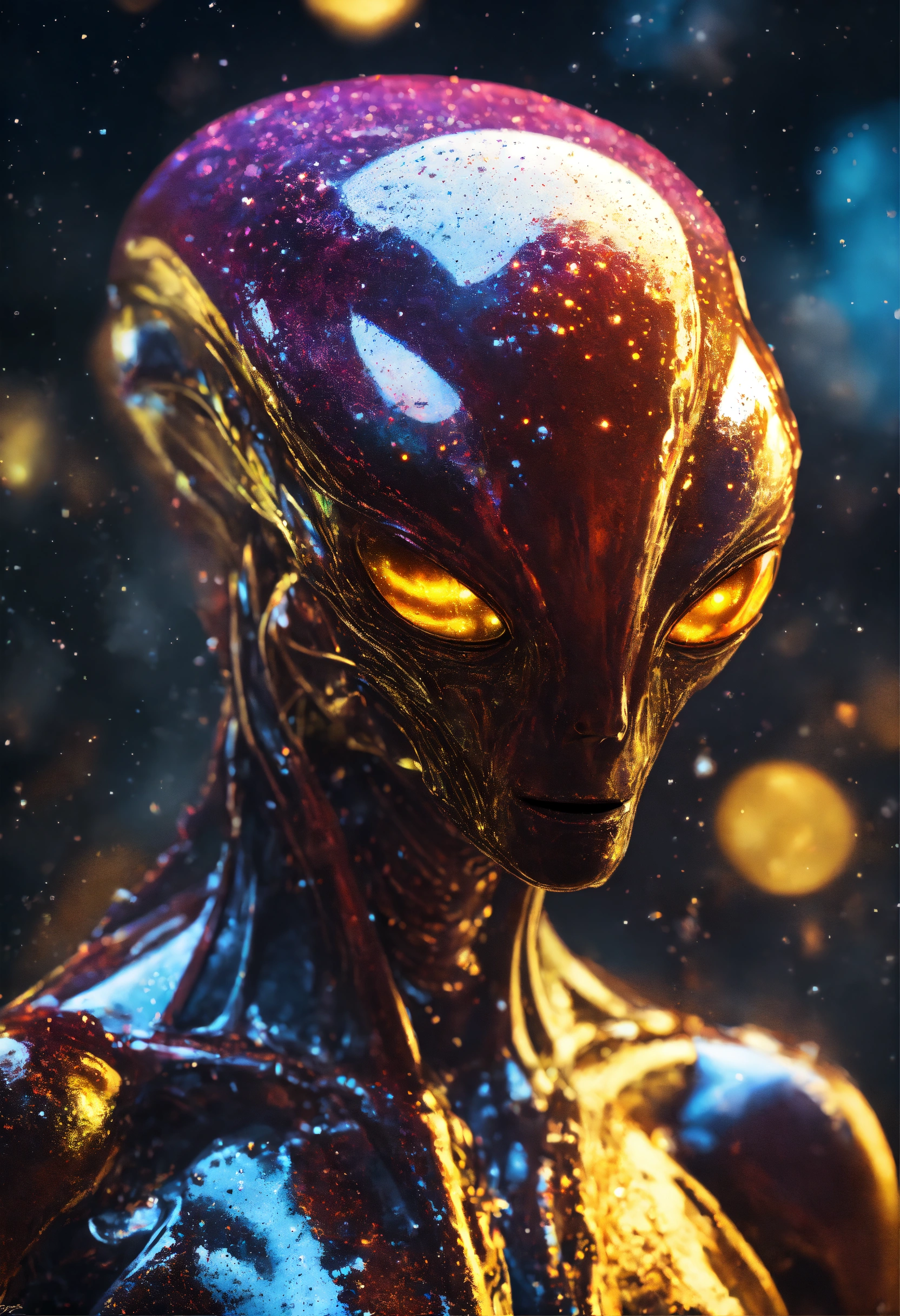 An sterotypical alien with glowing eyes in the style of translucent liquid metal, filled with swirling galaxies, ray tracing, raw character, 32k uhd, schlieren photography, conceptual portraiture, wet - on - wet blending