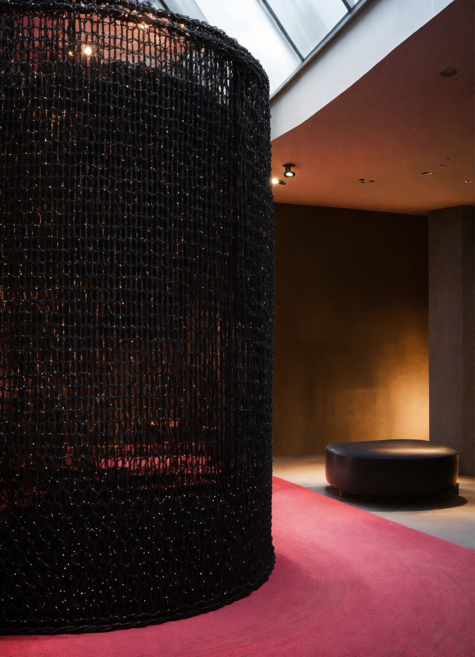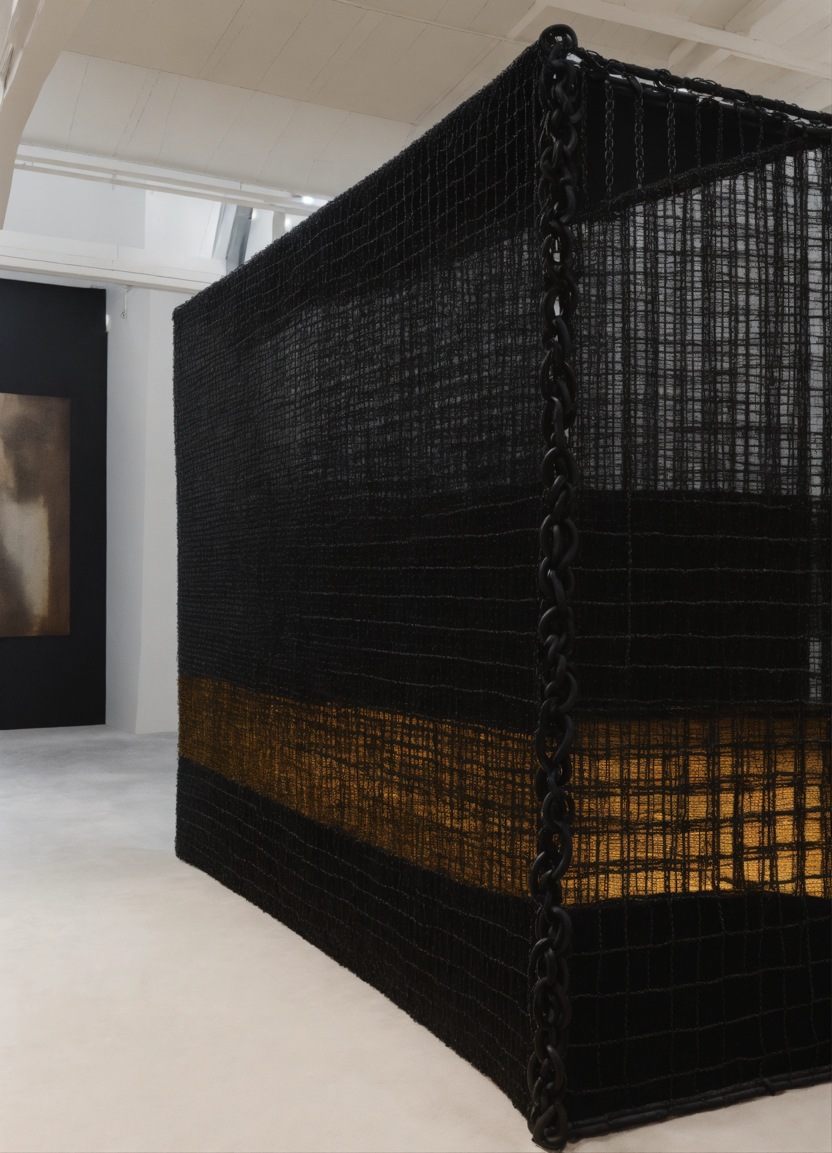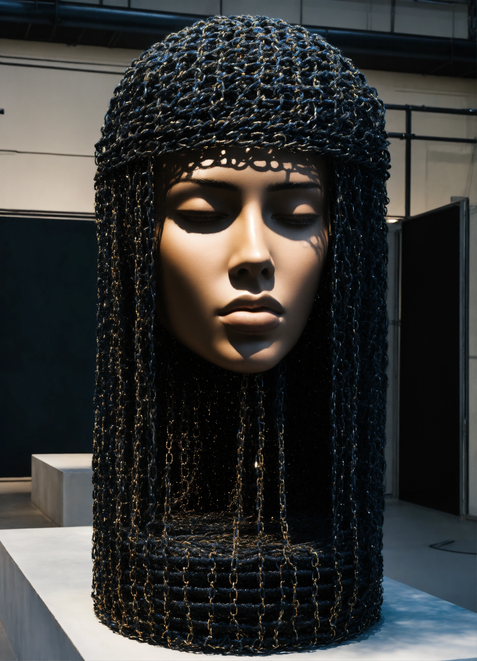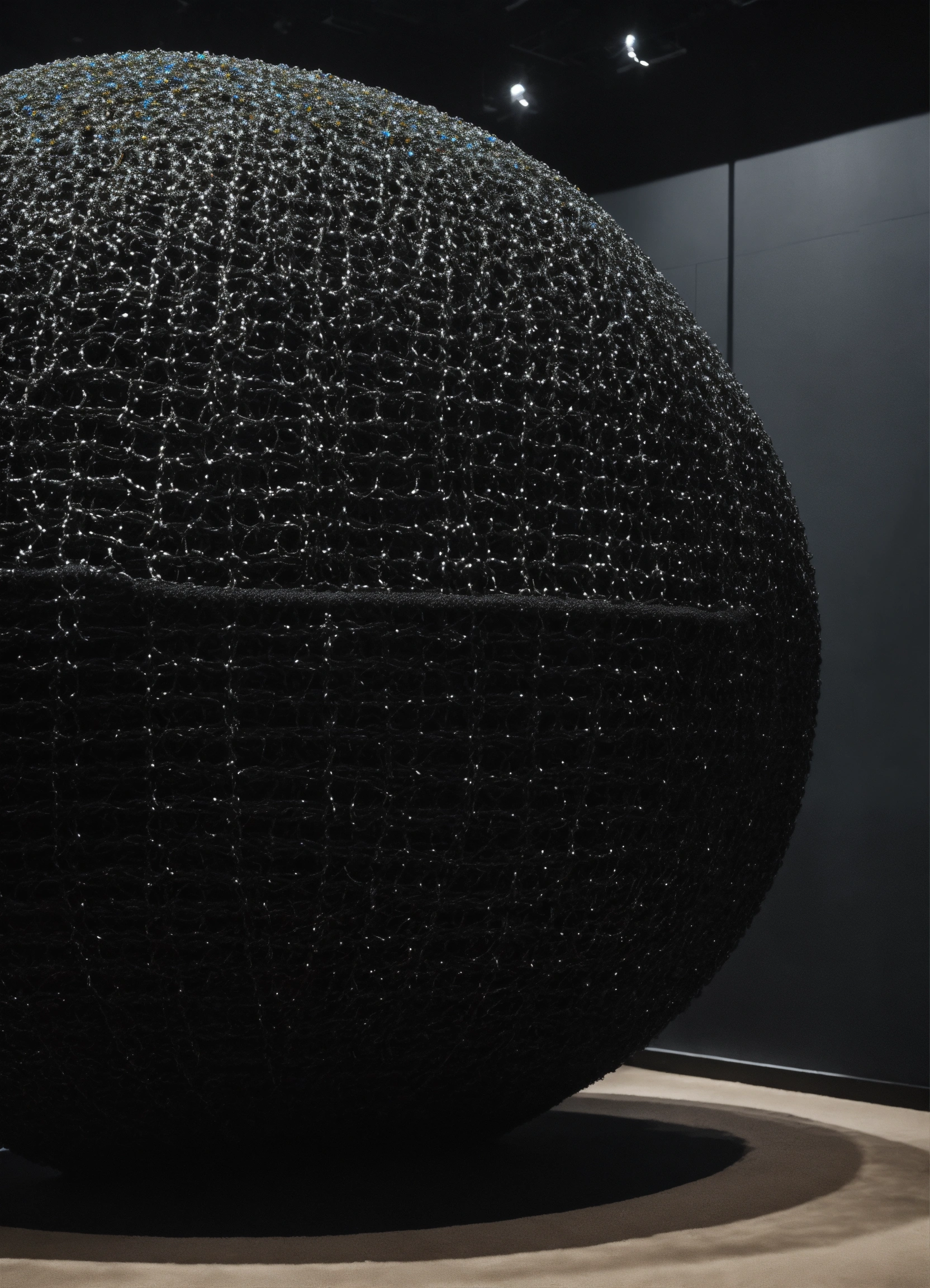 Black pressure stone sculpture indoor arena chains tweed haute couture weave tinted glass