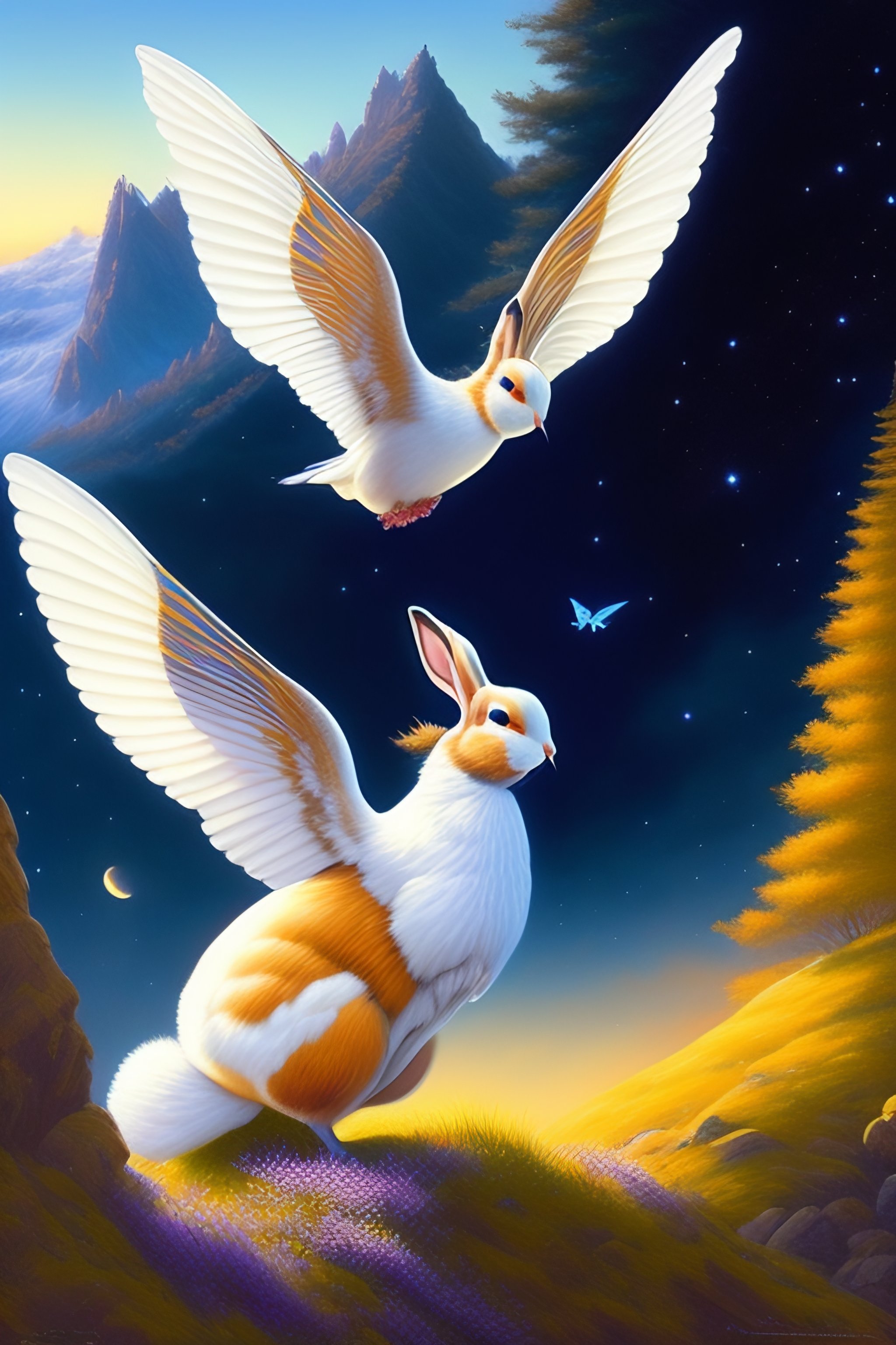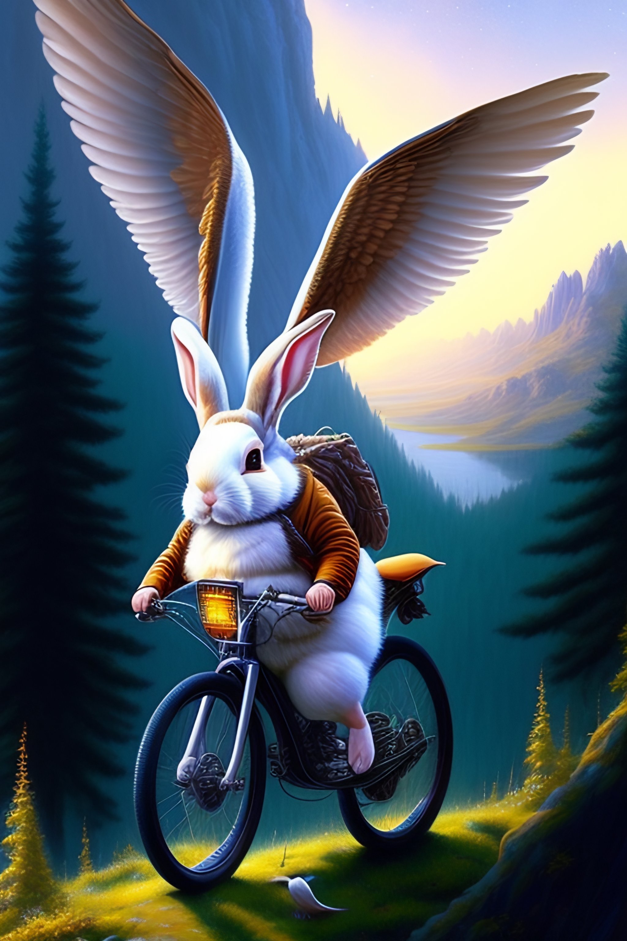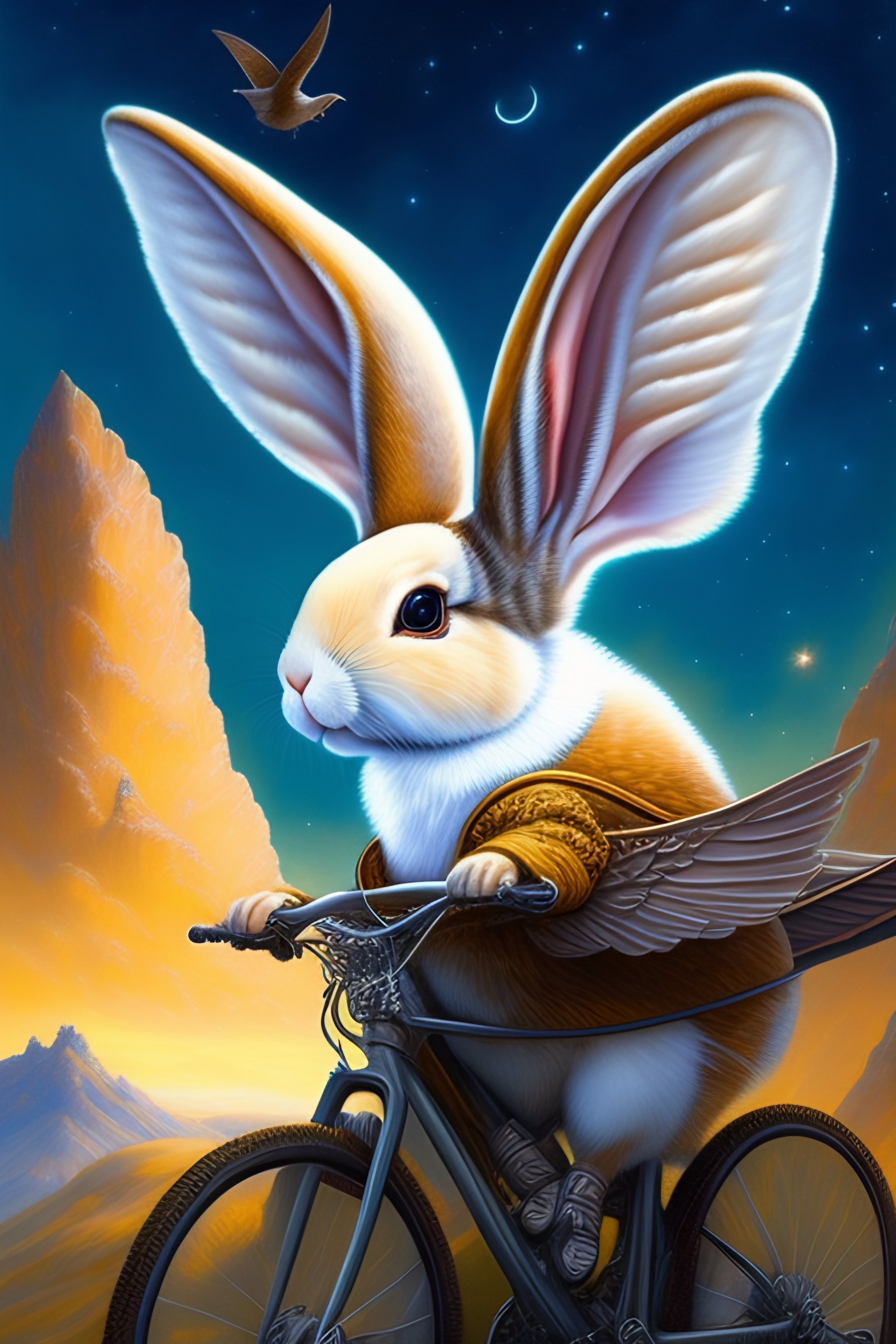 Https://lexica.art/prompt/c57faafd-37d8-4f63-9f86-51ae7f0c9c5ebrown https://www.birdspot.co.uk/wp-content/uploads/2022/06/white-dove.jpg https://www.innovationnewsnetwork.com/wp-content/uploads/2021/02/primordial-galaxy-696x392.jpg https://s3.envato.com/files/235567742/s228-imgl2717-bicycle-mountains-italy-h4250.jpg flying dwarf bunny rabbit with wings white nose riding a mountain bike as a fantasy art by donato giancola and james gurney, digital art, trending on artstation, trees in foreground, galaxy sky