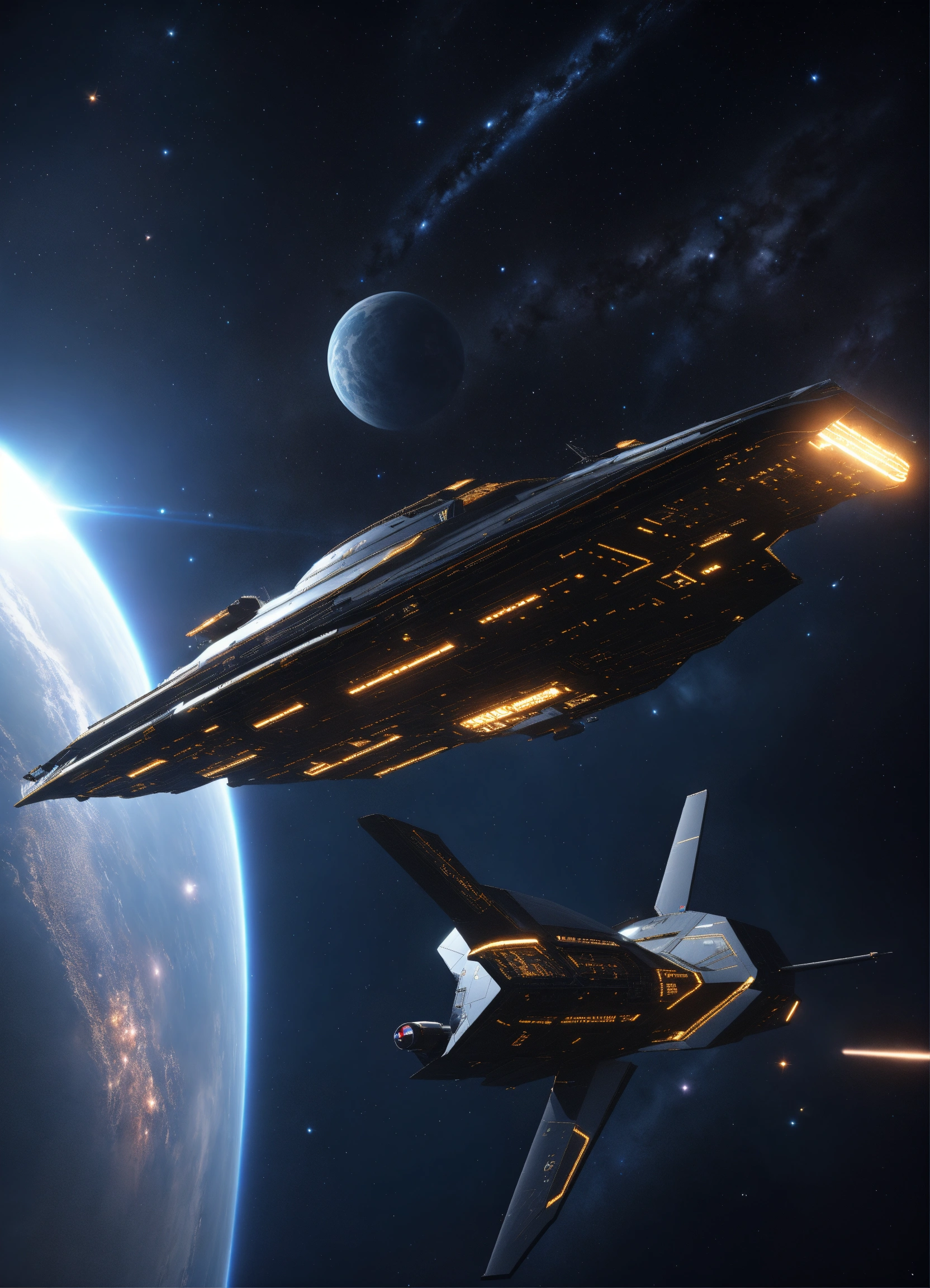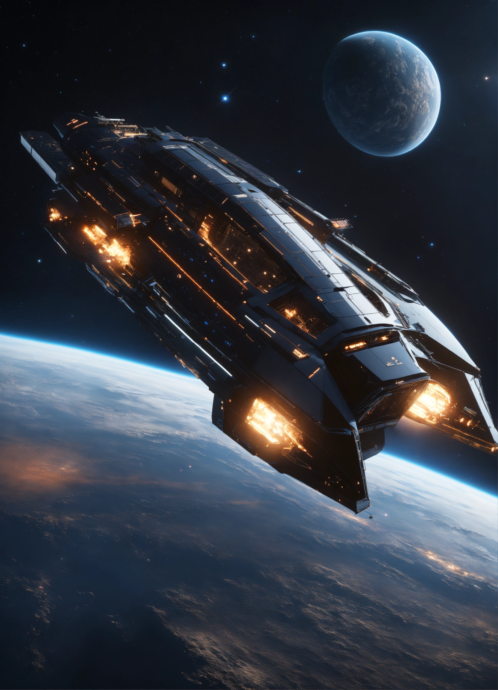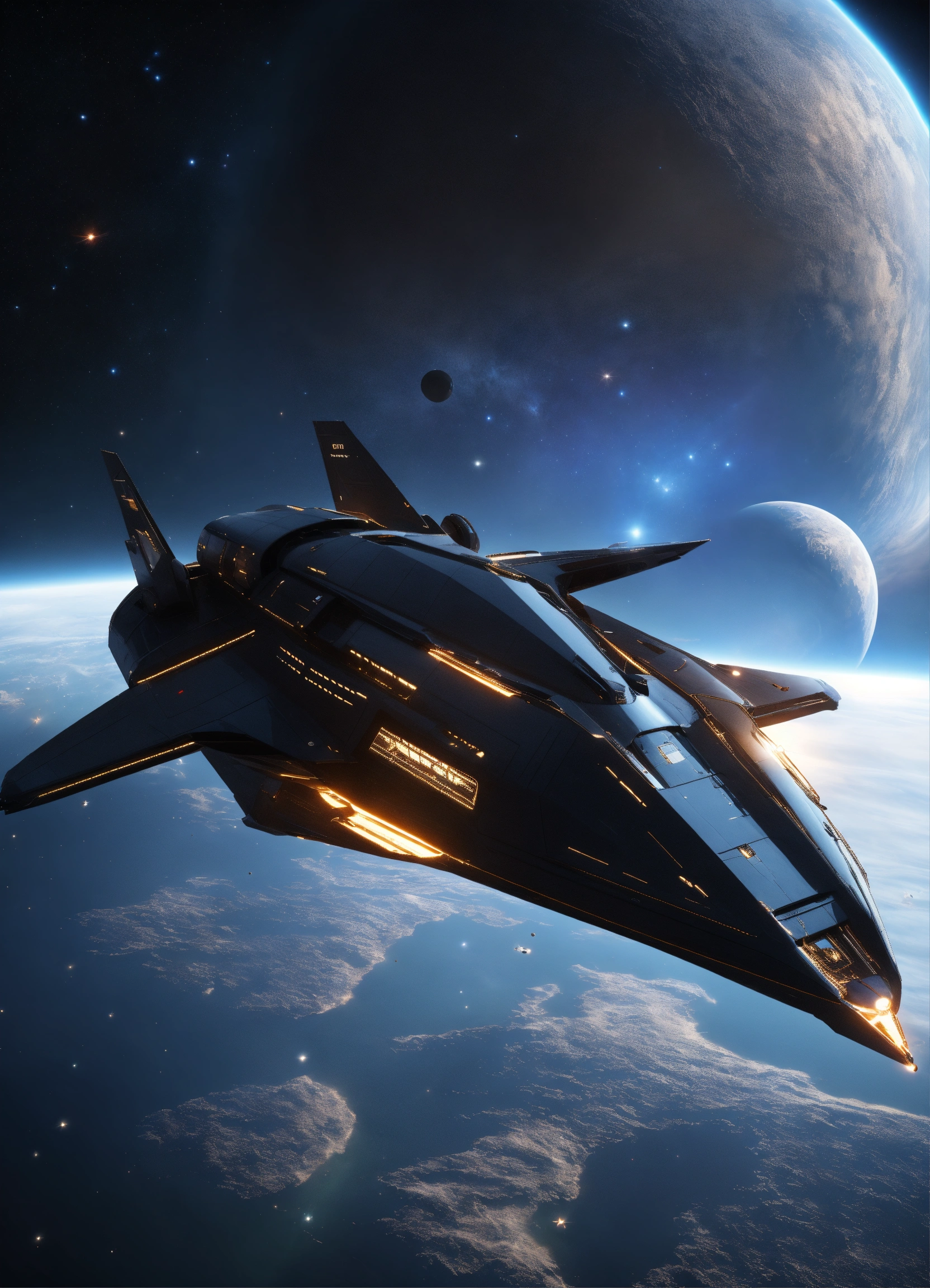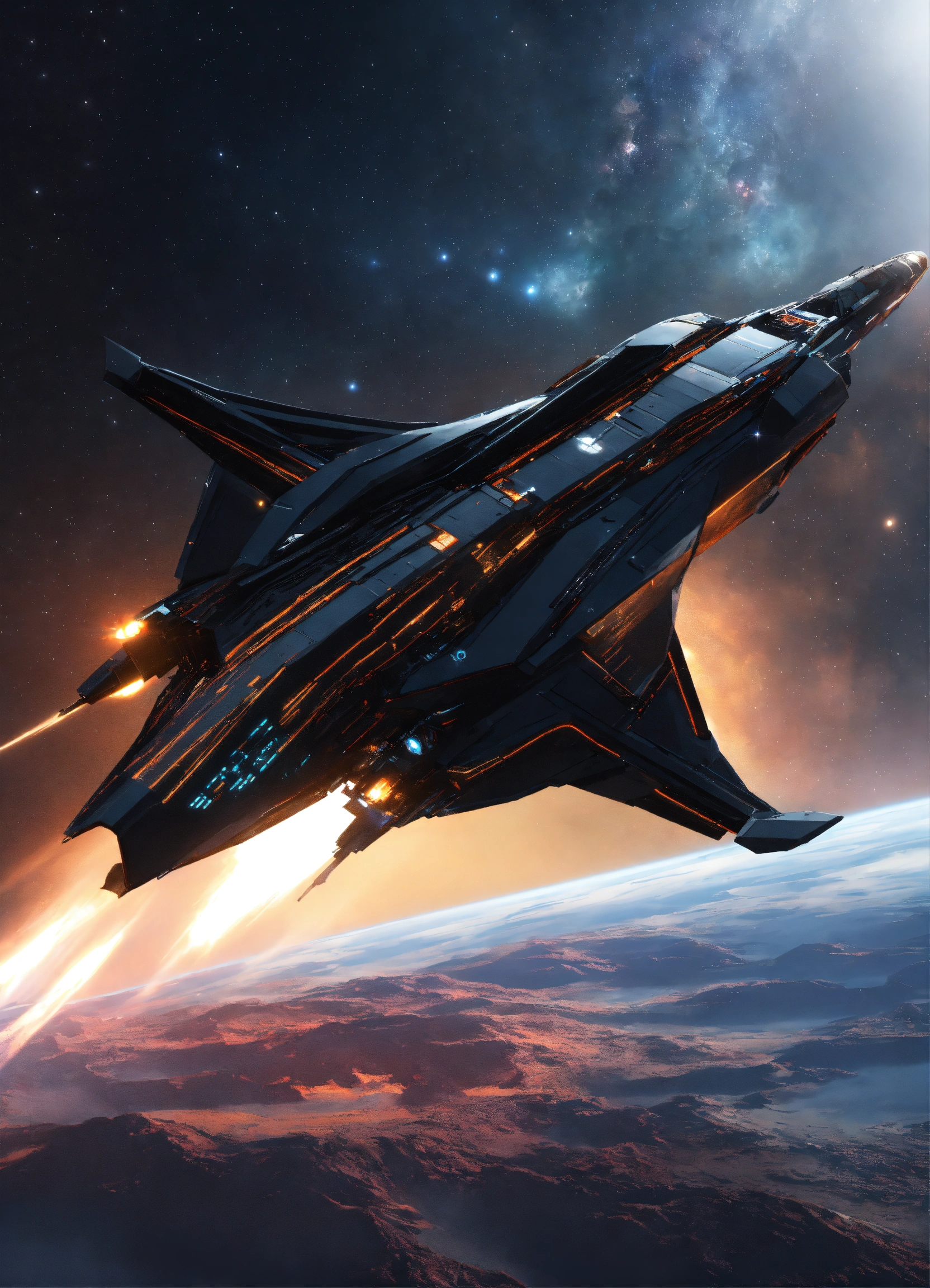 Luxurious sleek black space yacht shooting out in deep space, future hi tech exterior, sci fi, unreal engine, realistic.