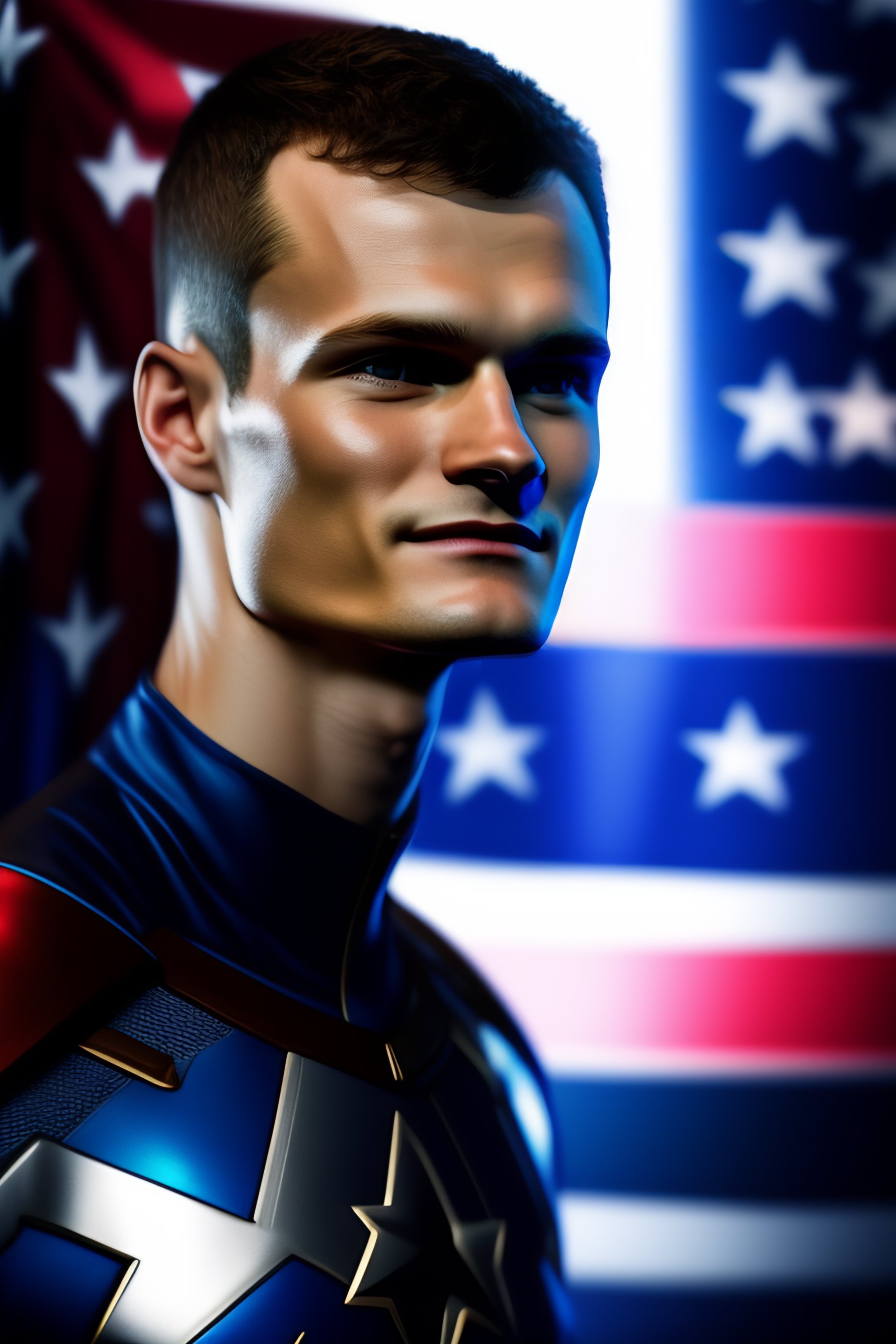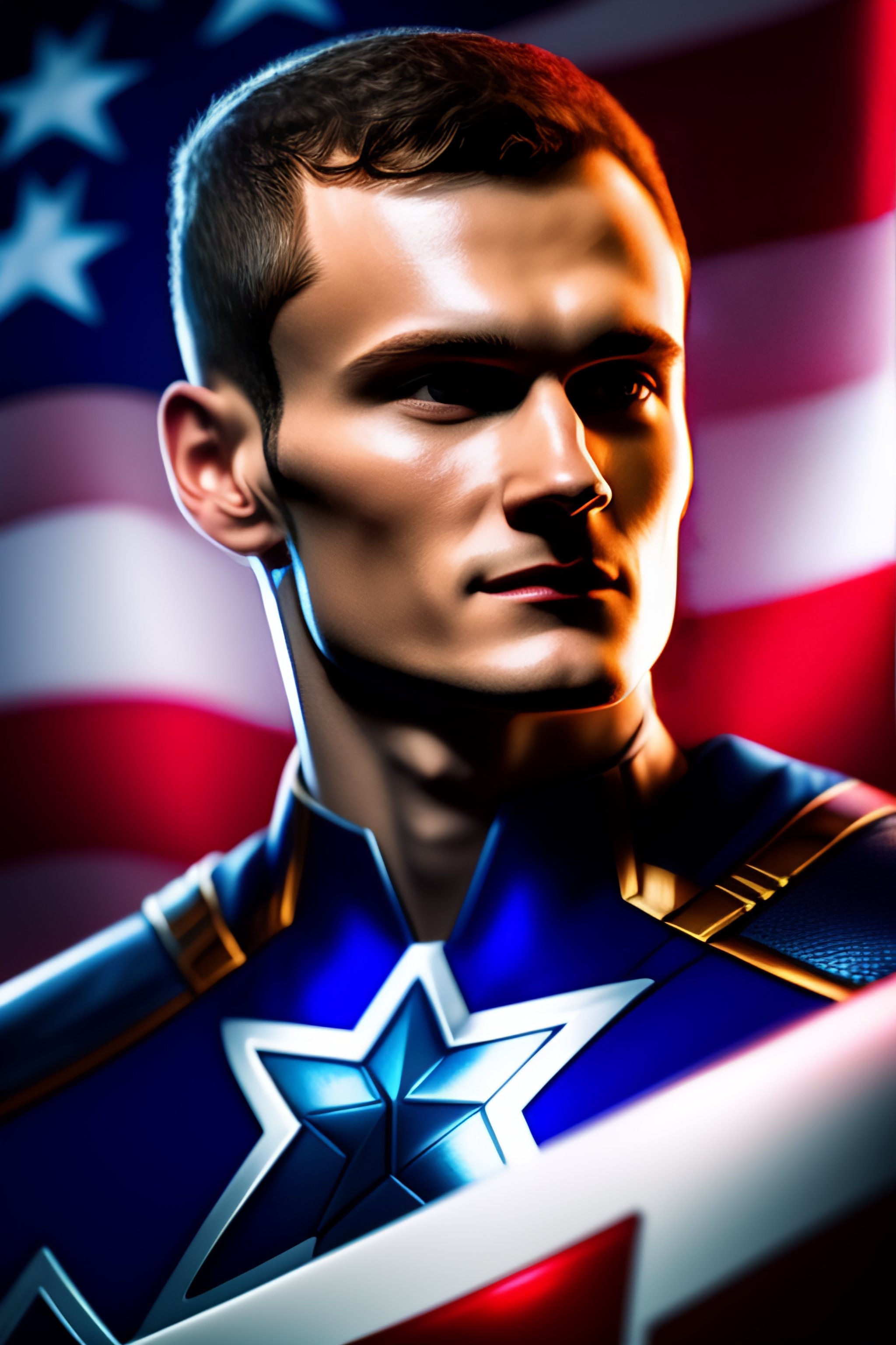 Vitalik buterin as captain america blender 4k nikon 35mm hyper realistic cell shaded volumetric lighting