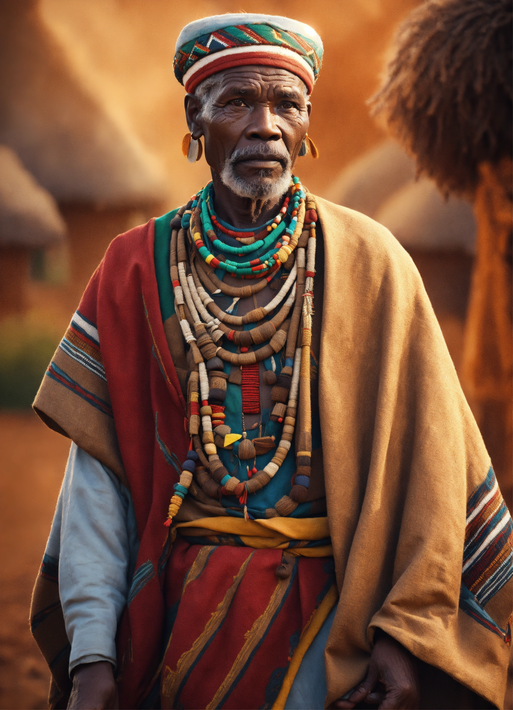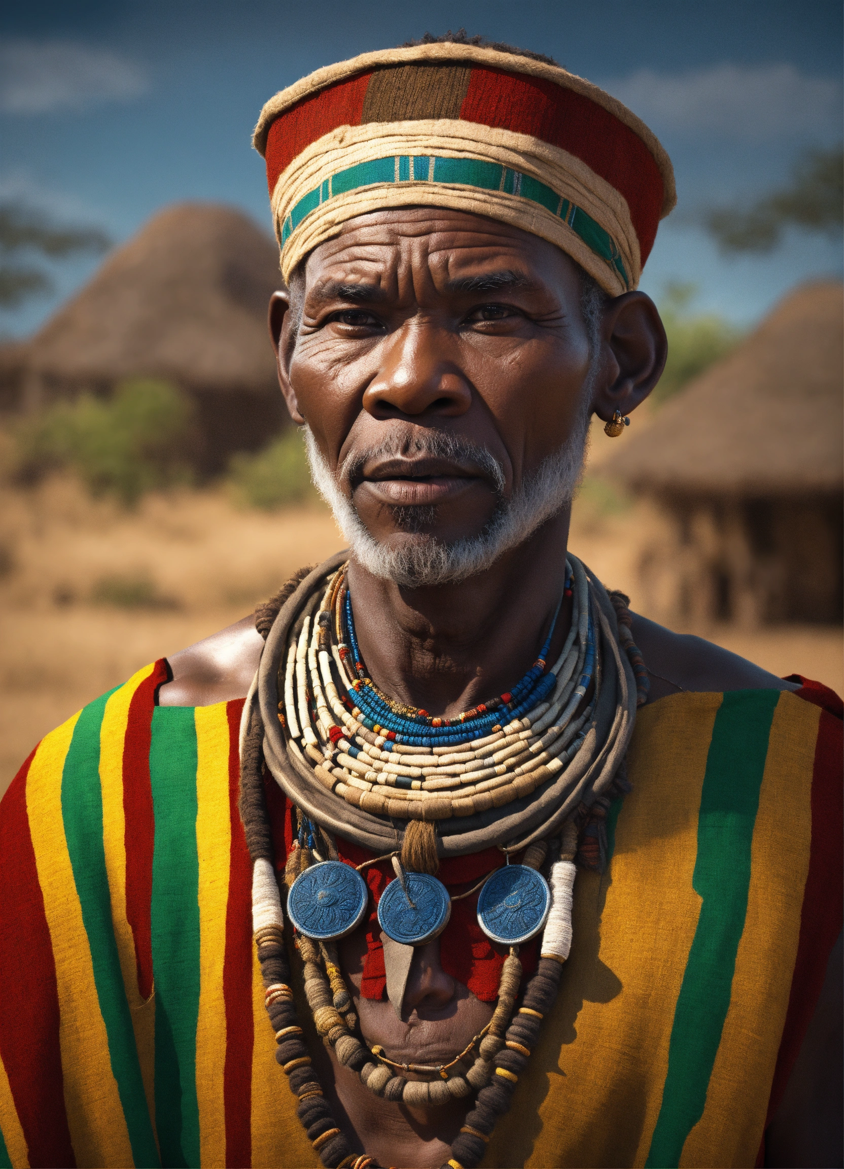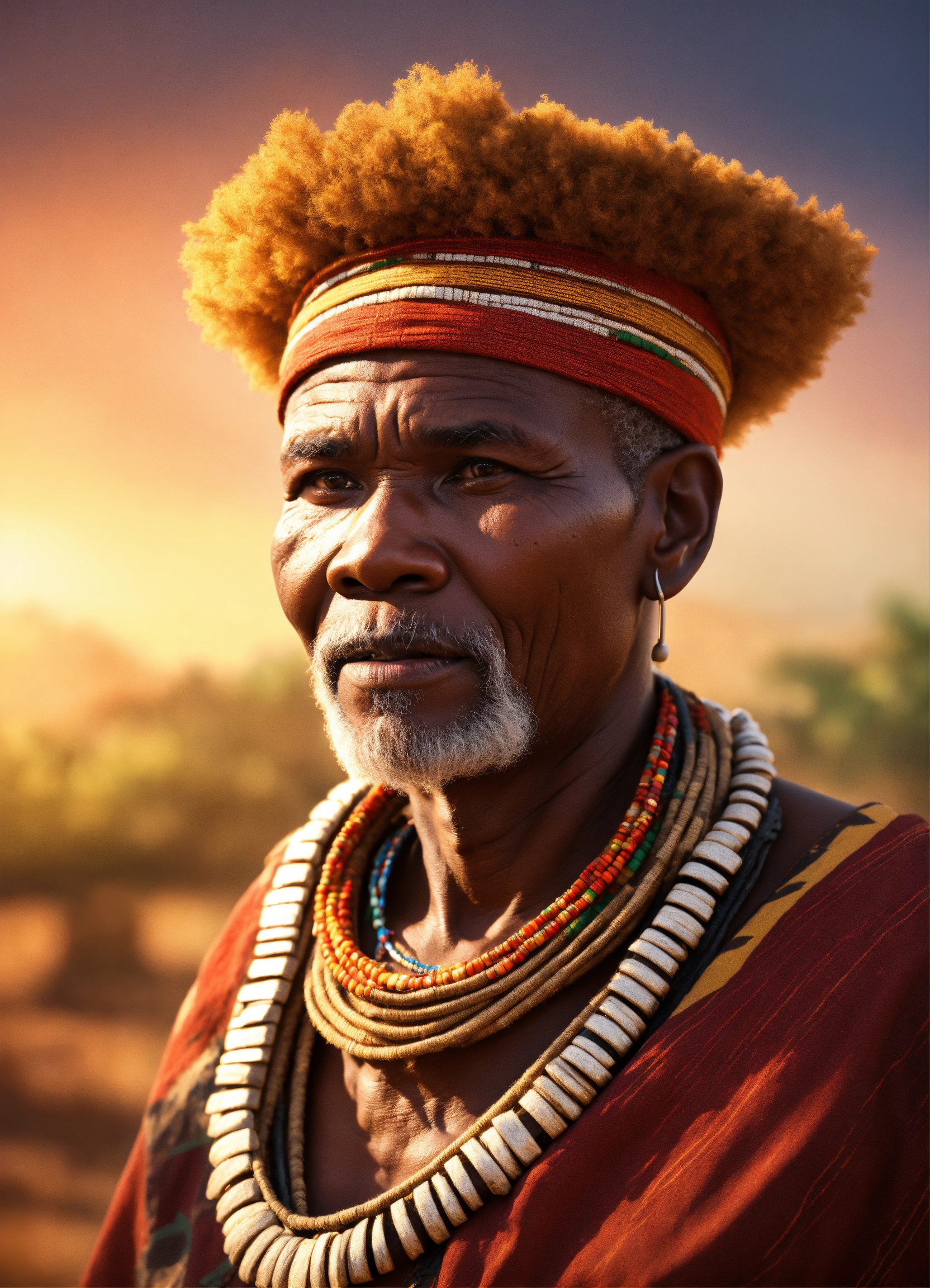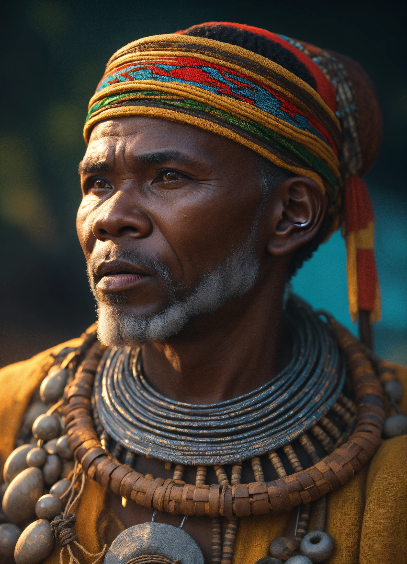 Primitive african old village man, strong cheek bones, wearing traditional zulu african traditional clothing, highly detailed, 3d art, professional colors, soft lighting, high detail, artstation, concept art, behance, ray tracing