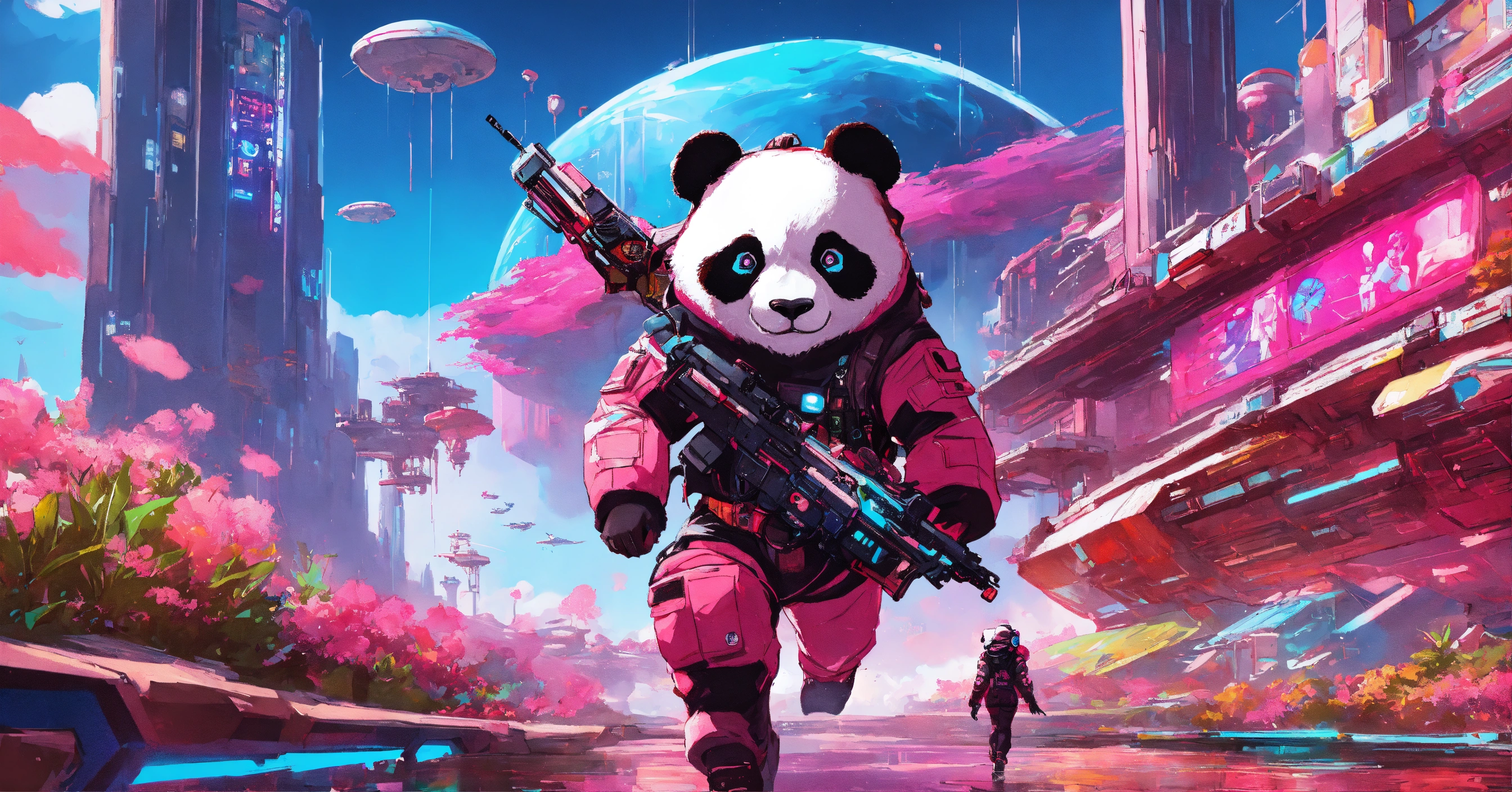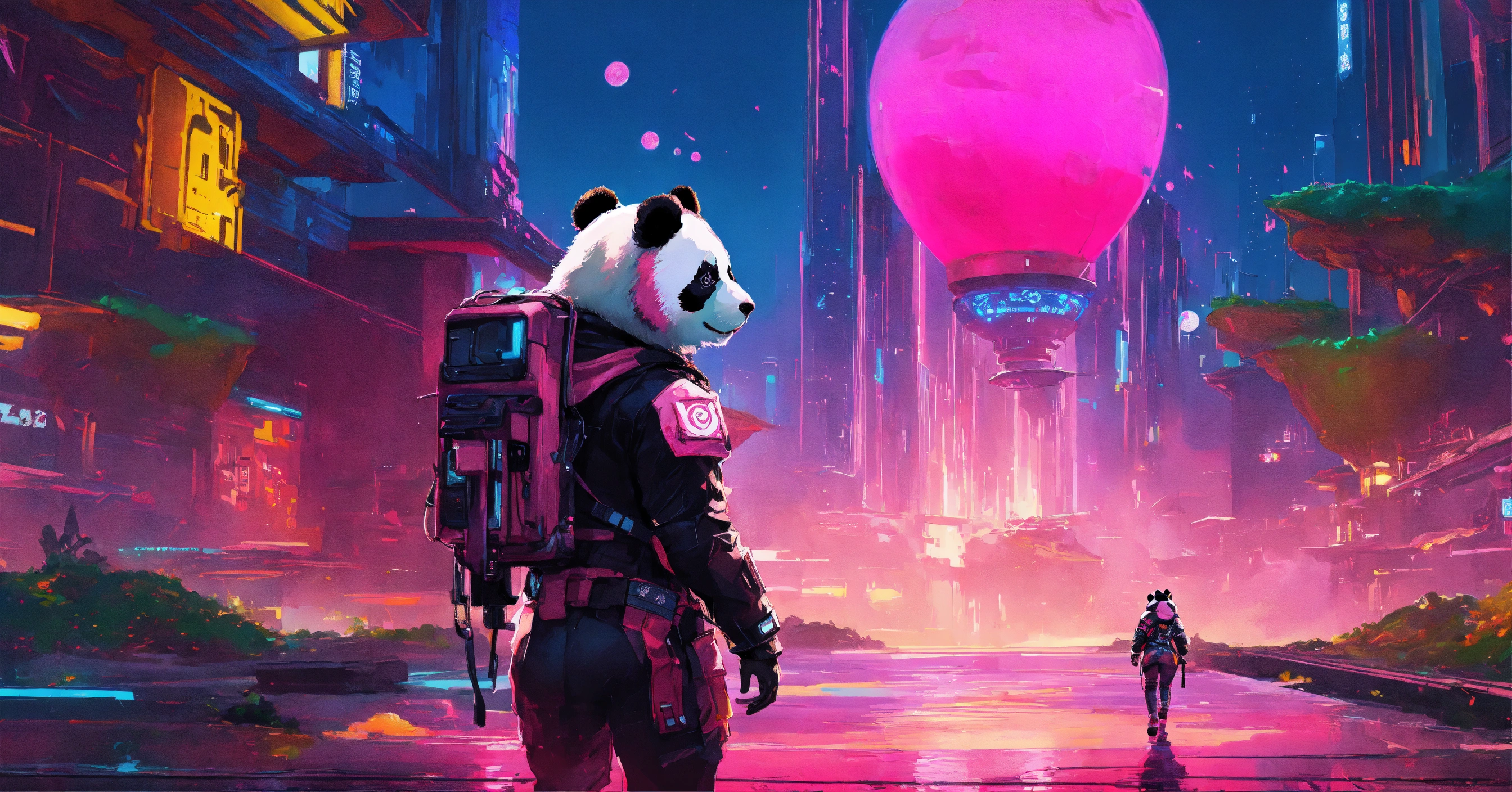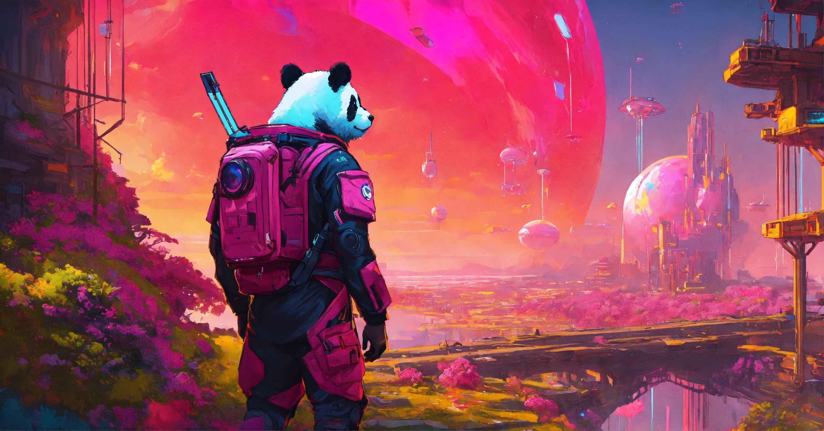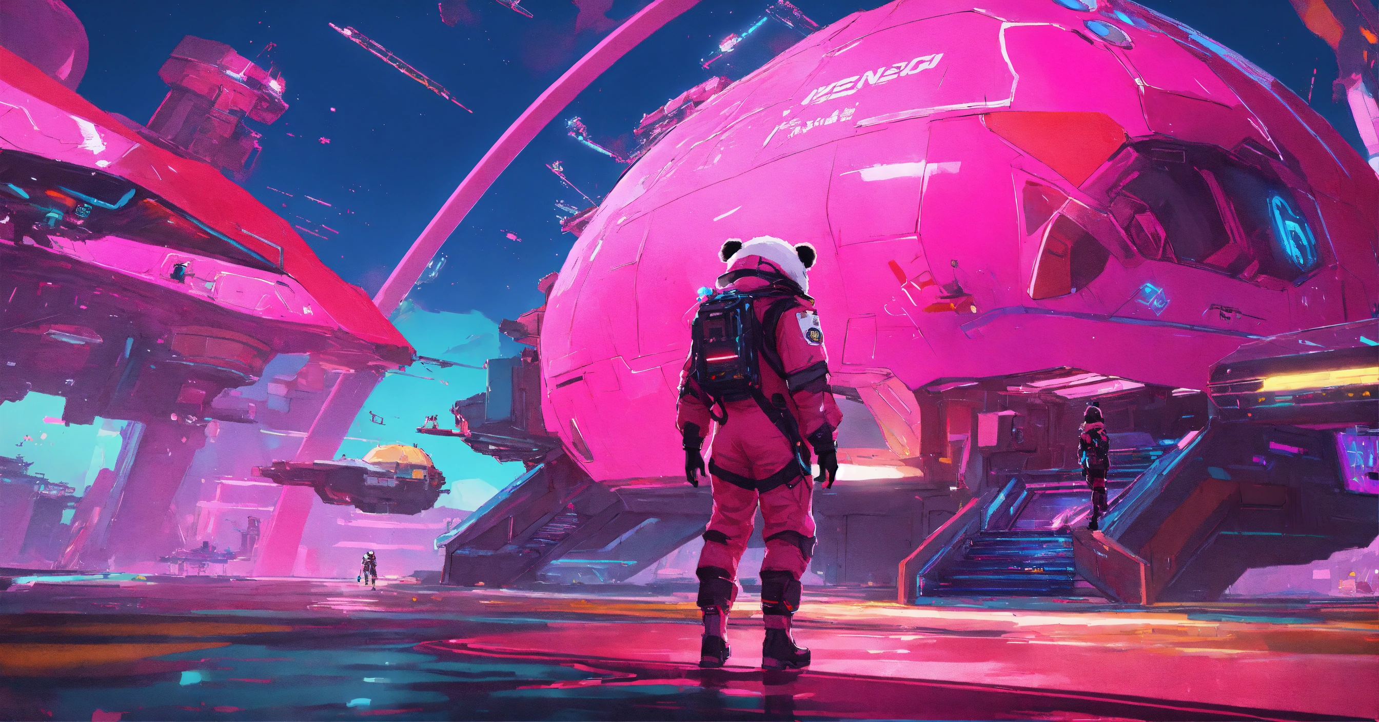 Pink panda in cyberpunk style 2077s, in spacesuit, exiting a spaceship, floating islands in the background, character concept design, painting, detailed, vivid, trending on artstation, genshin impact, trending pixiv fanbox, acrylic palette knife, 4k, vibrant colors, devinart, trending on artstation
