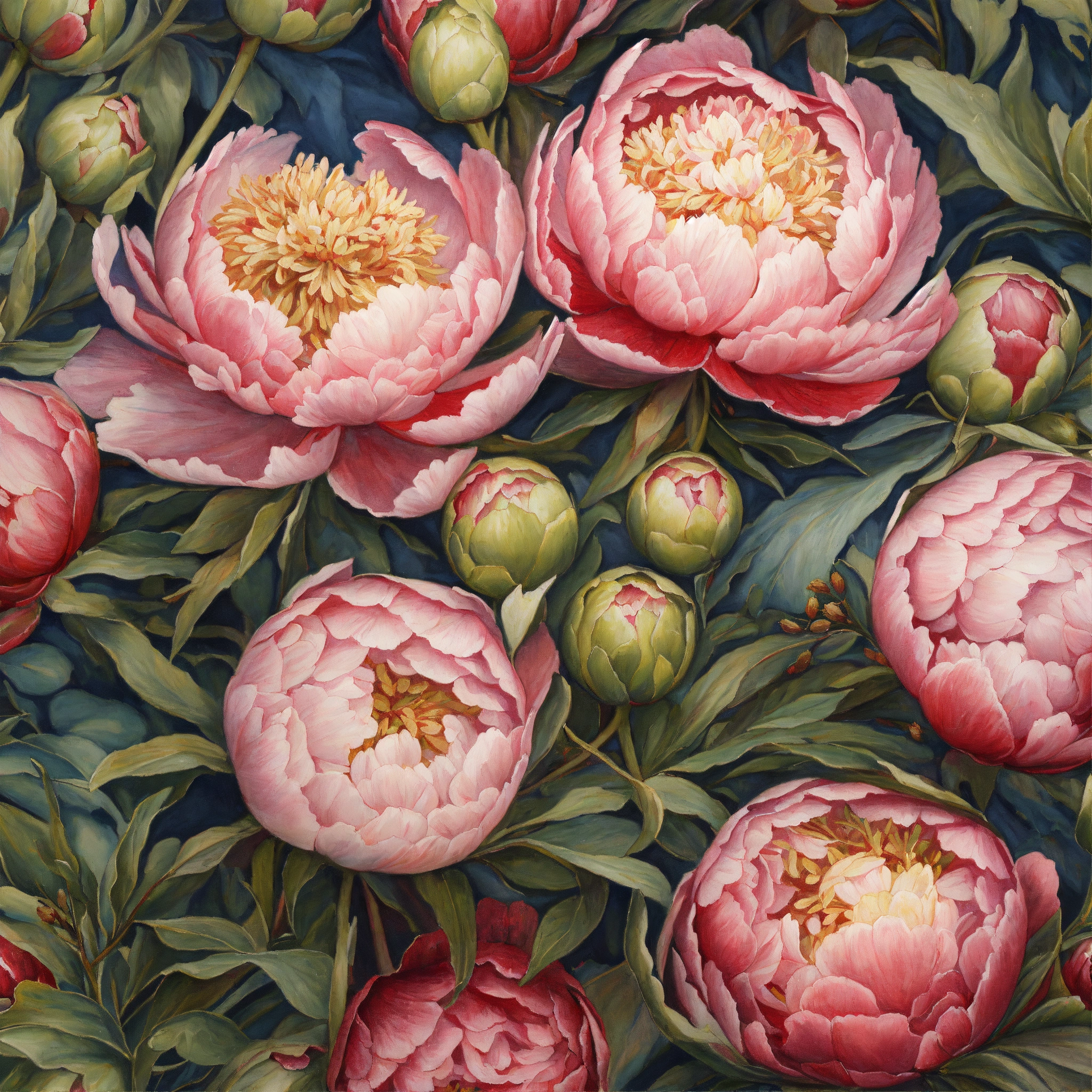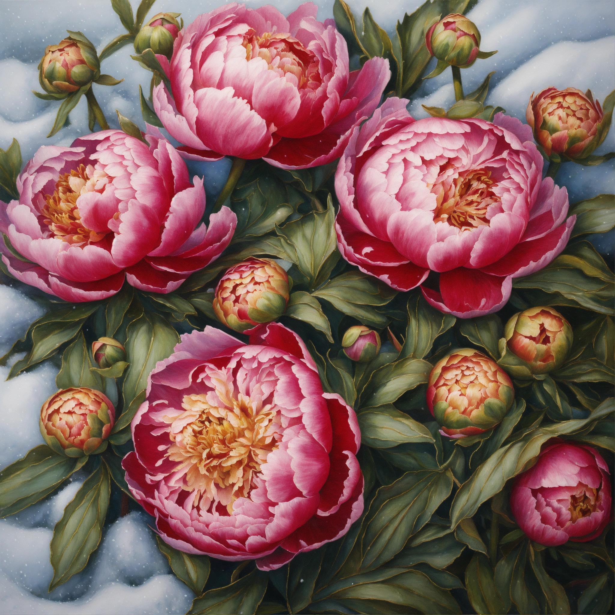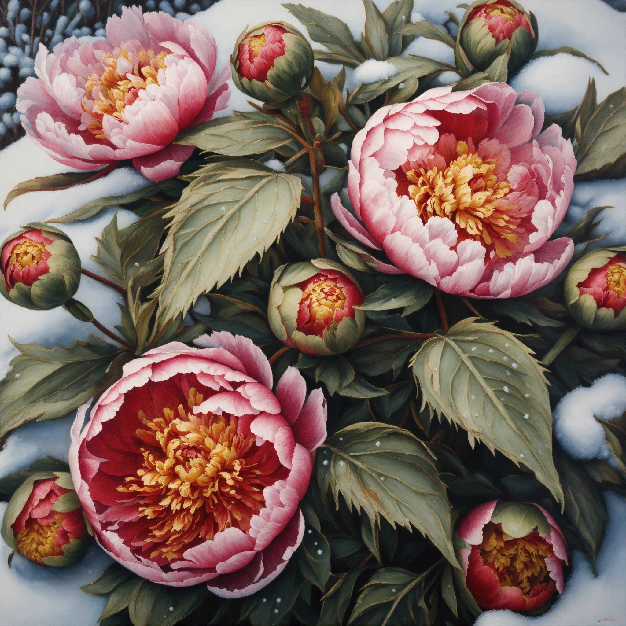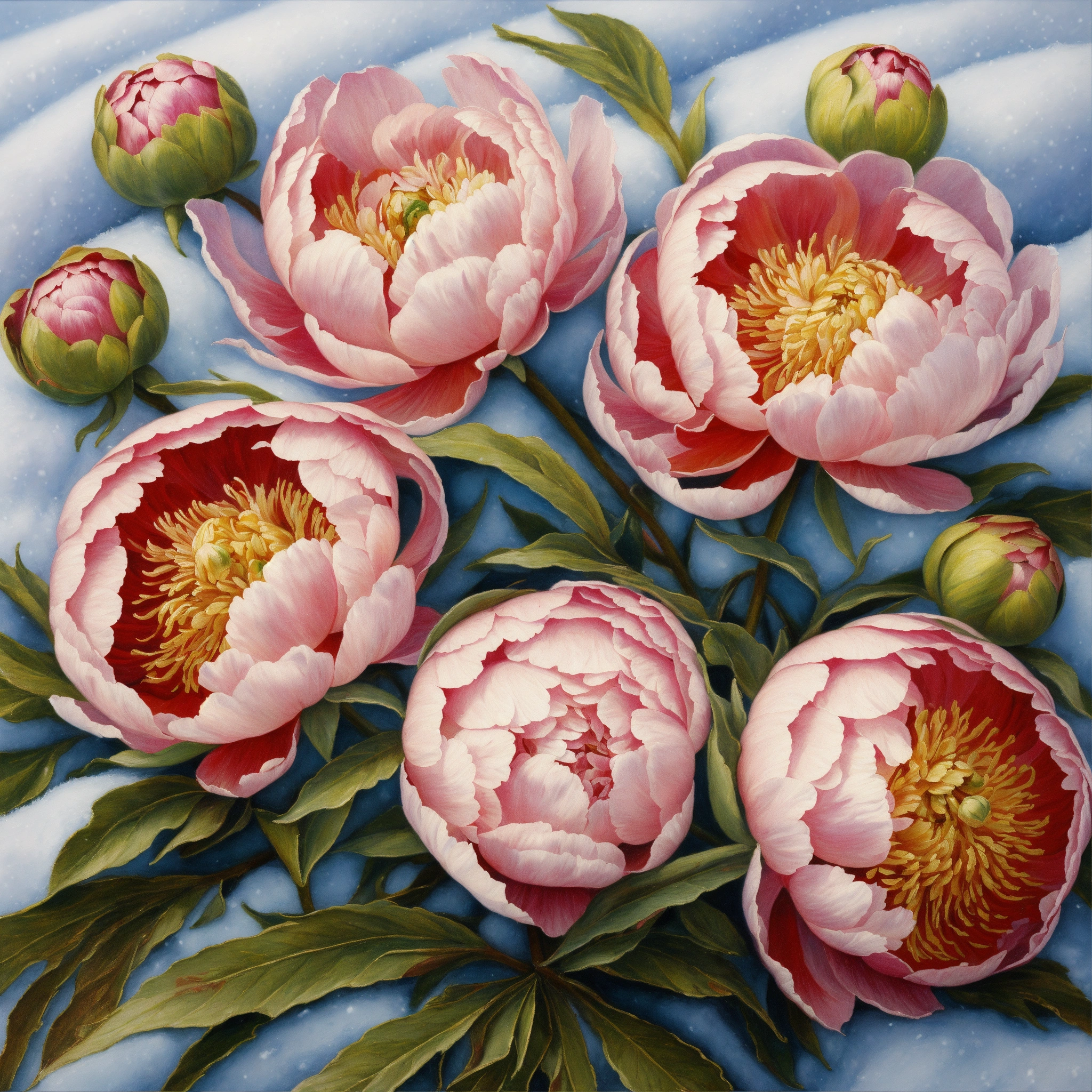 Bohemian hyper-detailed painting of several pearl peony buds lying in the snow