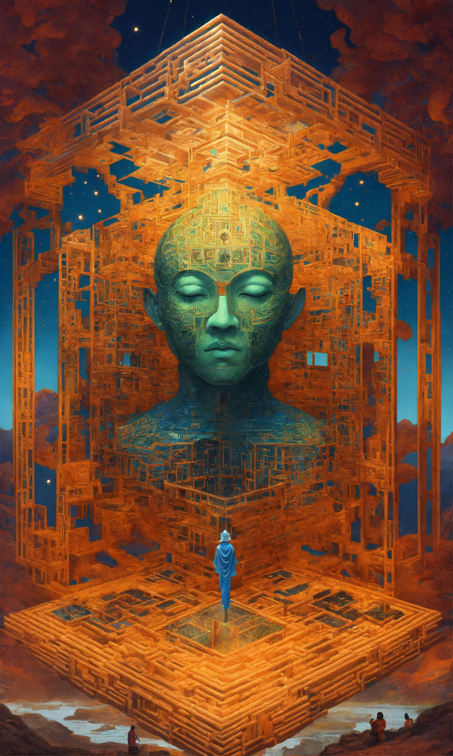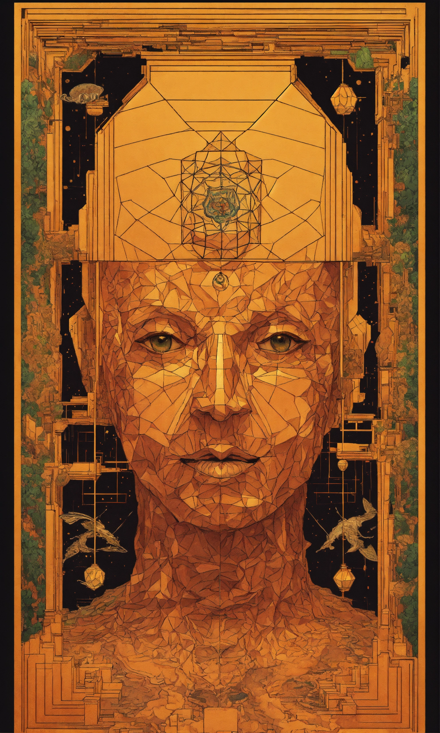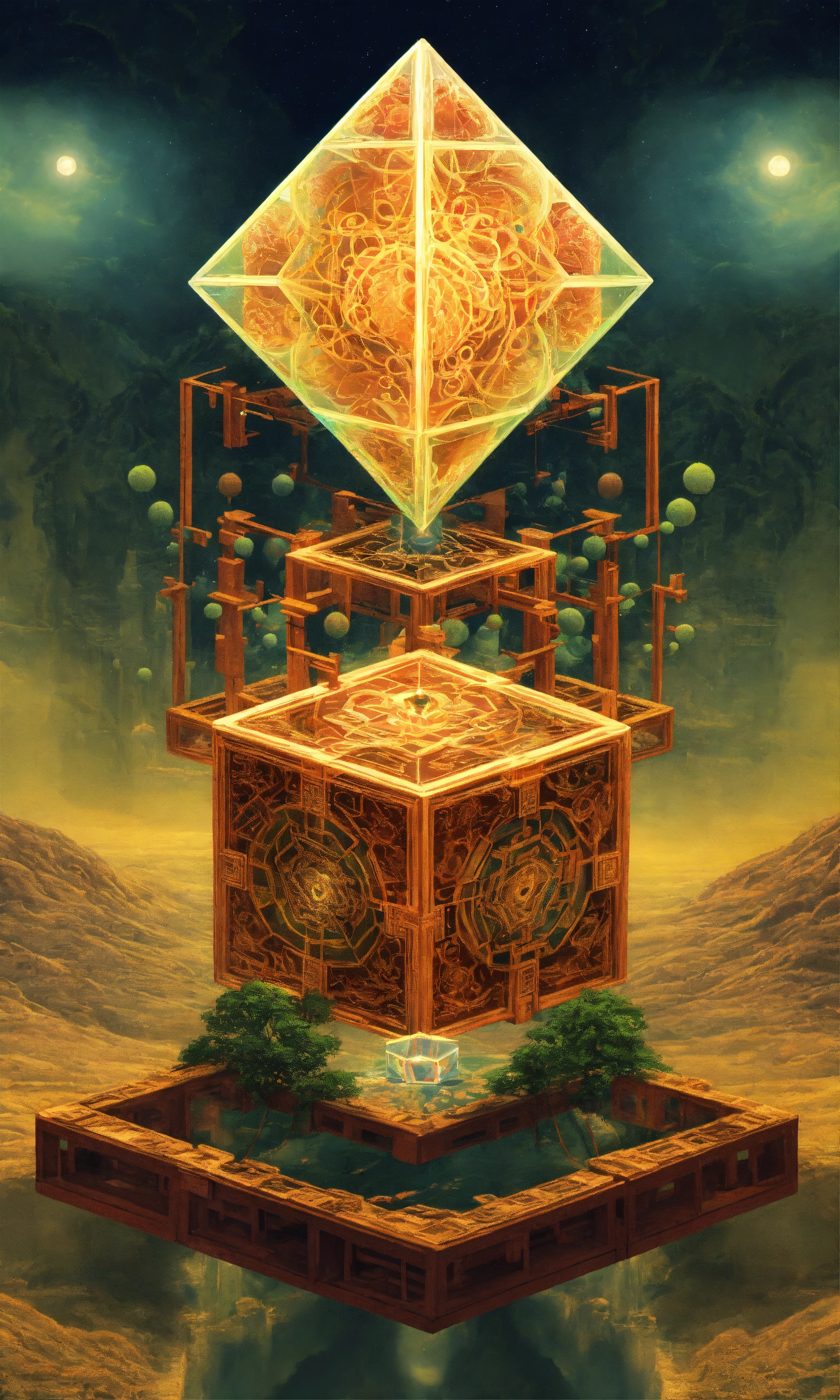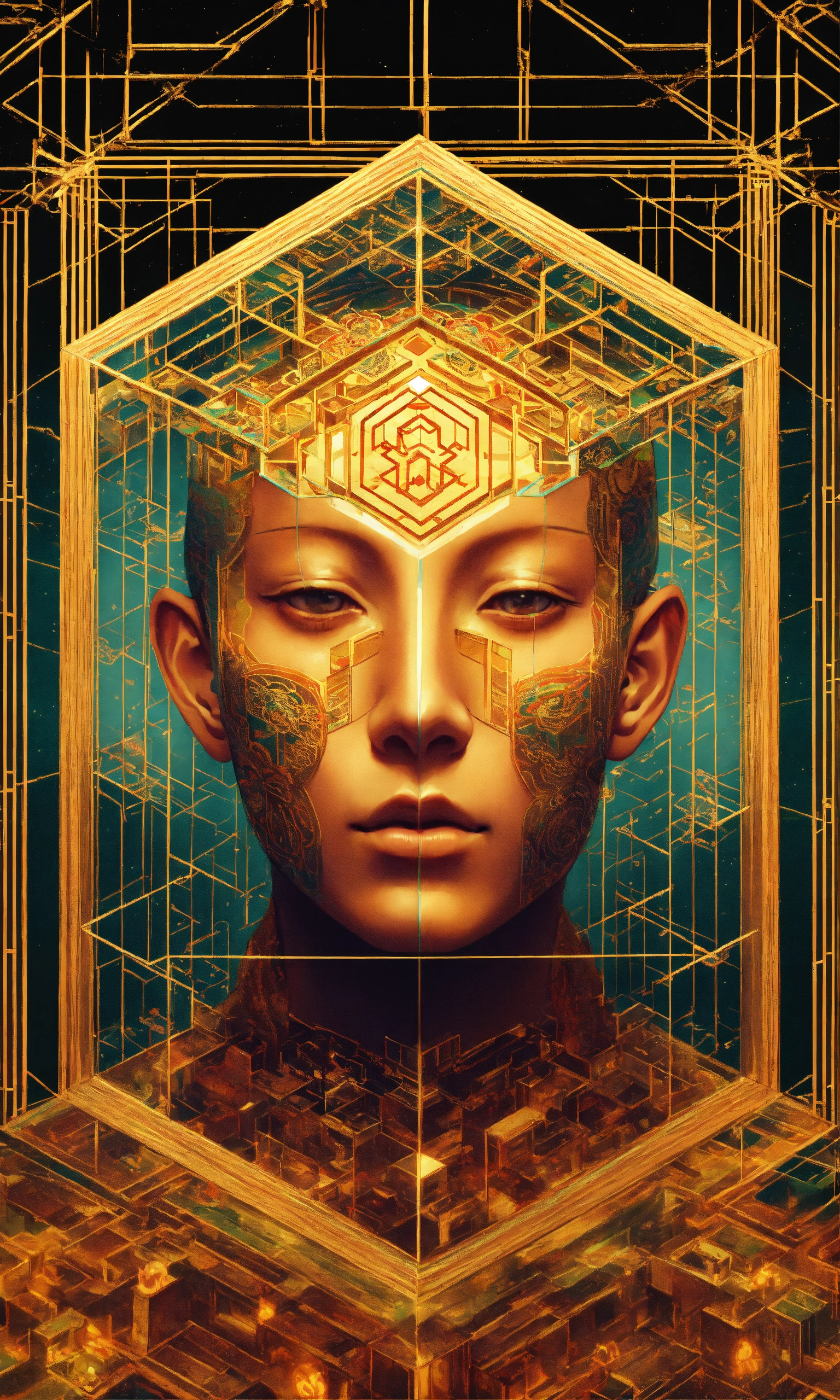 Taoist monk tesseract body fractal three point perspective hypercube mirror zen face brain mayan mantis jellyfish face