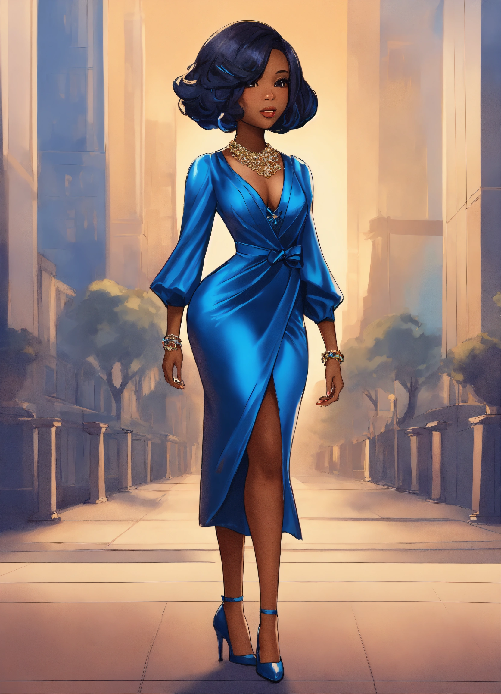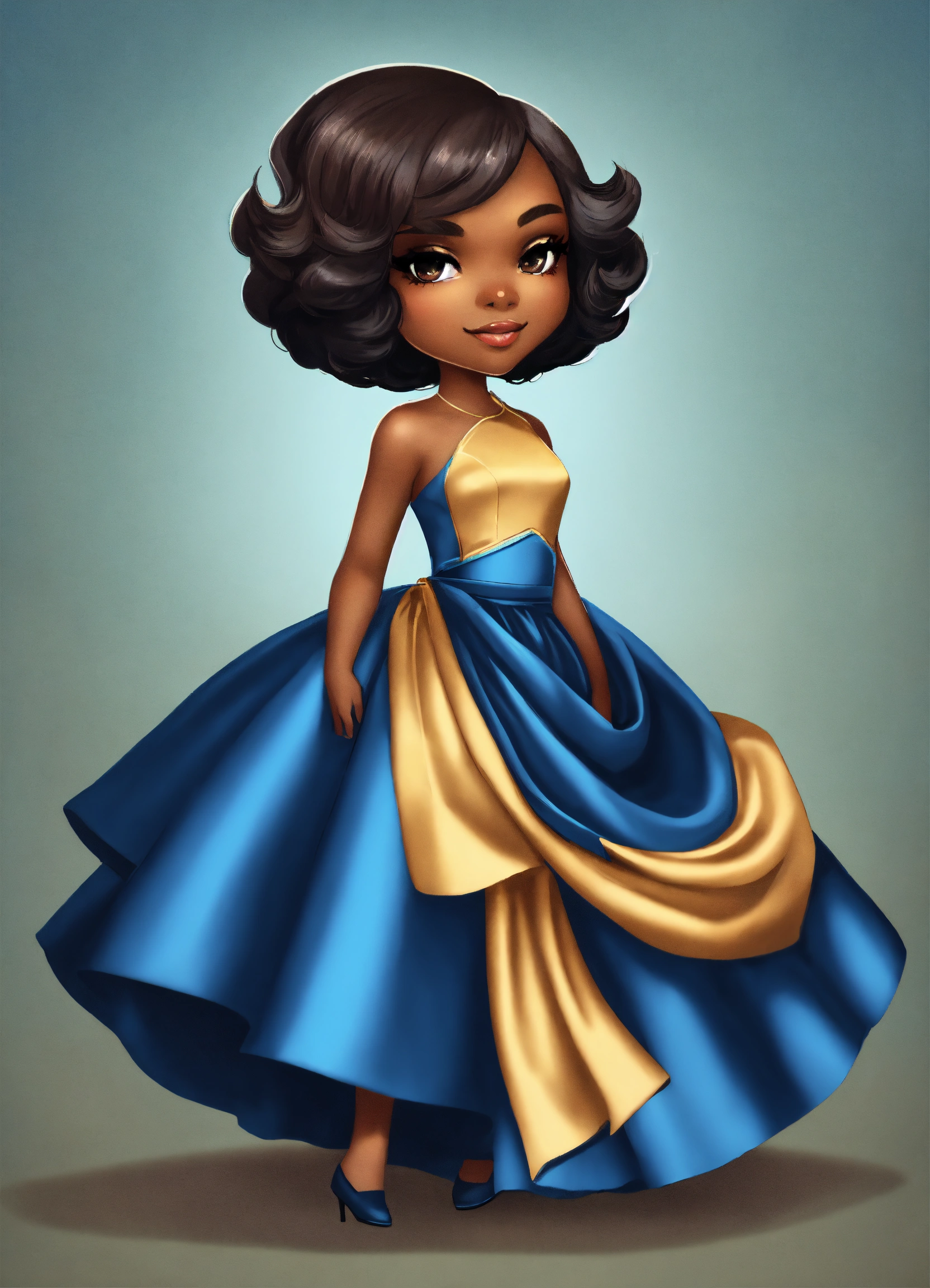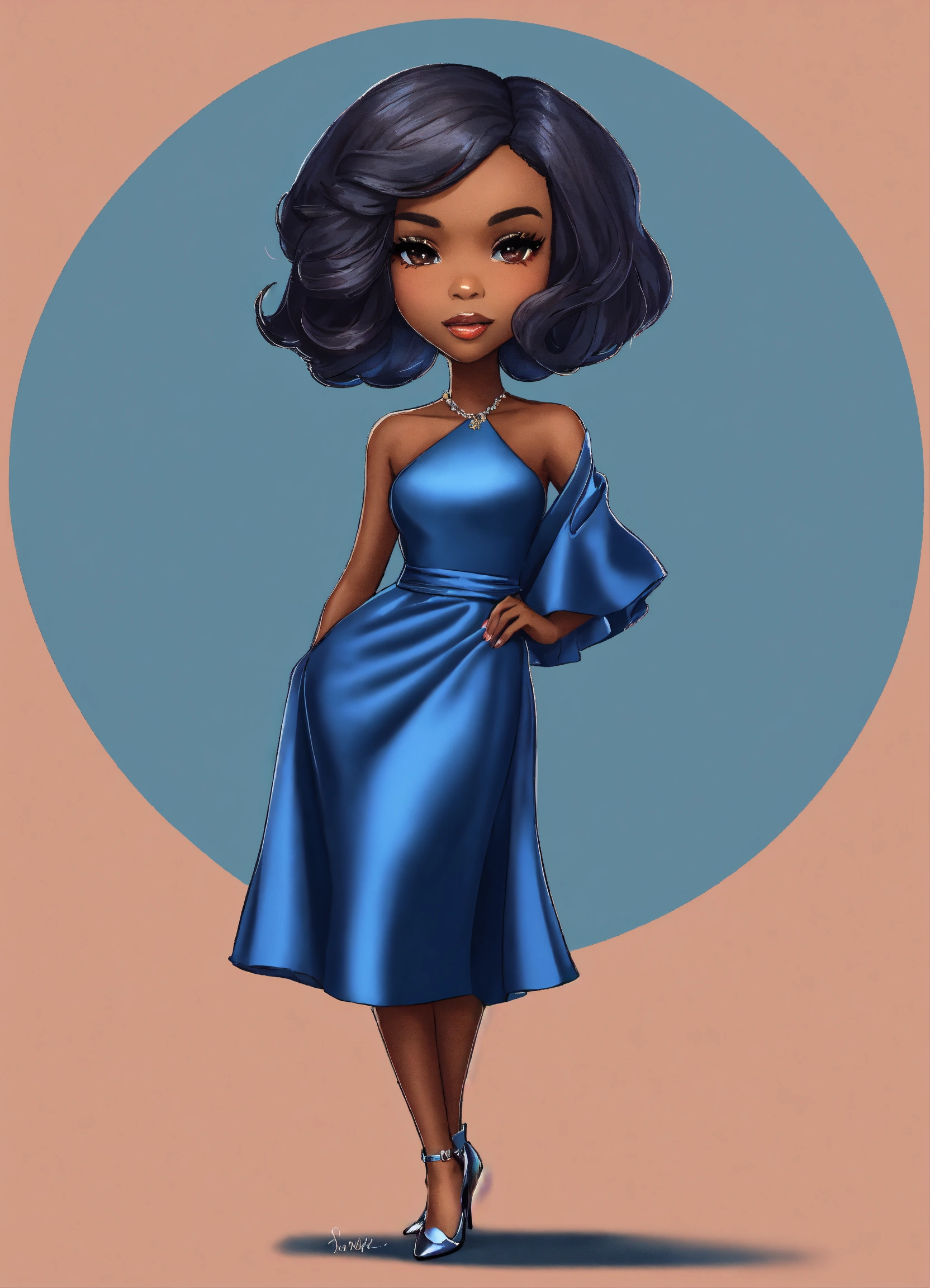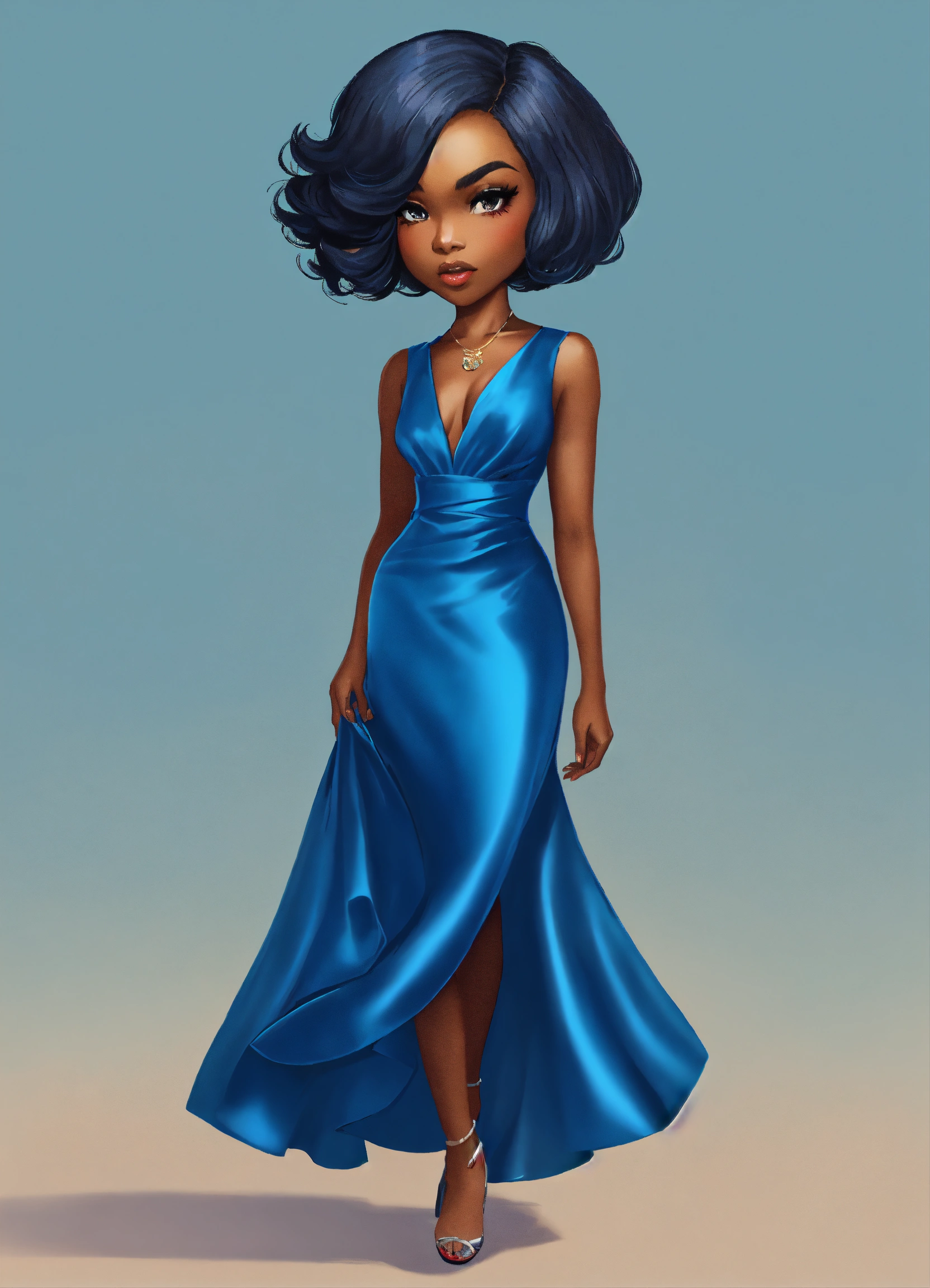 Digital illustration of a sophisticated chibi african american woman with a bob cut, wearing a blue satin gown. full body.