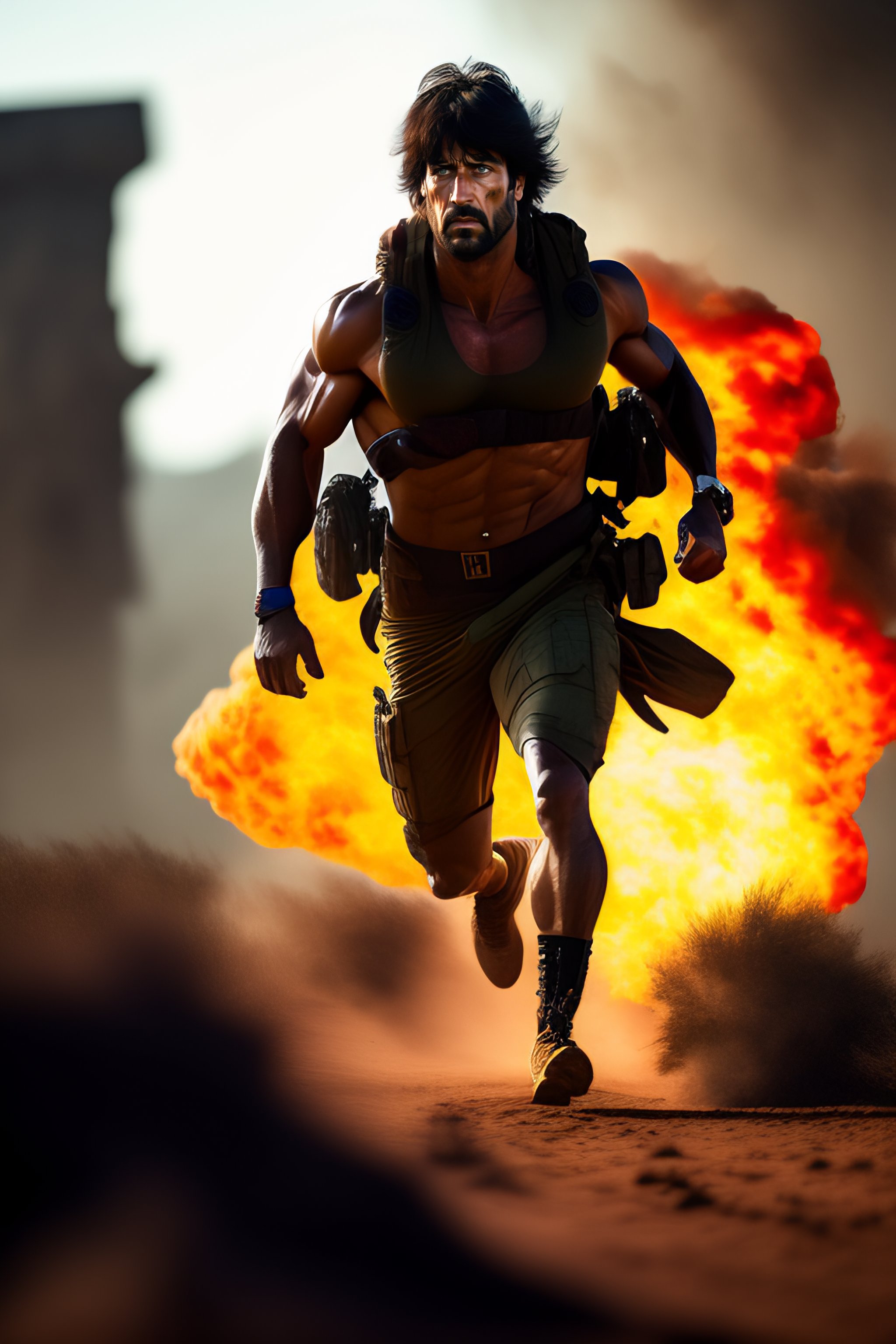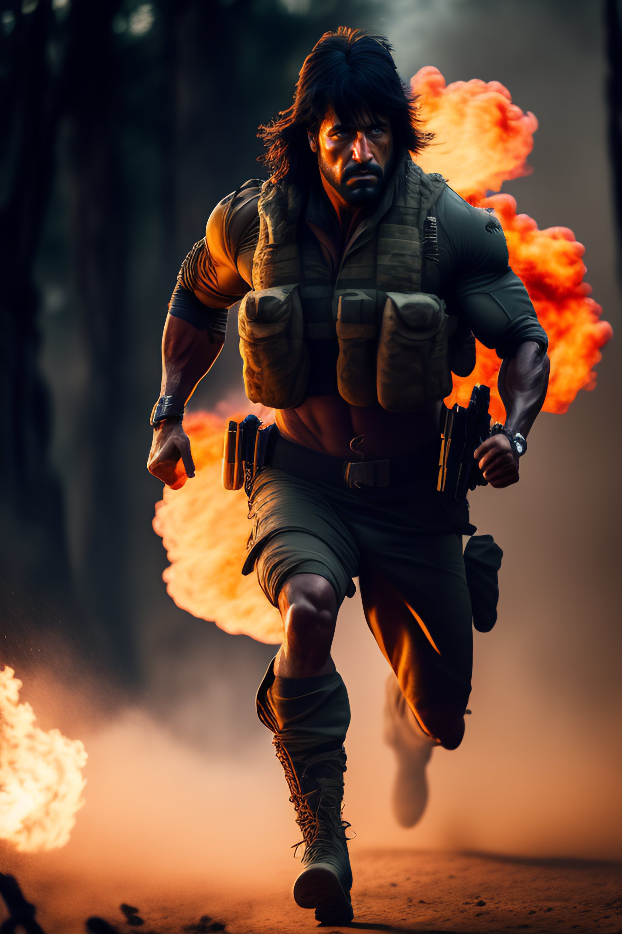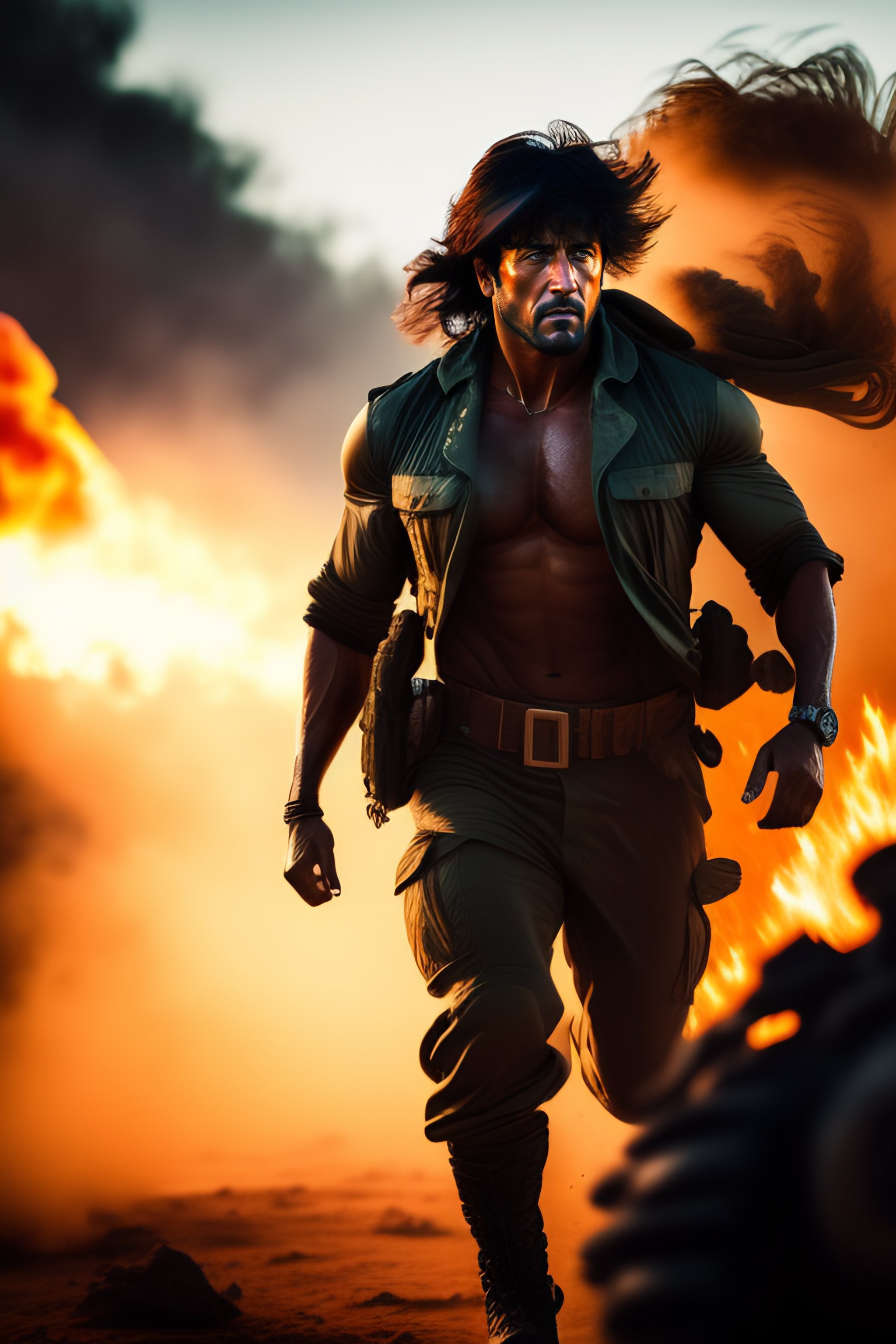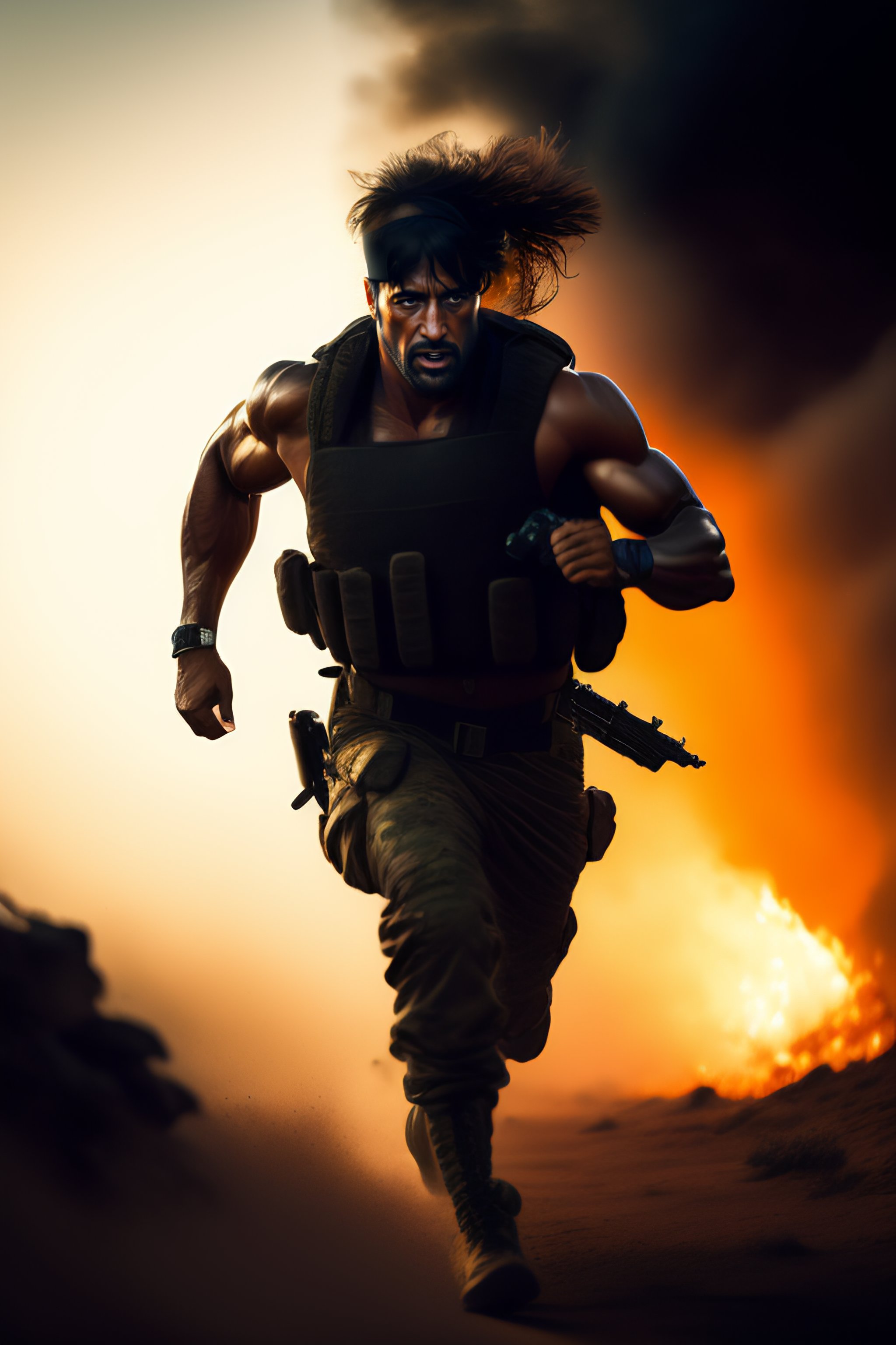 Action shot of john rambo middle of a warzone running from an attack helicopter, cinematic lighting, brutal, dust, sweat, hyper-detailed, hd, 4k, volumetric lighting