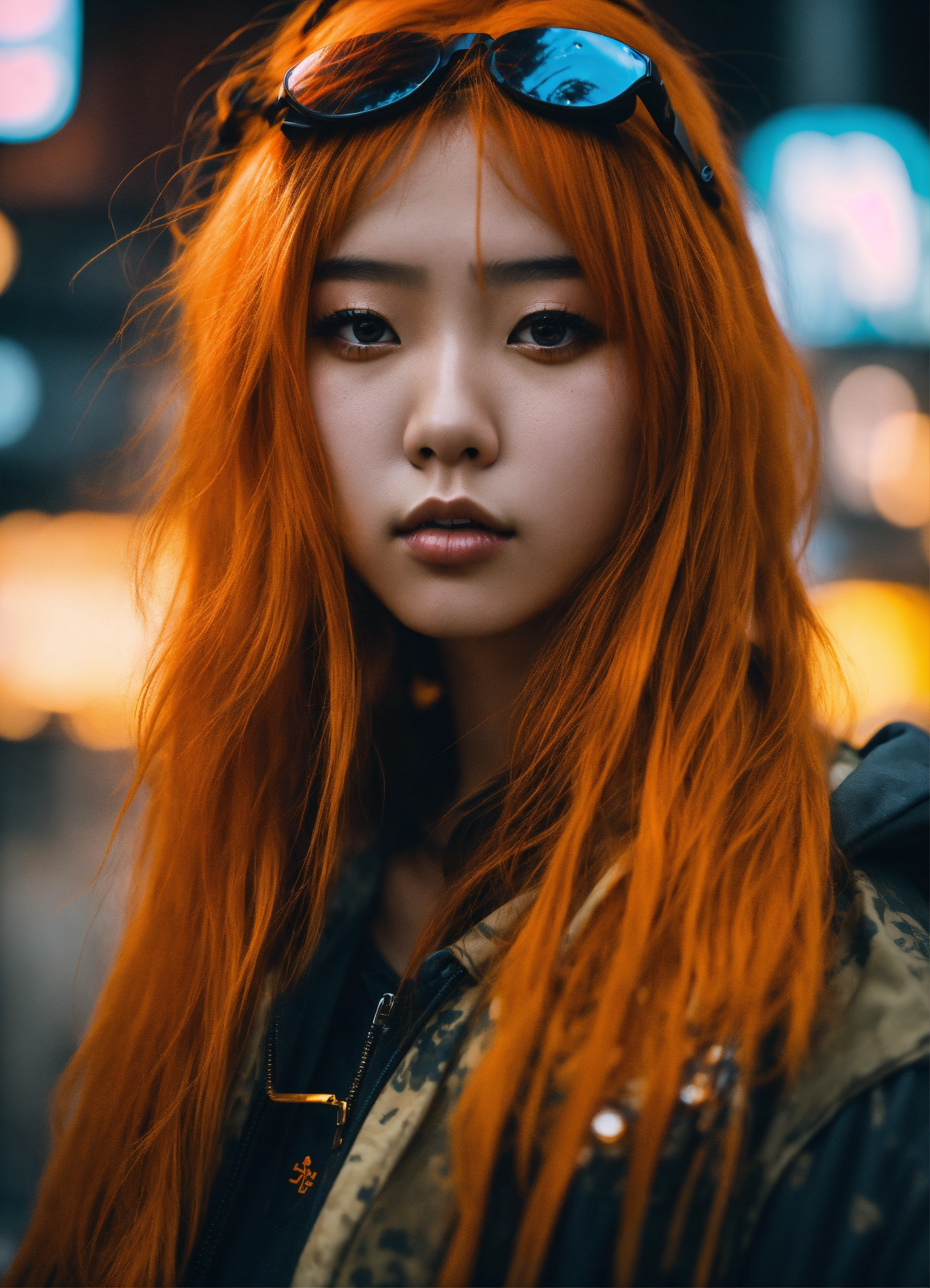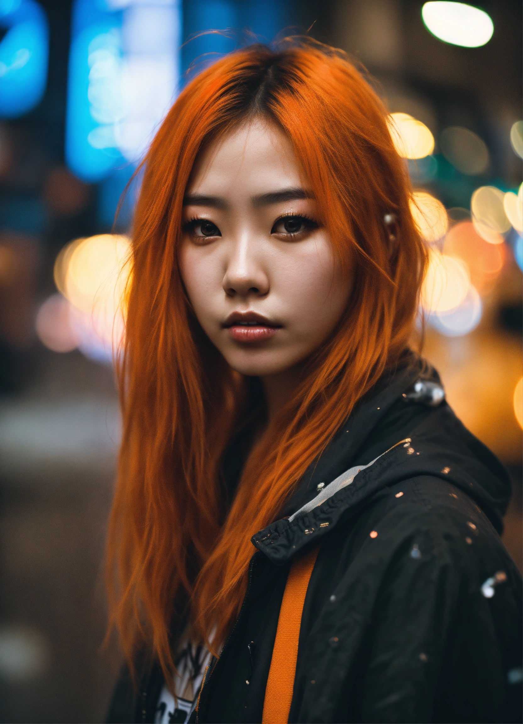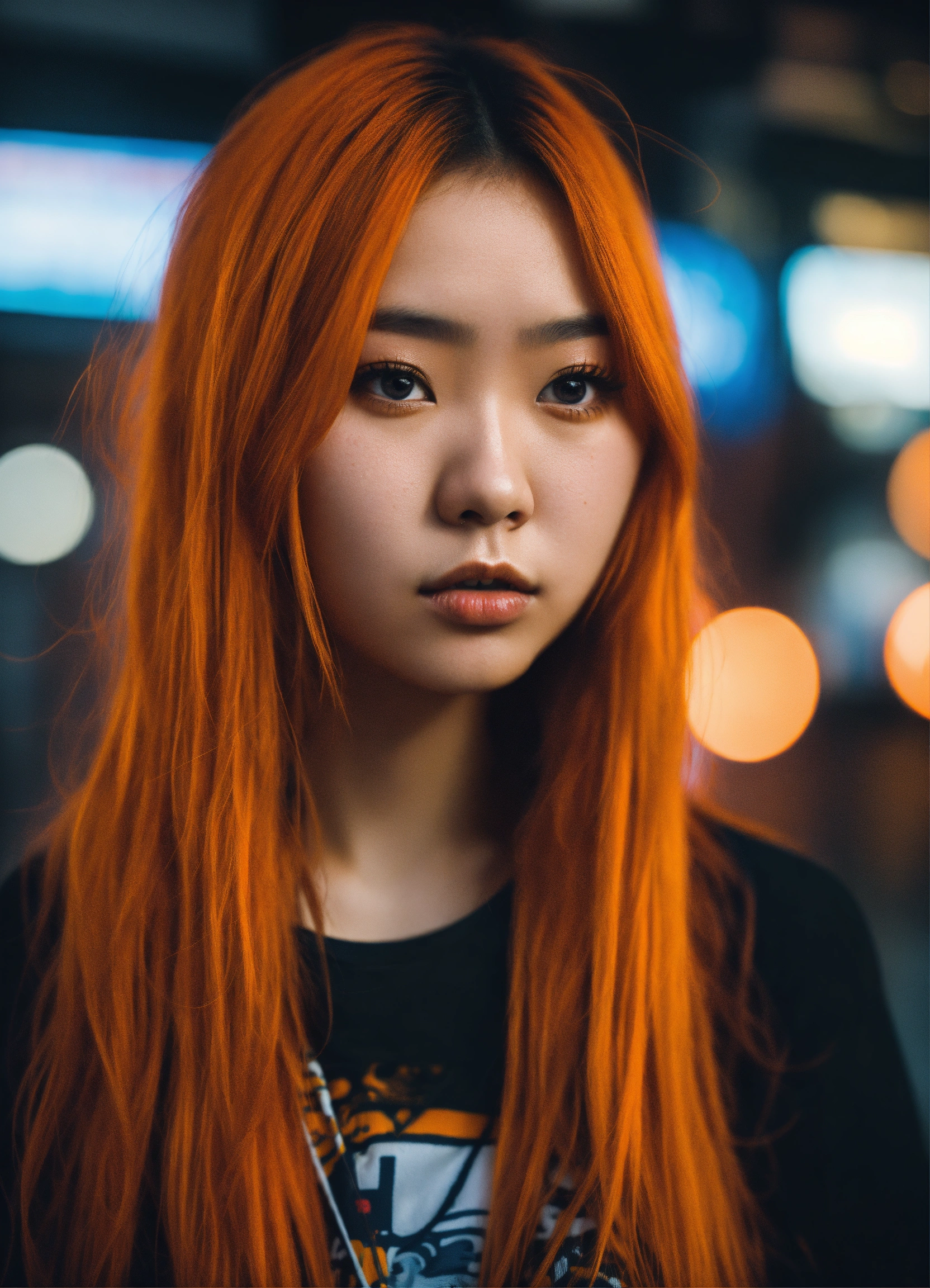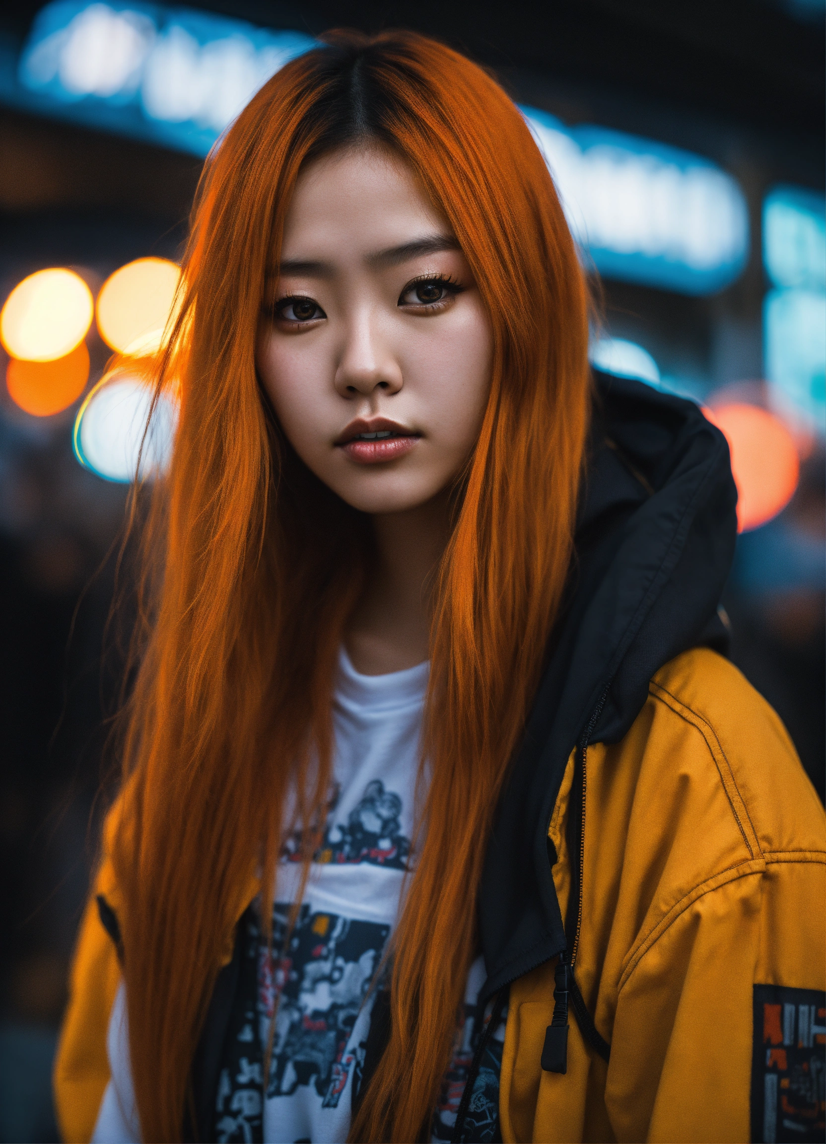Highly detailed portrait of japanese young woman 20 years old, long orange hair, streetwear, cyberpunk, cartoon realism, black, grunge aesthetic!!! bokeh