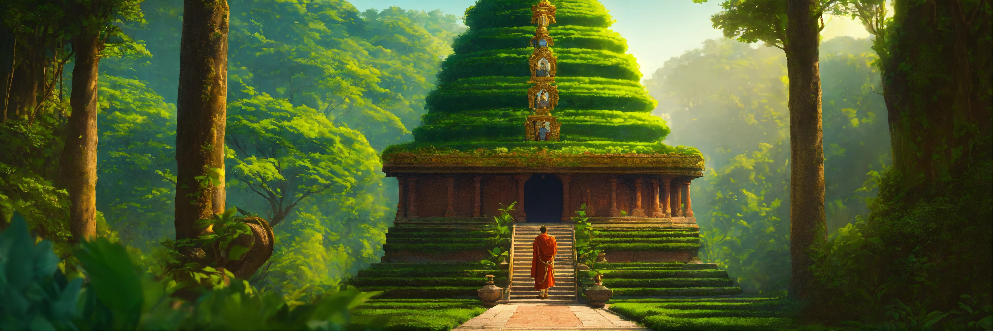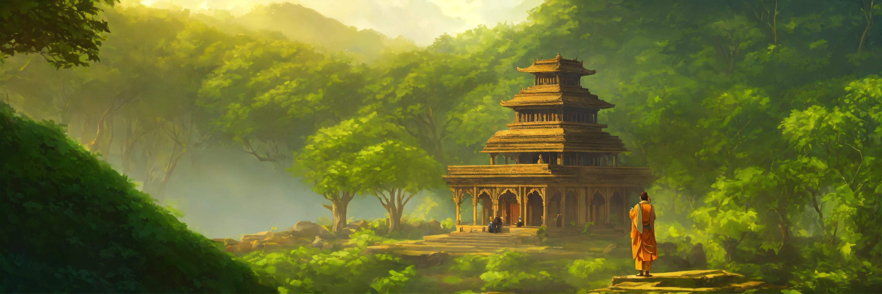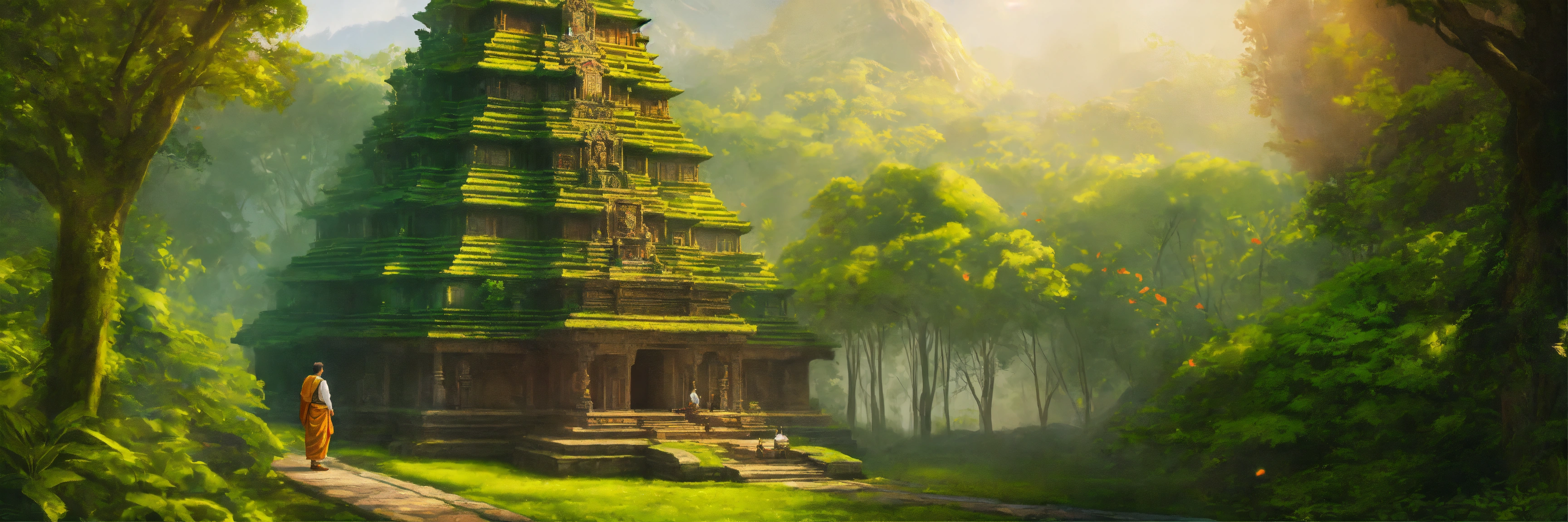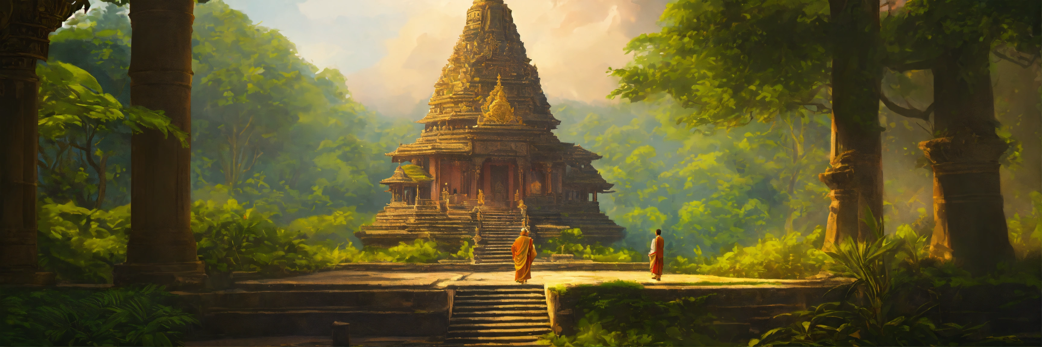A serene forest temple stands tall amidst the lush green trees, as a wise monk and a powerful indian king engage in a deep conversation about the secrets of life, detailed, 16k, focused, extreme details, super resolution, cinematic, masterpiece.