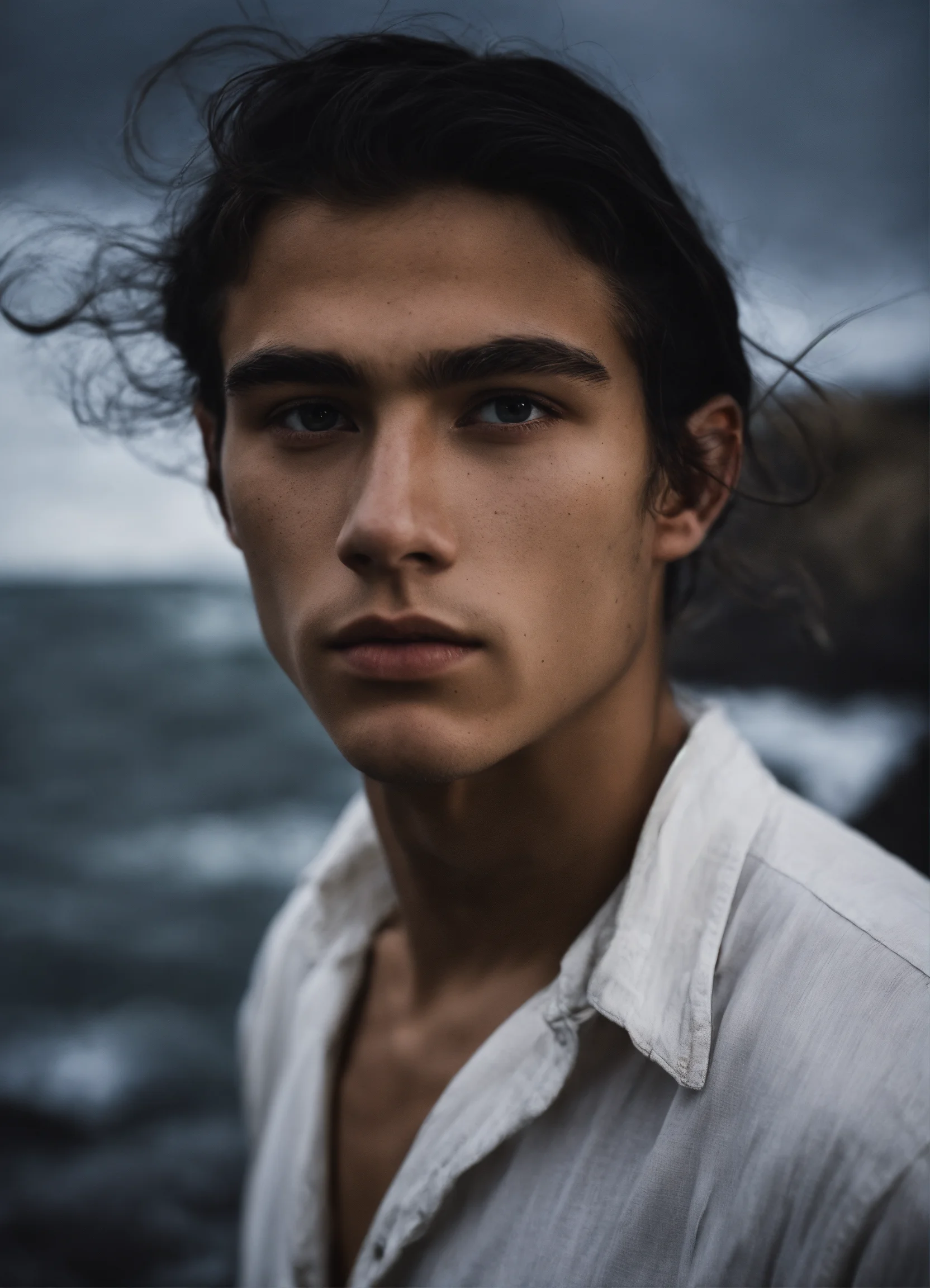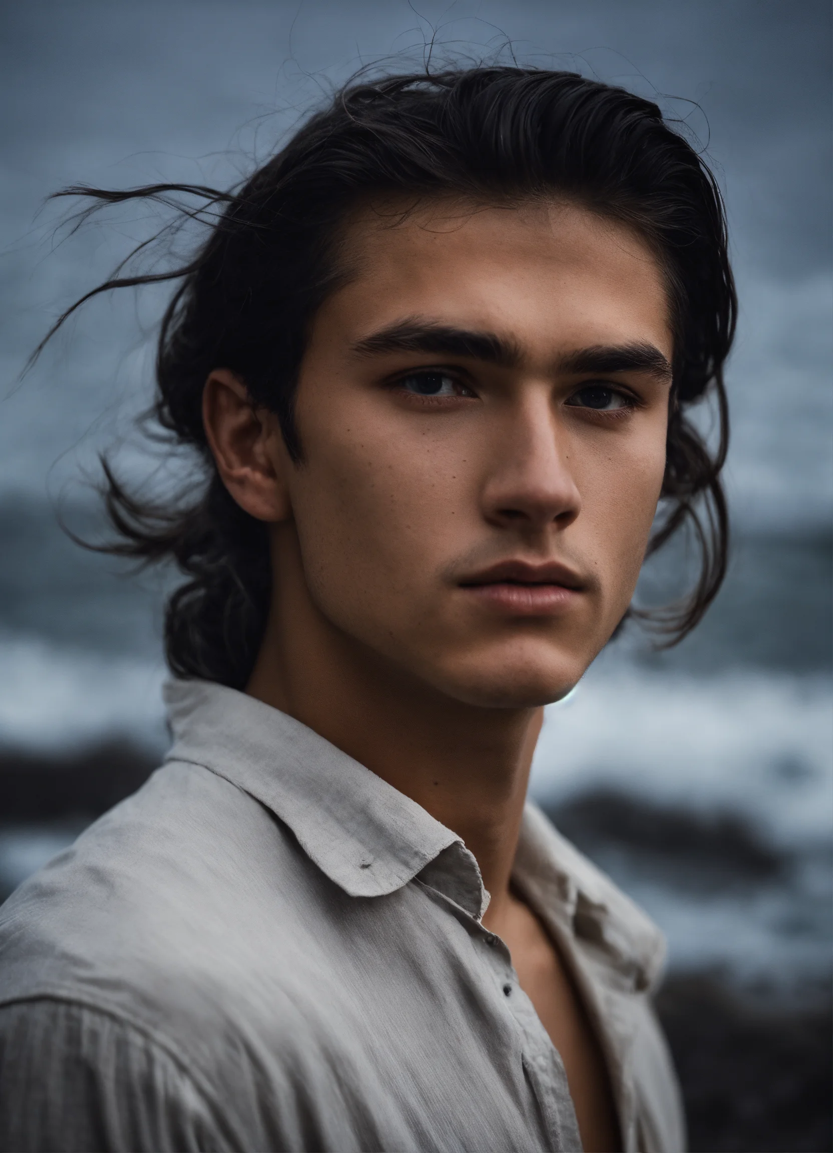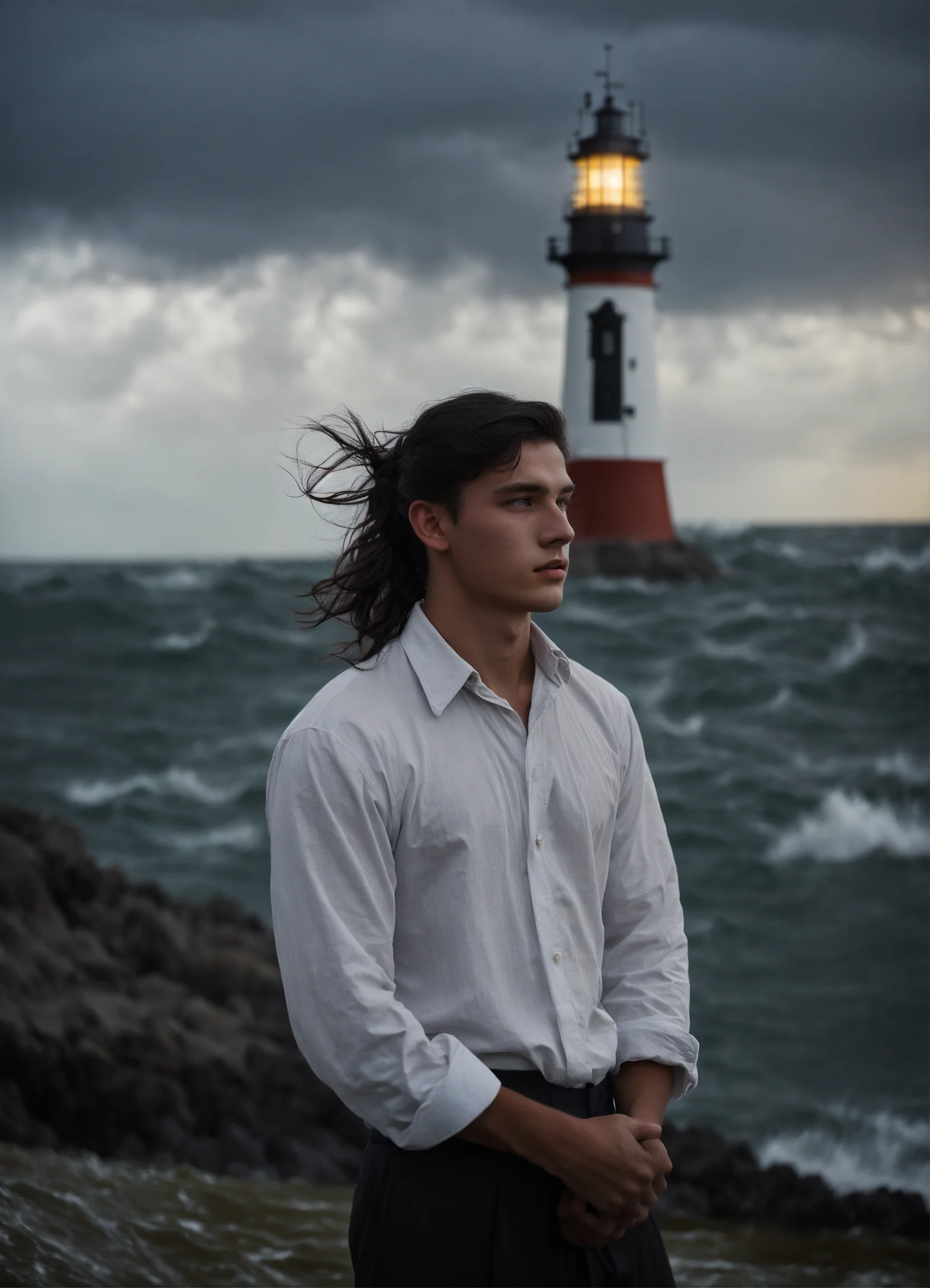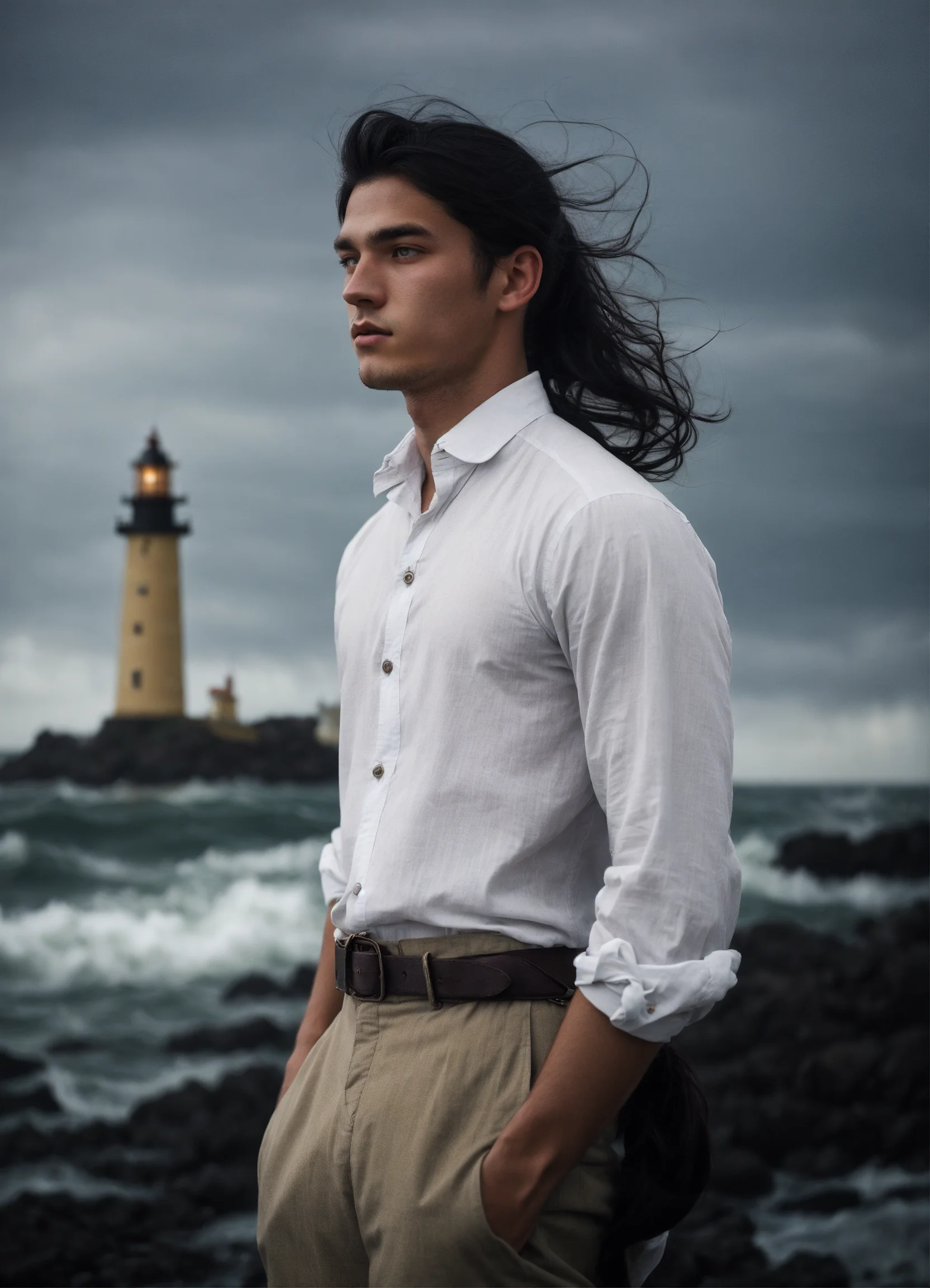 Medium shot, 1910's 19 year old russian boy, handsome, tan skin, light grey eyes, 1910's loose white shirt, long black hair ponytail, by the dark ocean, in storm, lighthouse, overcast, dark