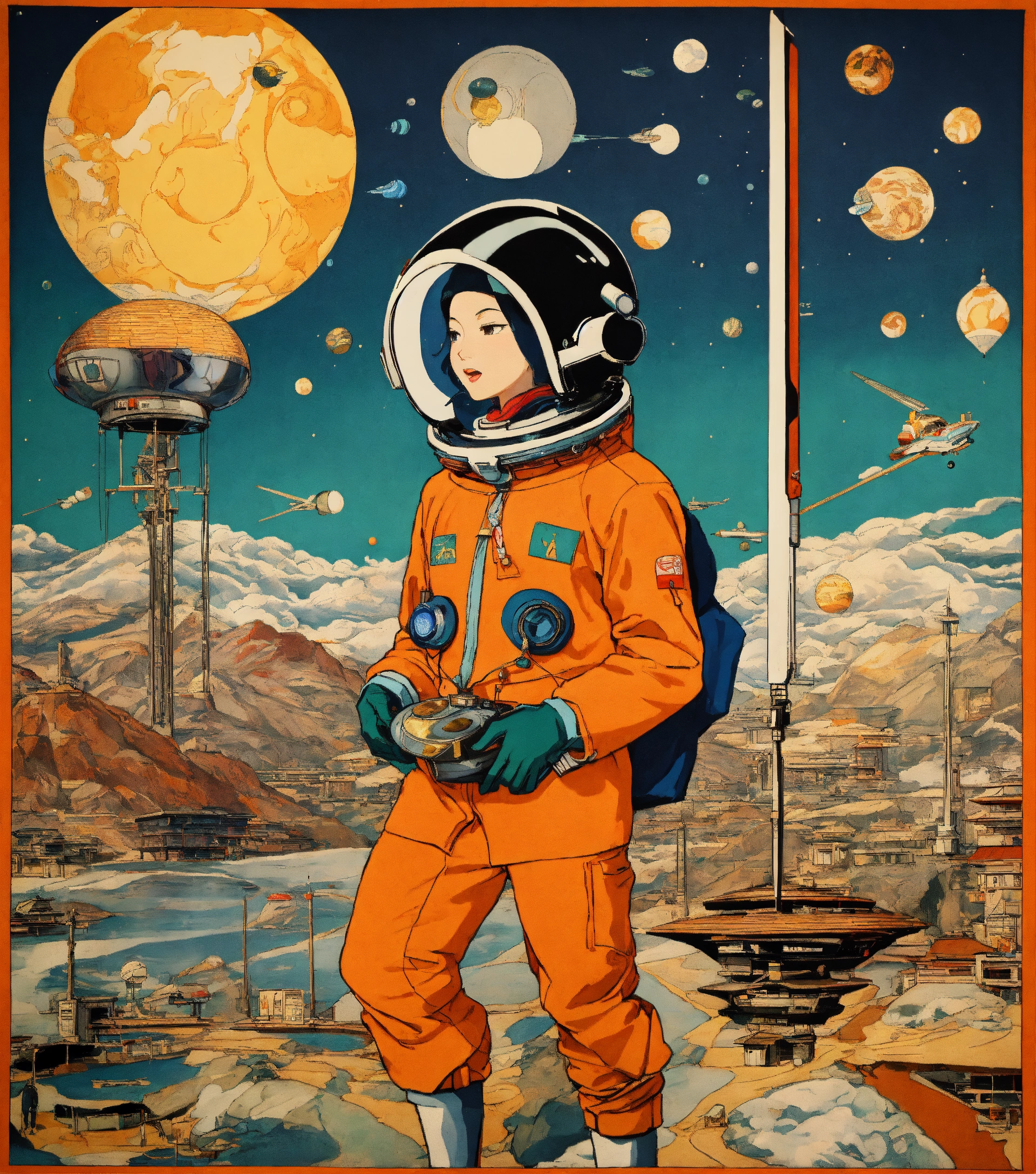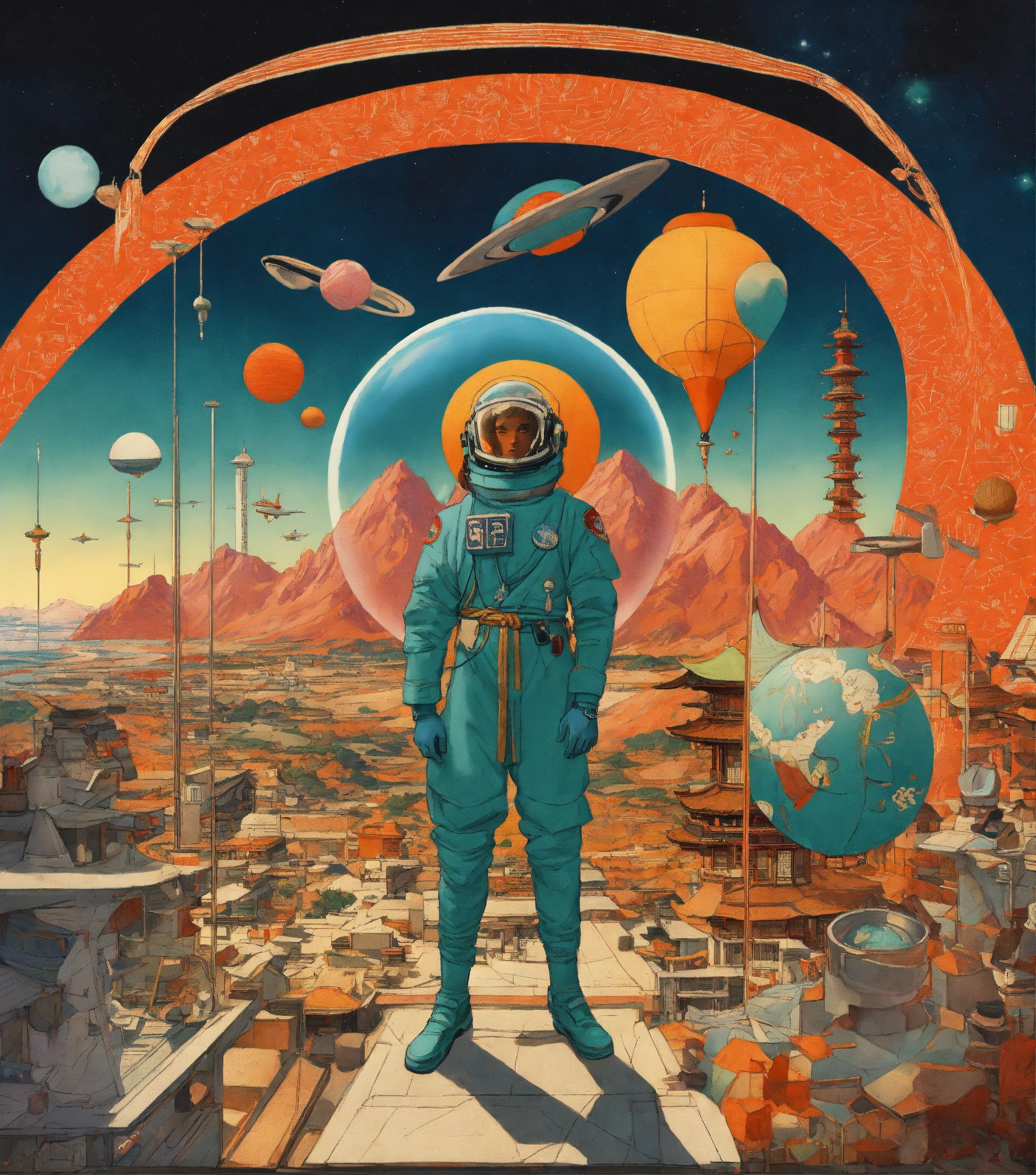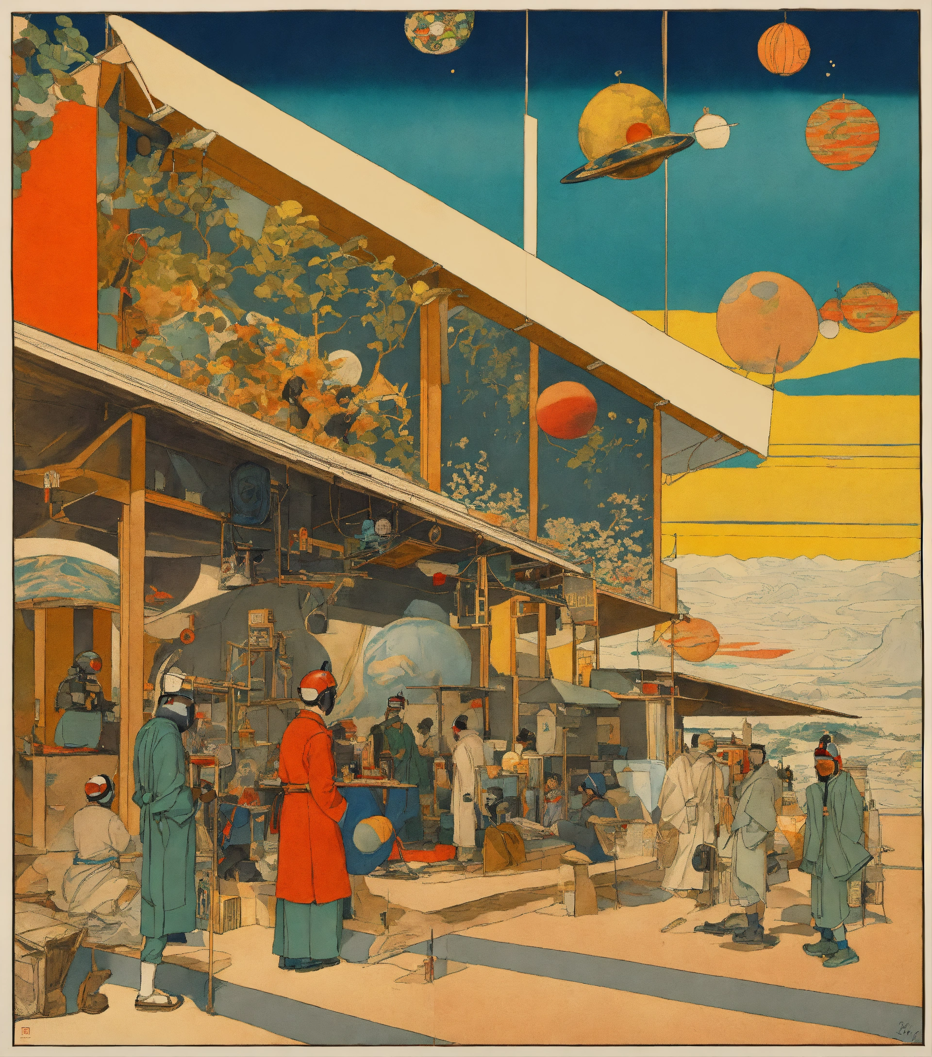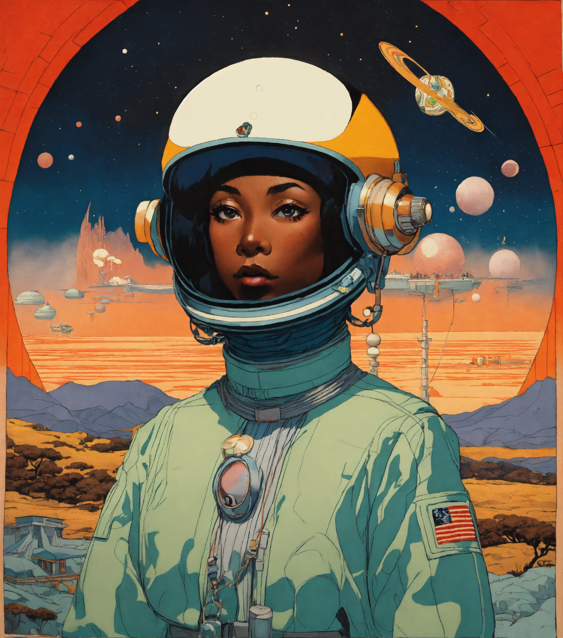 Cartoonish cartoon, alchemy icons, illumination sigils, motific bauhaus ukiyo-e, cartoon cartoonish jetsons, woodbock print of, a space odyssey, kemetic-futurism, perspective environment, op-art, black anime characters, many pilot, oversized space_helmet, anthropomorphic epic illustration style, by norman rockwell and artgerm, kwakiutl flightsuit, shinto mask, jade, ecru, modern sudanese-ukiyo-e texture surreal poly-landscape, by edward hopper, indigo dye tapestry, moma wall hanging, dynamic poses, black harlem botanical, colorful_muted, linocut contour lines, cel shading