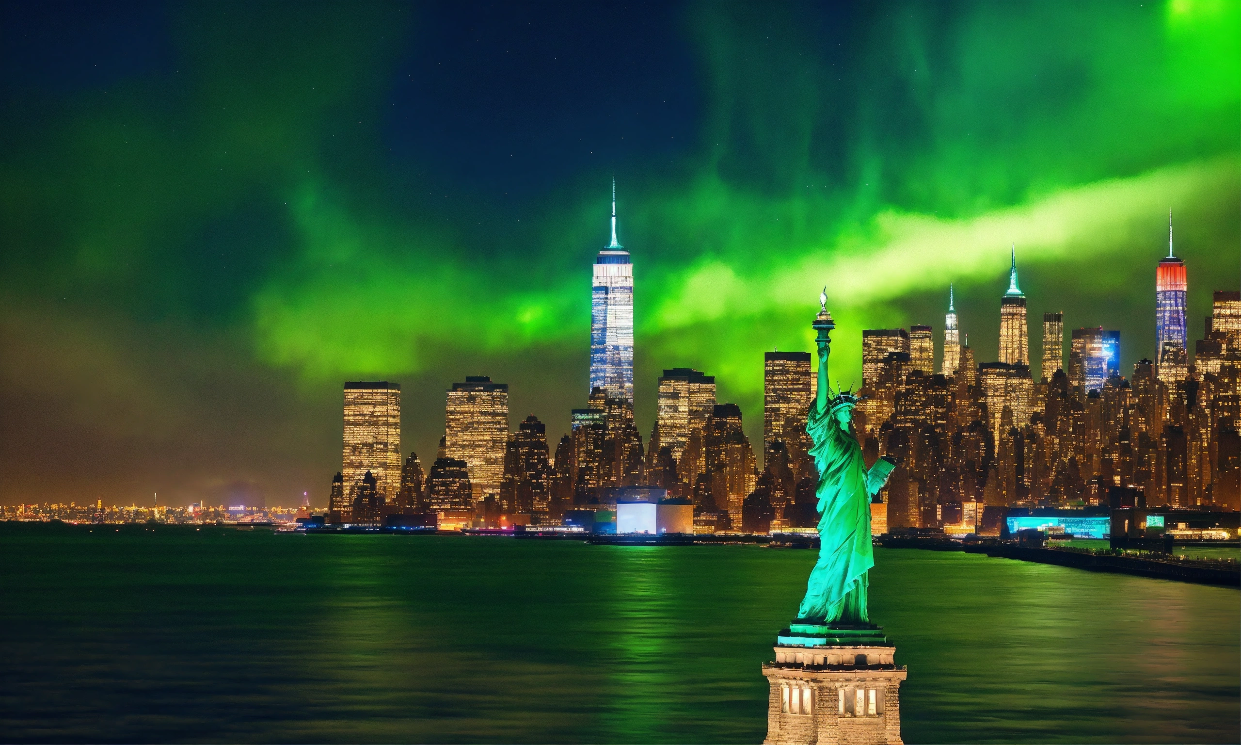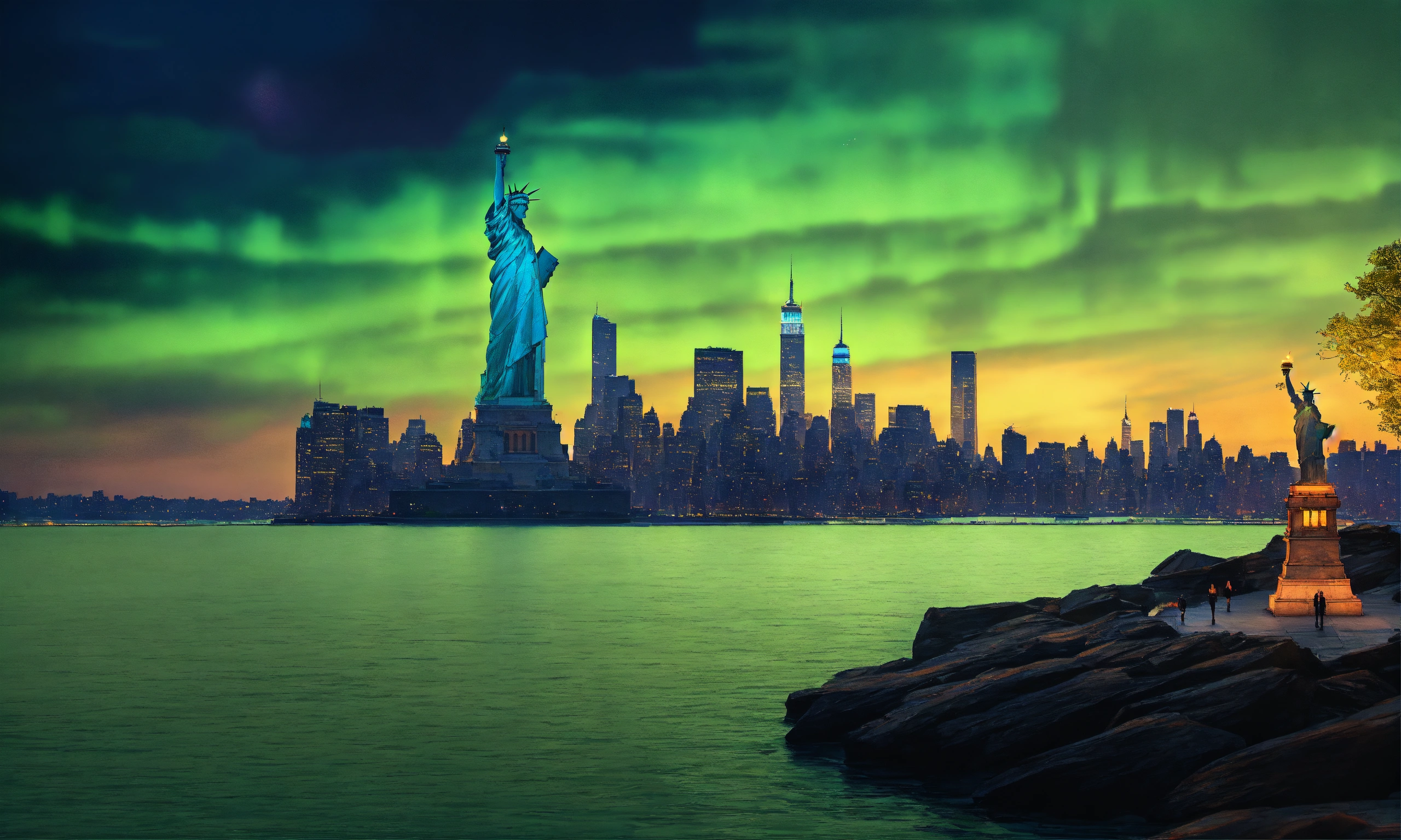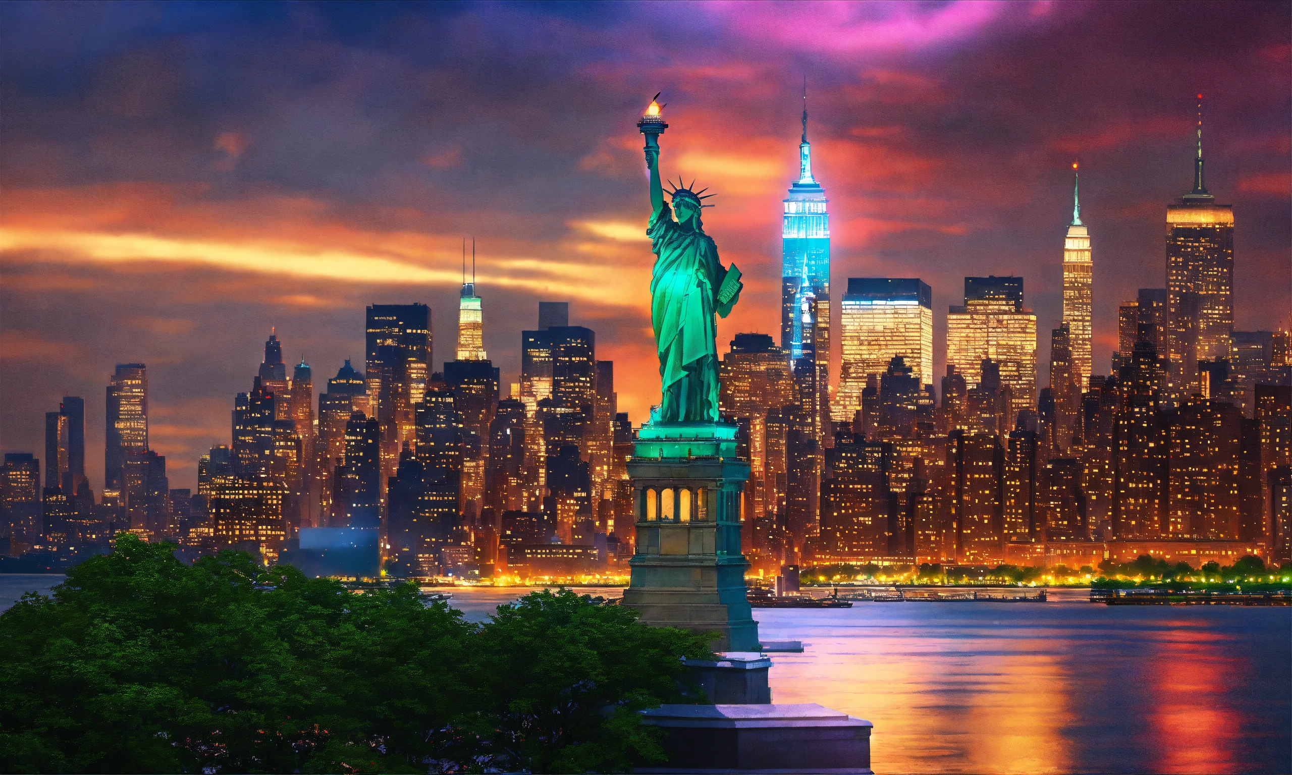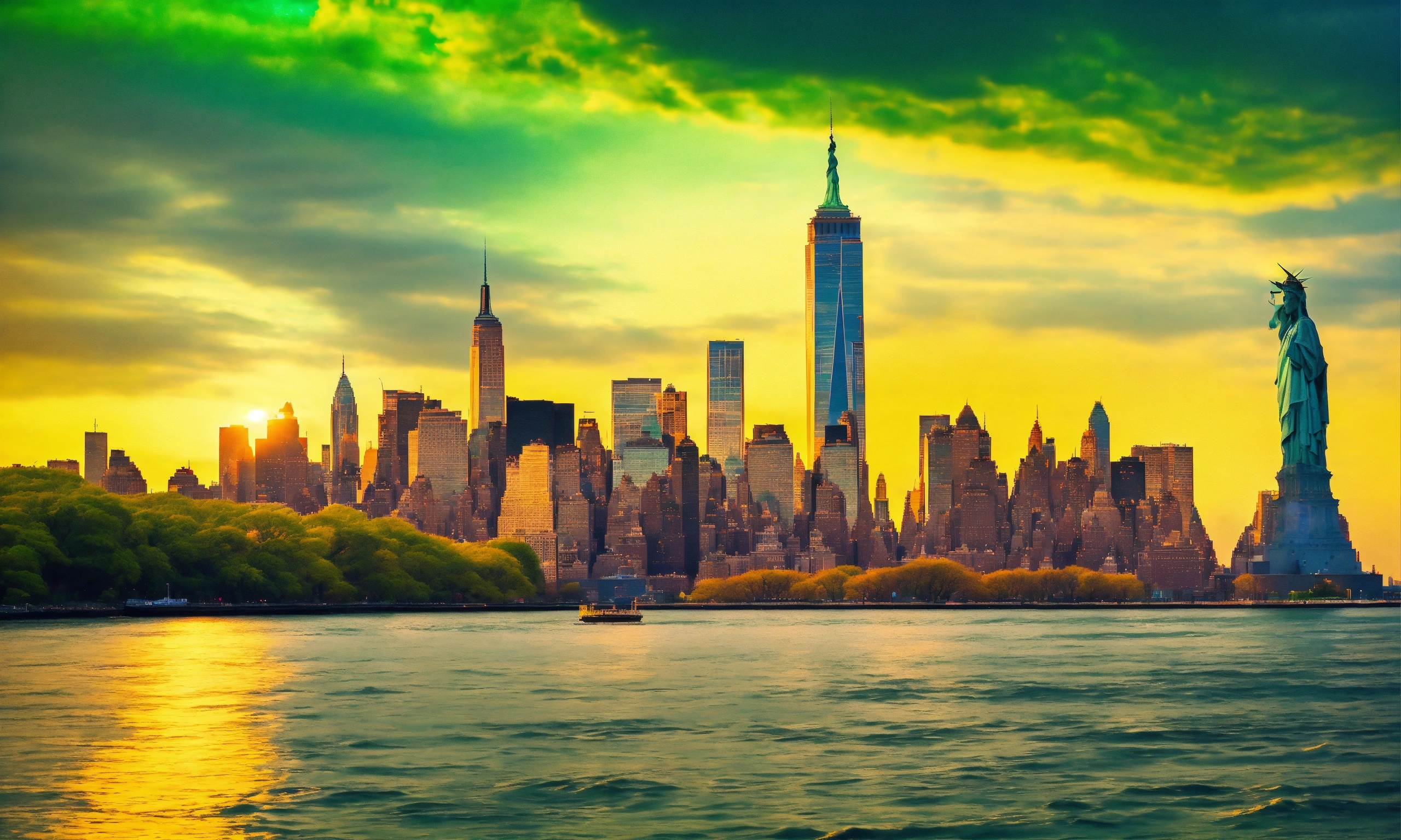 Epic shot of new york, seen from battery park - one side the skyline, the other side the hudson river with one statue of liberty, digital painting, 8k, sharp focus magical place with green atmosphere, ultra detailed and cozy luminous, ultra beautiful and inviting place, wish to be there. very detailed, arty, should rank high on youtube for a dream trip.