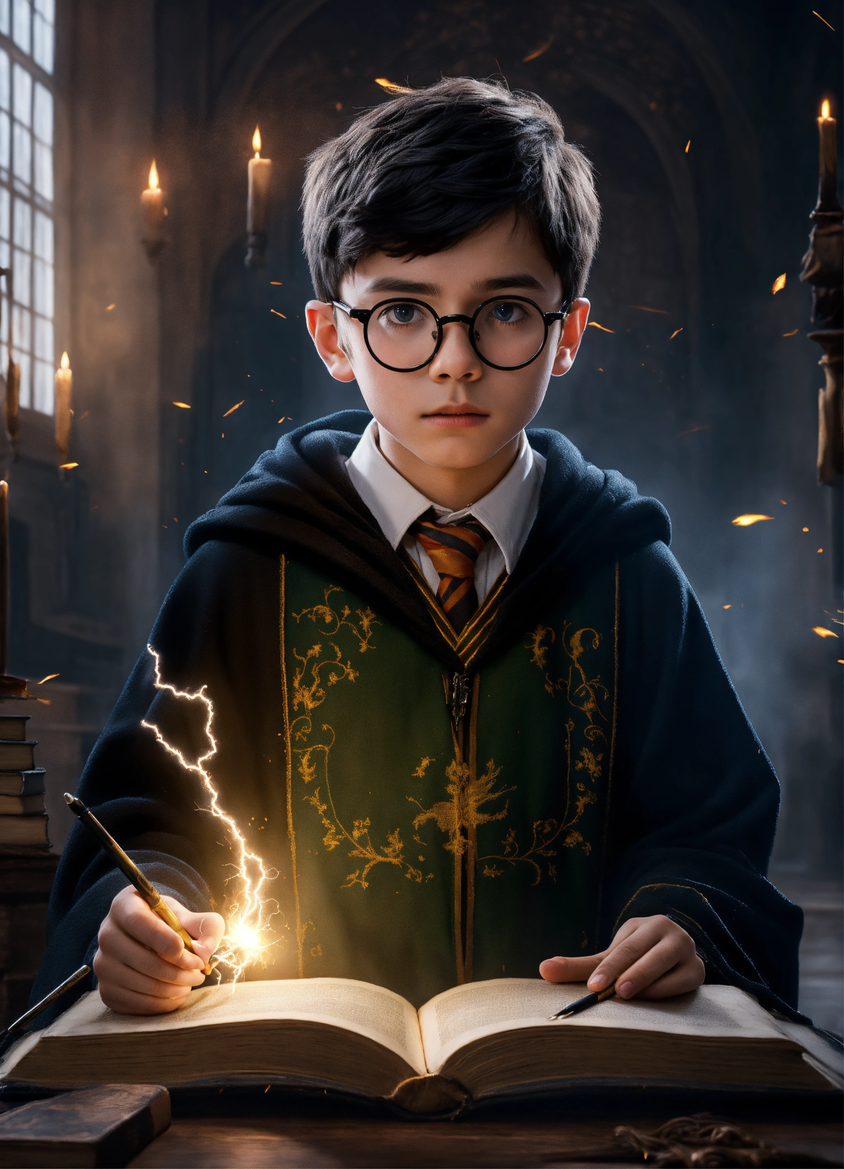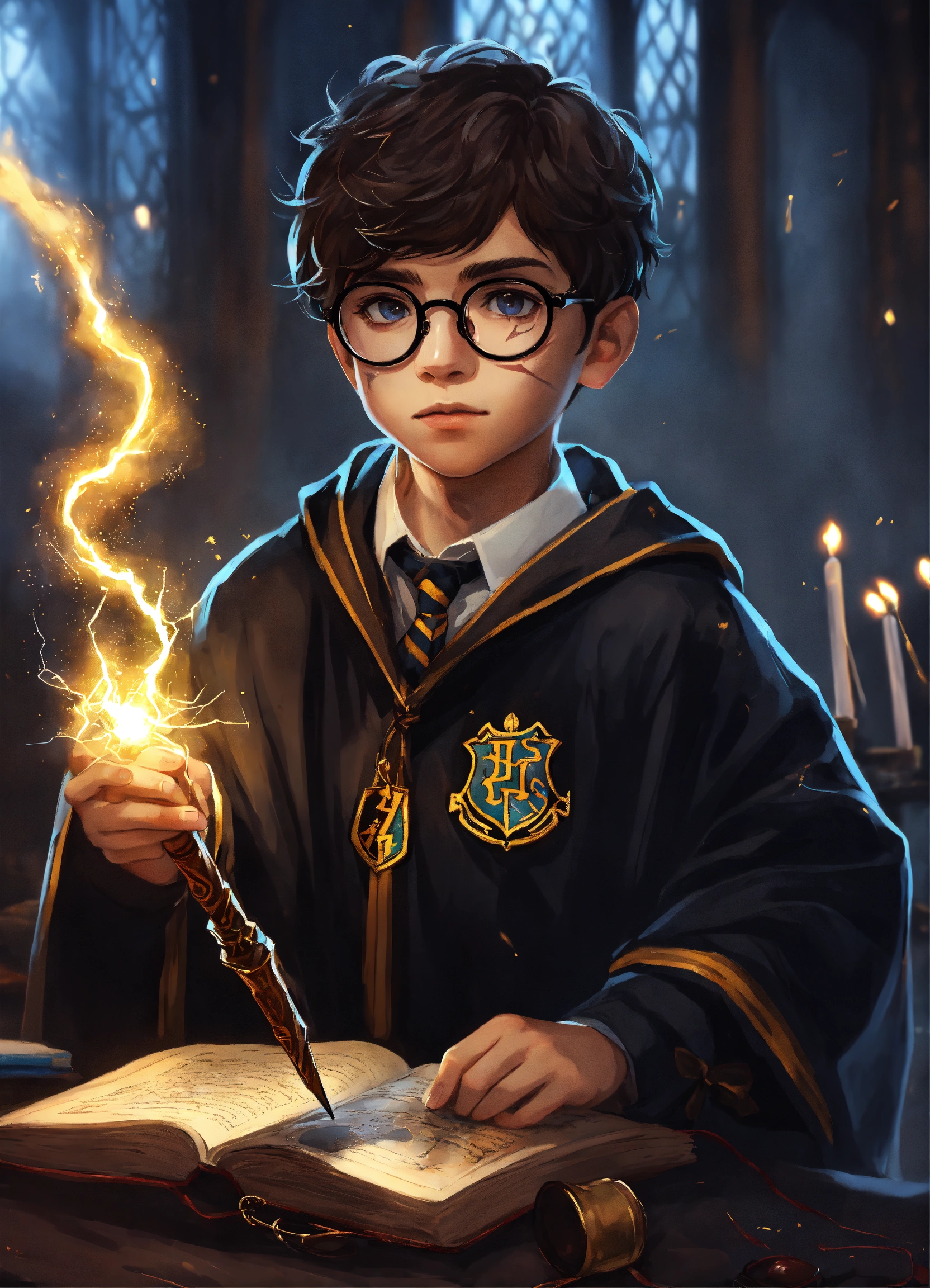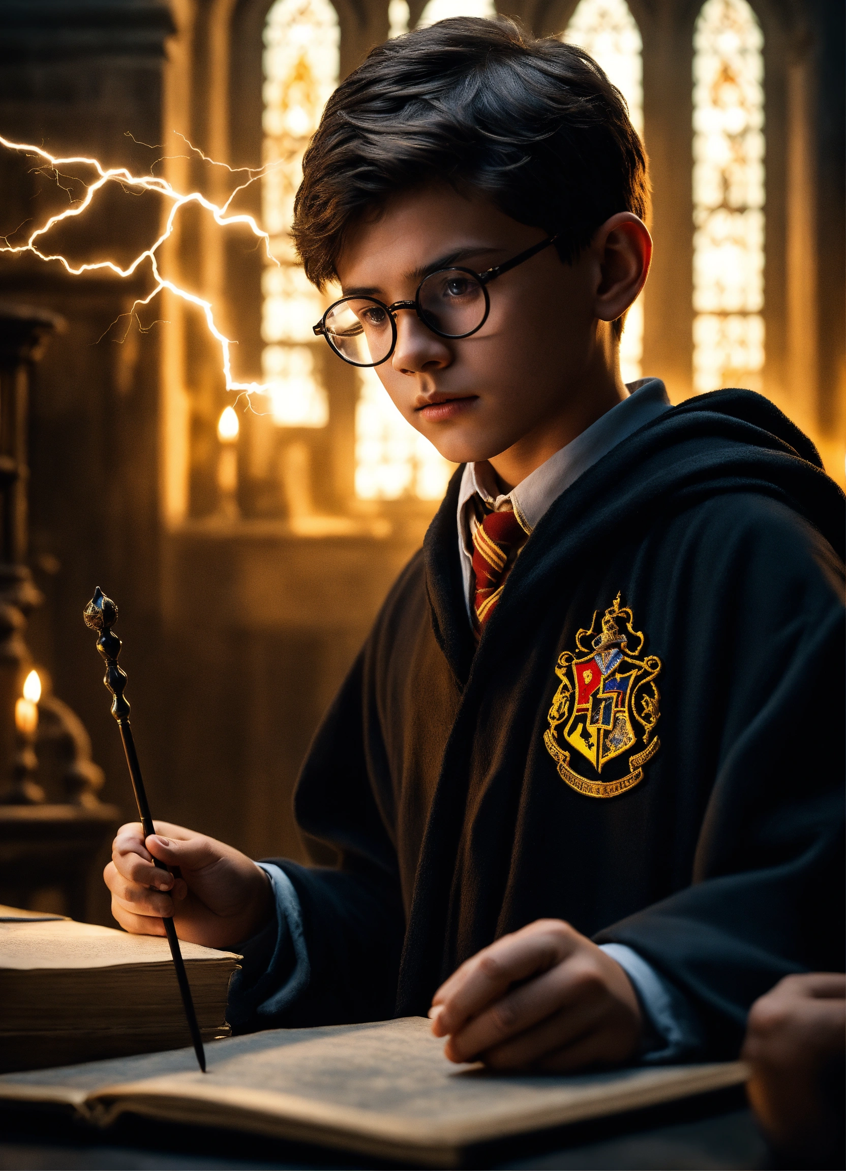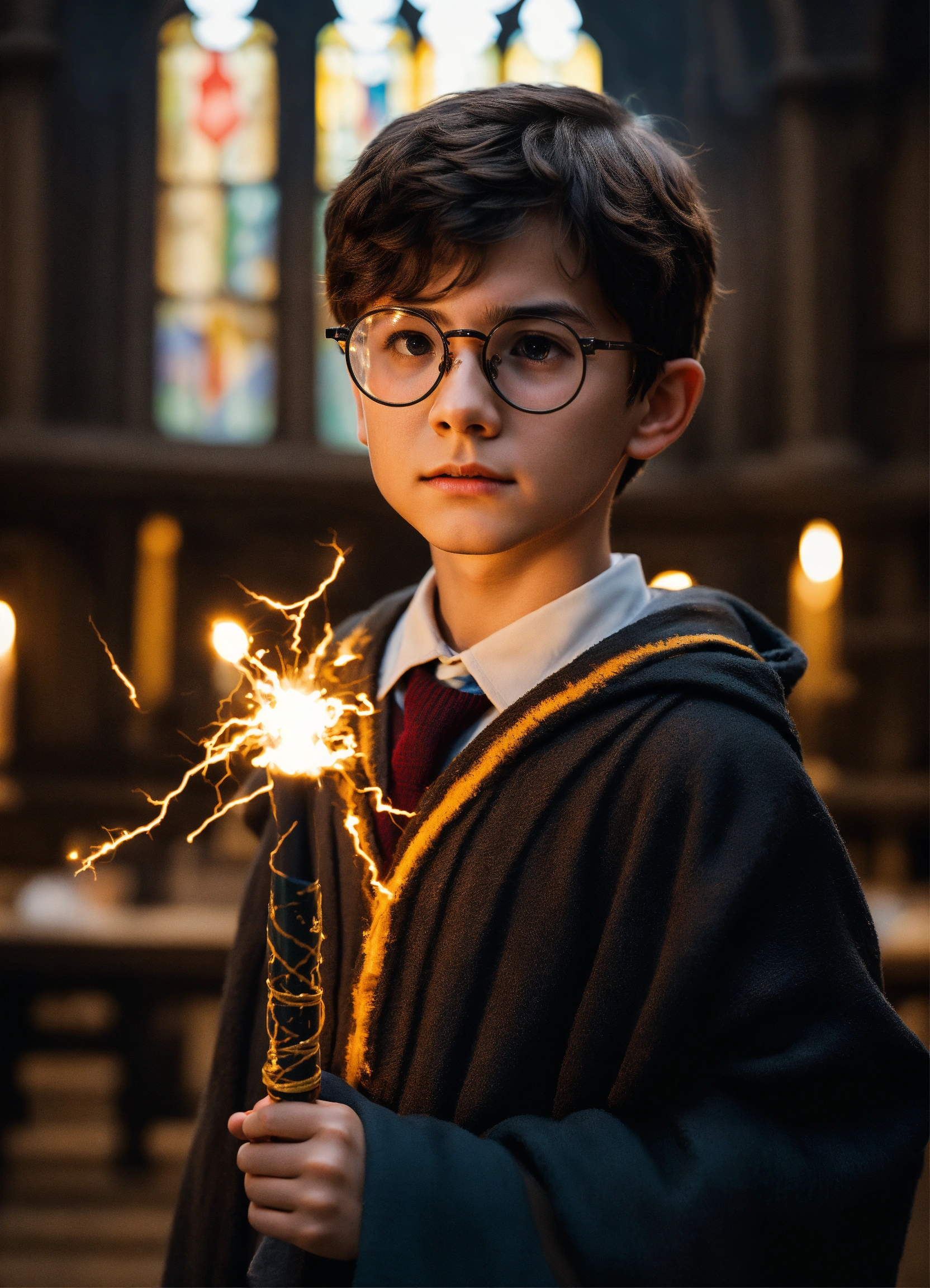 A boy of 10 years with black short hair in round glasses on the forehead a scar in the form of lightning in a black robe and a school sweater with a magic wand in his hands at hogwarts