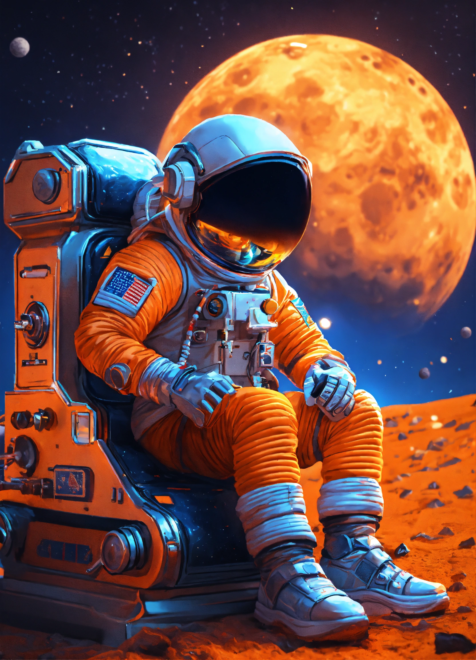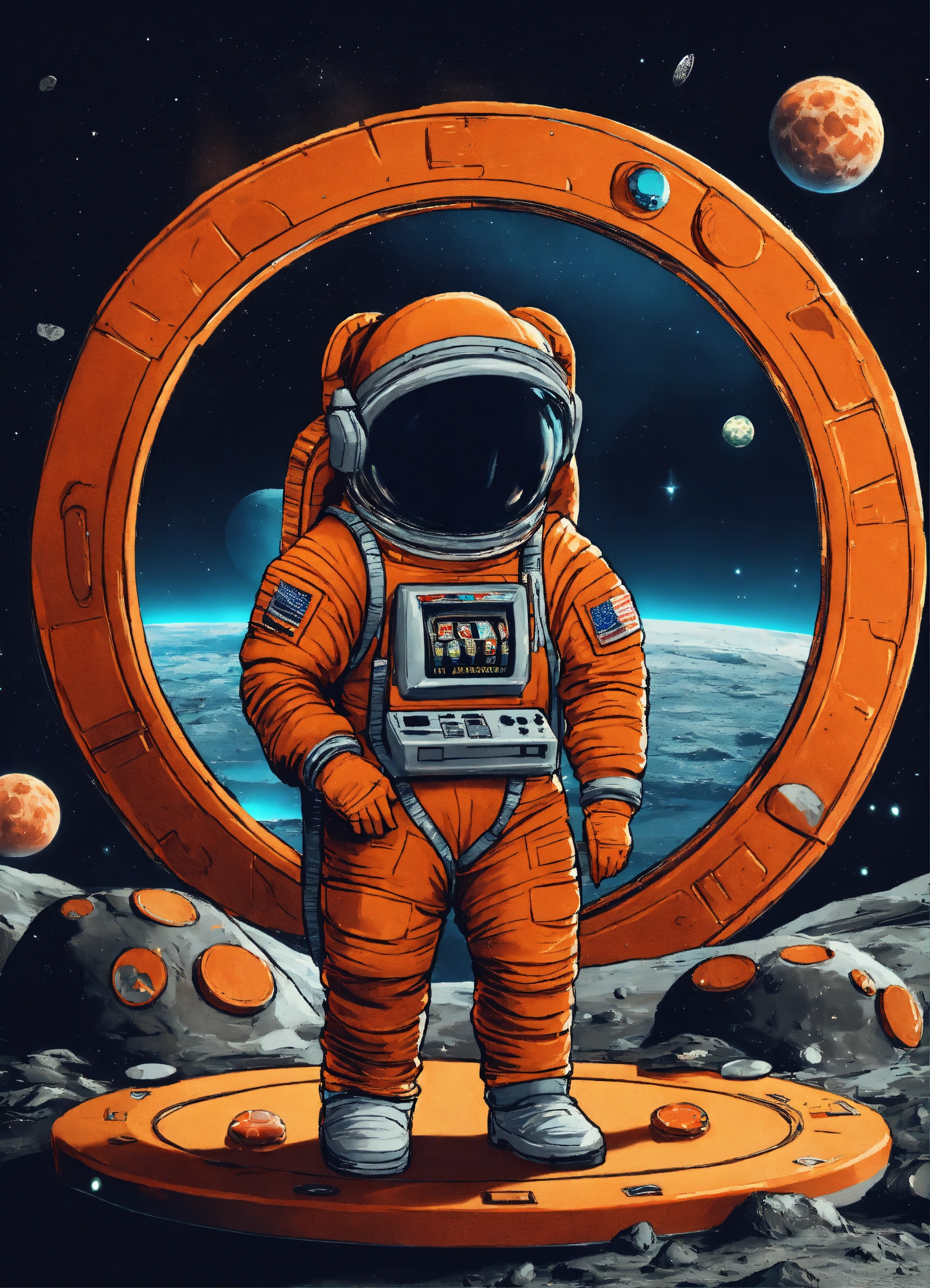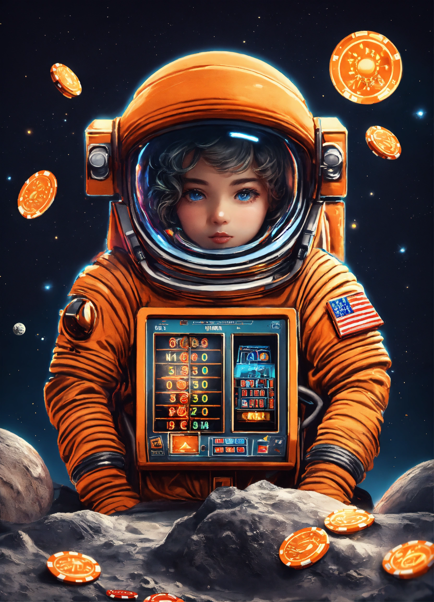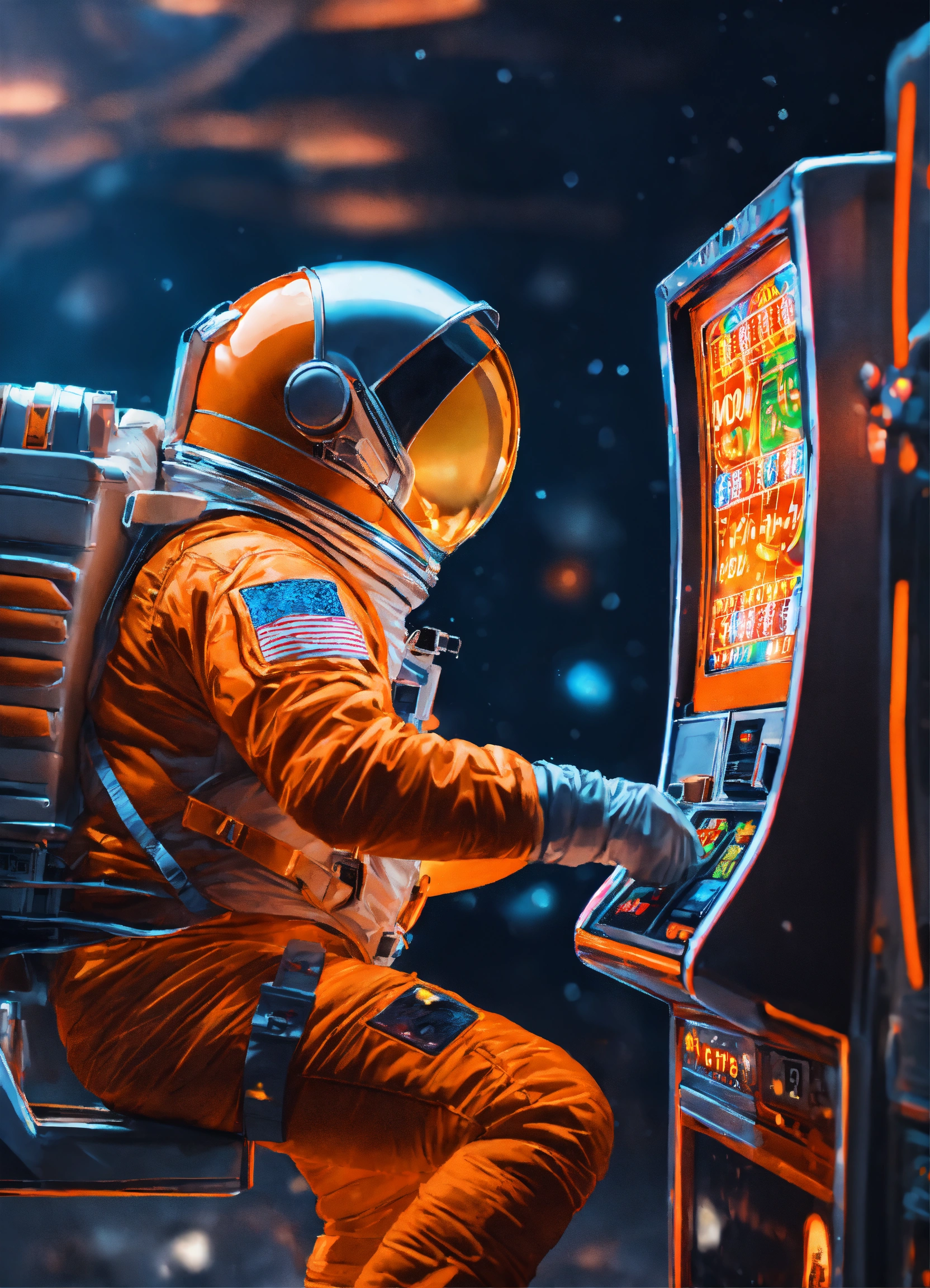 Cute astronaut playing casino slot machine on the moon and win jackpot orange and gray neon 8k
