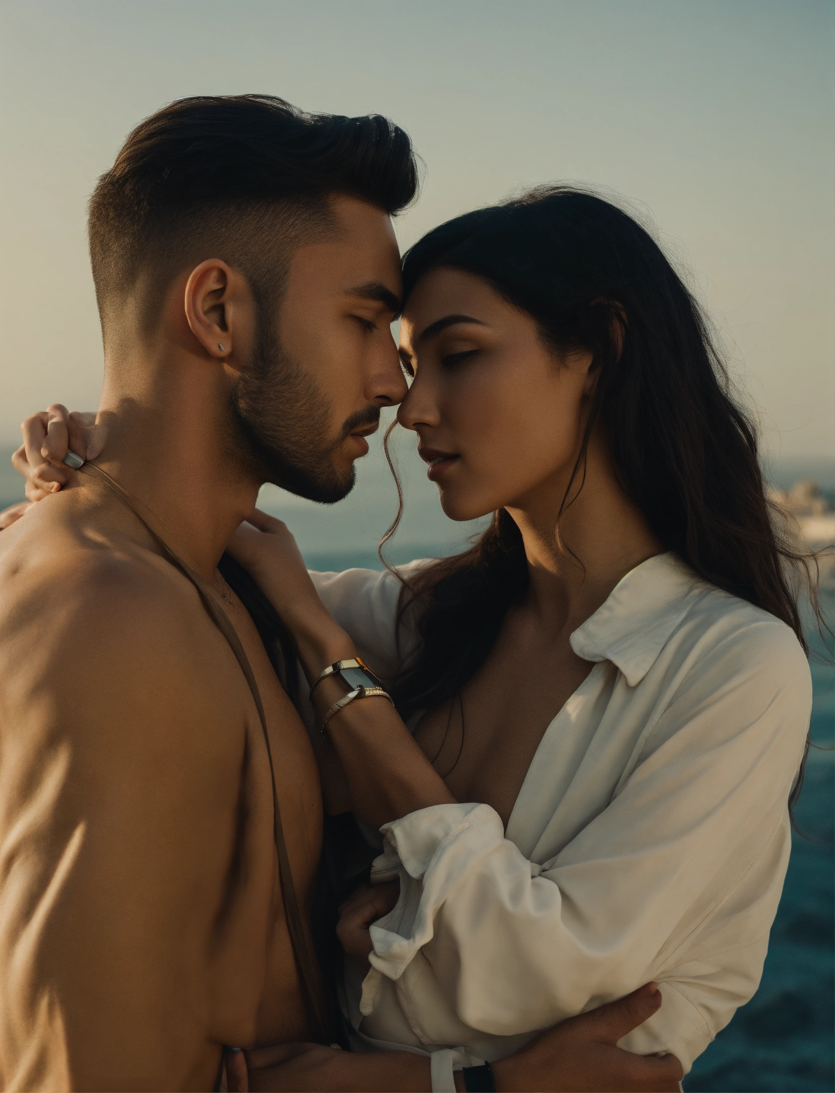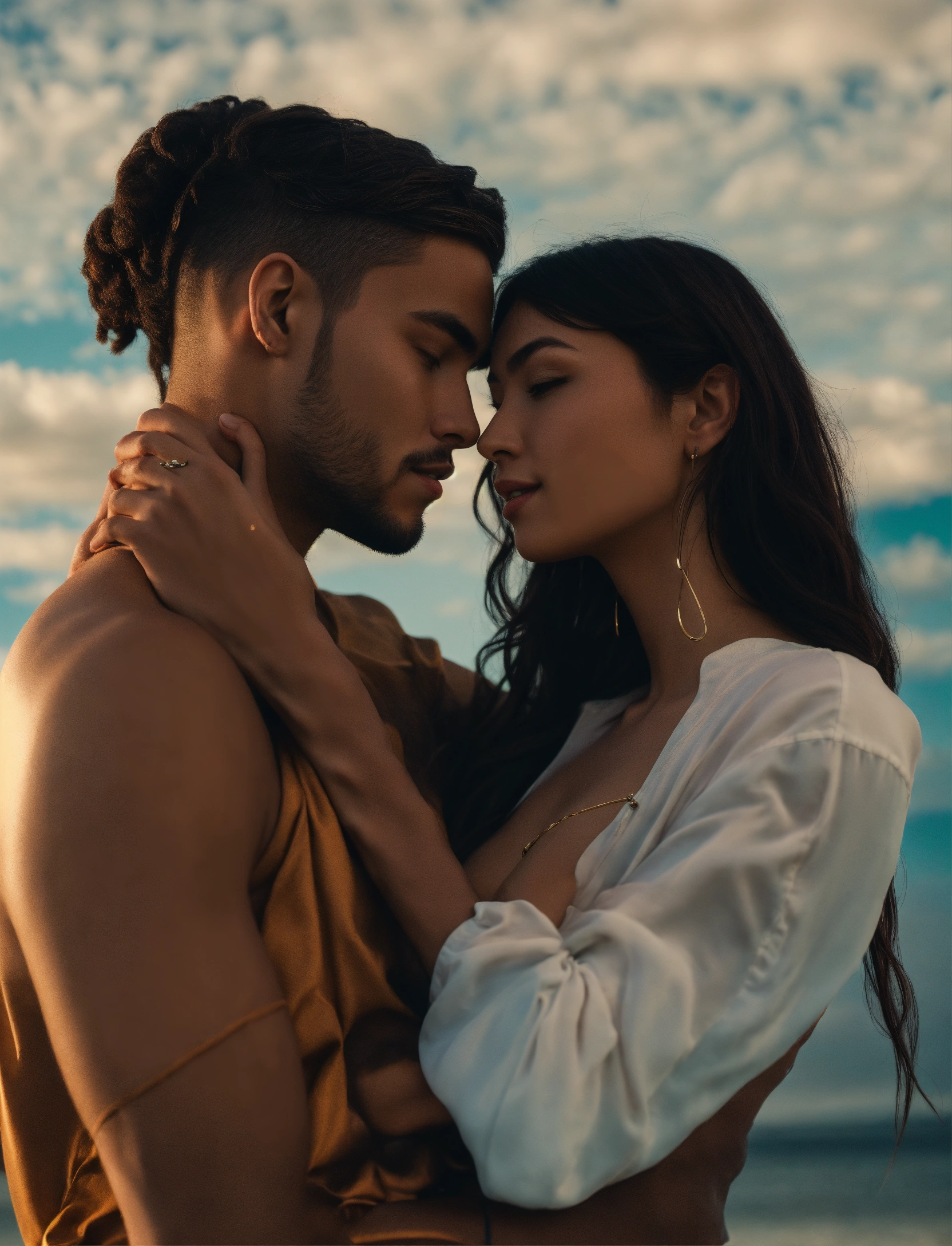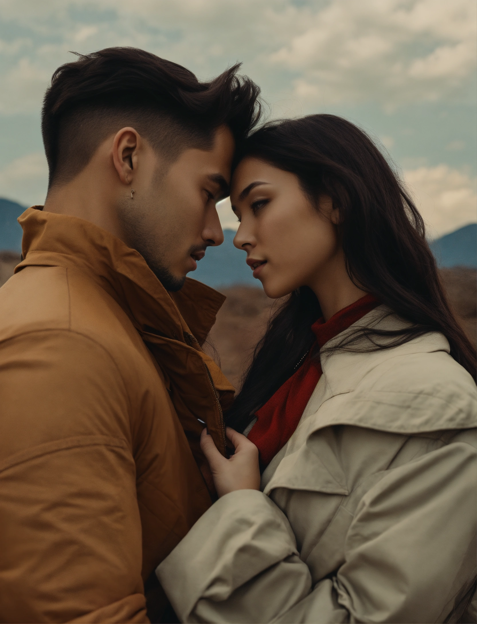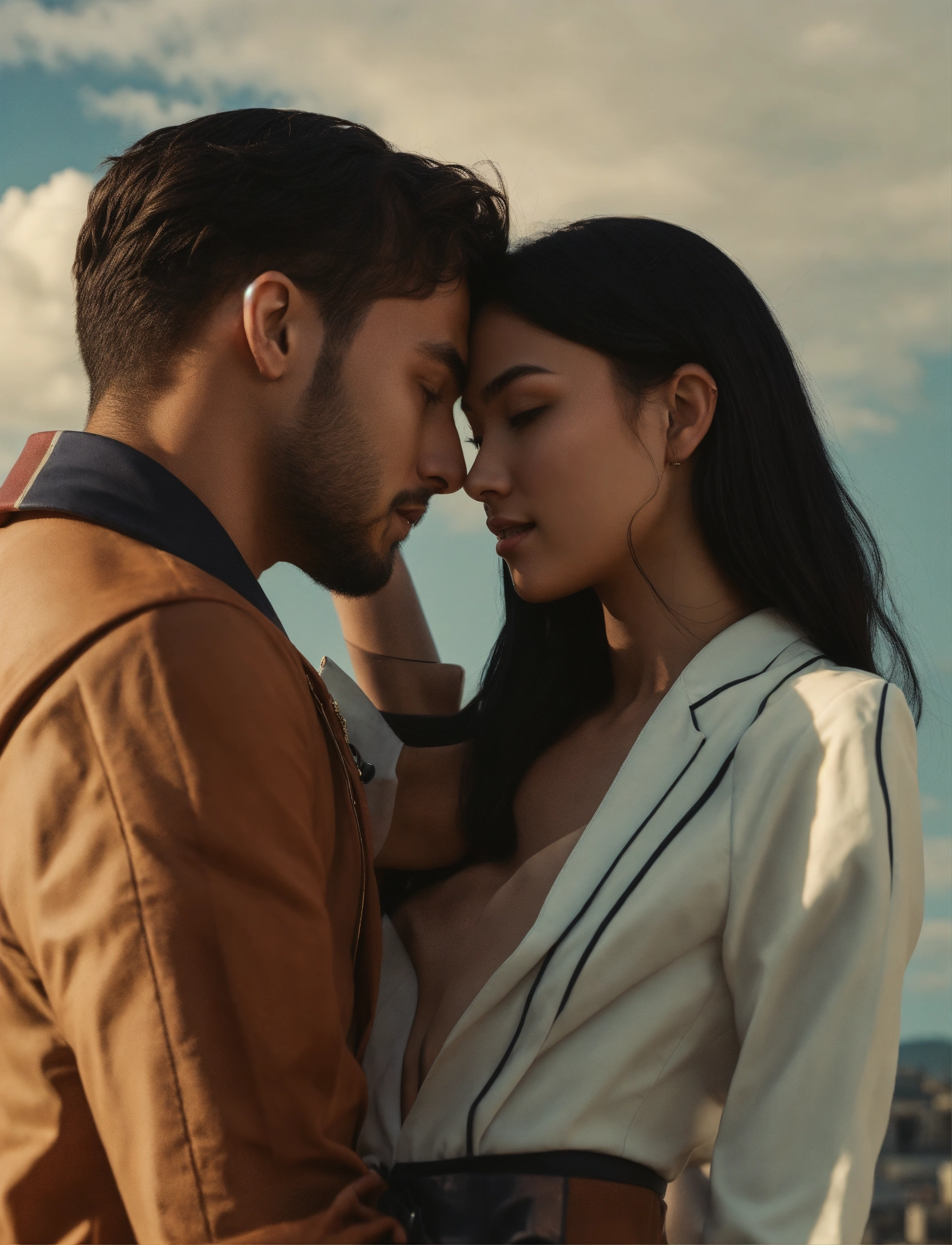 Girl and man lovers, full body, long shot, rich deep colors, 4k, futuristic, 2 contrasting sides, with a blue sky