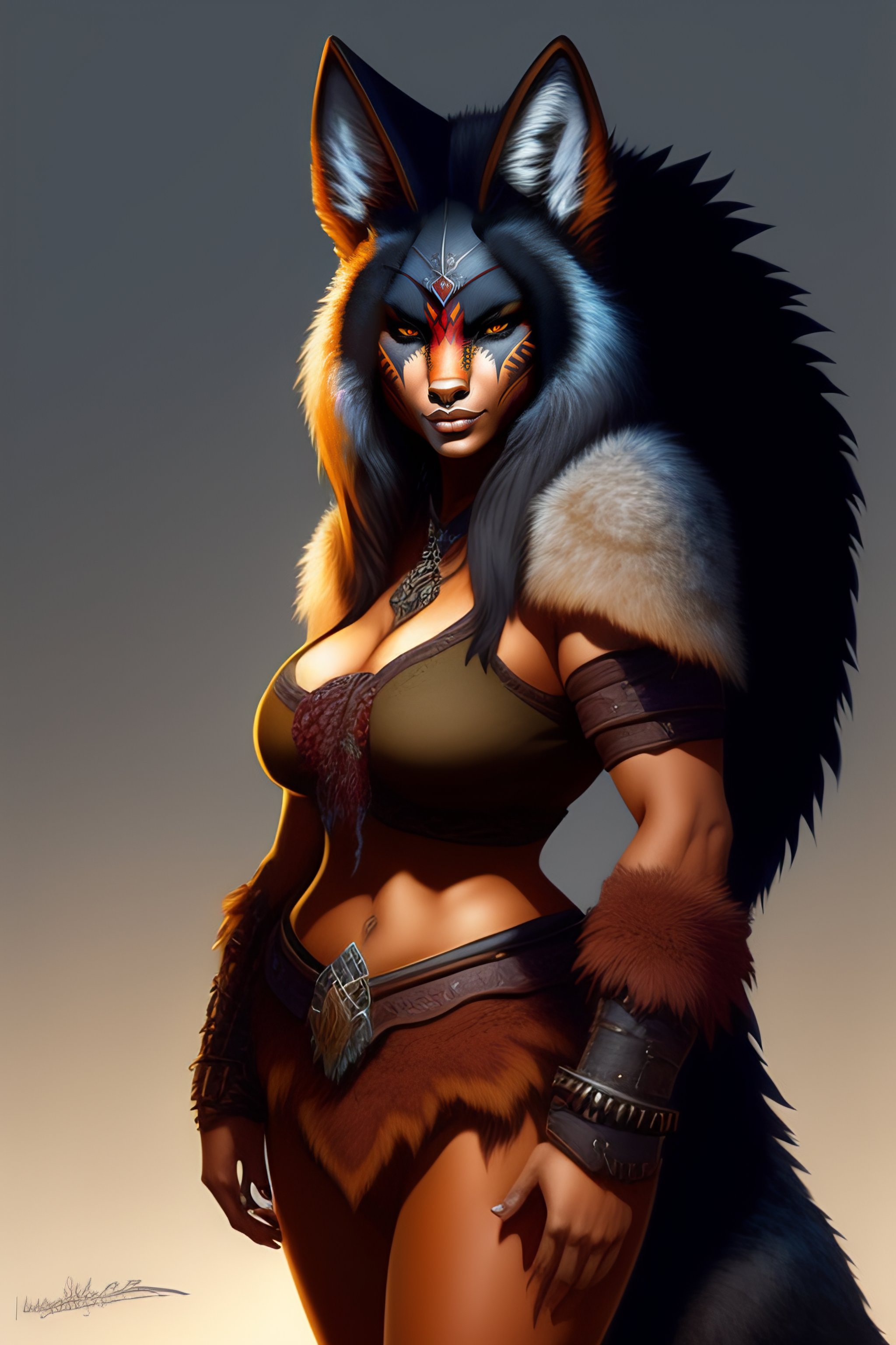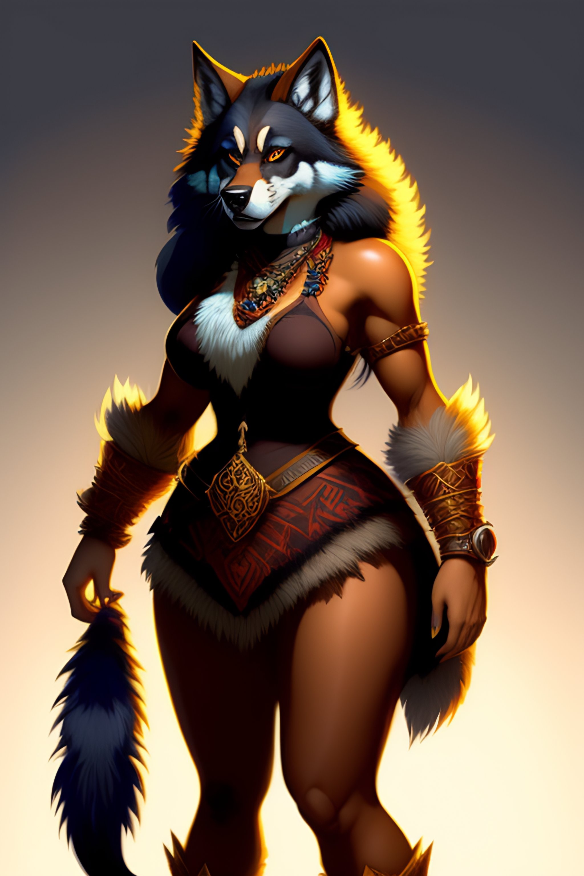 Wolf woman, werewolf, worgen, anthro furry cute, plus size, wide hips, wolf female tribal warrior, character design, fluffy, concept art, painted in the style of artists james gurney, chuck jones, balto