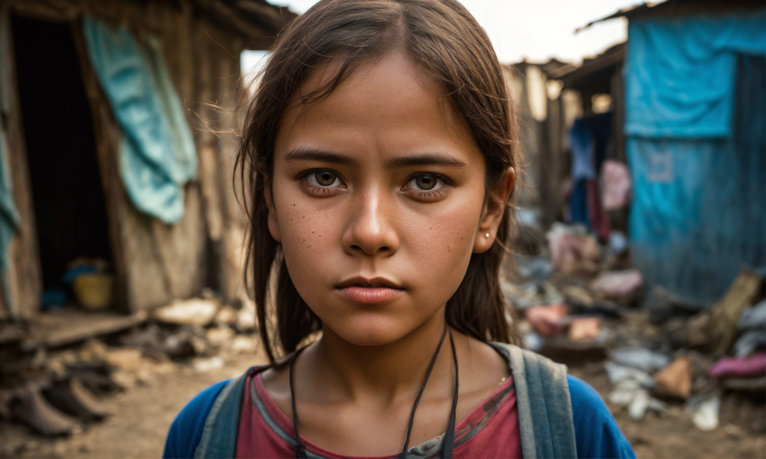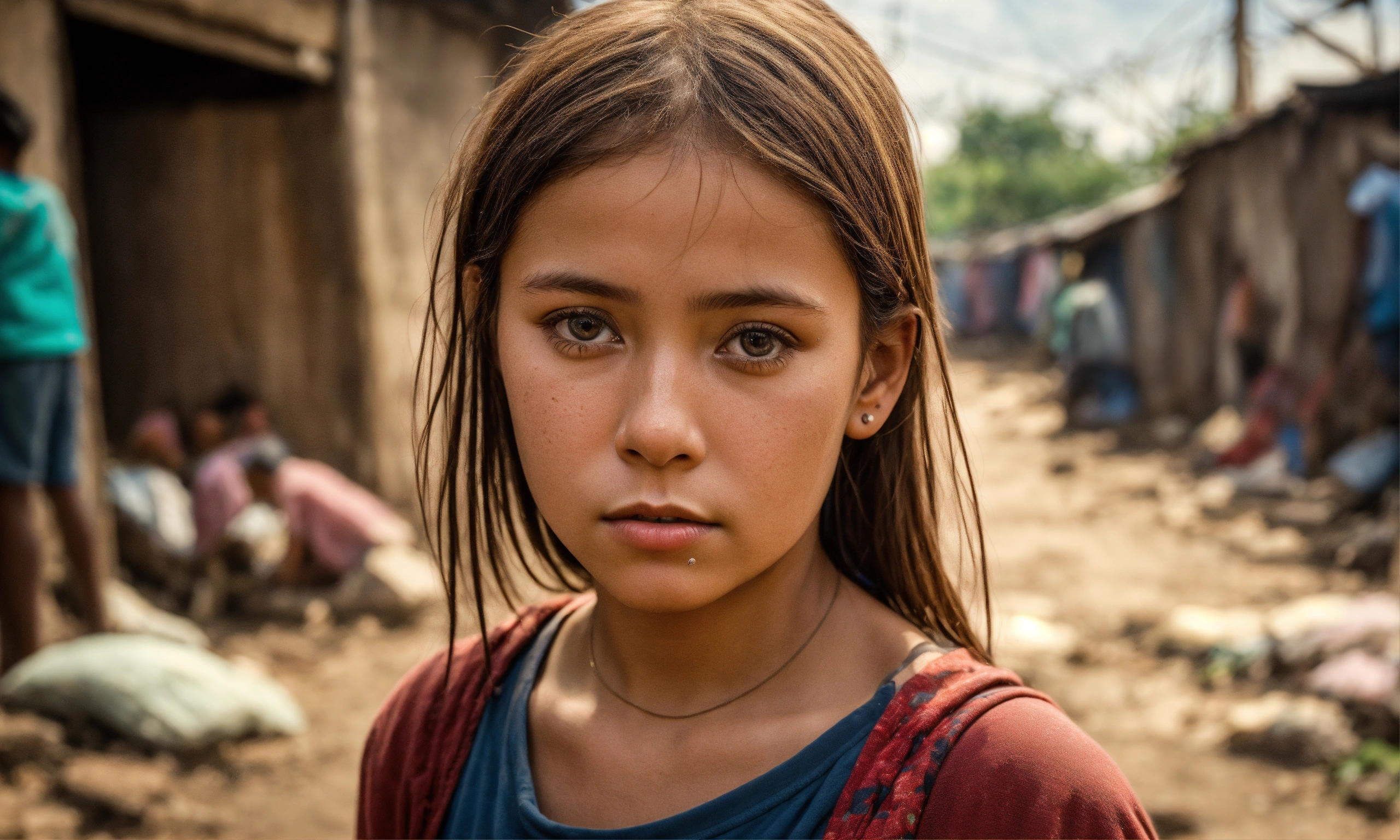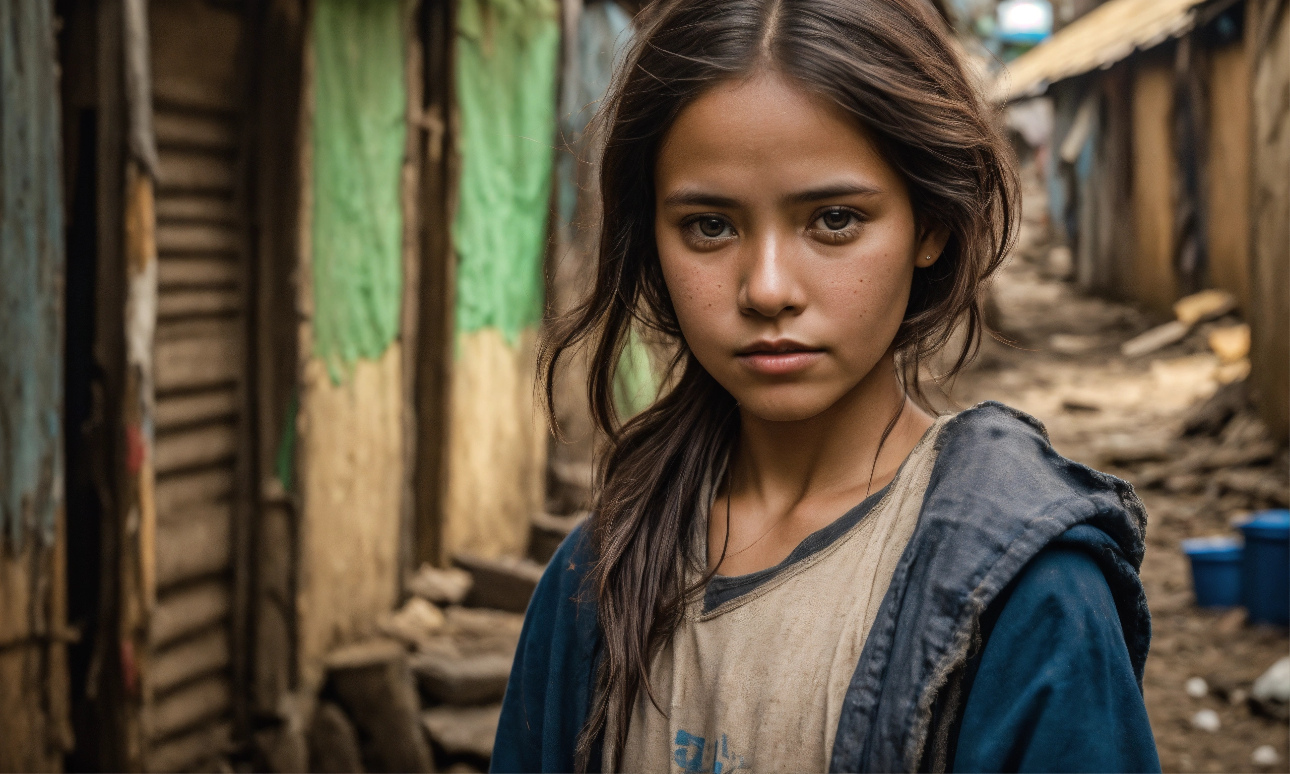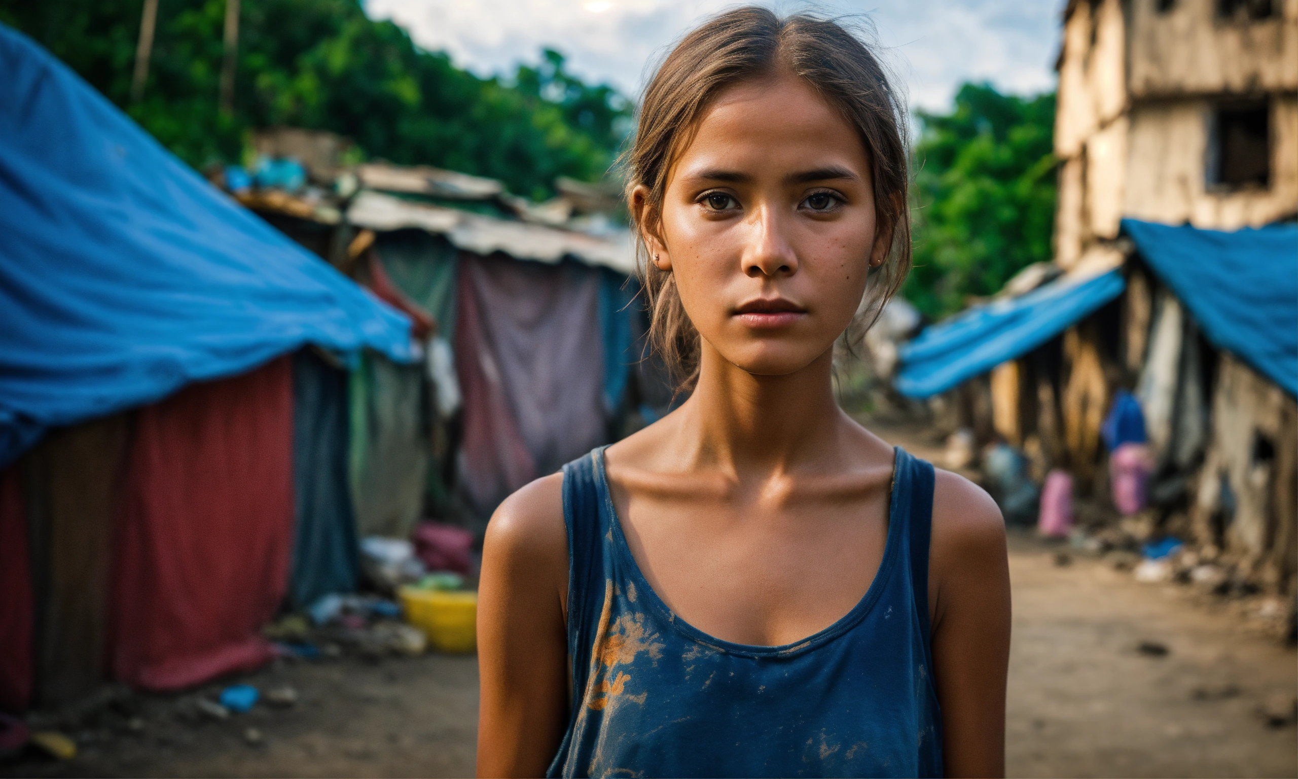 A photo portrait of a poor thin caucasian girl in a slum, front view, photorealistic, hyperrealist, hdr, ultra resolution, perfection, super-resolution, gigapixel, nikon d850, sigma 28mm f/1.4