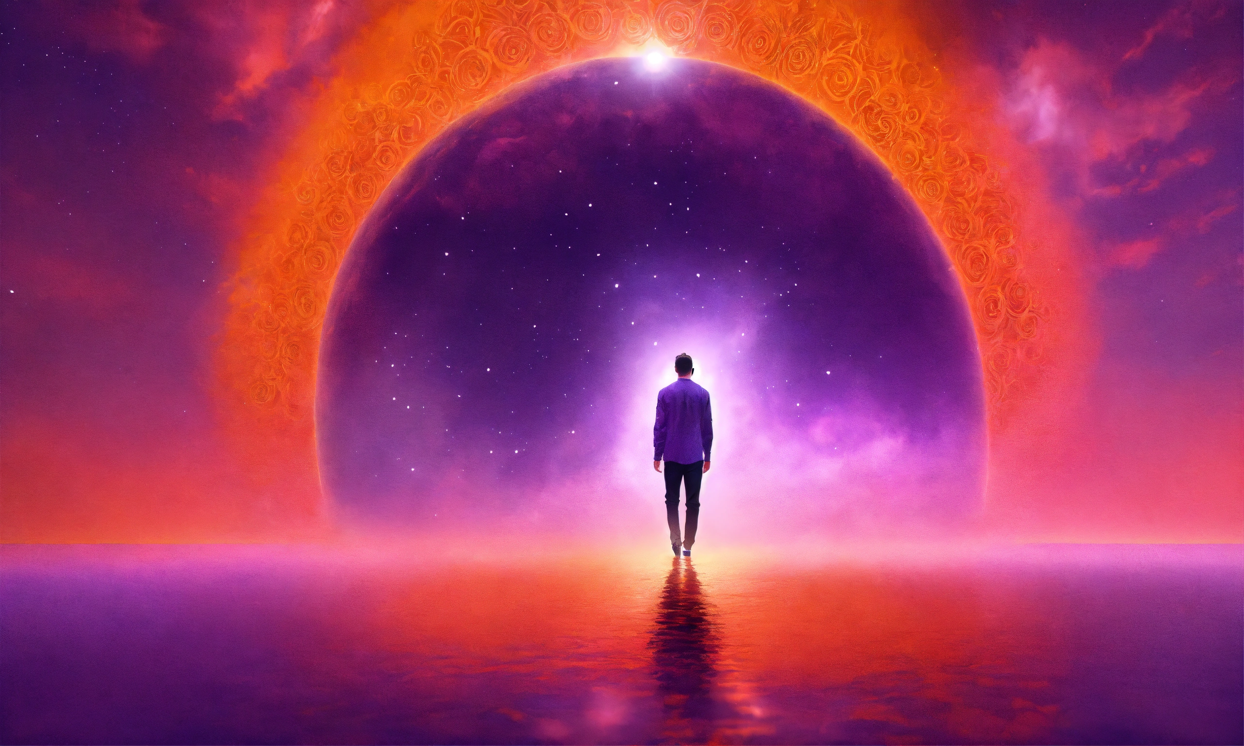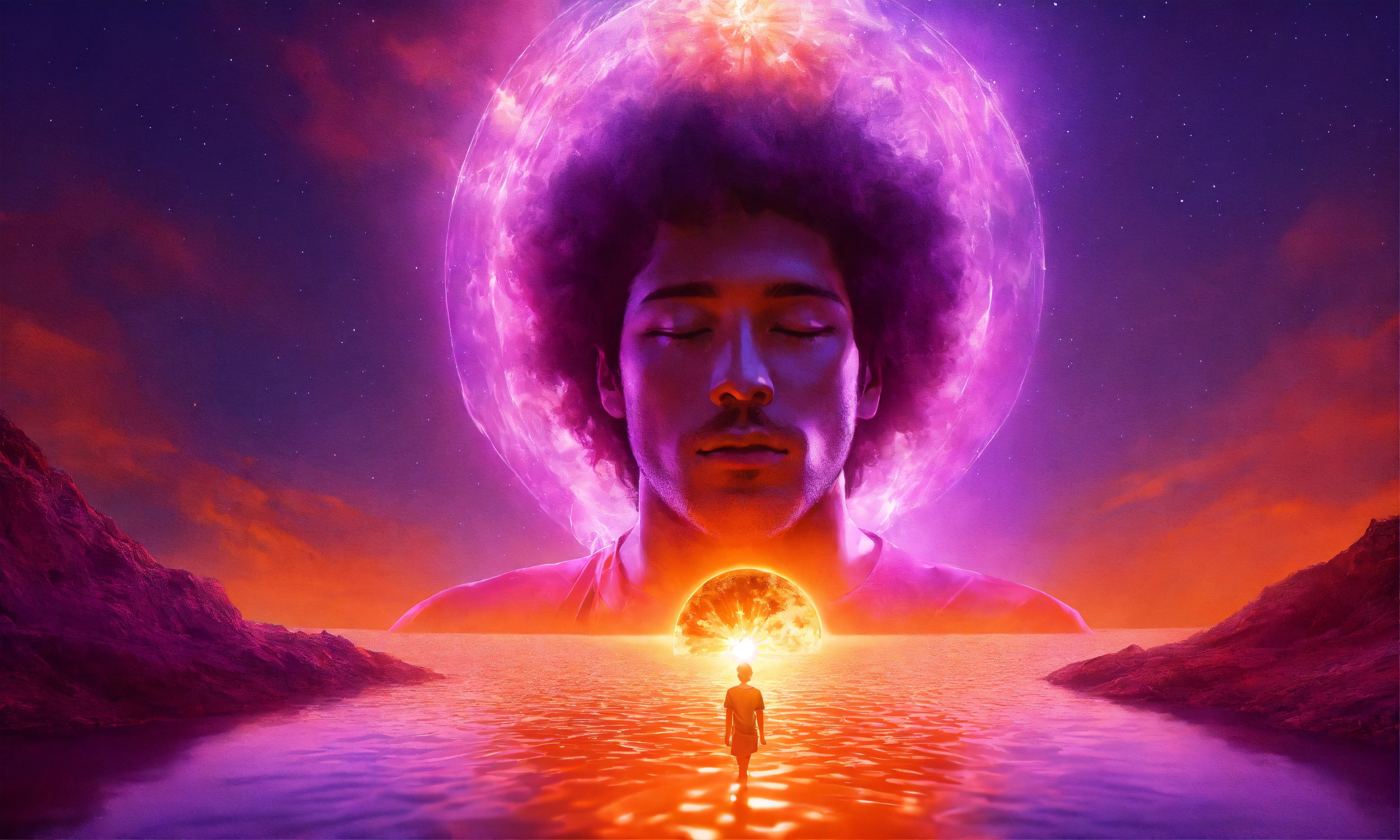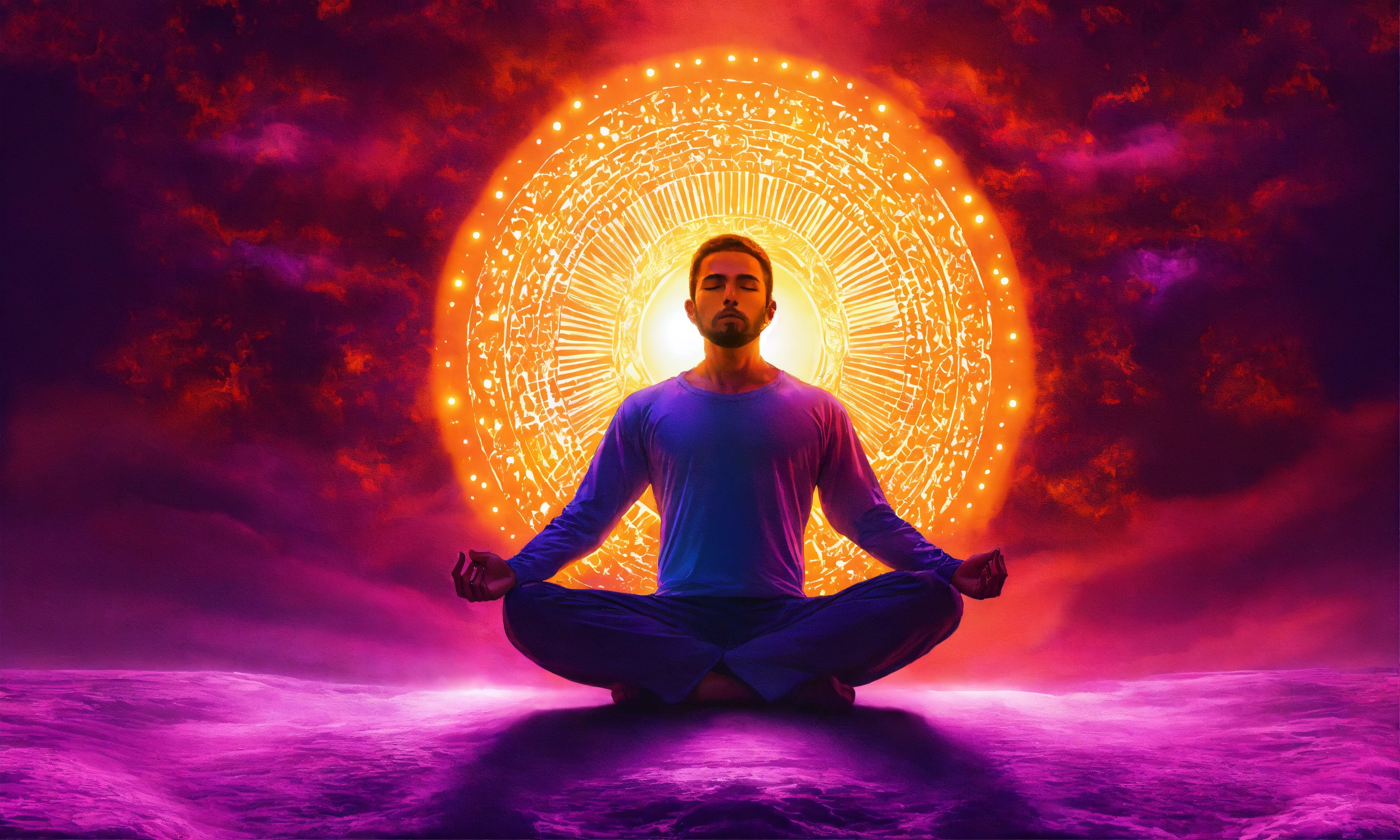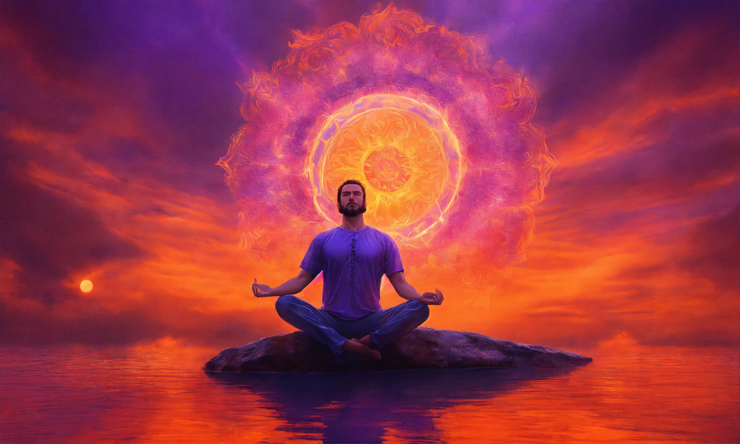Man shirt on, meditation, man floating, sun, aura, 4k, photo realistic, purple haze, psychedelic colours, bright orange haze around man