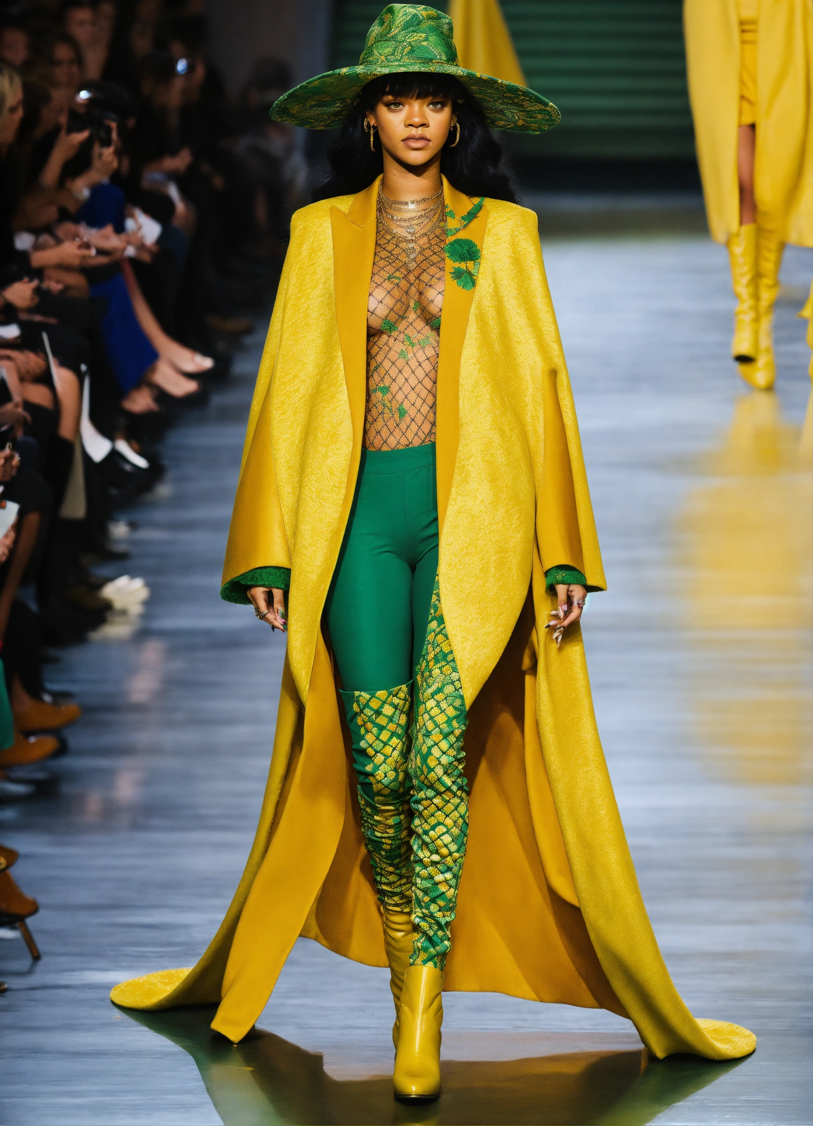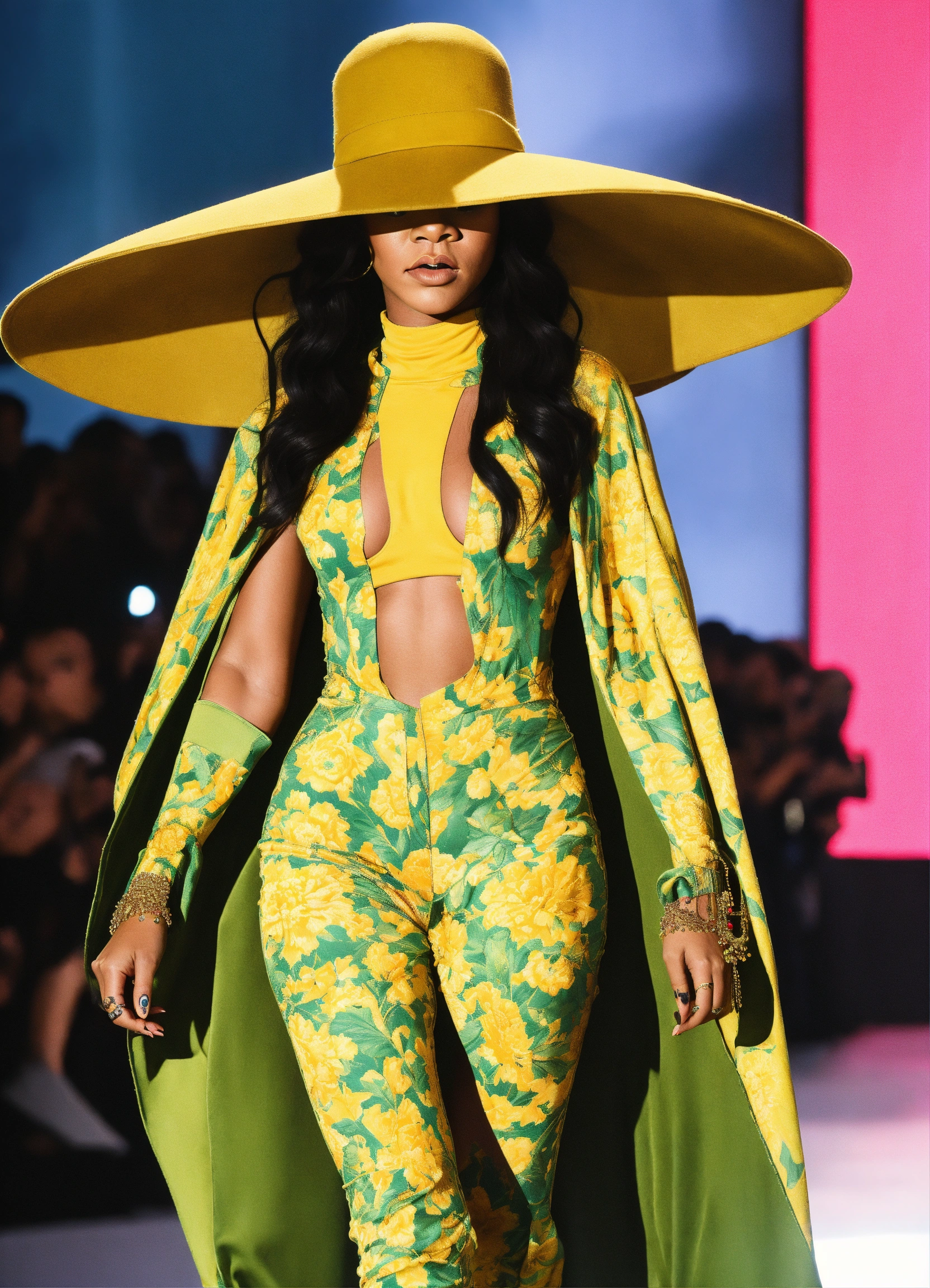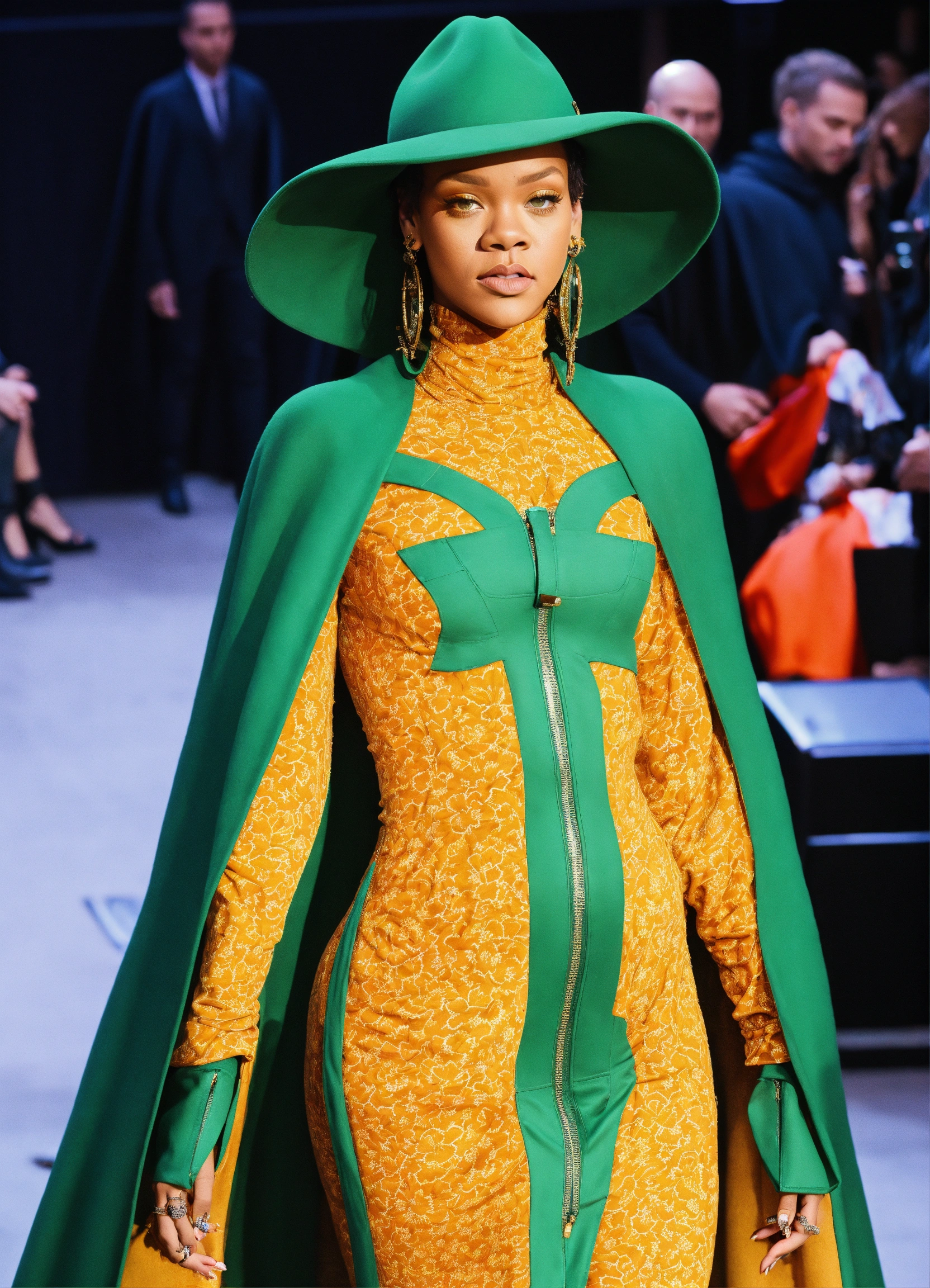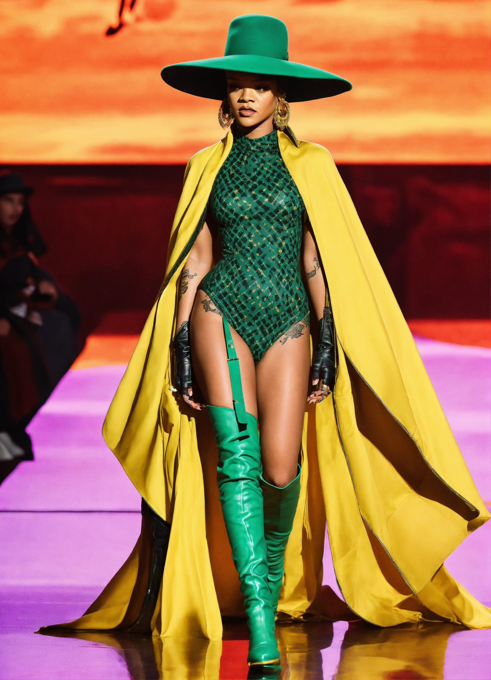 Rihanna marigold and green patterned bodysuit with a matching oversized hat, floating cape and over-the-knee boots.
