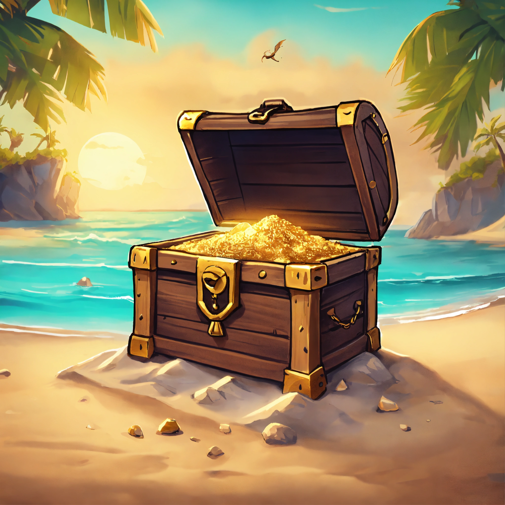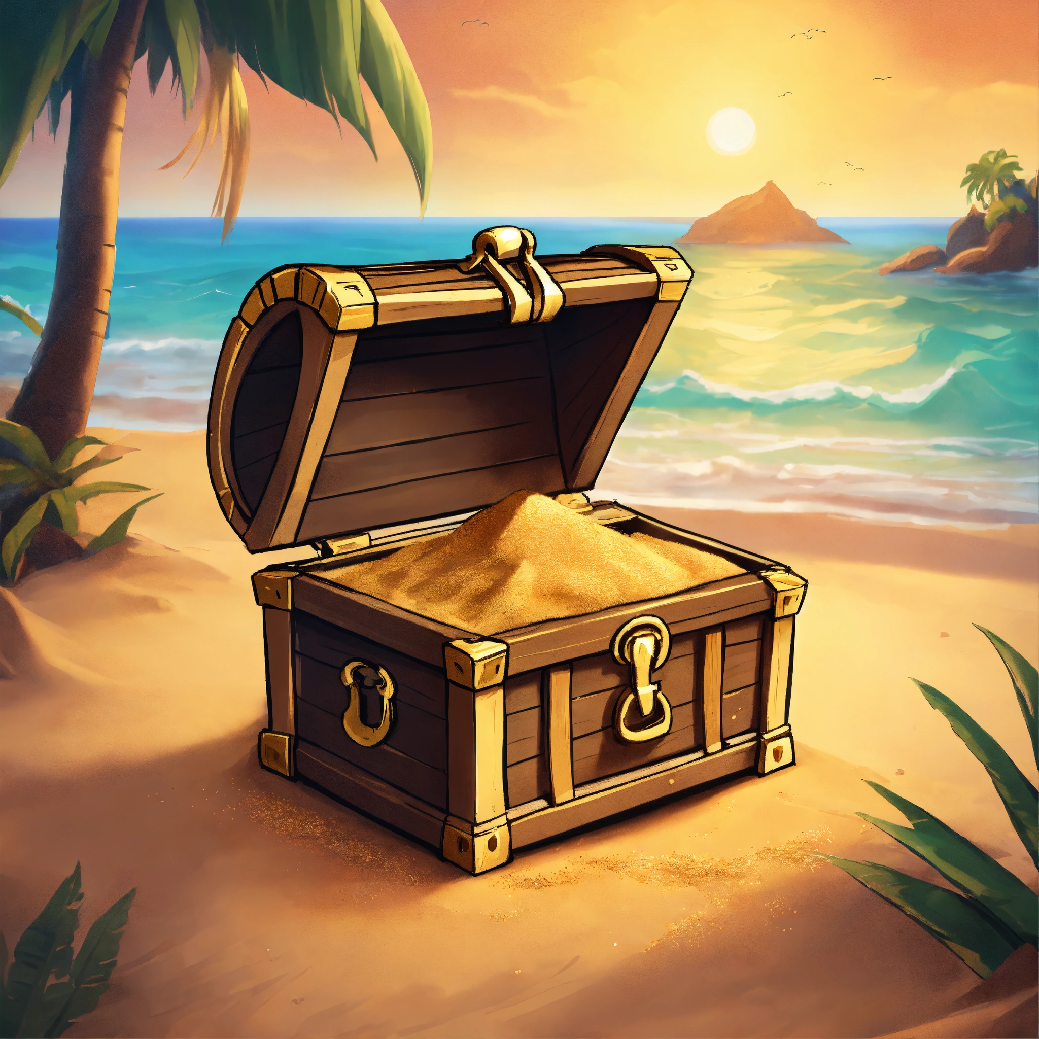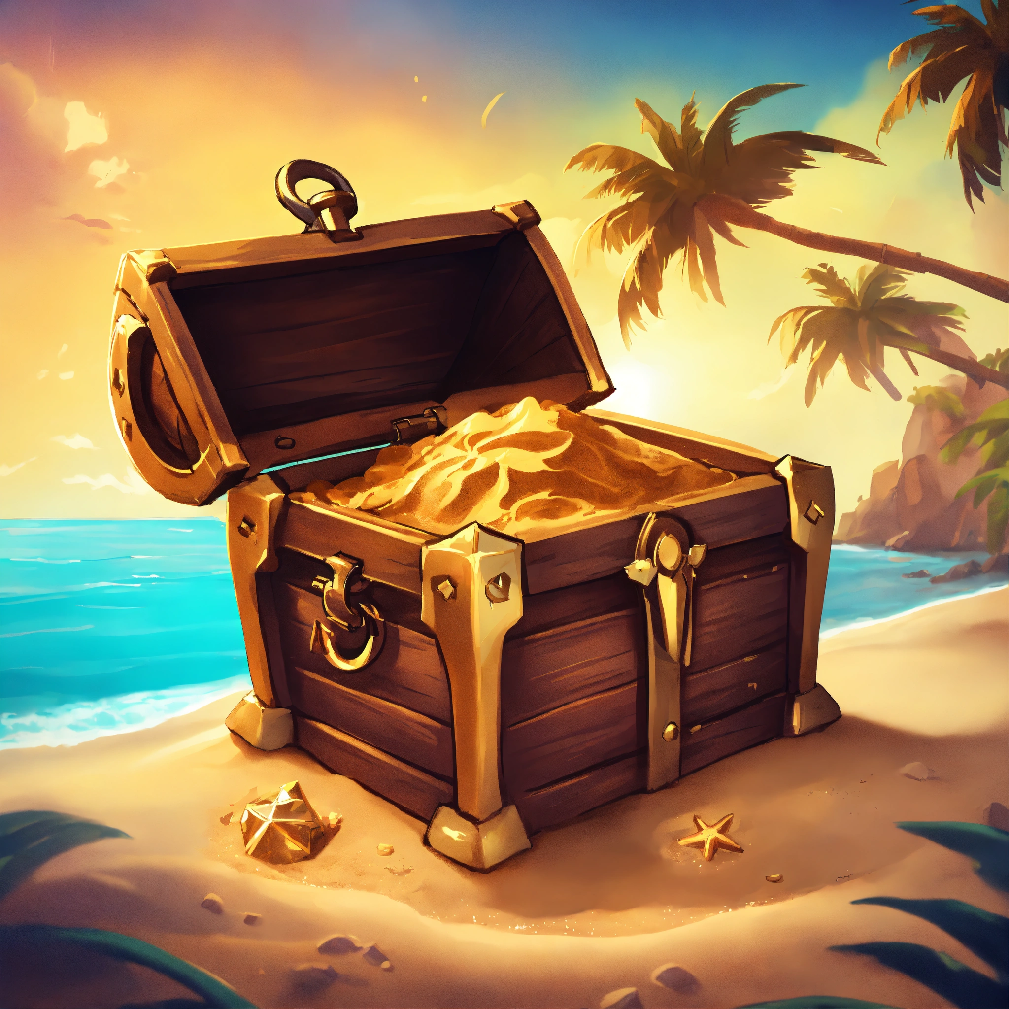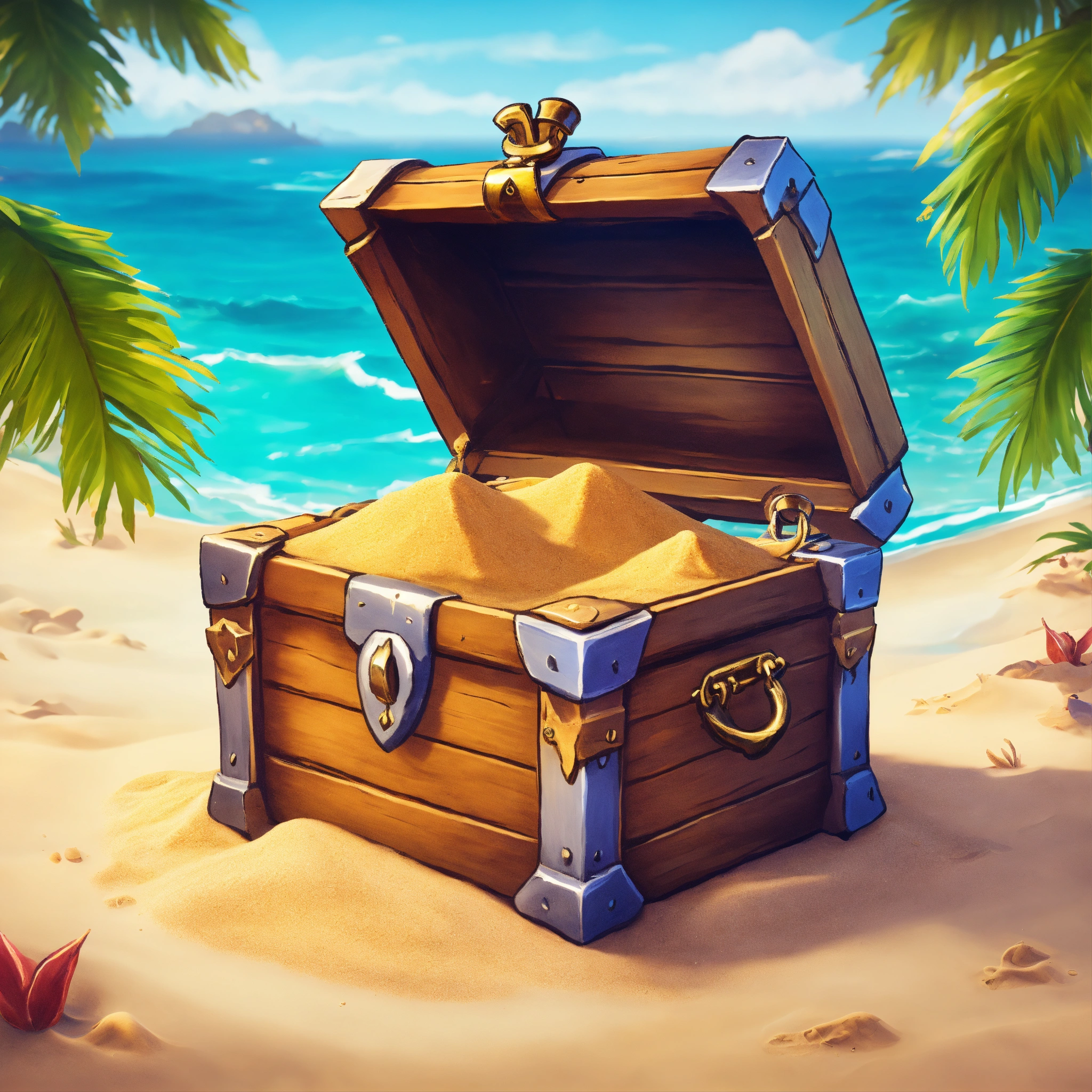 Treasure chest half in the sand, on the background beach and palm, detailed hand illustration rendered in sea of thieves game style, cute cartoon style