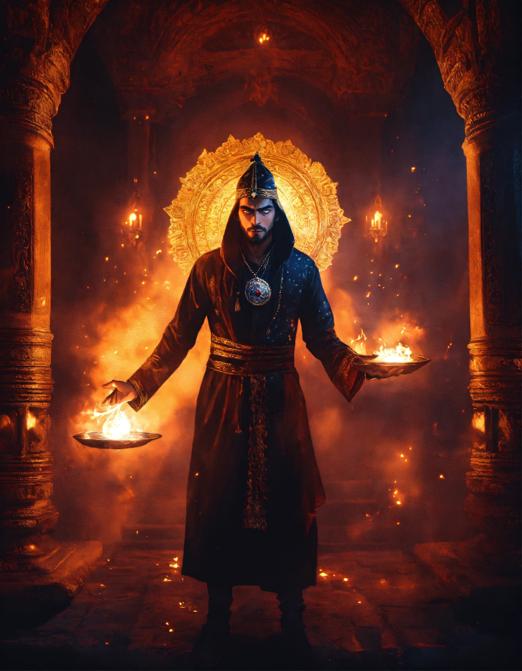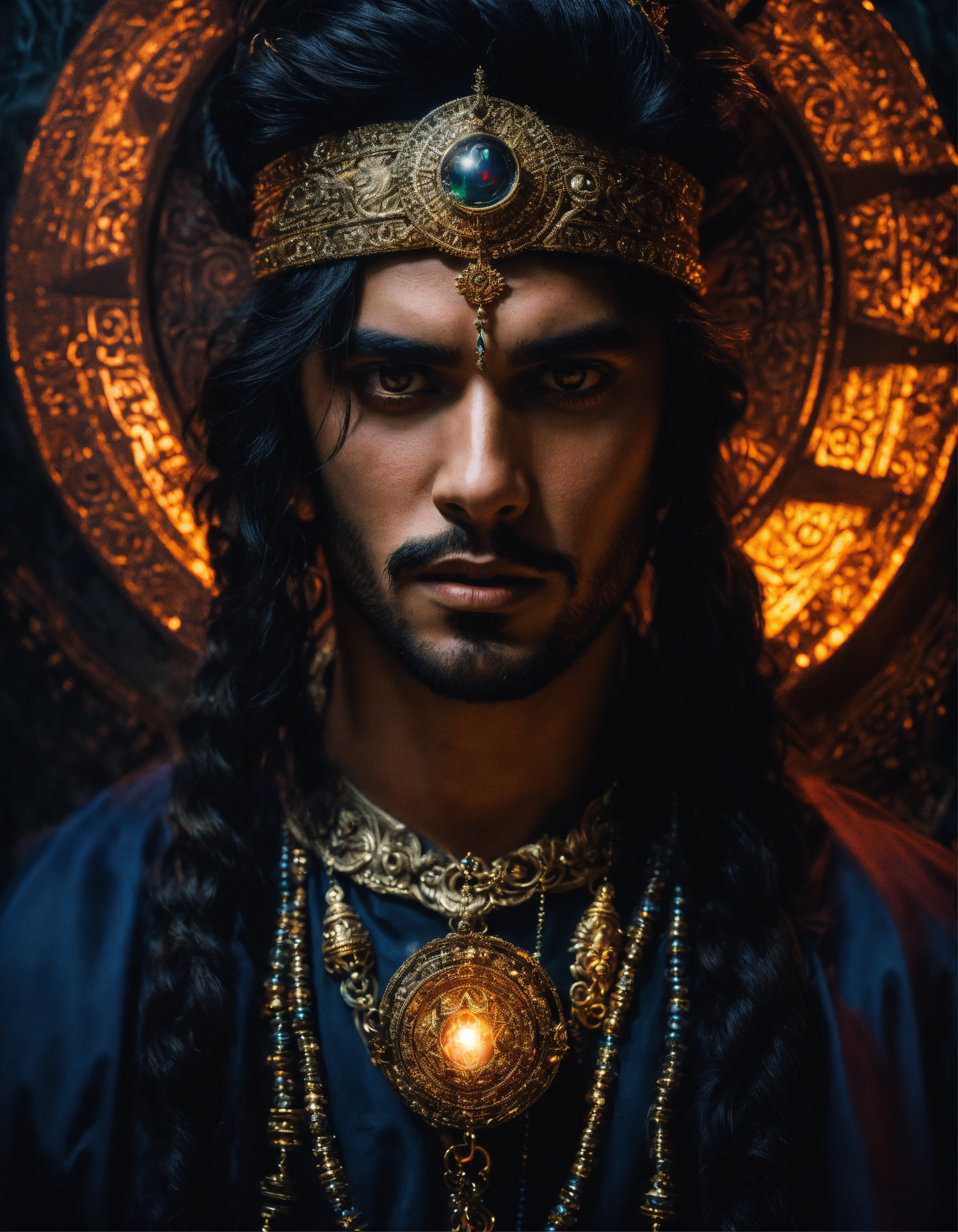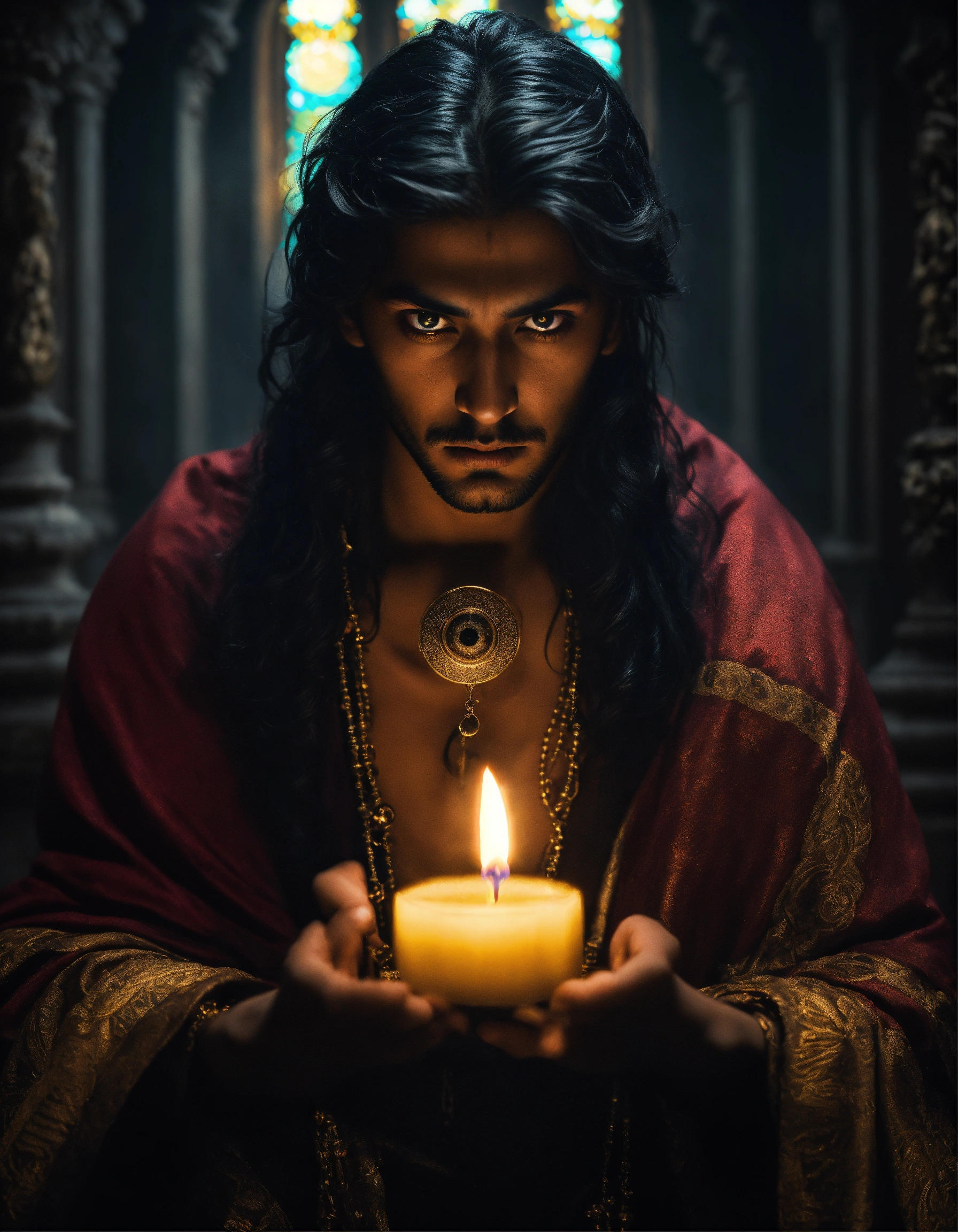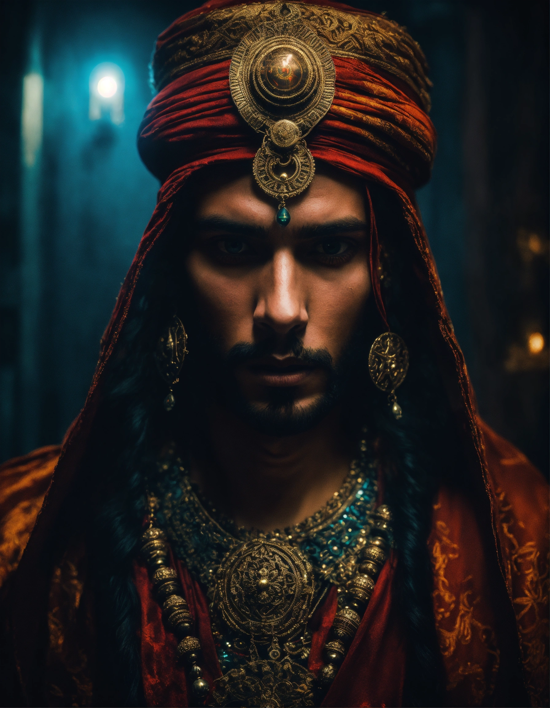 Dramatic portrait of a young handsome, wicked indian sorcerer conjuring dark magic with hypnotic glowing eyes, ominous palace, mysterious, shadowy.