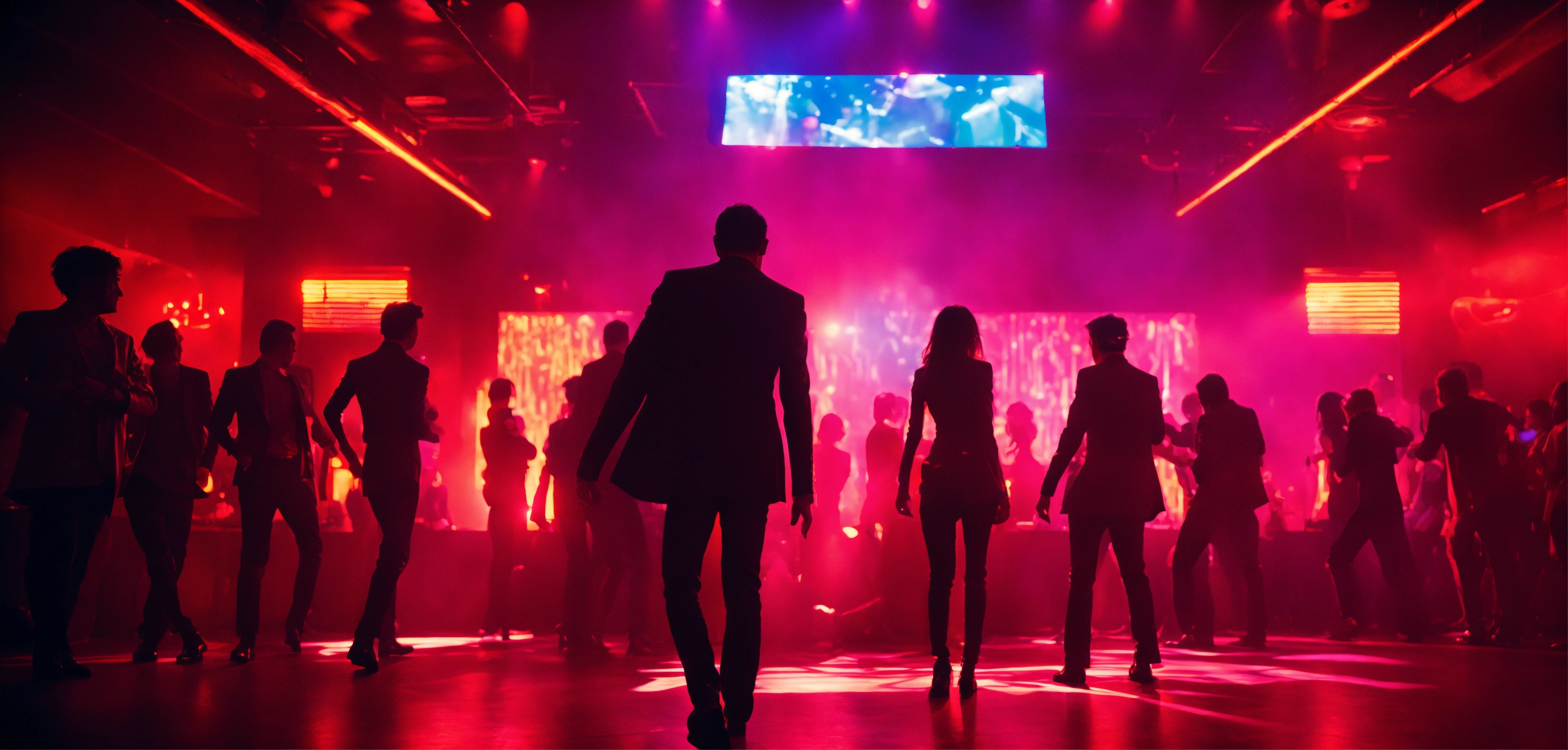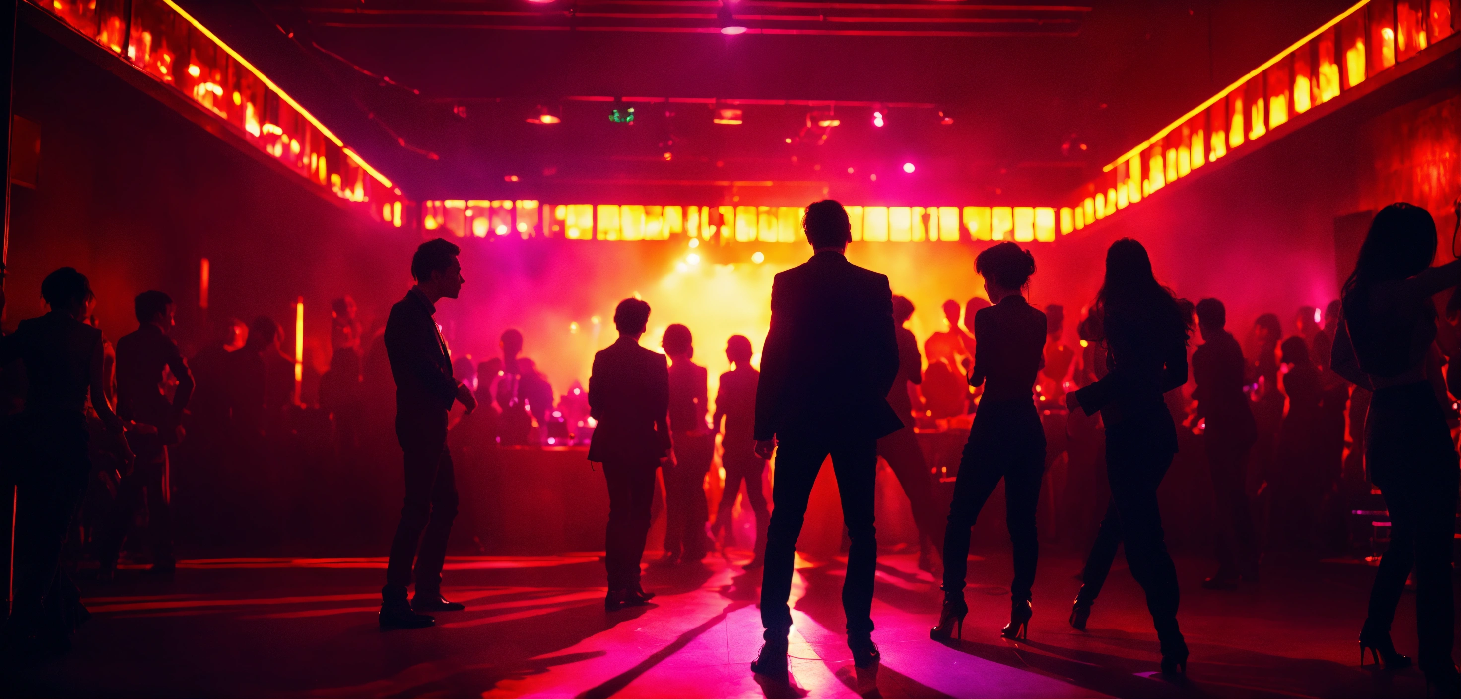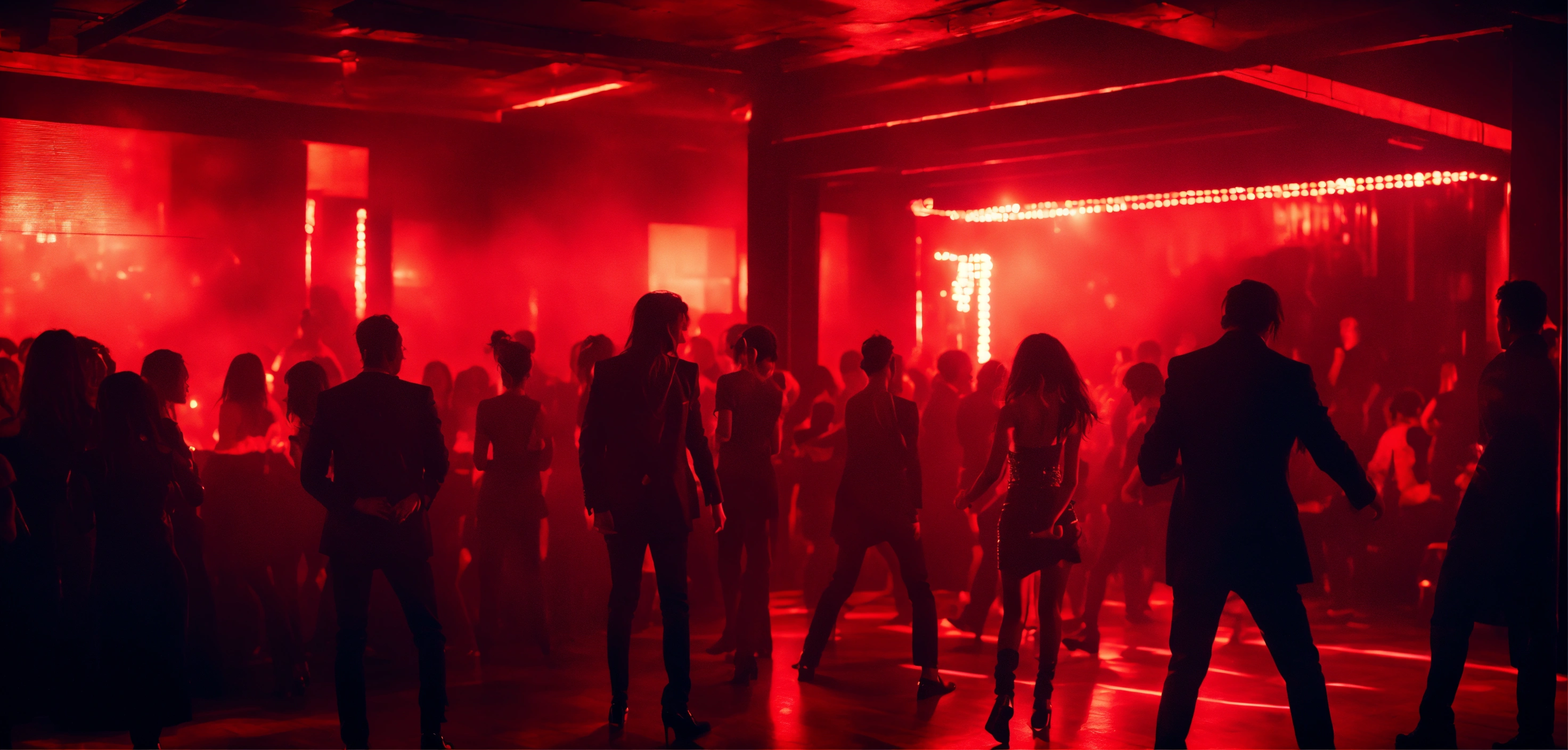 Cinematic look, backlit, haze, dark urban city night club hall, small disco, red lights, dim light, people dancing, underworld vampire movie style