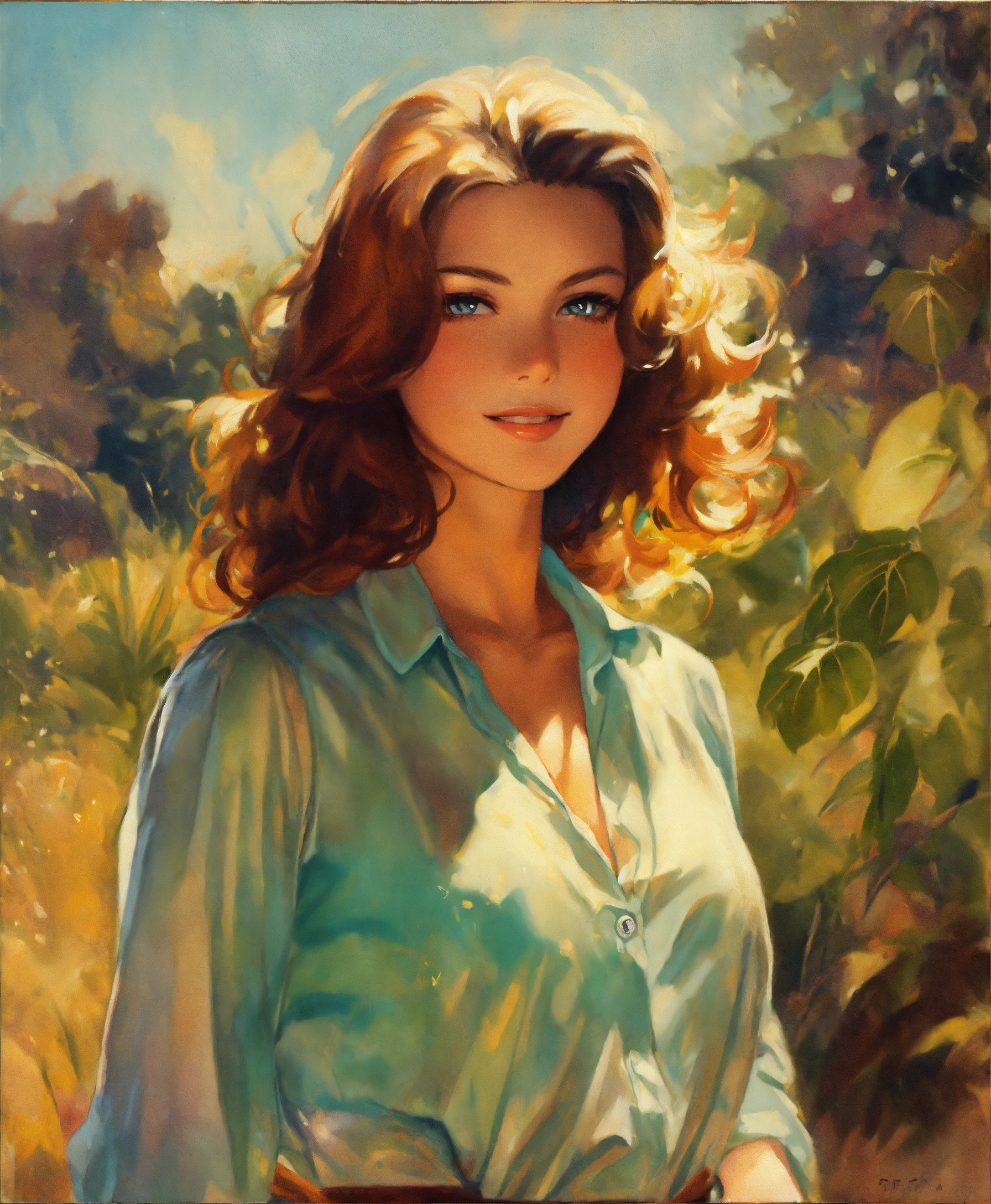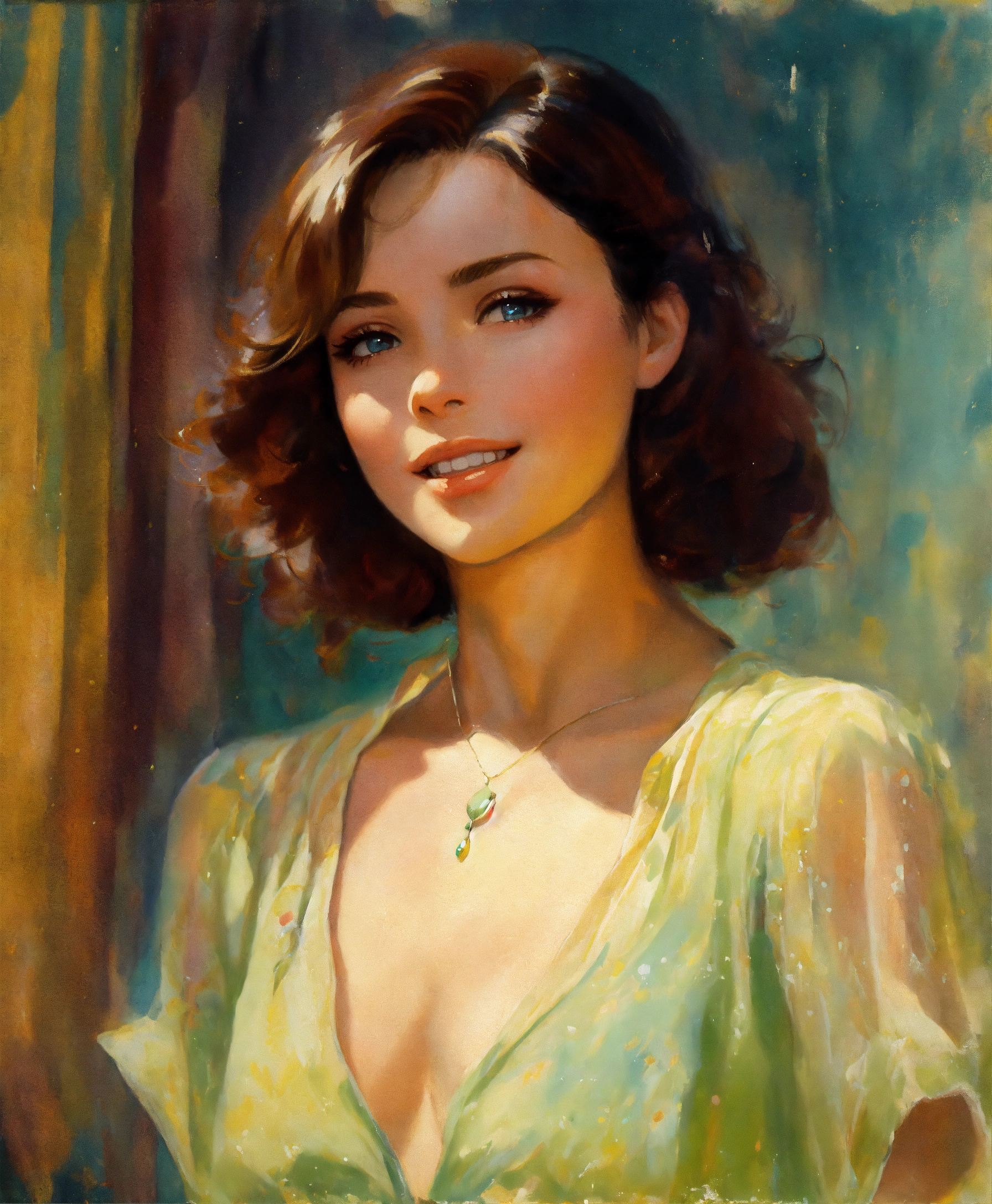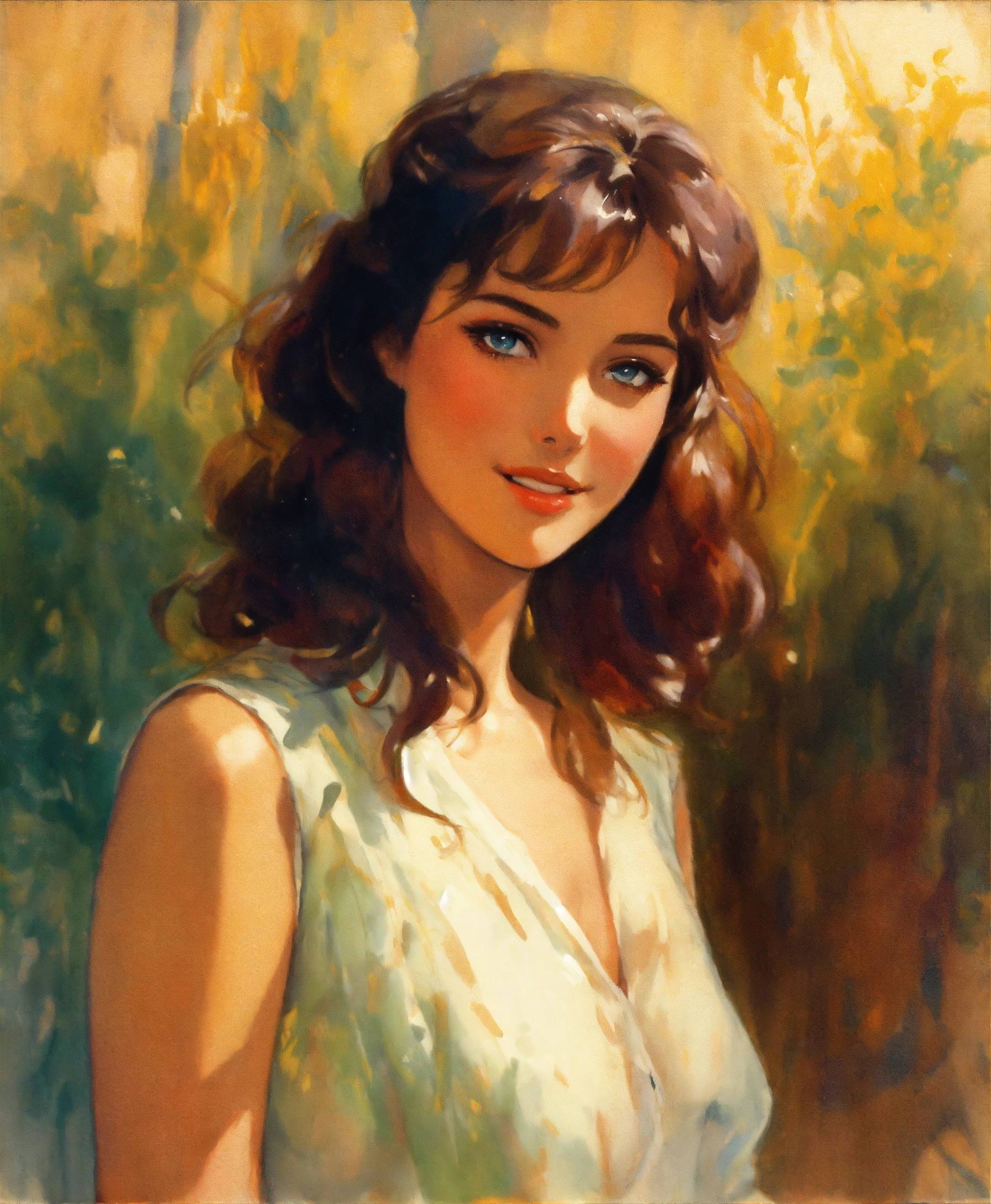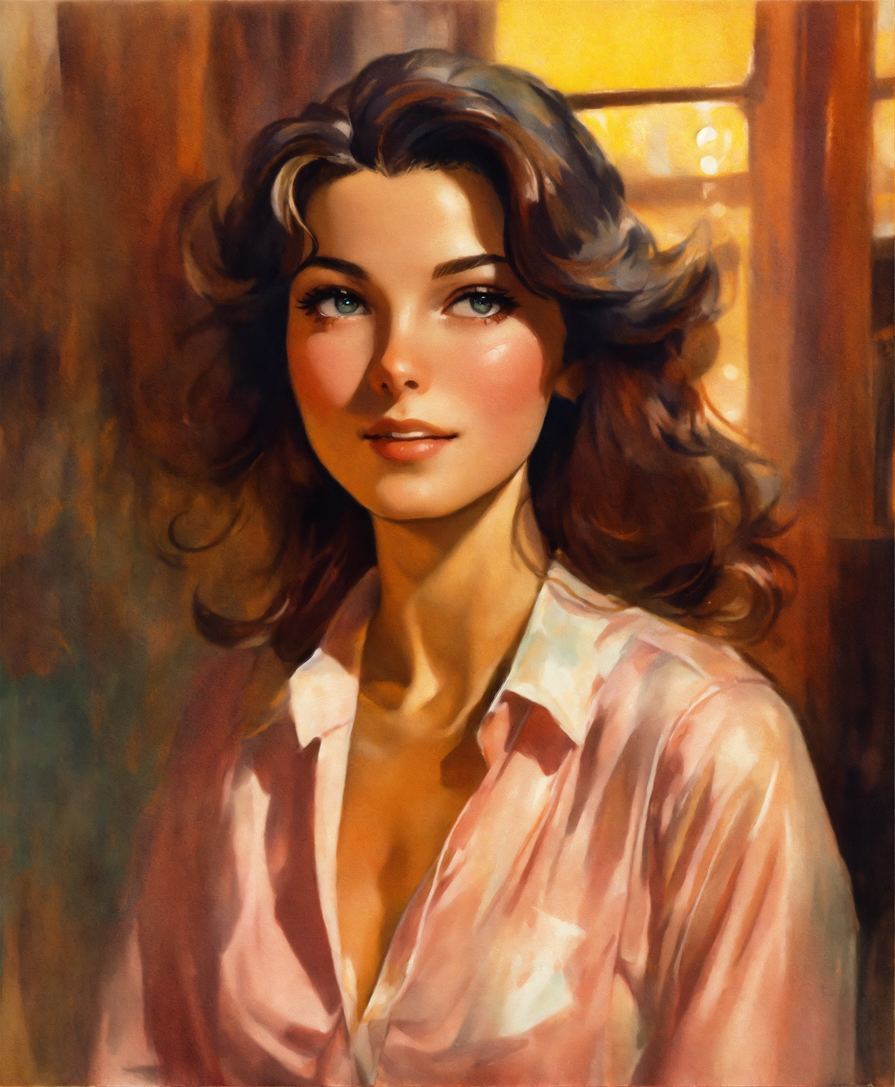 Pulp artwork, color illustration, young woman innocent sweet smile, dreamy eyes, wearing blouse of delicate thin wet fabric, waist up portrait