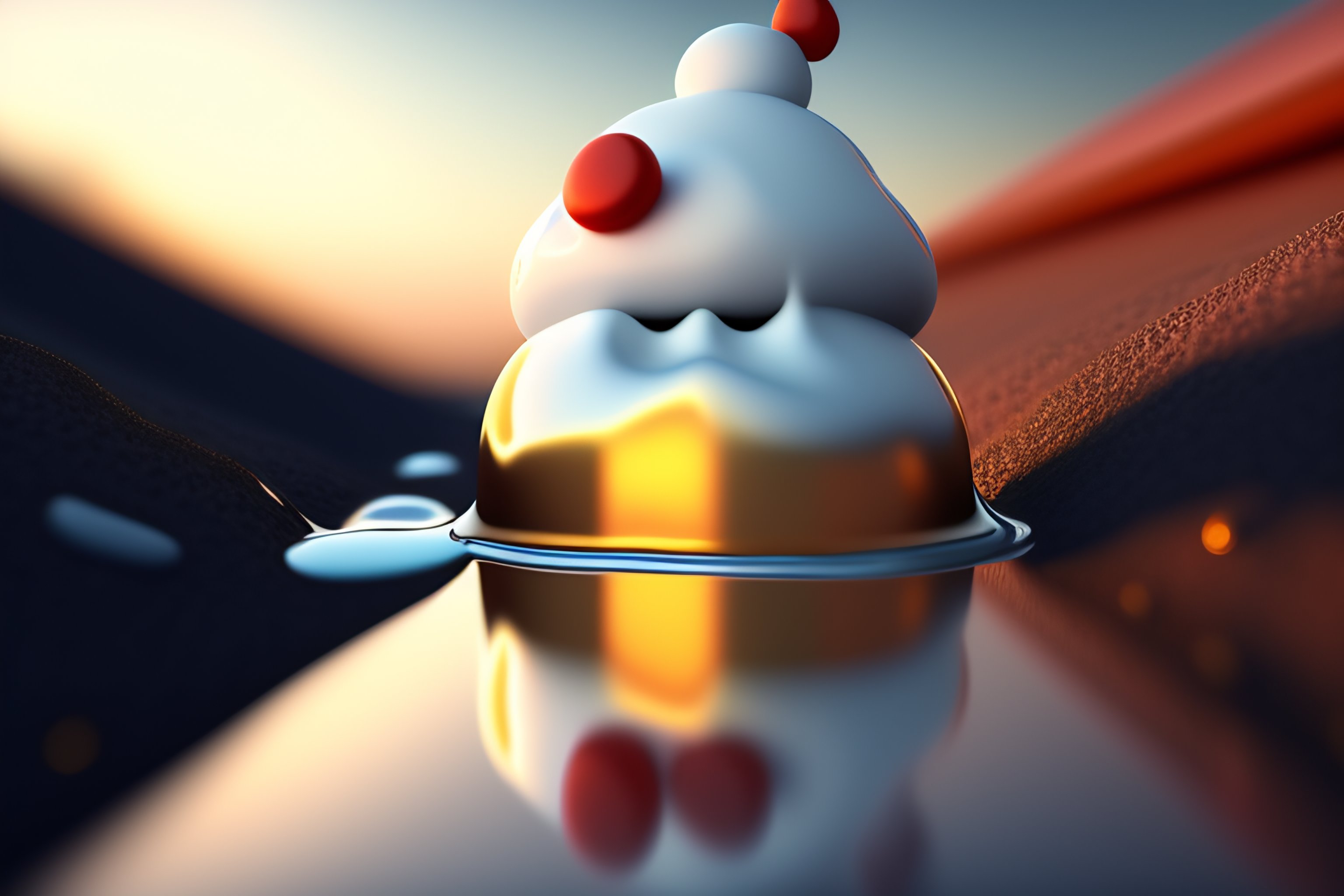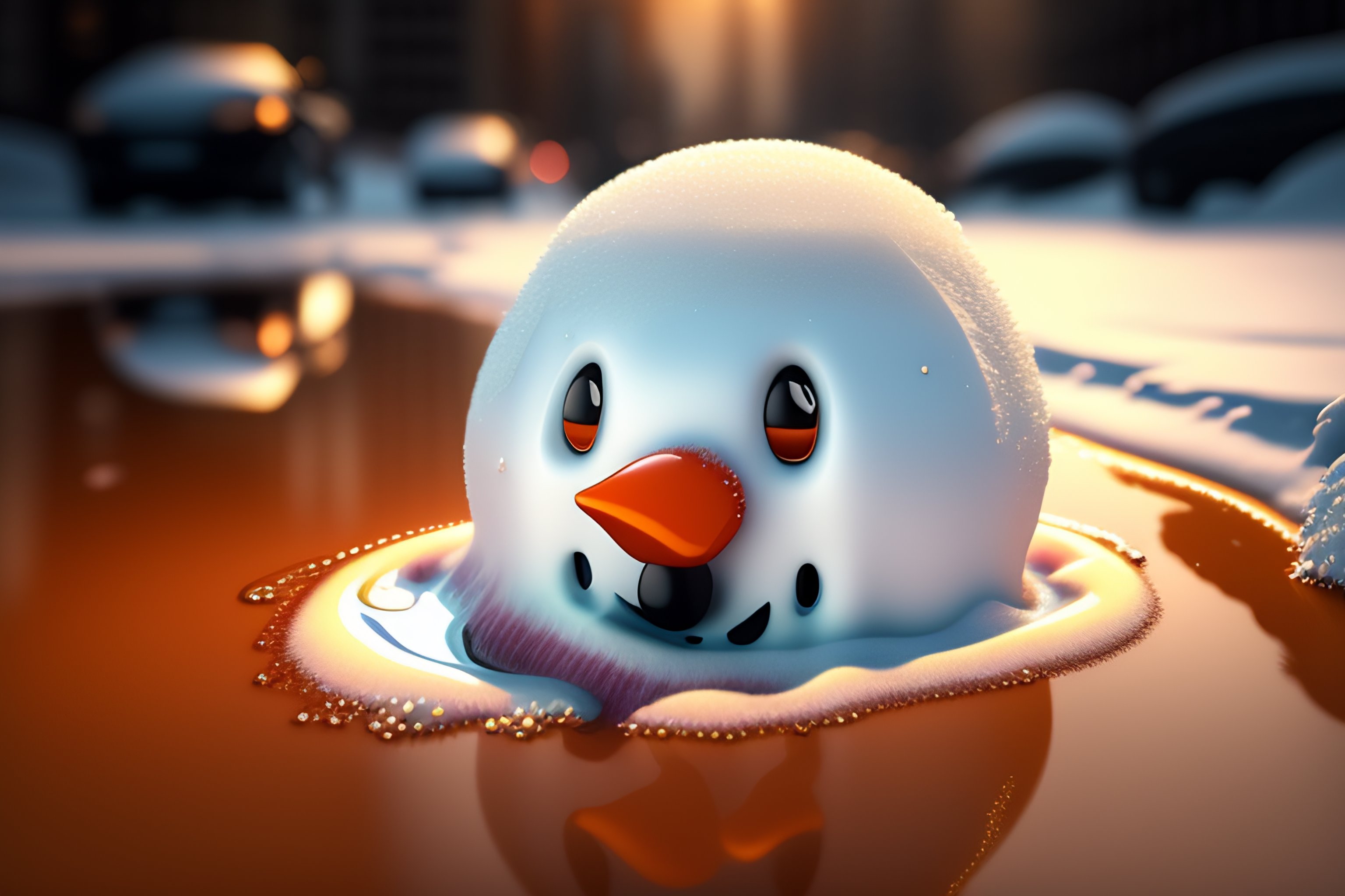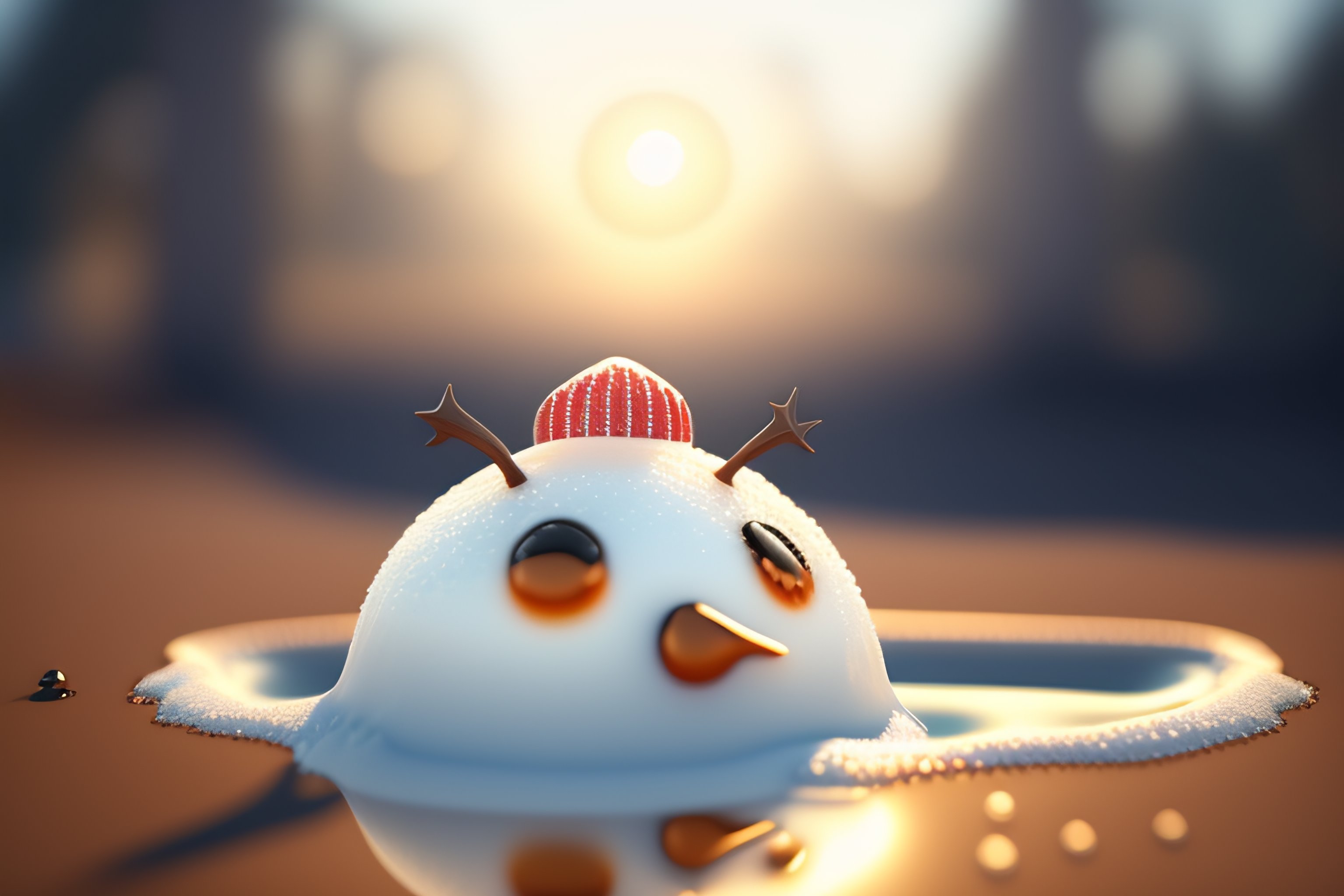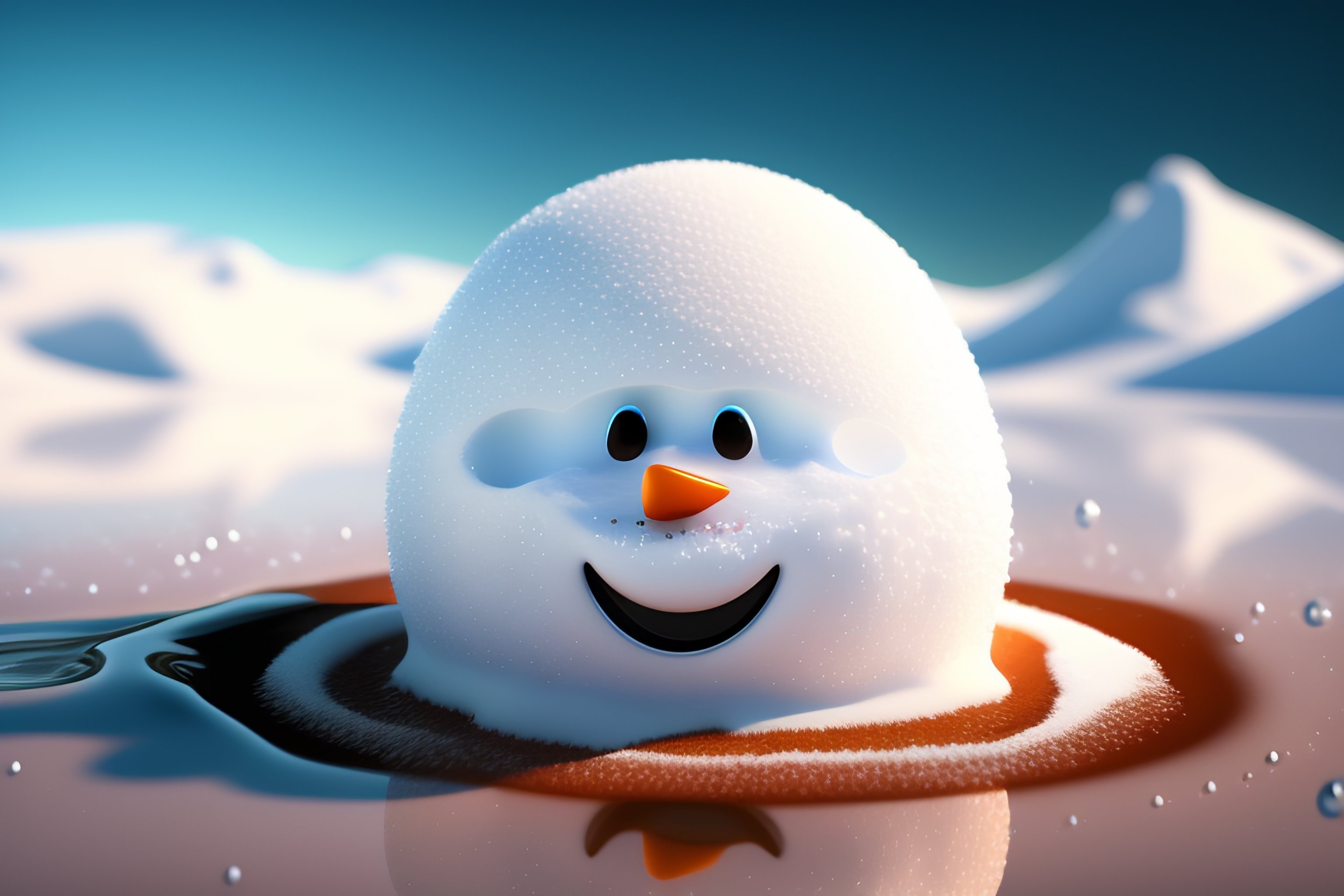 Frowning sad melting snowman under the sun, mostly a puddle, miserable, 3d render, hyper realistic, highly detailed, digital illustration
