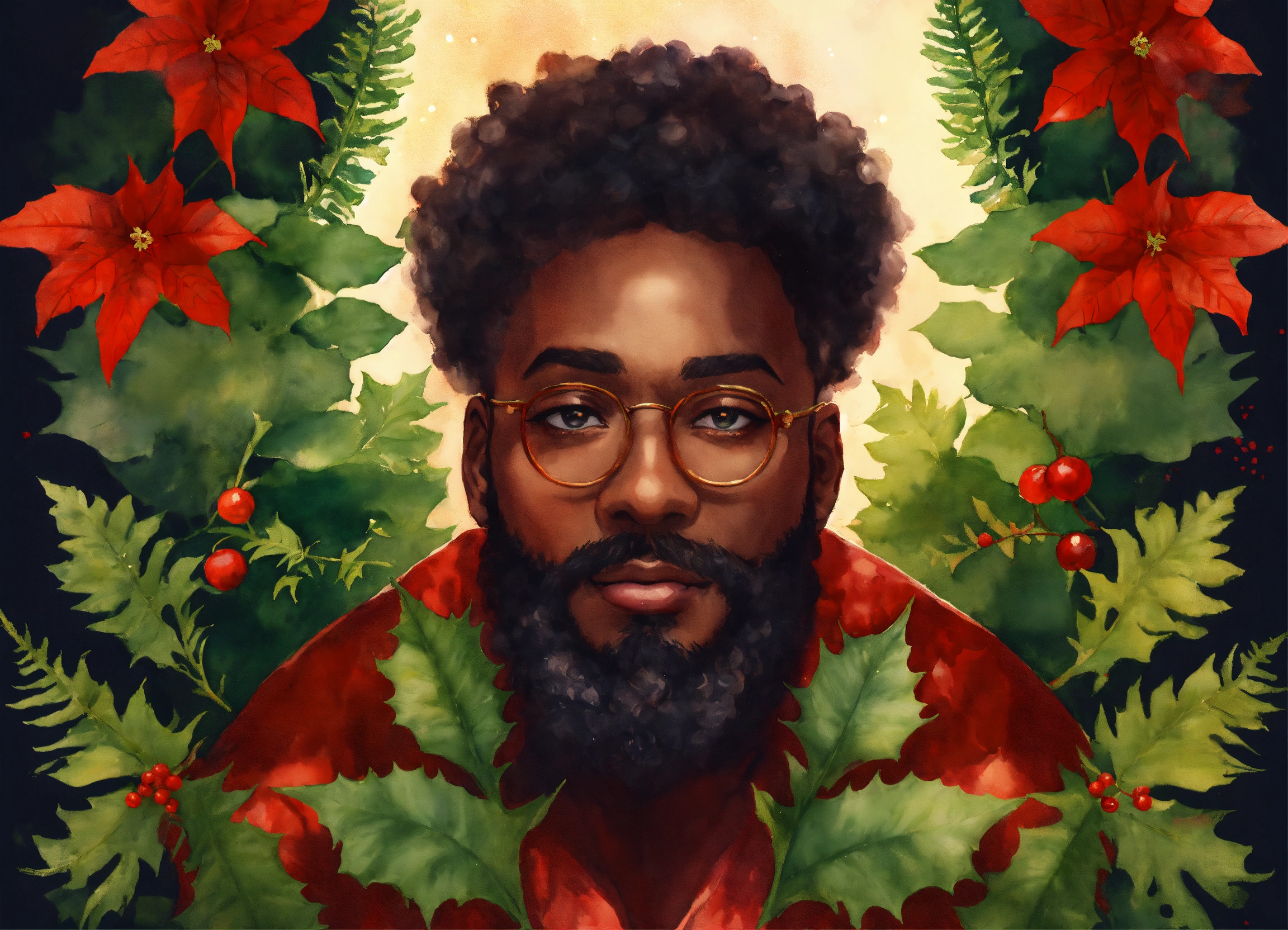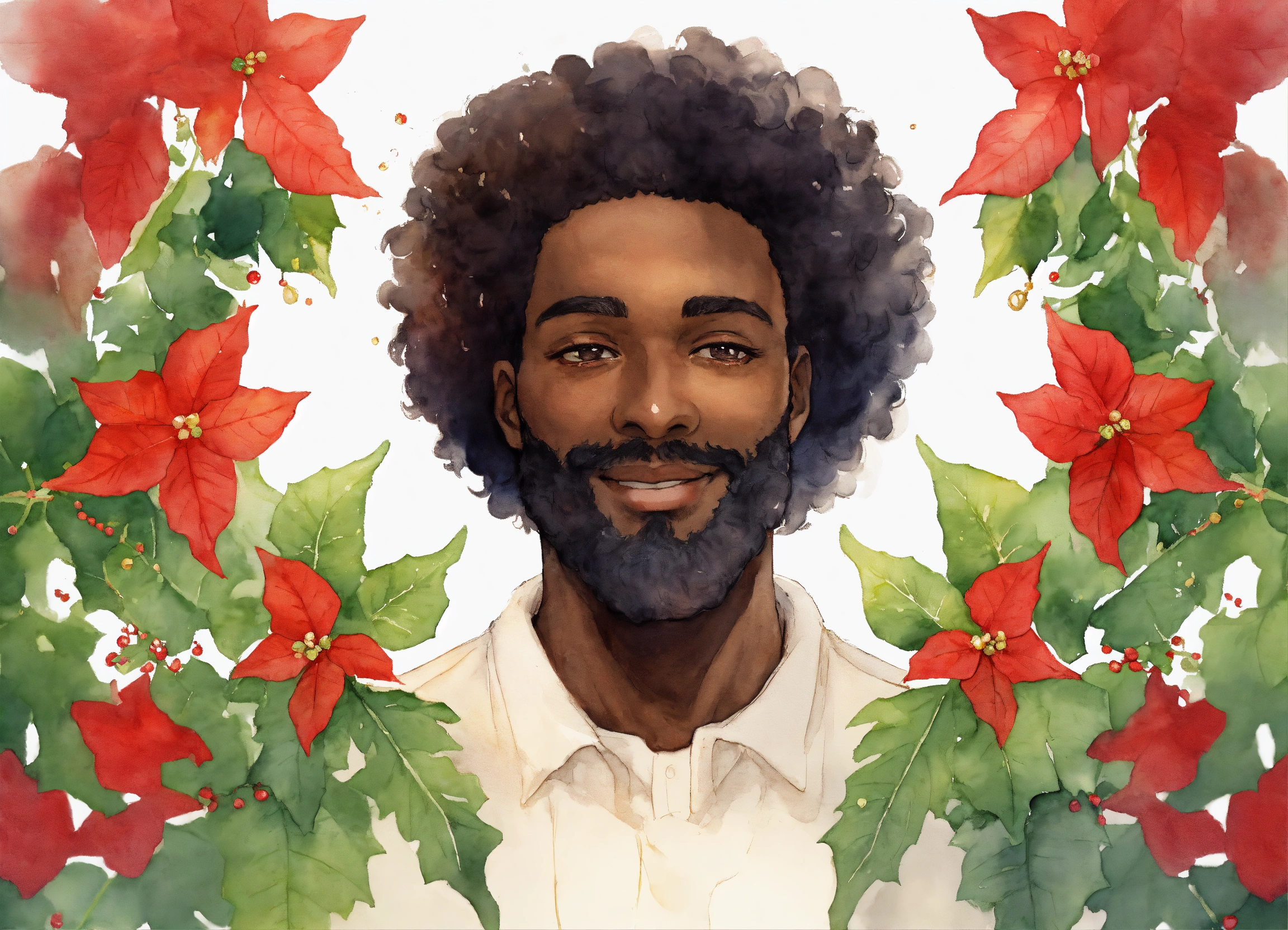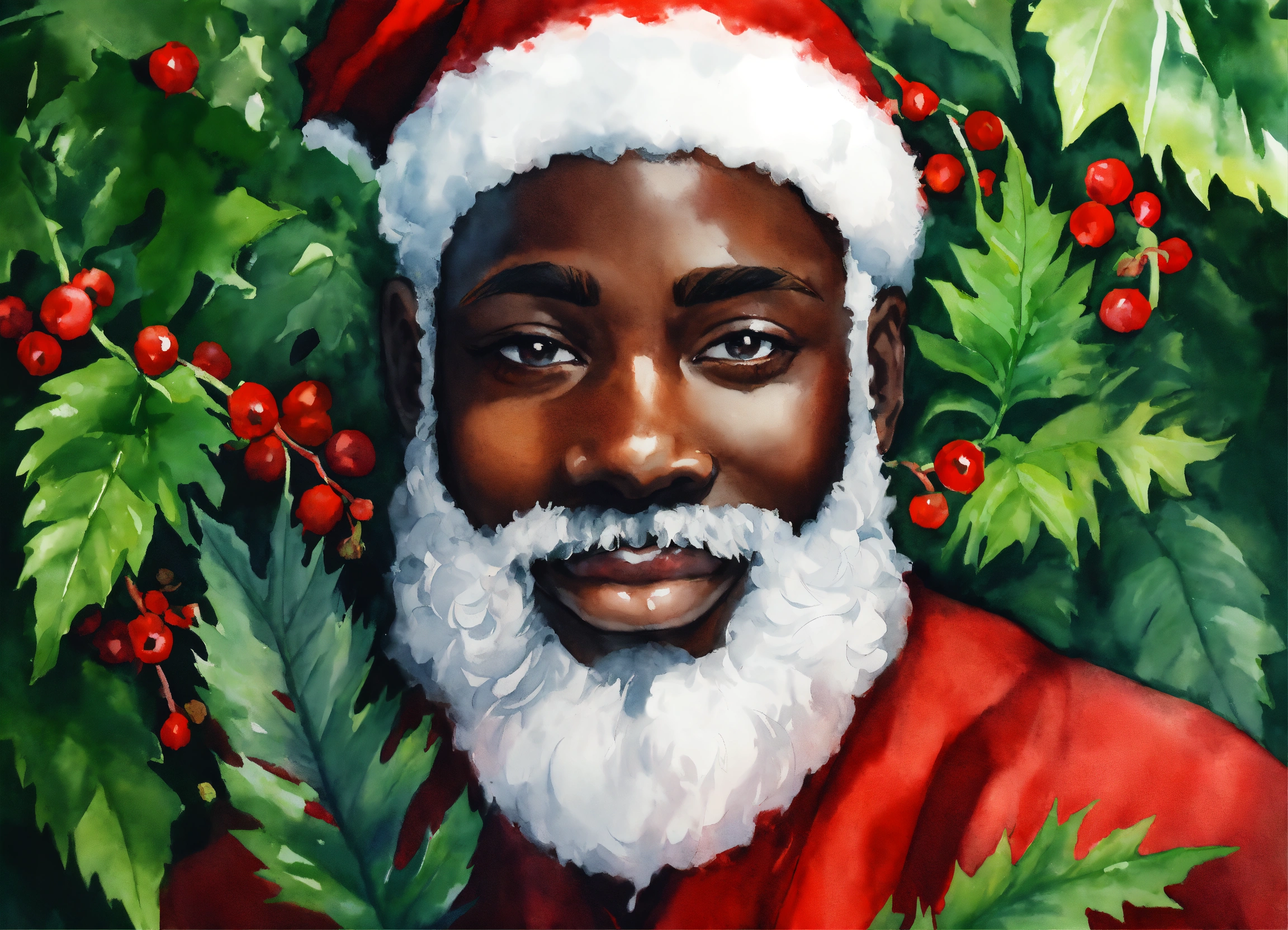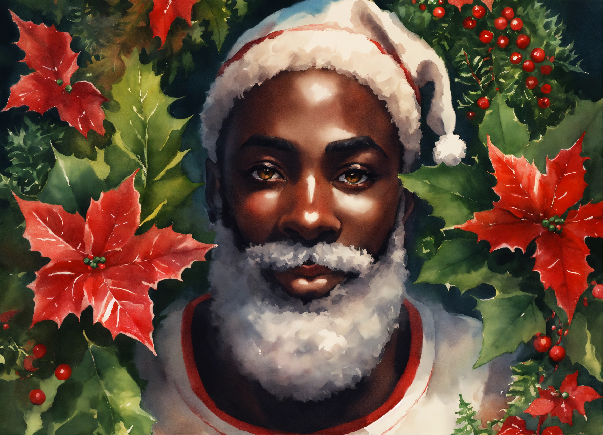 Deep complexion smirking black santa zaddy, bright moist and soulful eyes, dreamlike fantasy fractal watercolor within a holly berry and poinsettia and fern garland vignettes, storybook ghibli style, rule of thirds