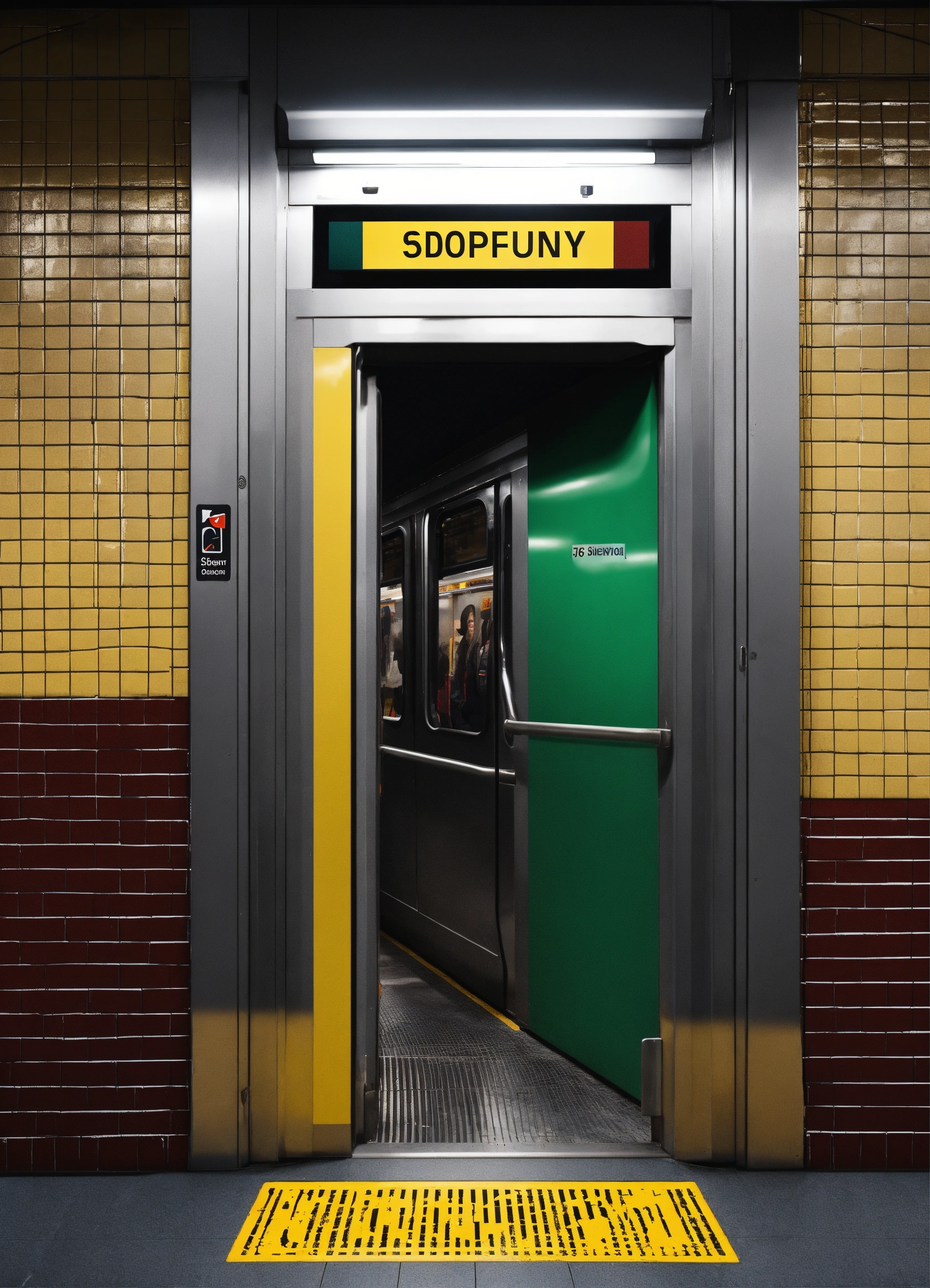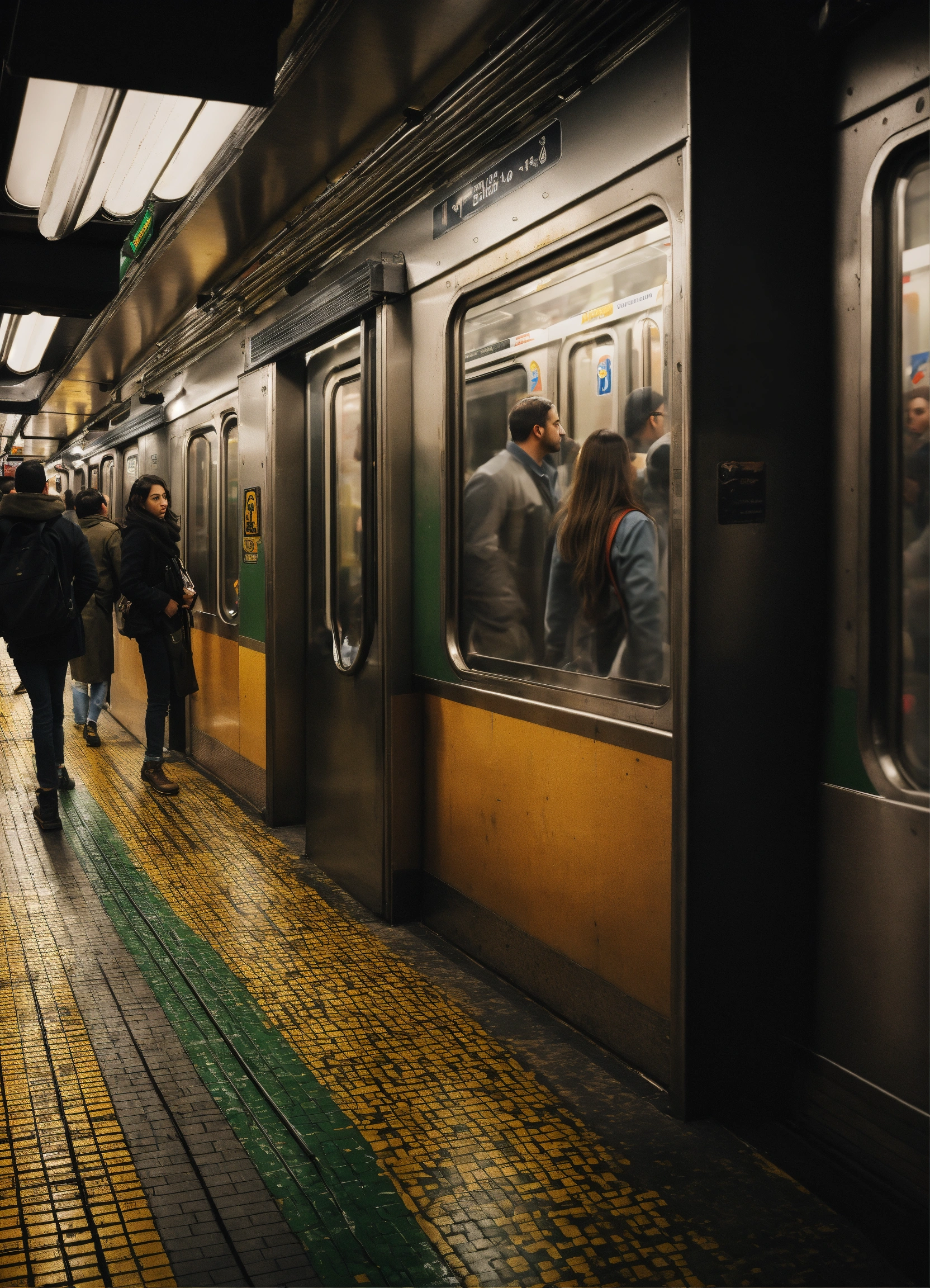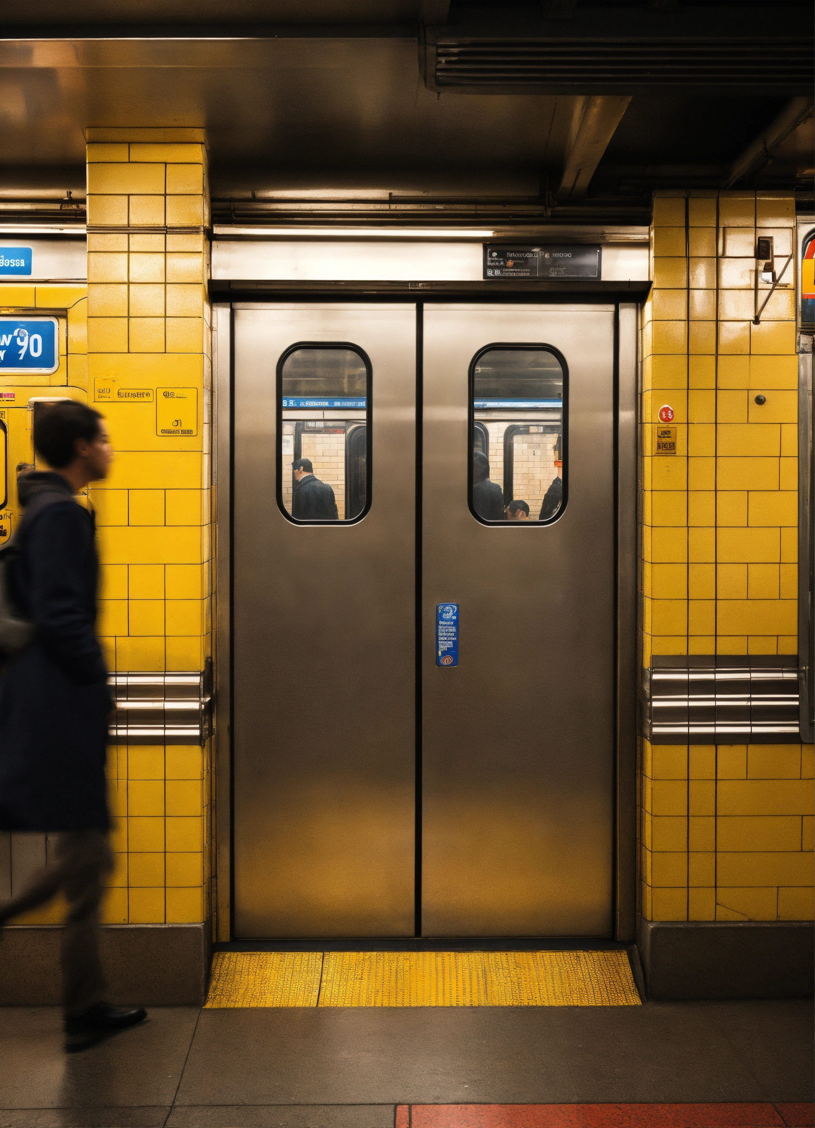 Nyc subway doors, hundreds of anxious people squeezing though the door, perspective standing from subway platform, photorealistic unreal