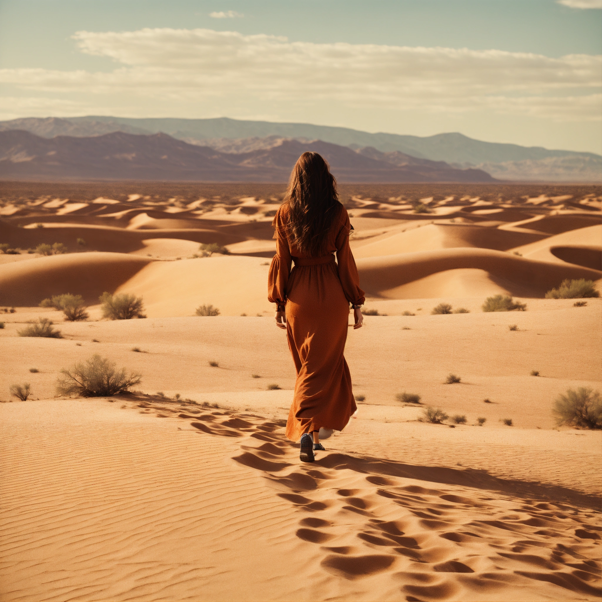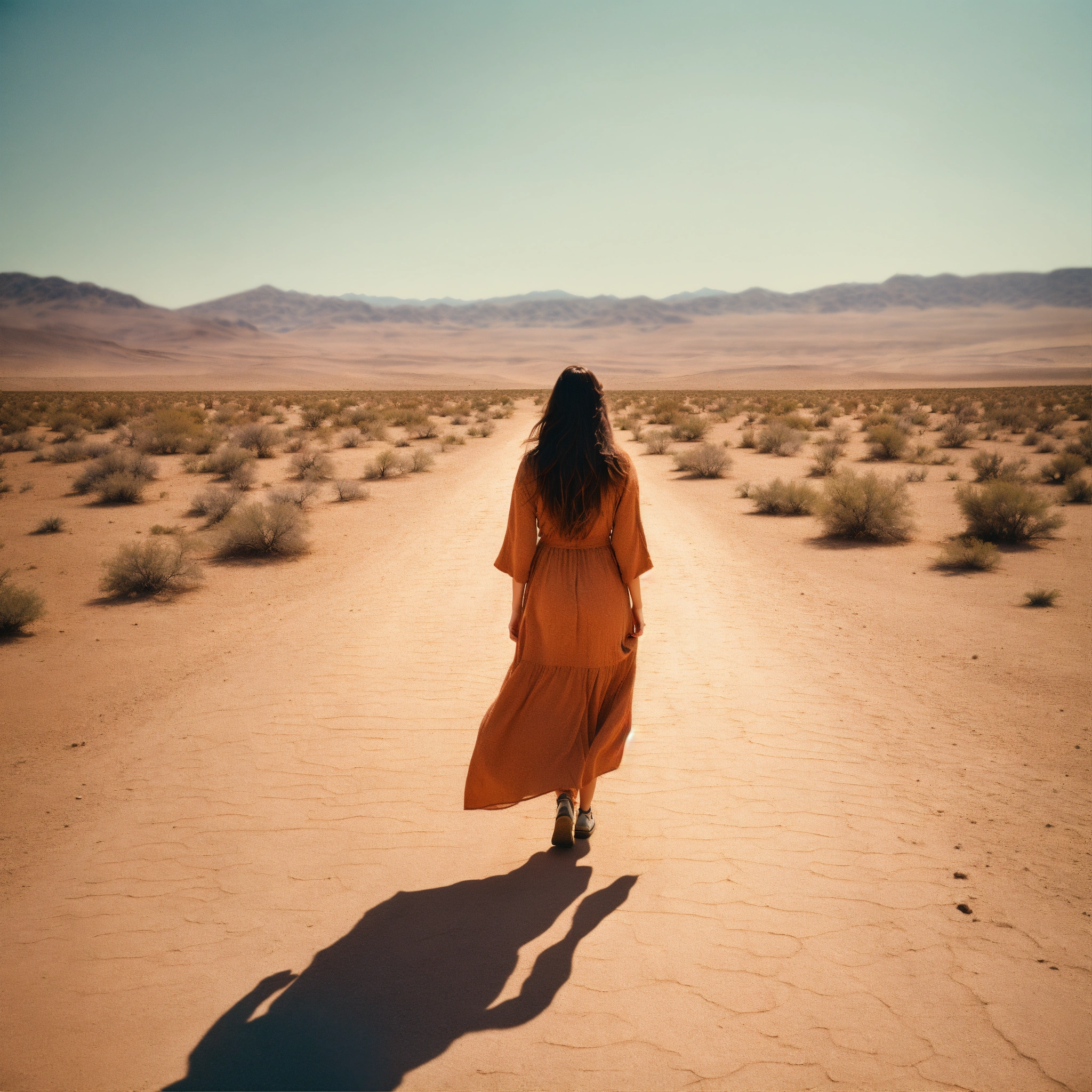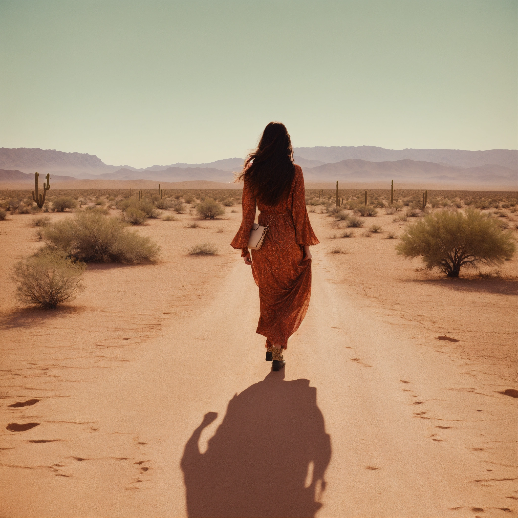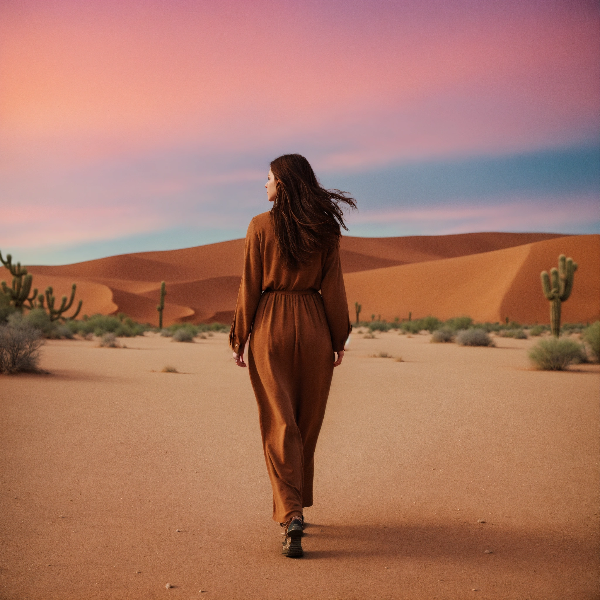 A photograph of a woman with long brown hair walking away in the desert, wes andersons asteriod city colour palette