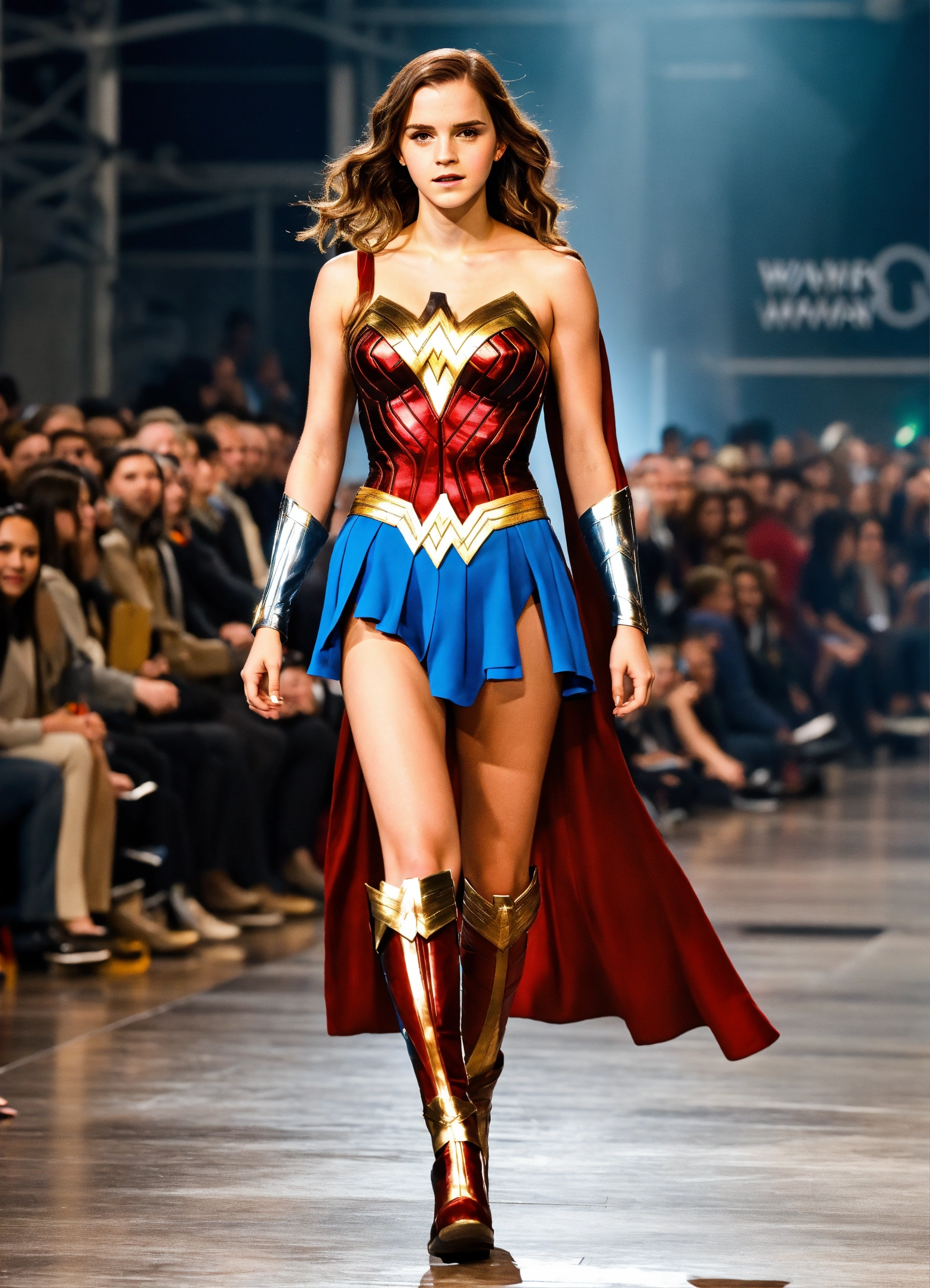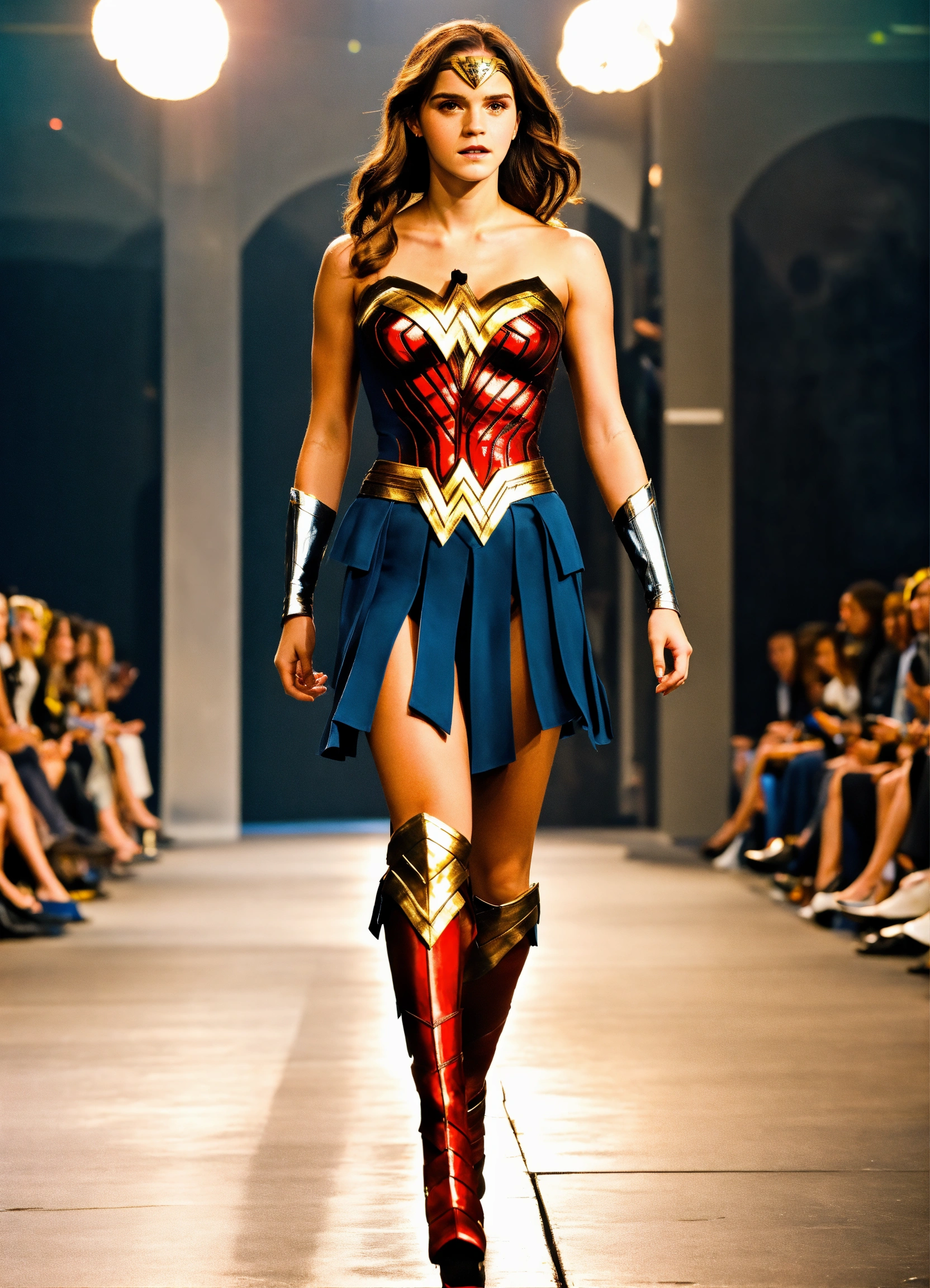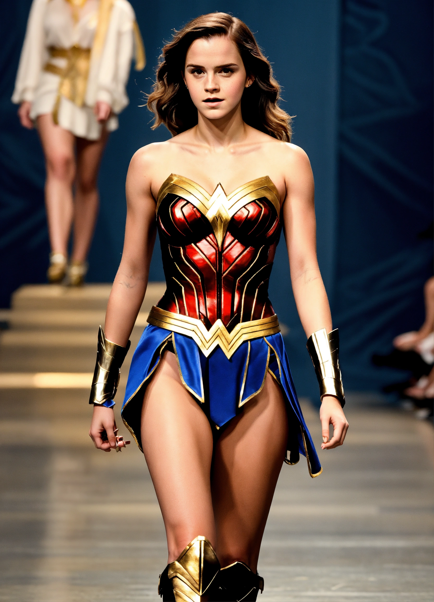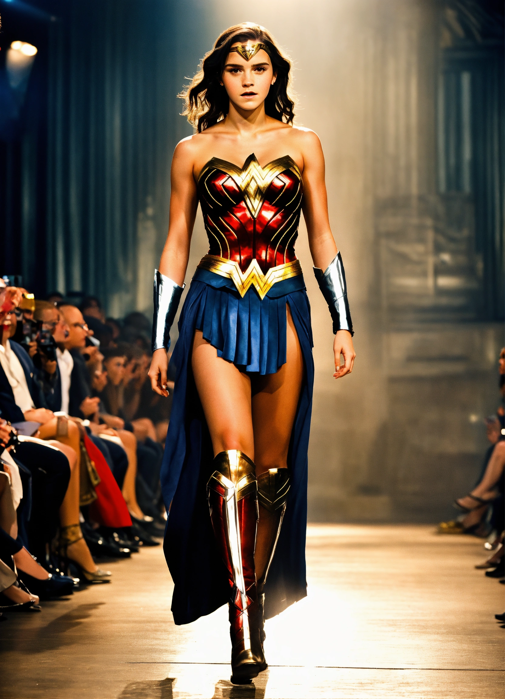 Ultra realistic full body photo of emma watson cosplaying as wonder woman, walking the runway, beautiful model, .