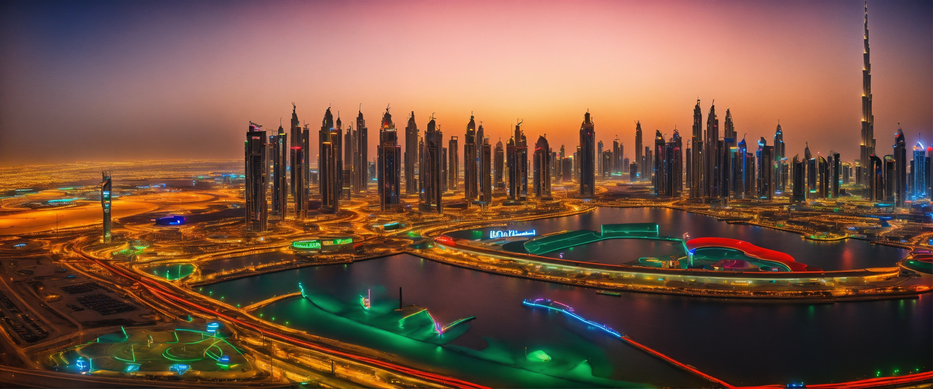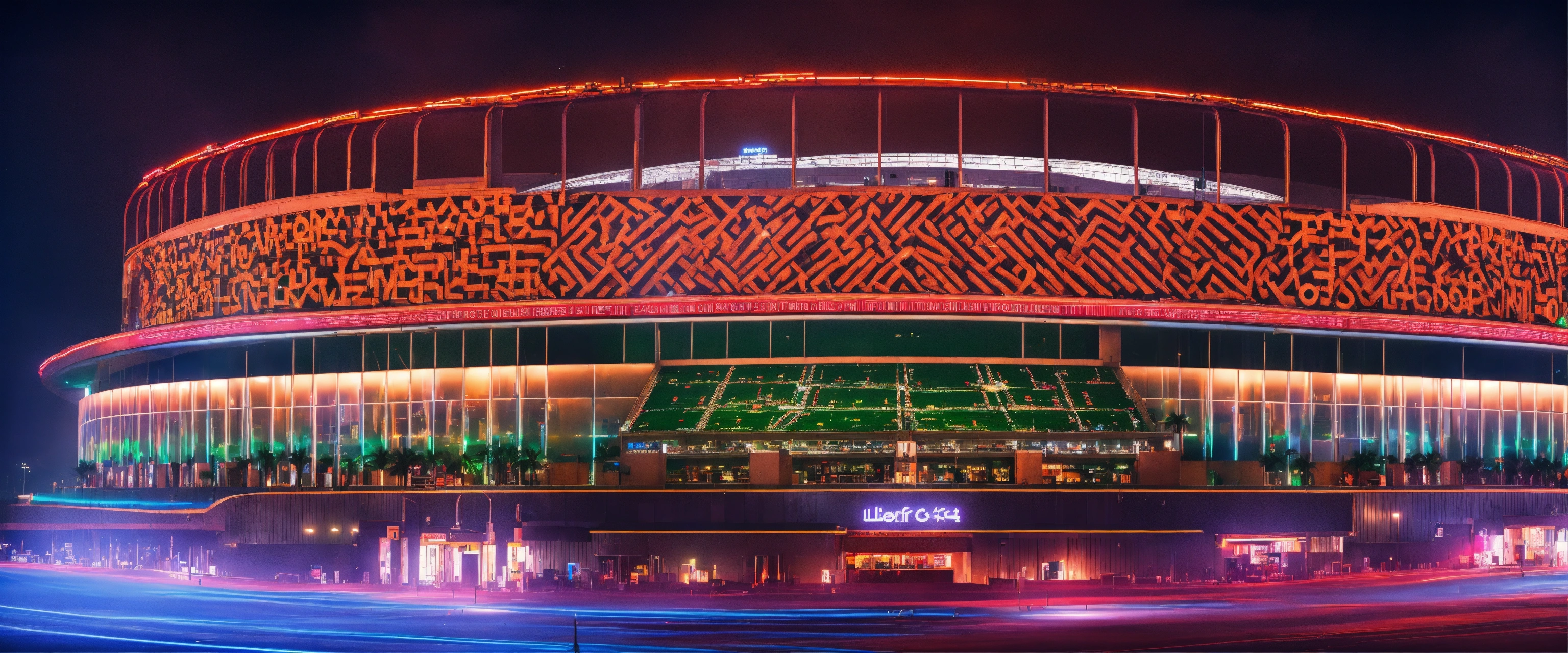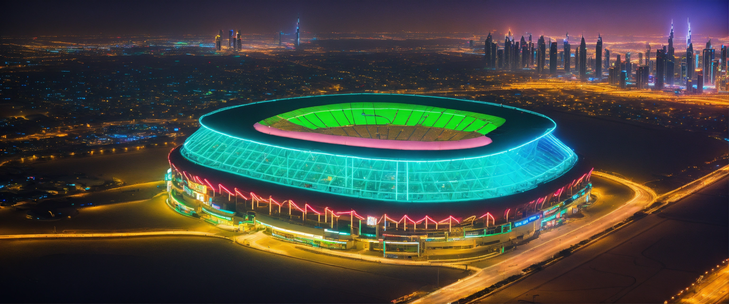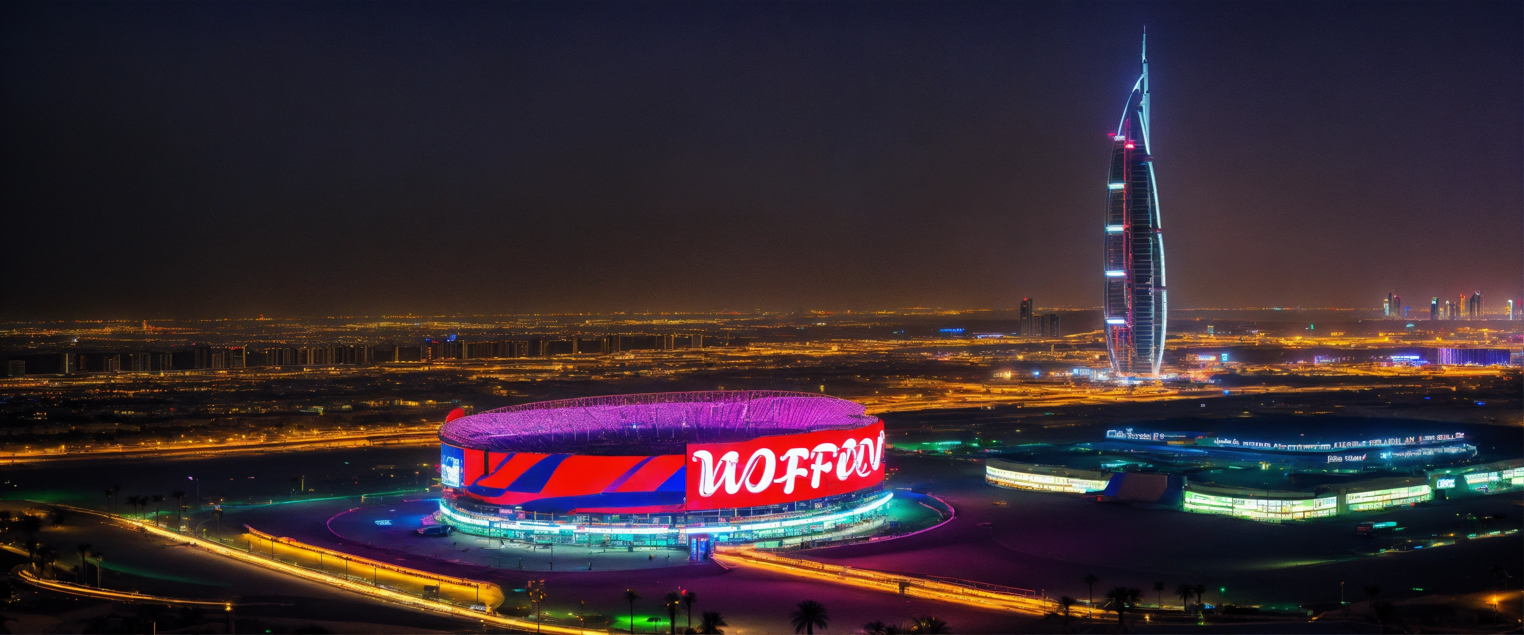 Stadium name wofo neon lights dubai city view big sign with neon lights write in bold w o f o 4k 8k do not let the lights